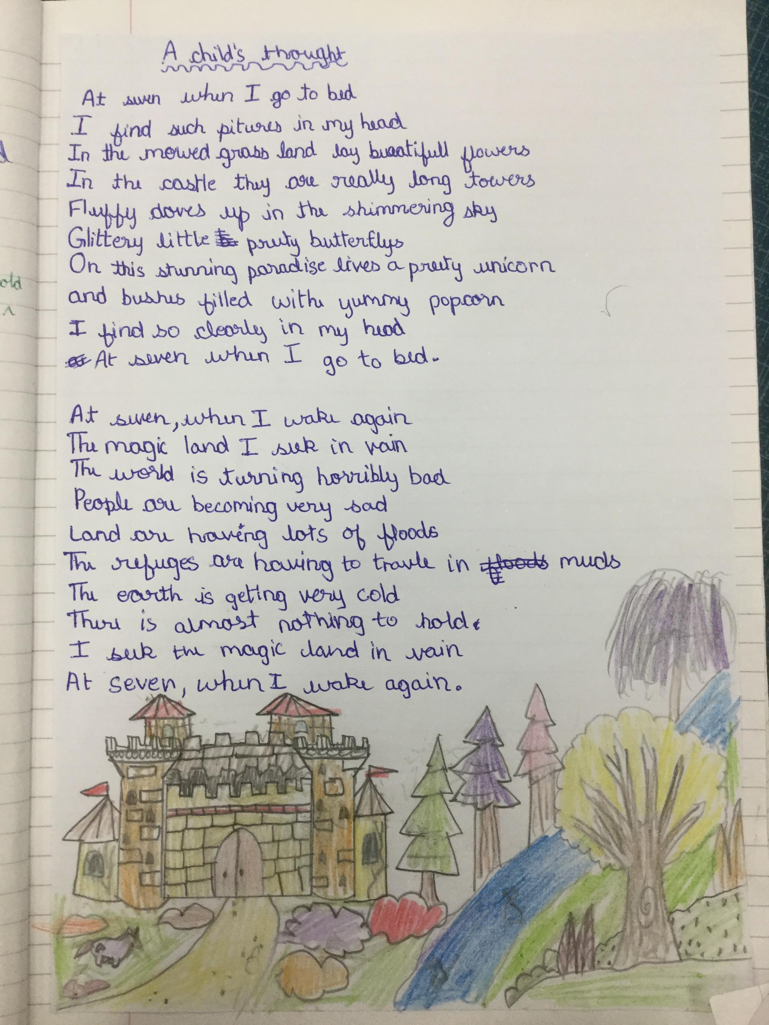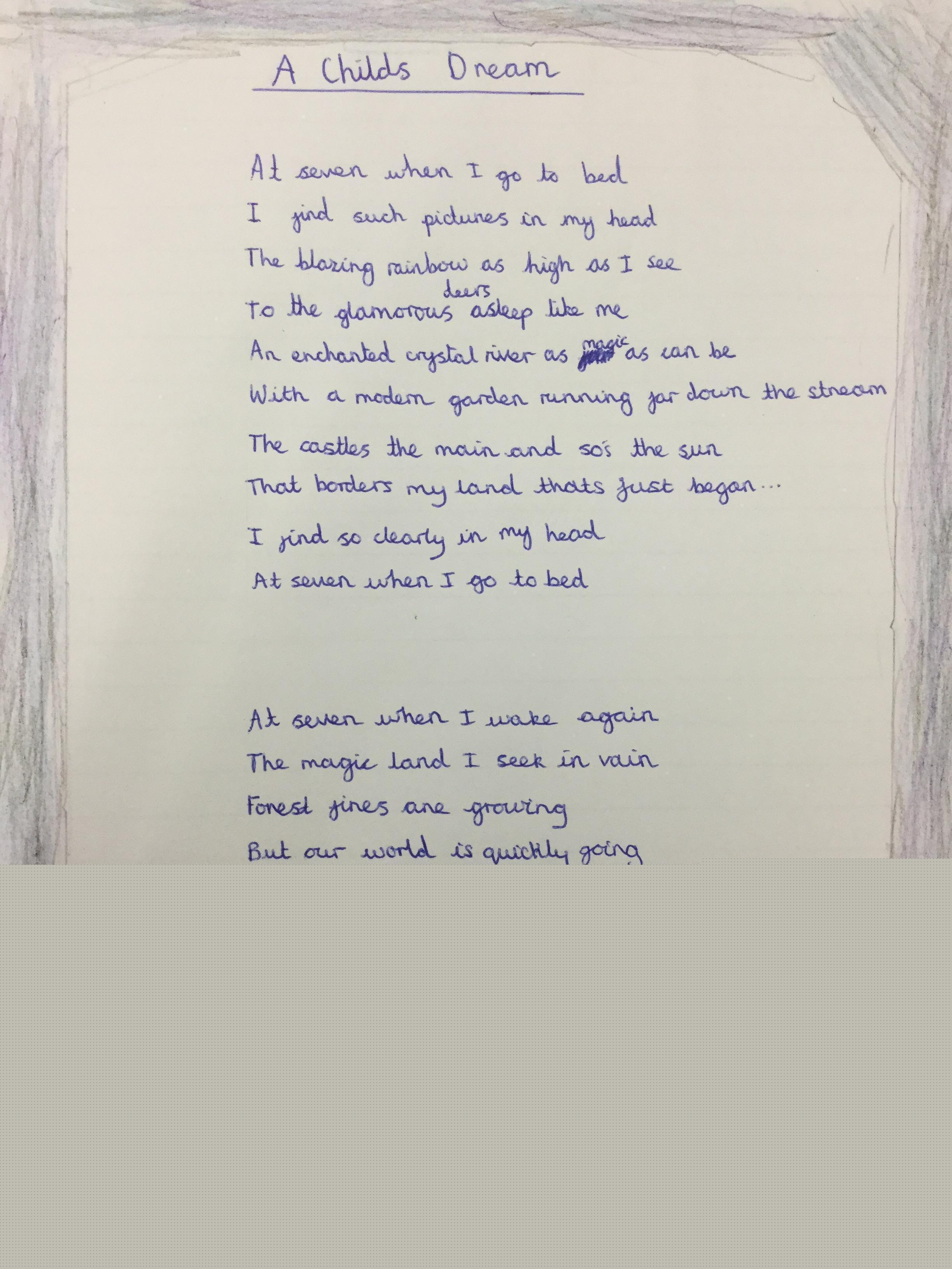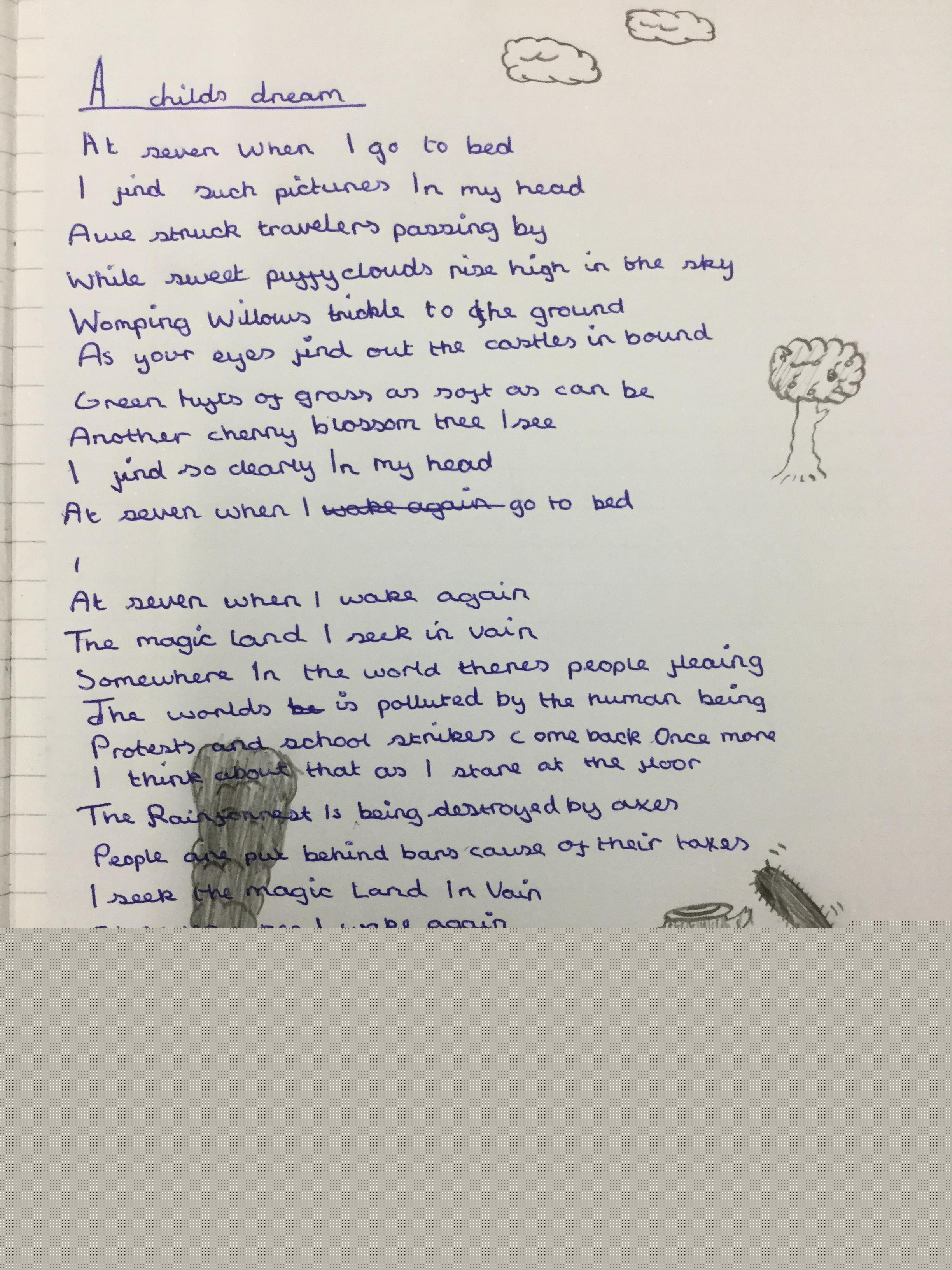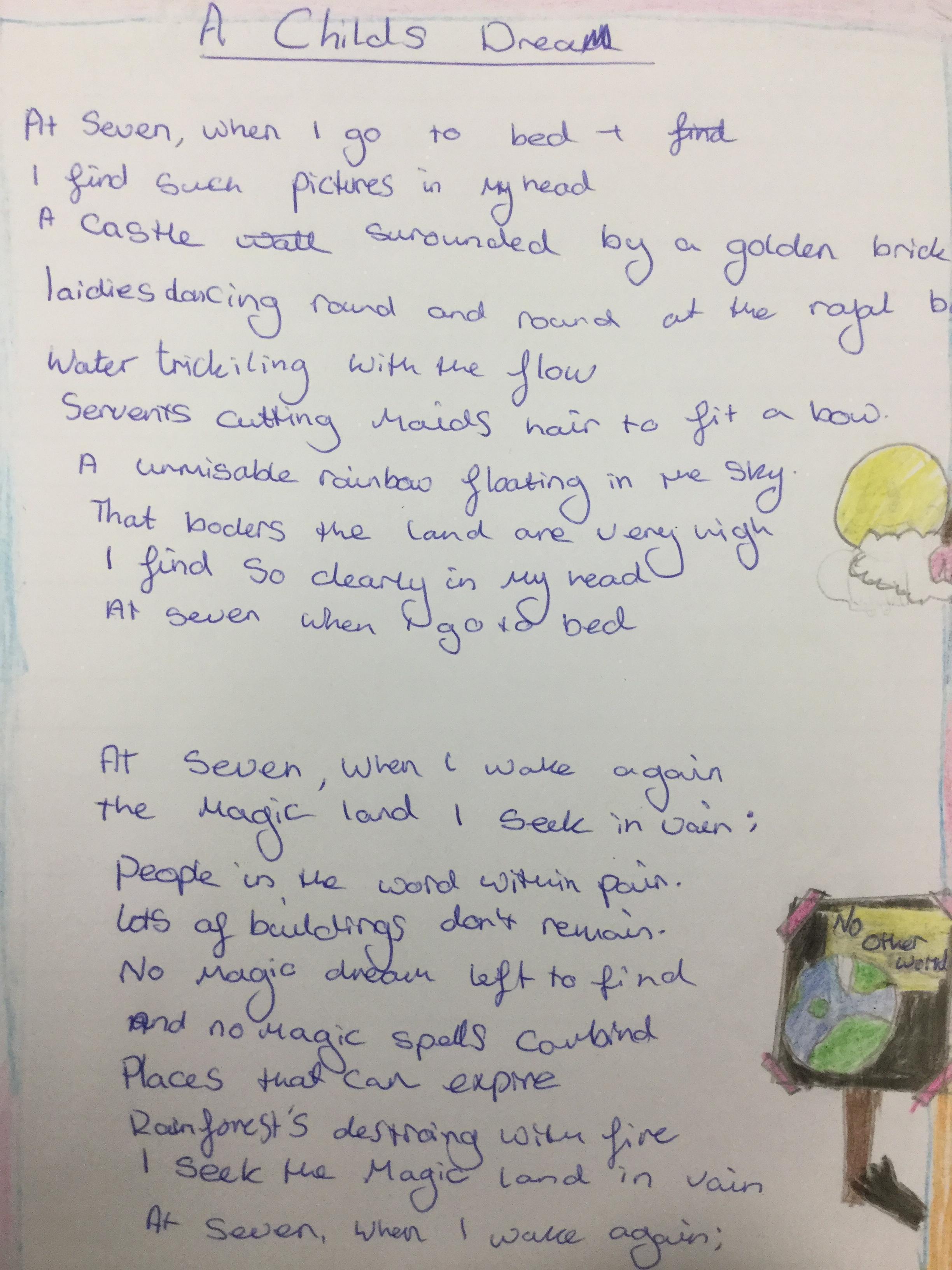 This week the children have been studying and imitating the work of Robert Lewis Stevenson about a child’s thought. This poem is about a dreamland vs reality of life. Across the week we have widened our vocabulary thinking about: verbs, nouns, adverbs, adjectives, thoughts, feelings and 5 senses to create poems with imagery and meaning. To start with we imitated the poet using the image given and then created our own based on a new dreamworld and the reality of life that is happening in the world around us such as: deforestation, politics, technology, climate change, protests, war, fires amongst others. All ideas were from the children. It was a great week of creativity and poetry from Year 5!