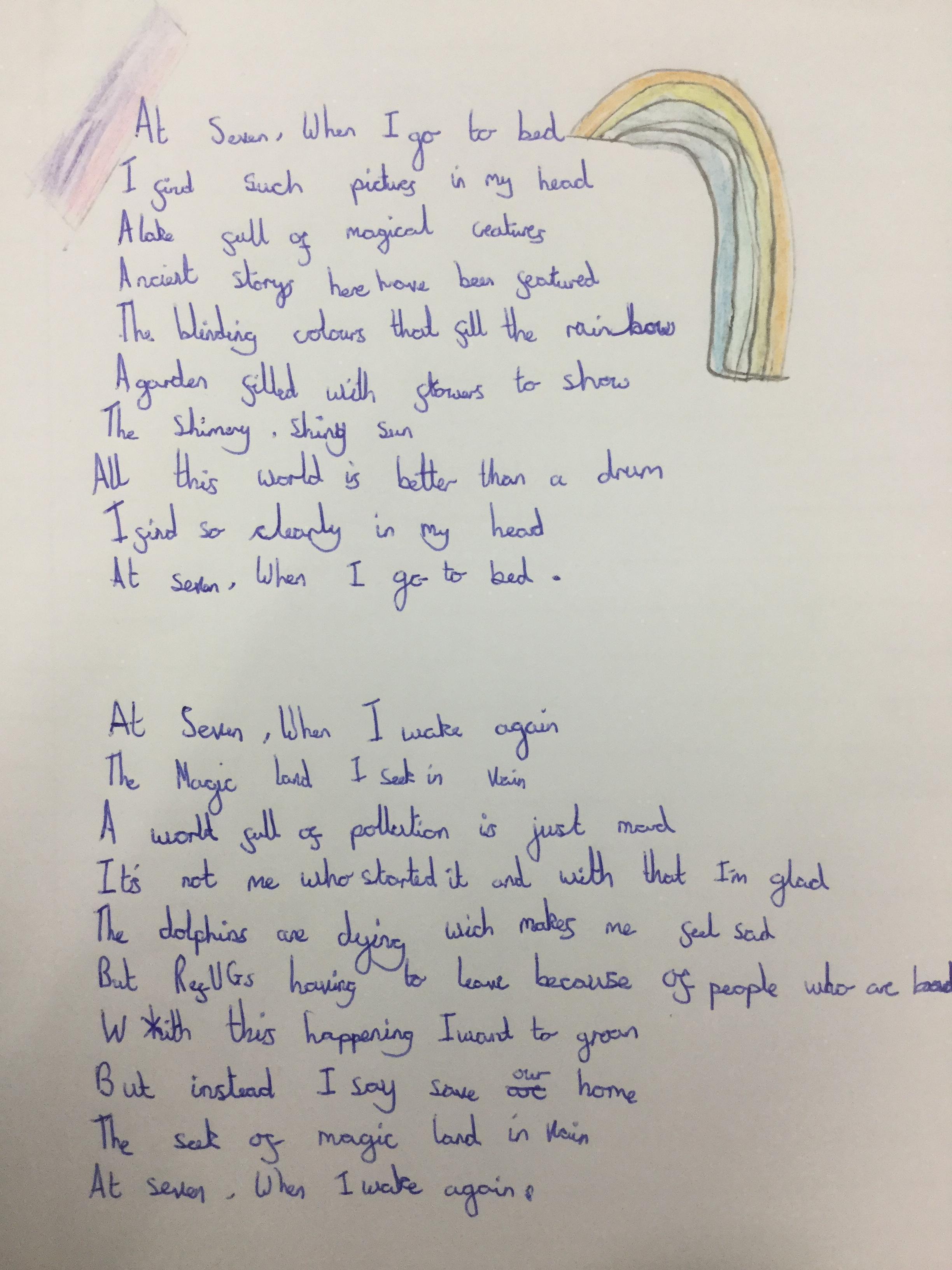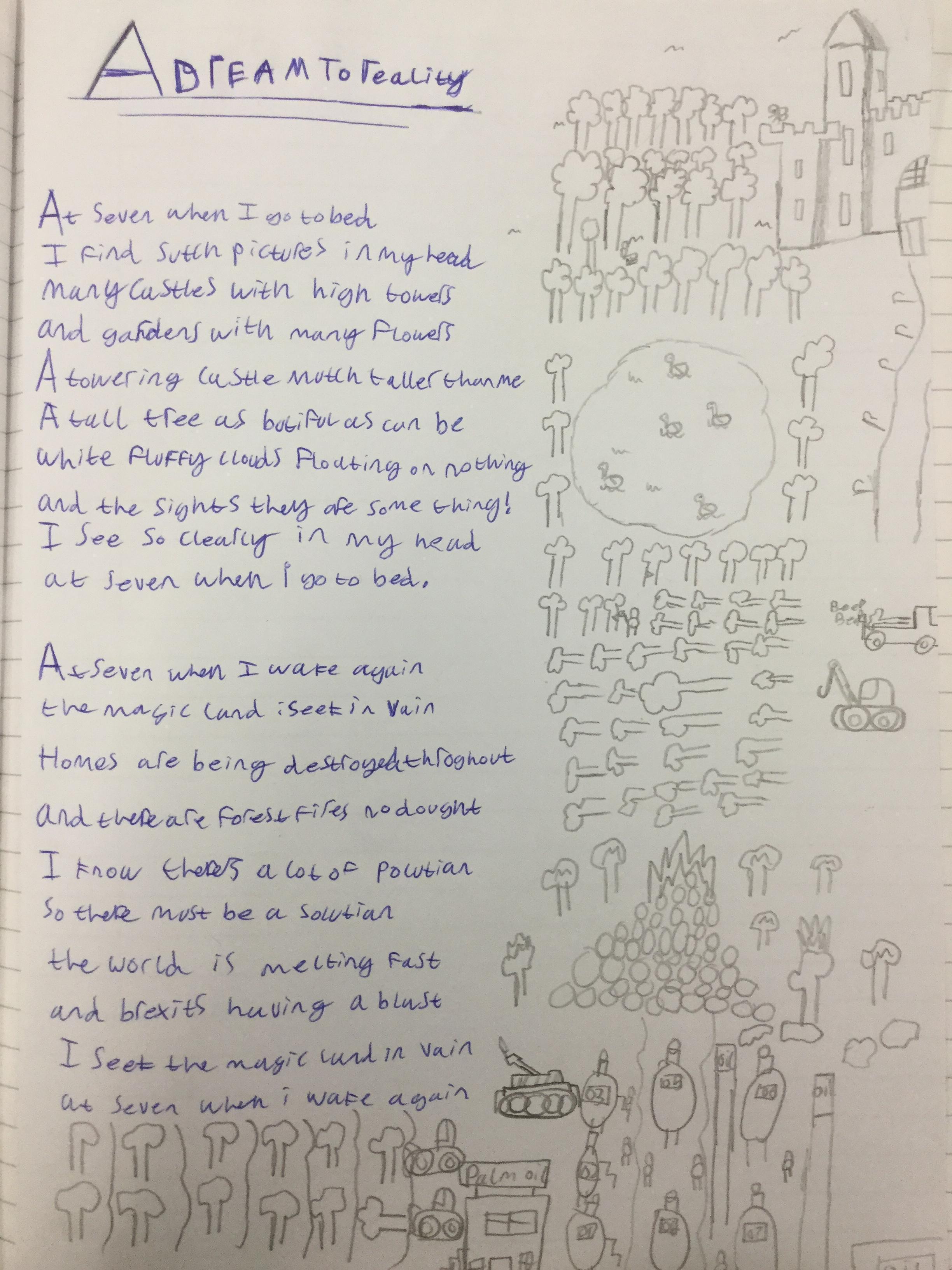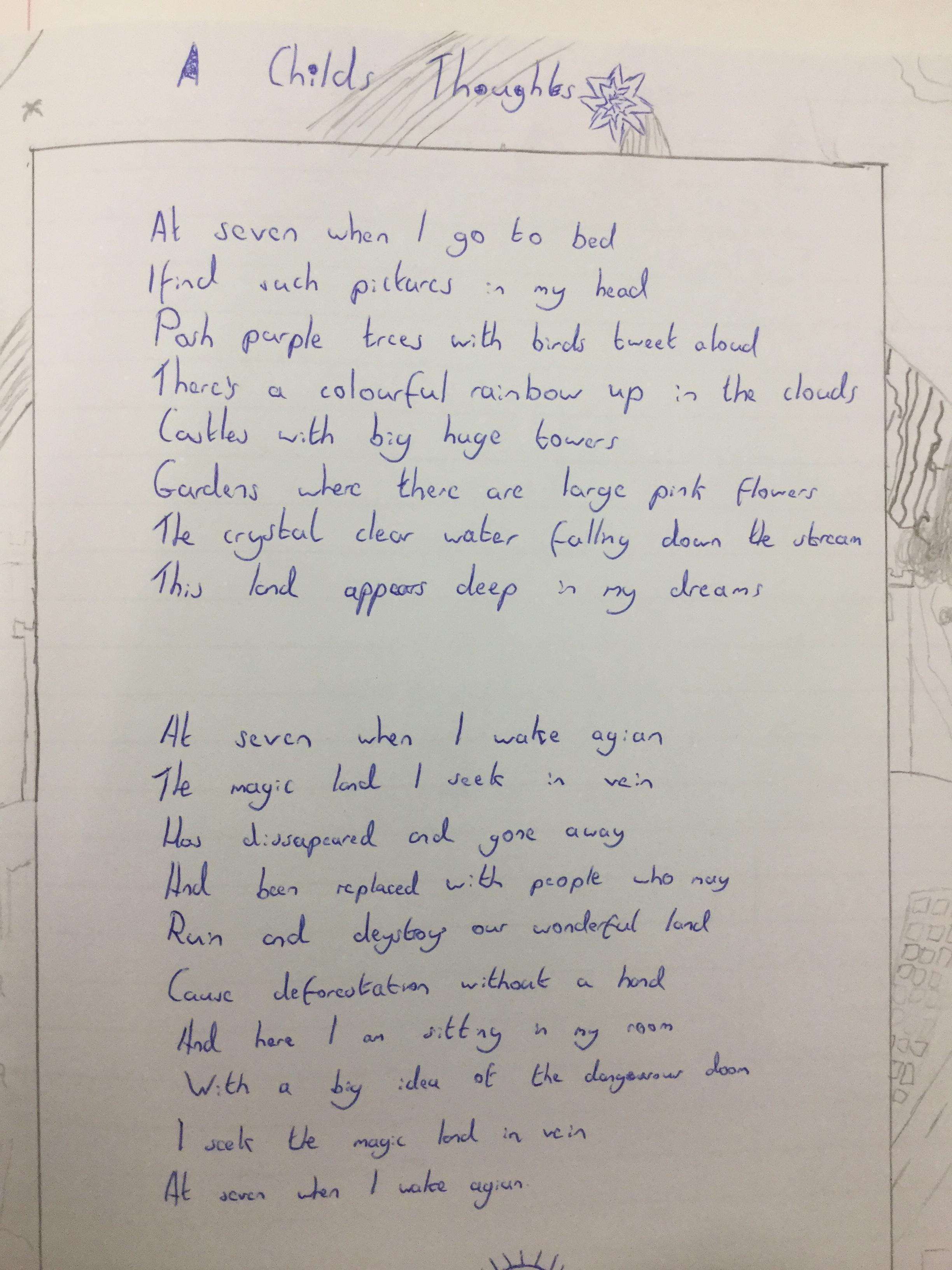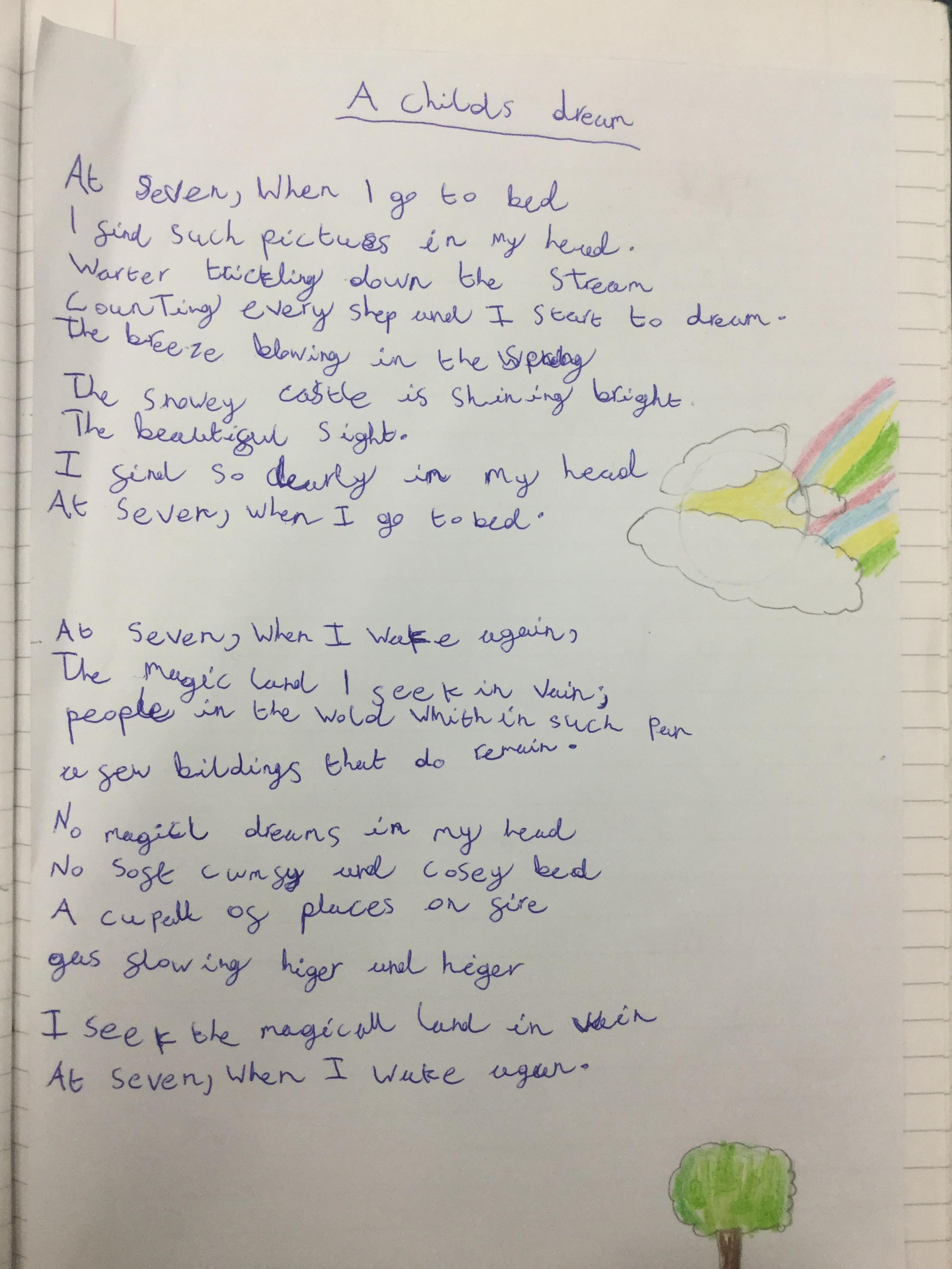 This week the children have been studying and imitating the work of Robert Lewis Stevenson about a child’s thought. This poem is about a dreamland vs reality of life. Across the week we have widened our vocabulary thinking about: verbs, nouns, adverbs, adjectives, thoughts, feelings and 5 senses to create poems with imagery and meaning. To start with we imitated the poet using the image given and then created our own based on a new dreamworld and the reality of life that is happening in the world around us such as: deforestation, politics, technology, climate change, protests, war, fires amongst others. All ideas were from the children. It was a great week of creativity and poetry from Year 5!