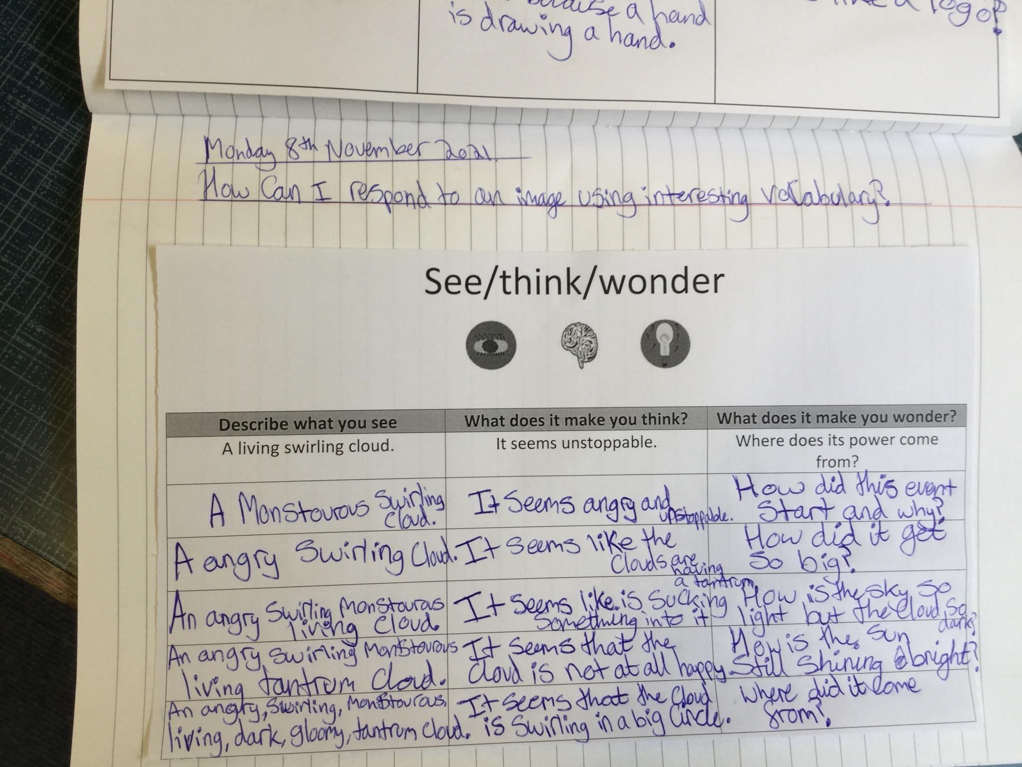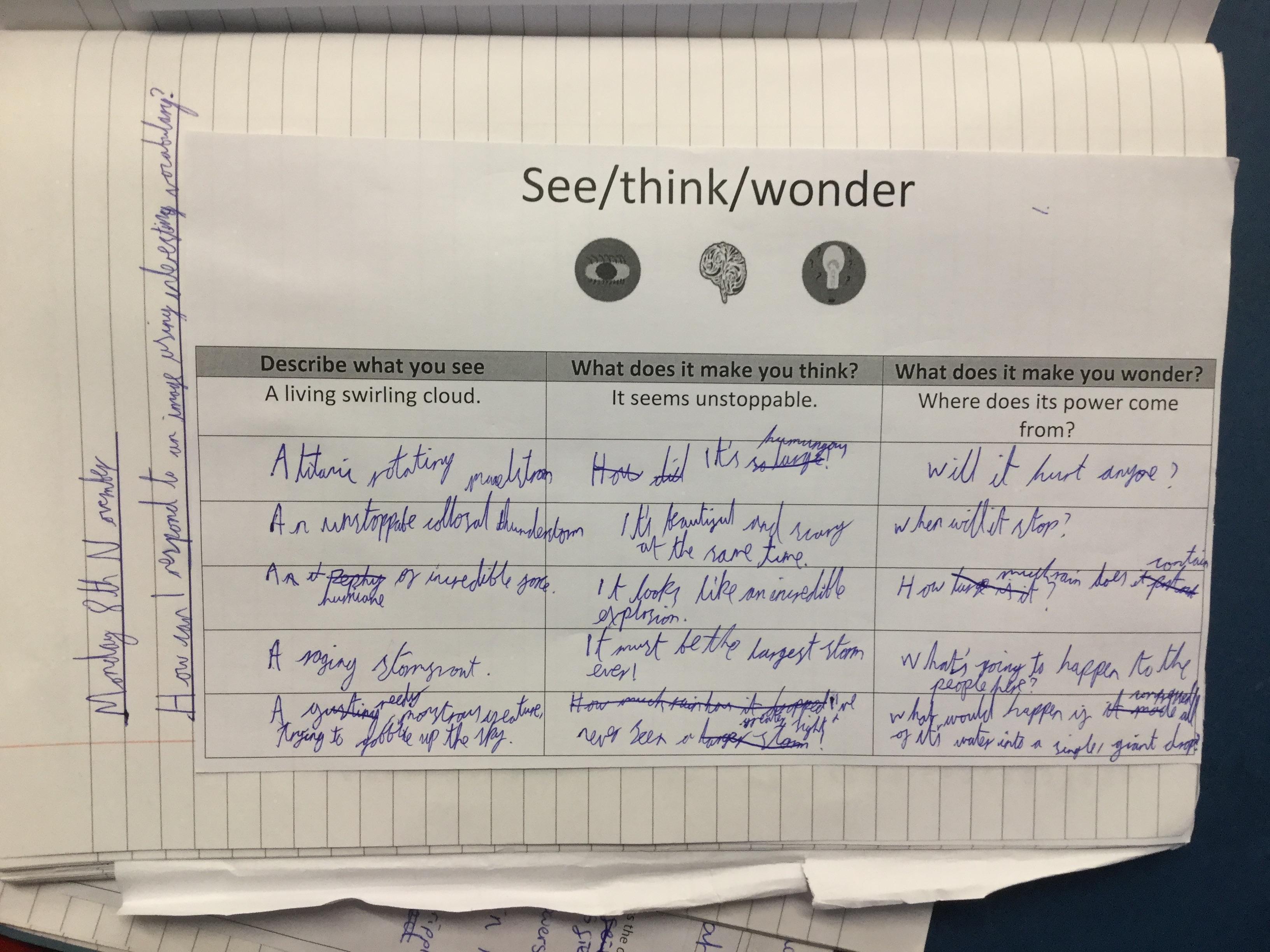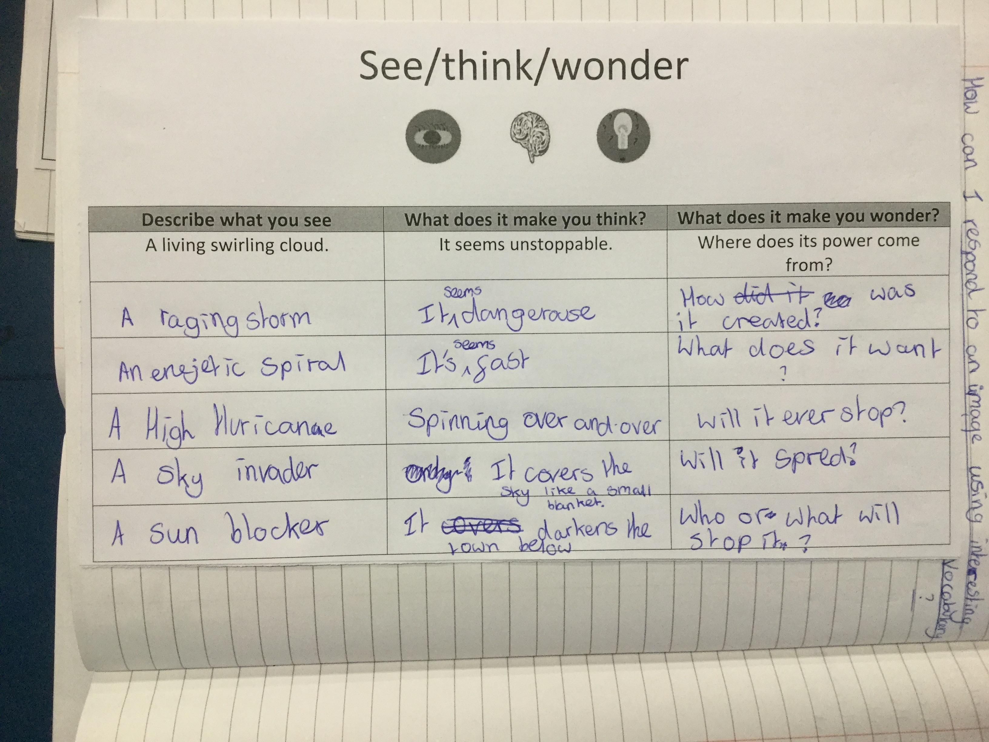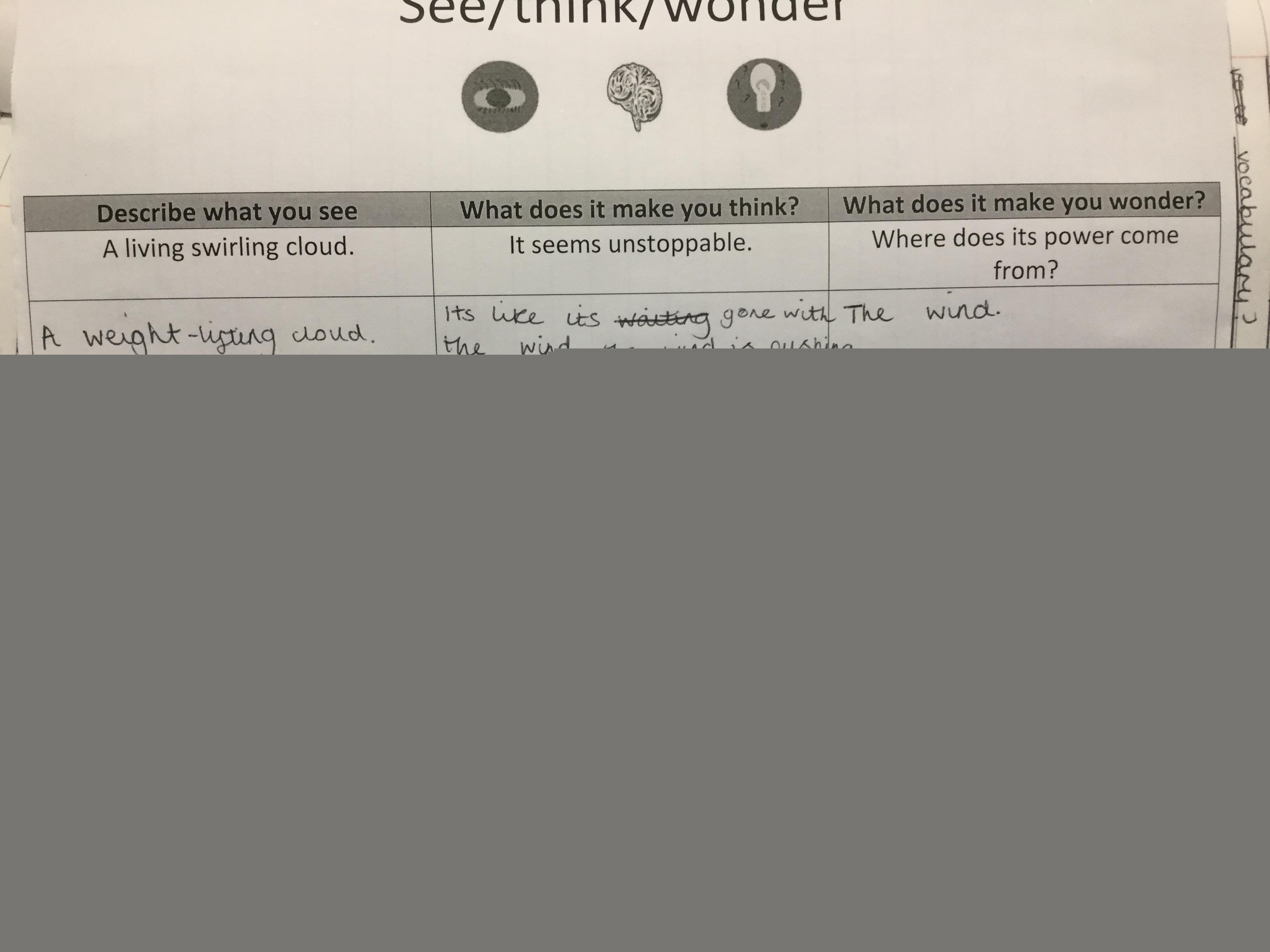 We watched a short clip of a storm and completed a see/think/ wonder sheet. We shared our ideas with our peers.