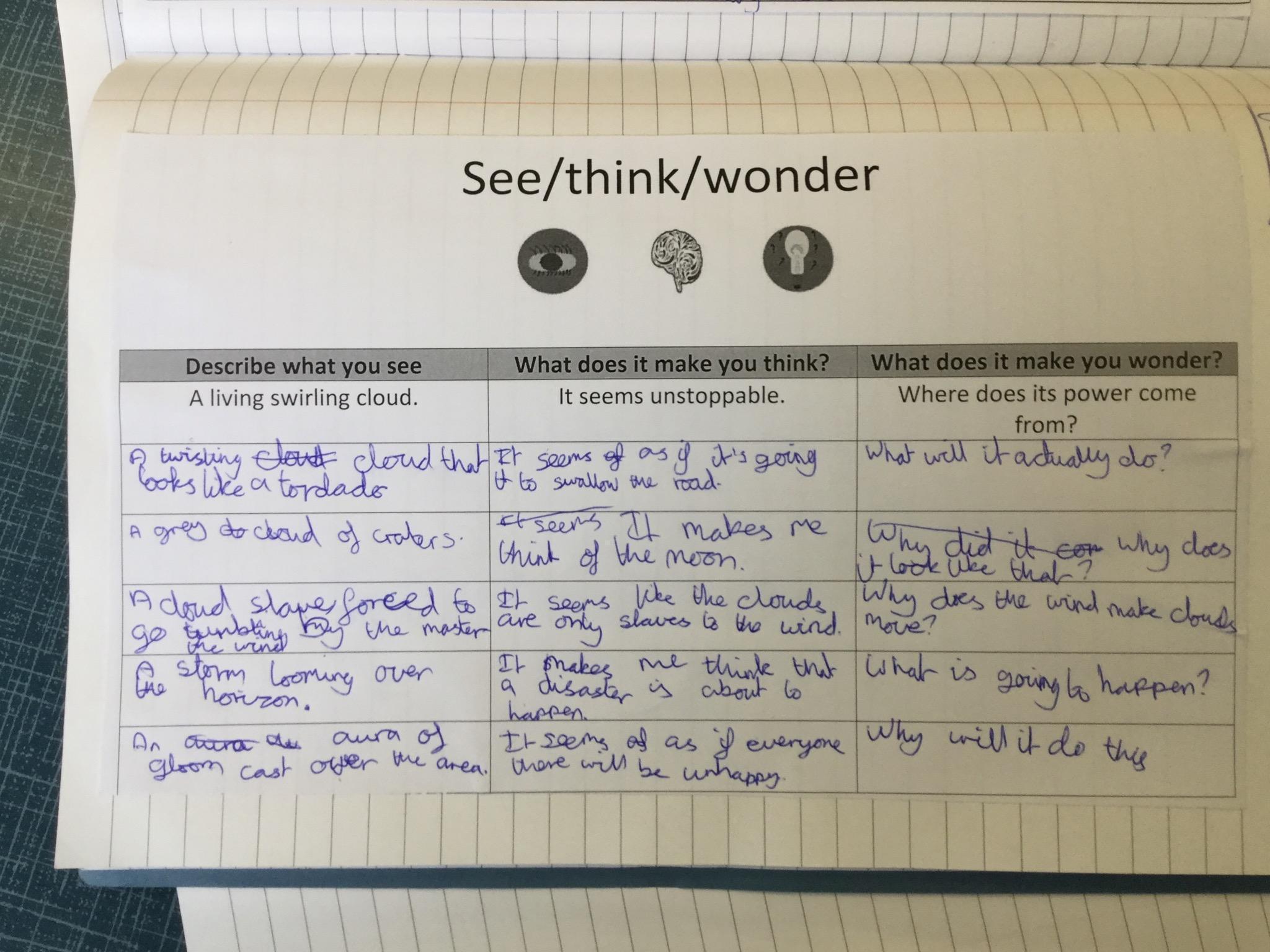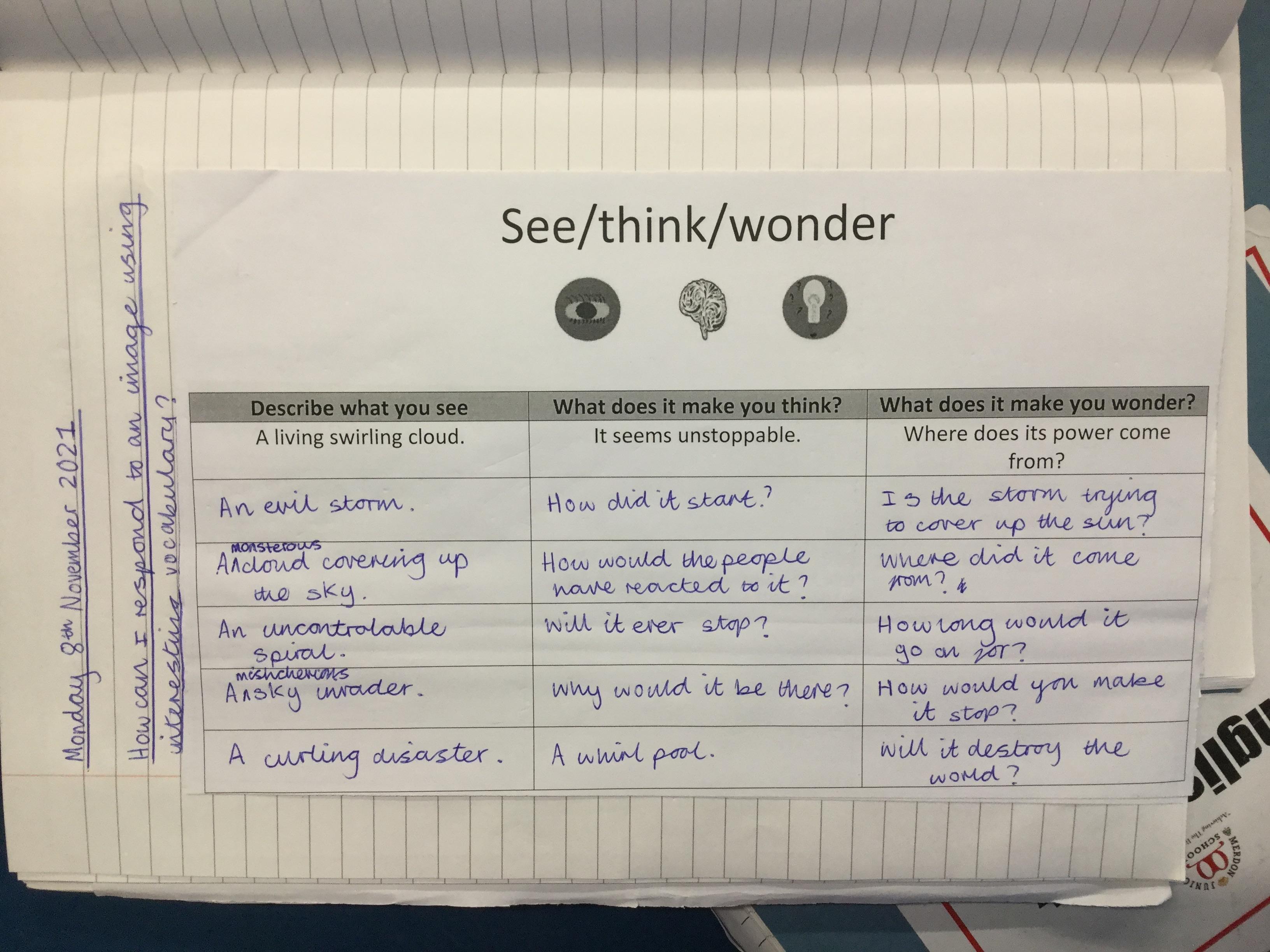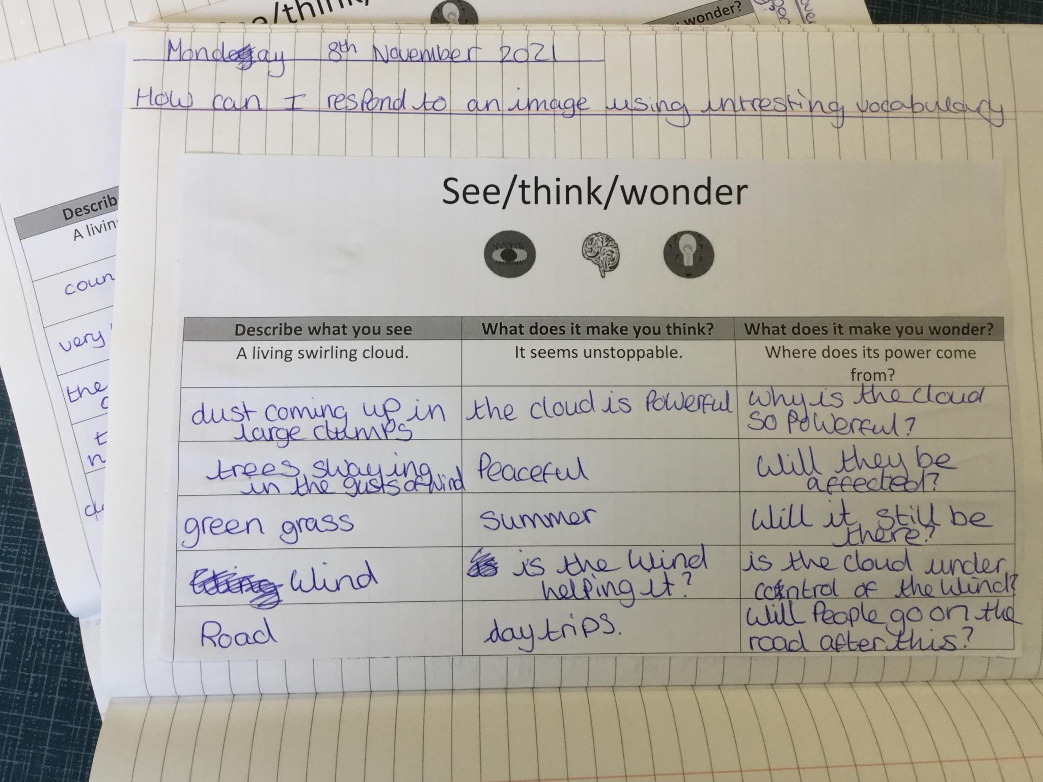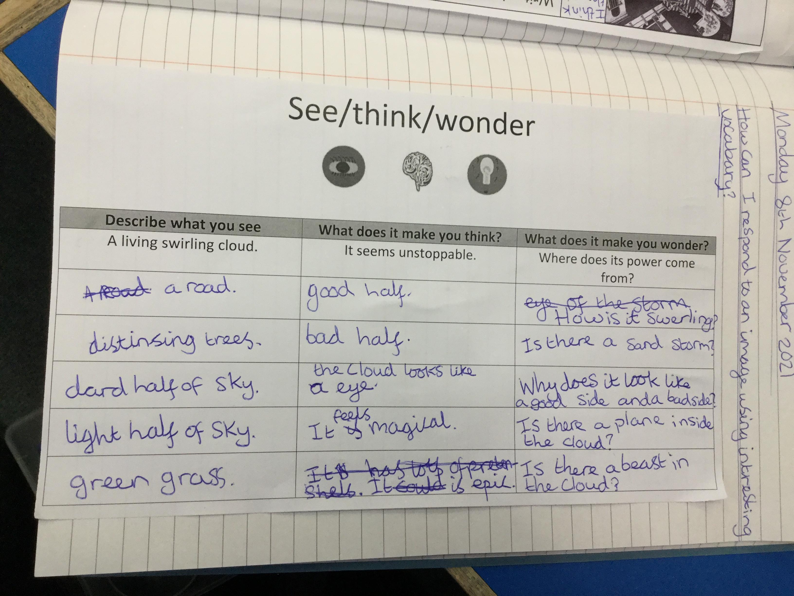 We watched a short clip of a storm and completed a see/think/ wonder sheet. We shared our ideas with our peers.
