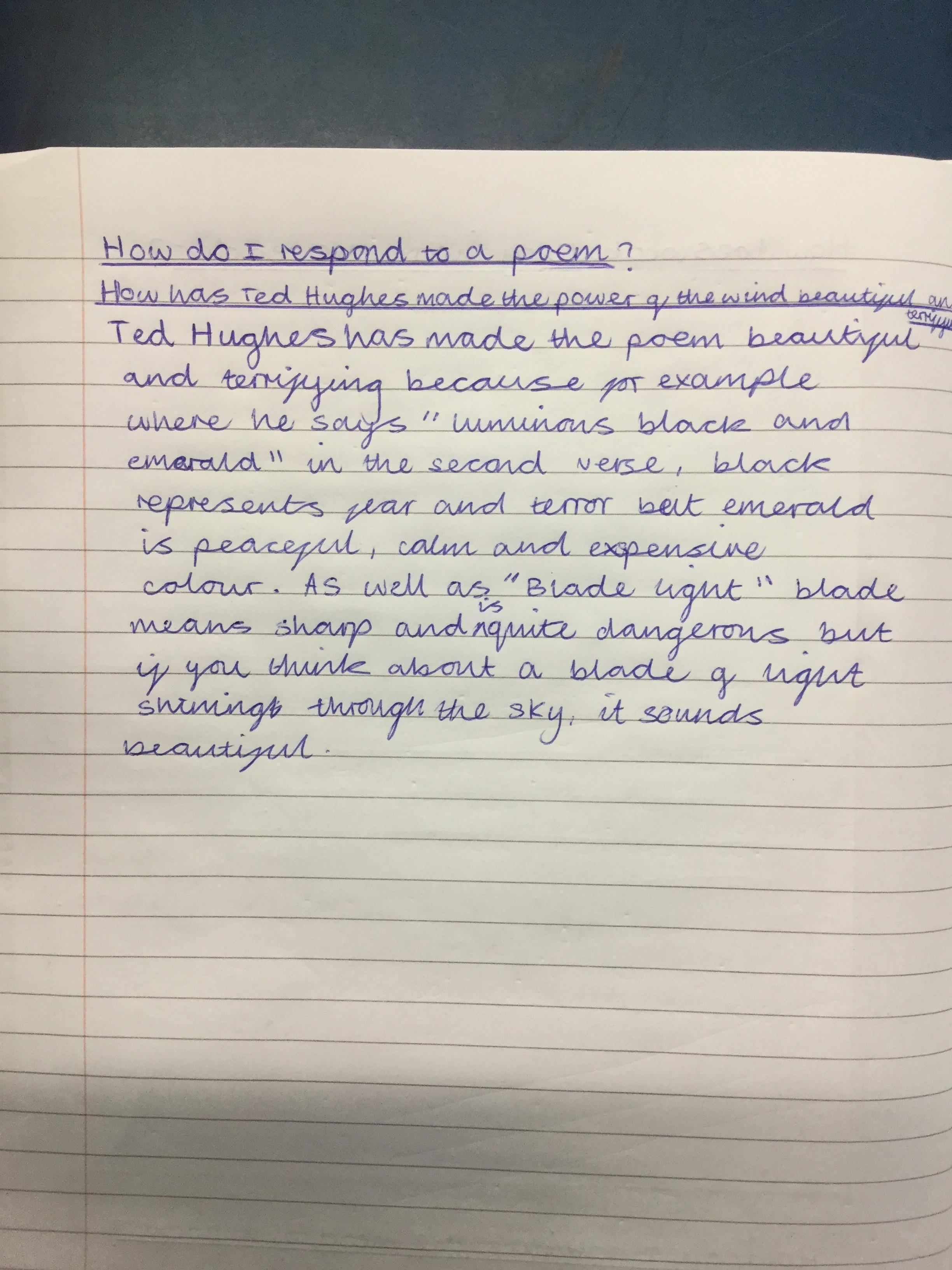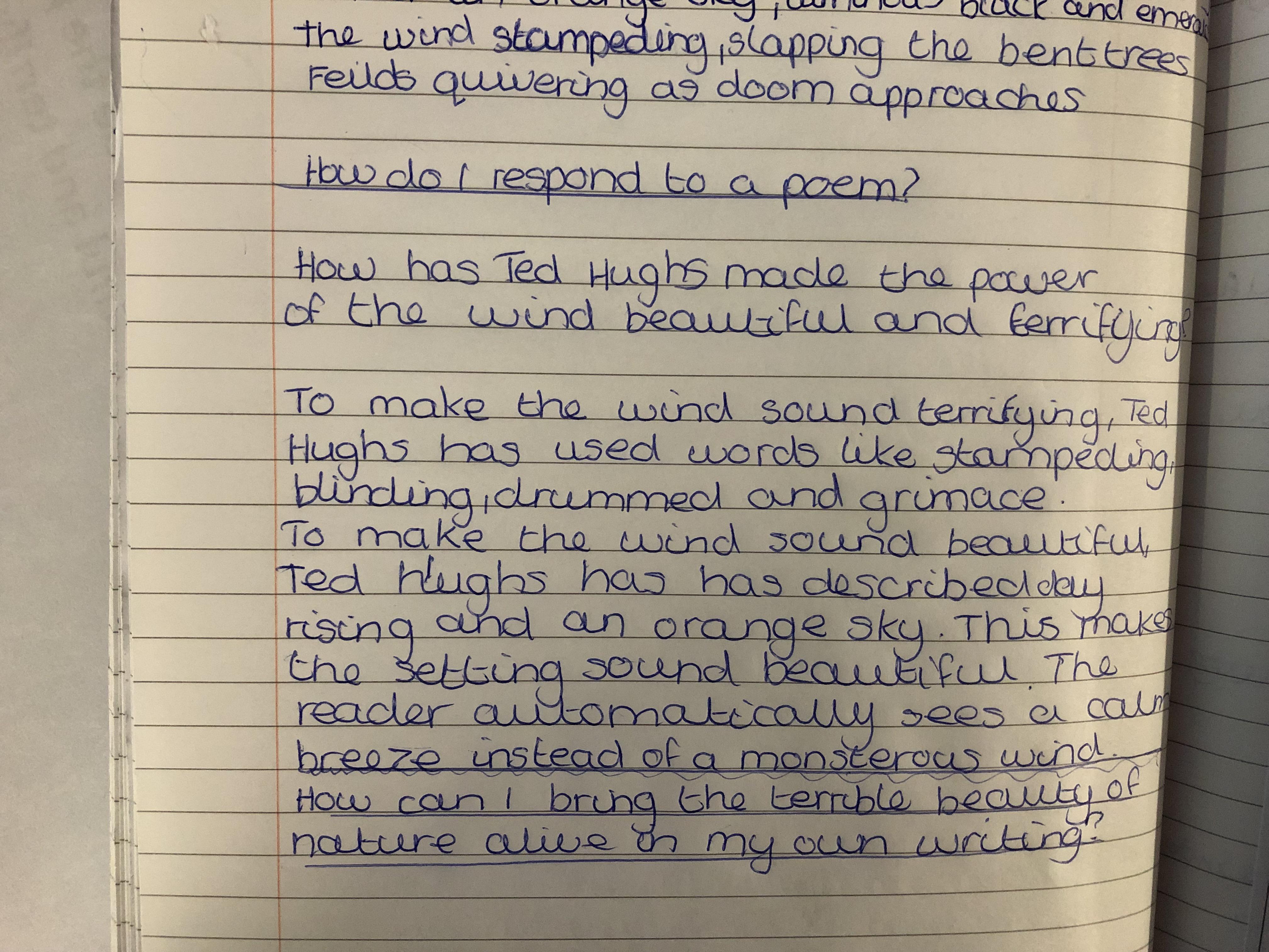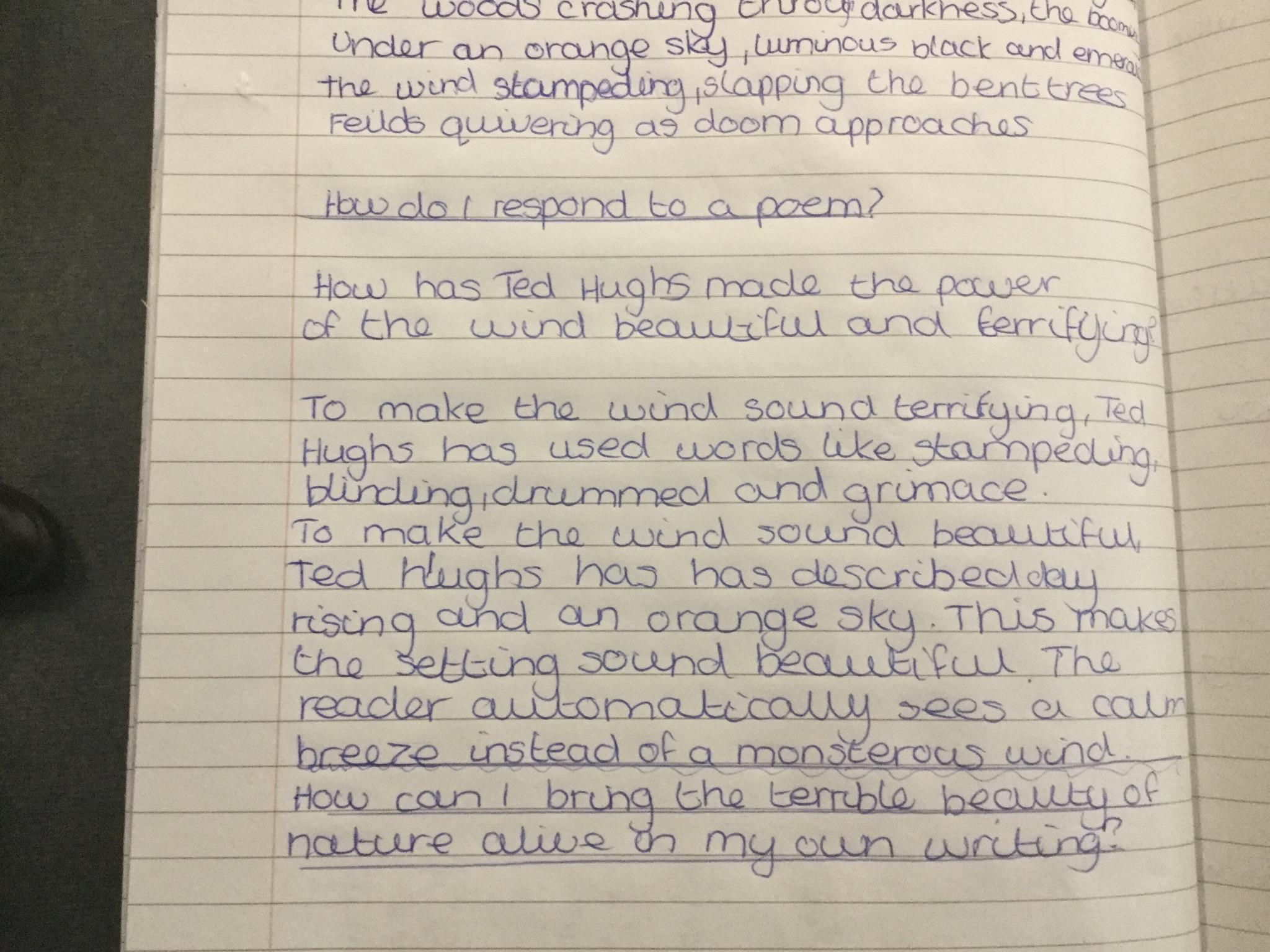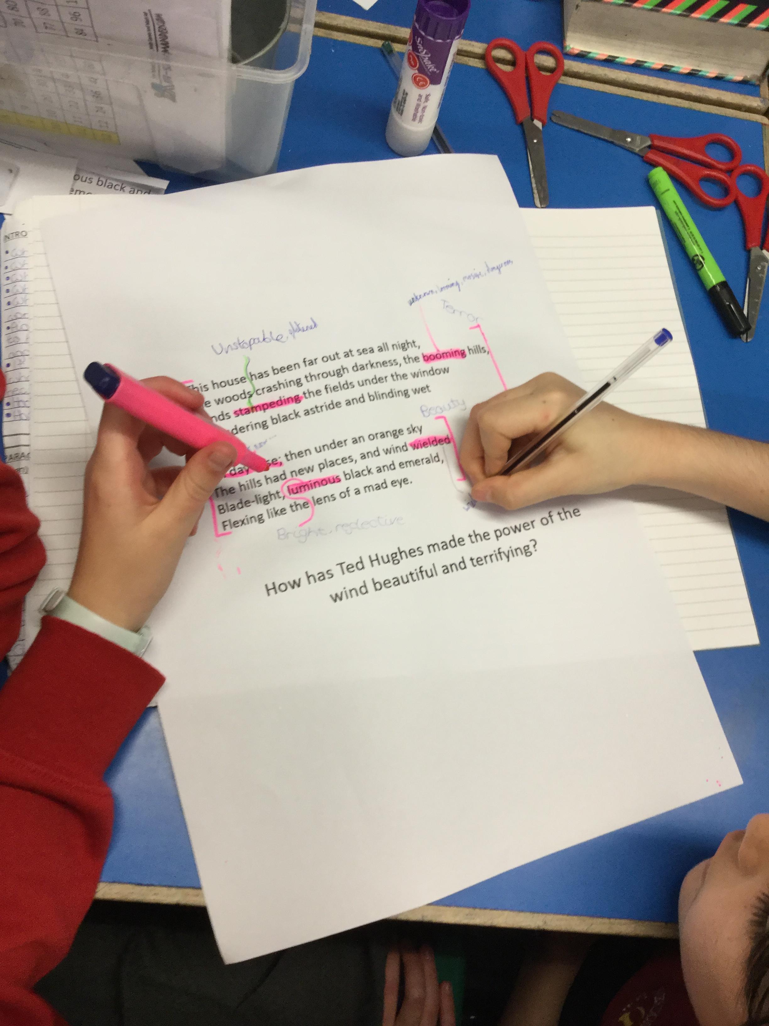 We looked at the poem ‘Wind’ by Ted Hughes. We learnt about paradox and oxymoron as well as recognising other devices the poet had used including, metaphor, personification, alliteration and how verb choices can create atmosphere.
