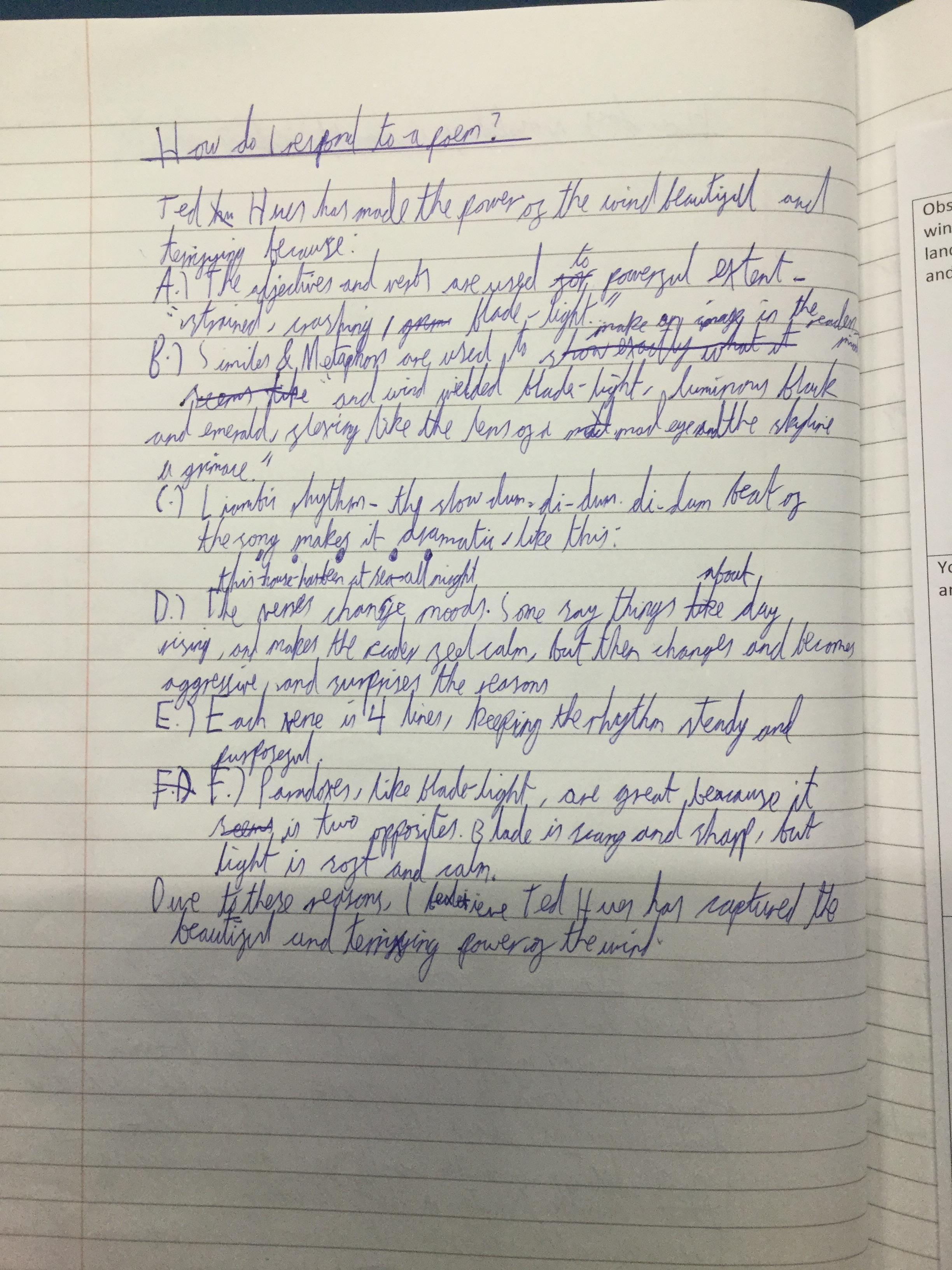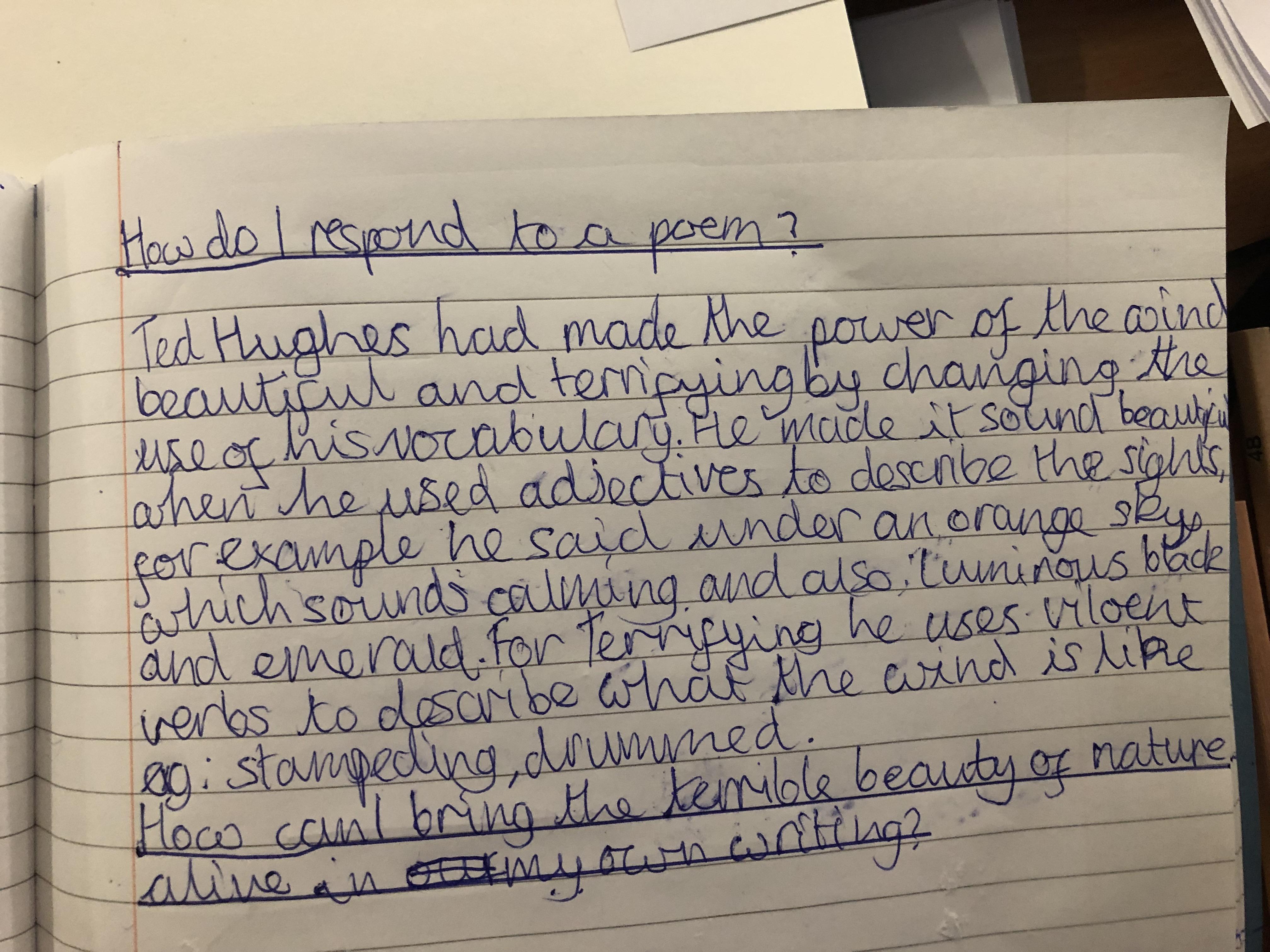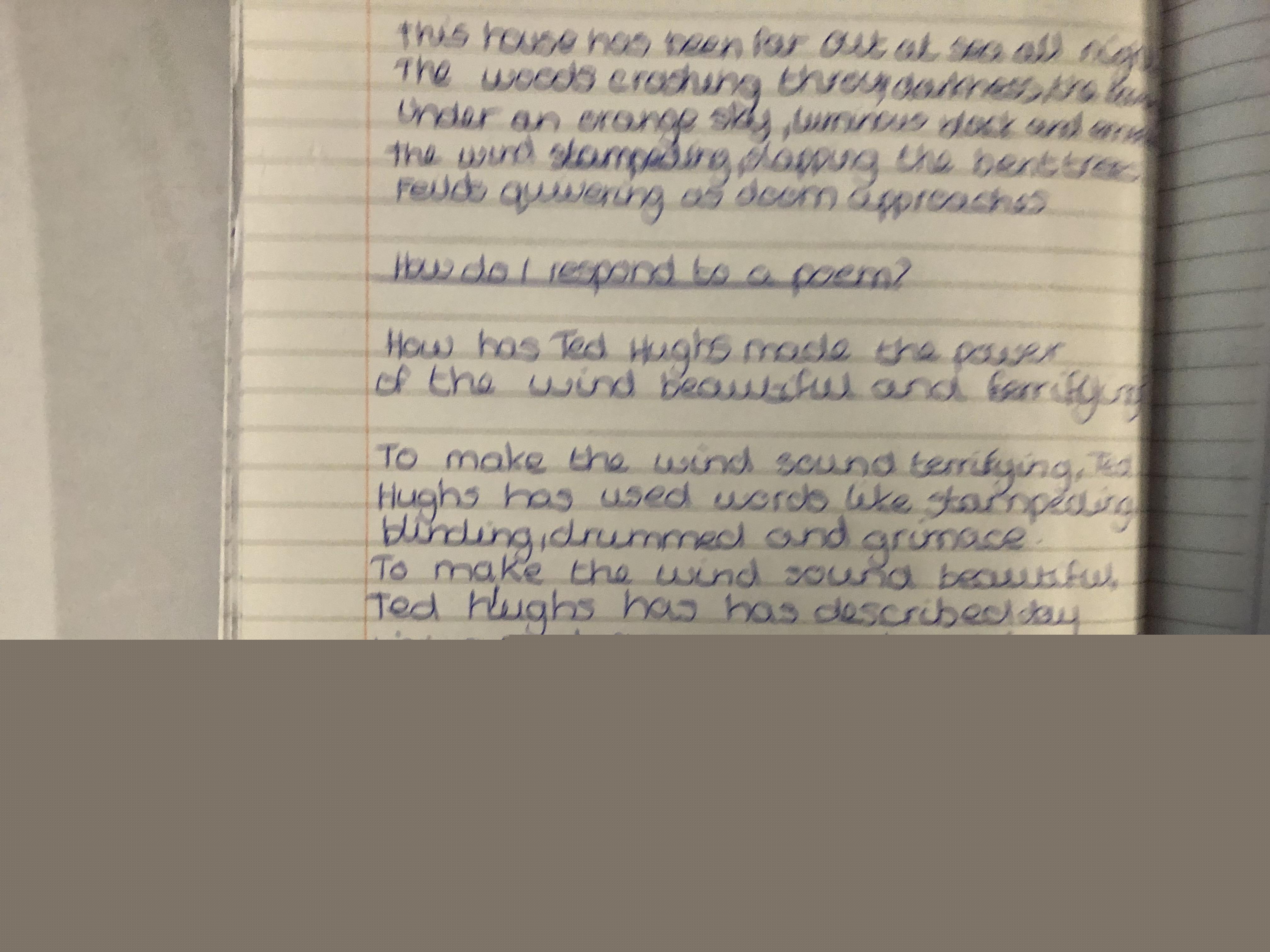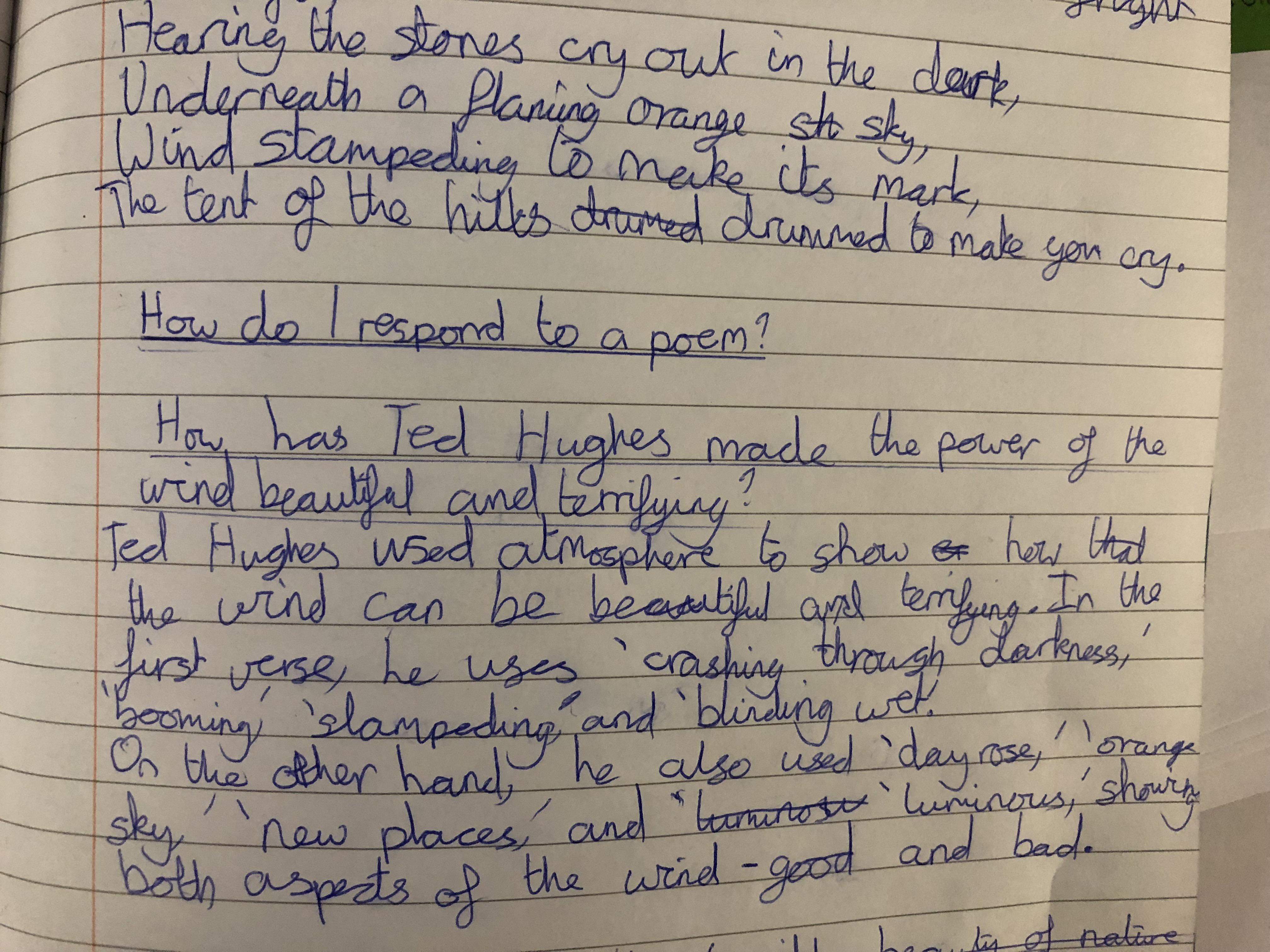 We looked at the poem ‘Wind’ by Ted Hughes. We learnt about paradox and oxymoron as well as recognising other devices the poet had used including, metaphor, personification, alliteration and how verb choices can create atmosphere.
