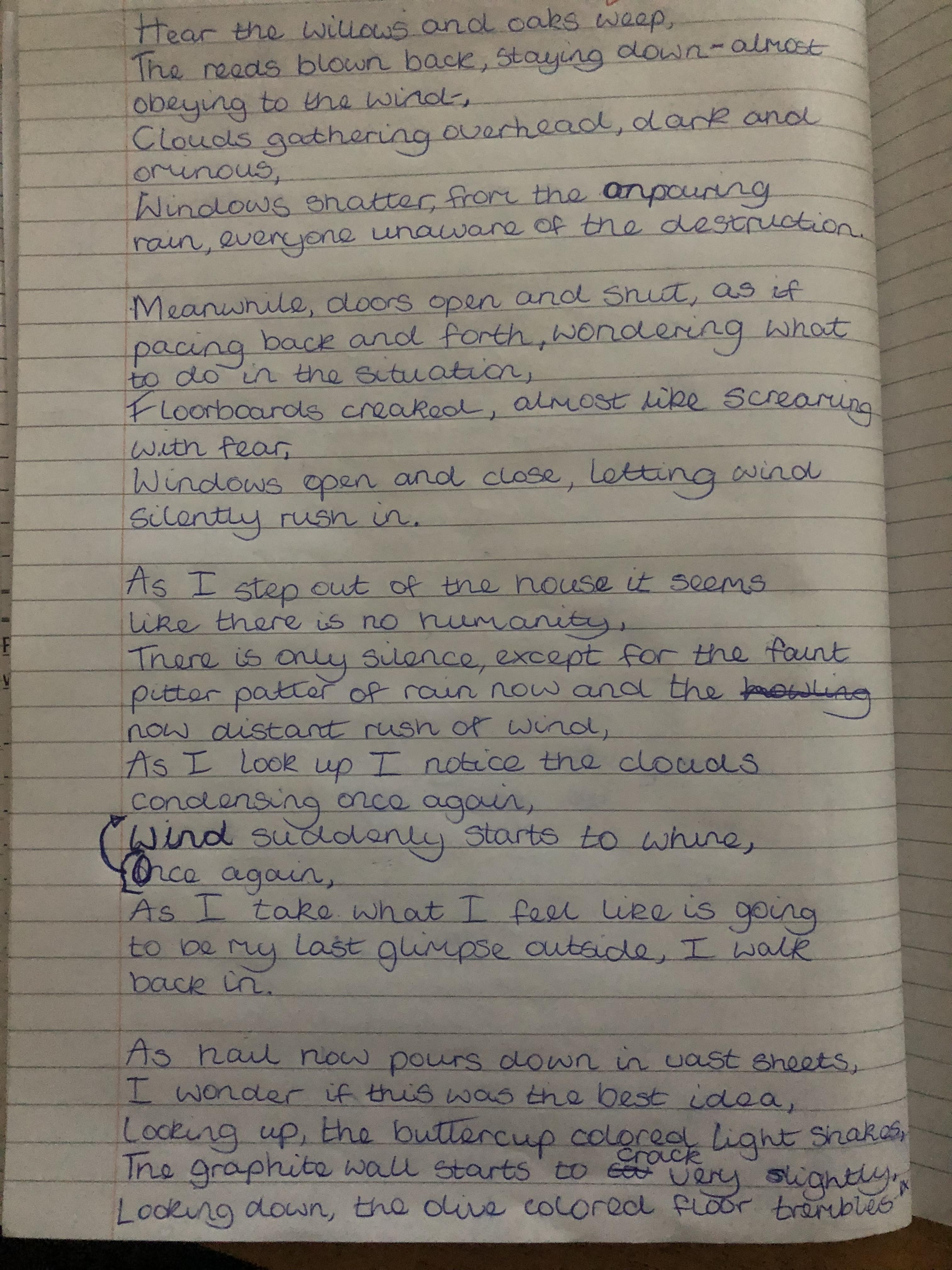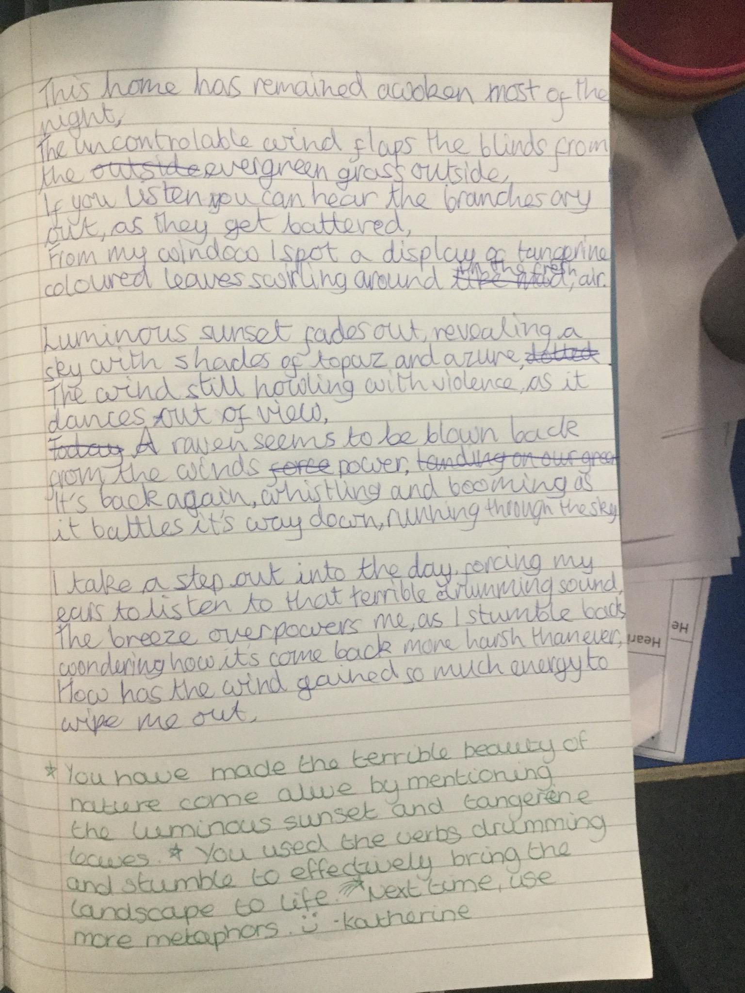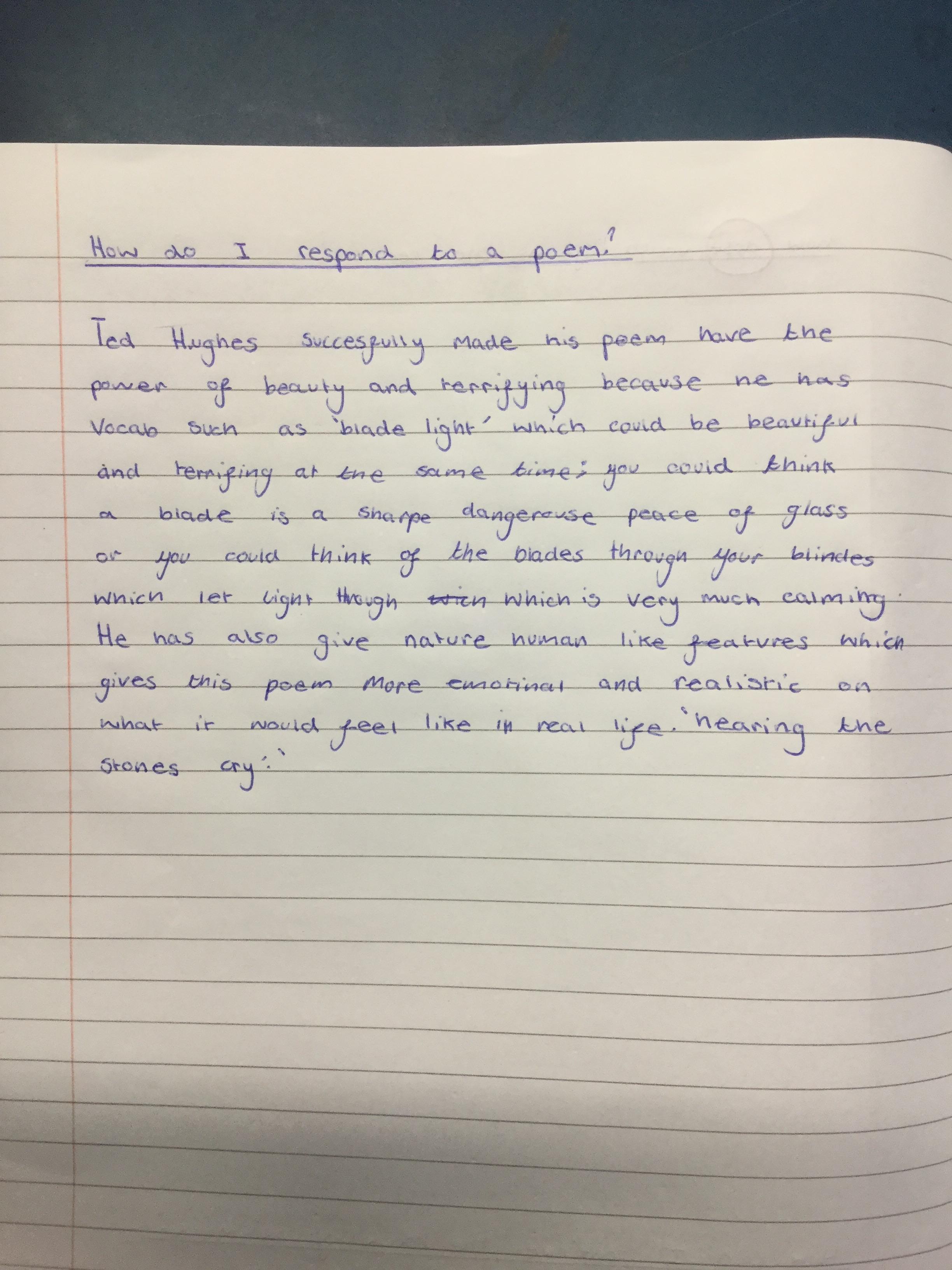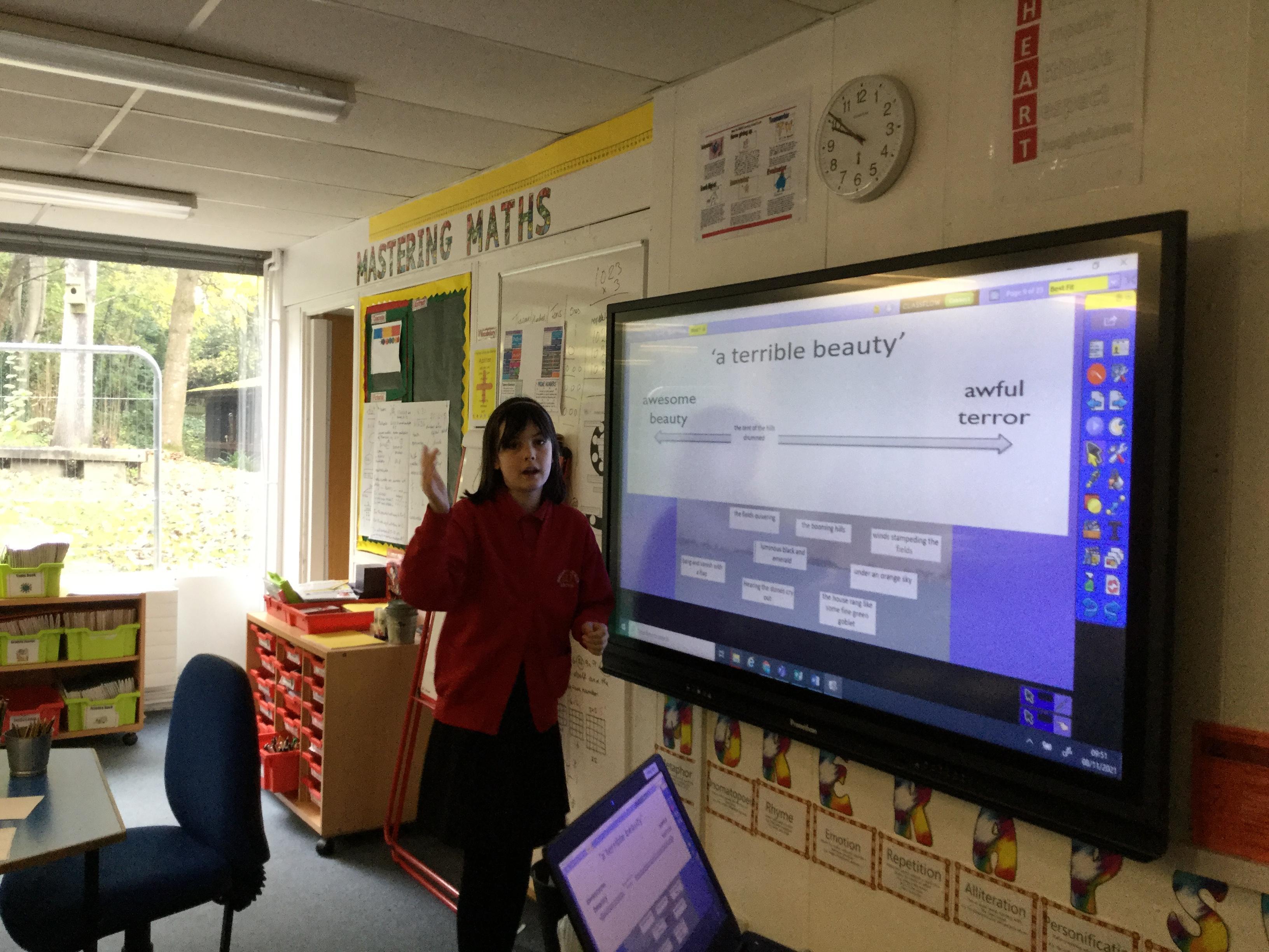 We looked at the poem ‘Wind’ by Ted Hughes. We learnt about paradox and oxymoron as well as recognising other devices the poet had used including, metaphor, personification, alliteration and how verb choices can create atmosphere.
