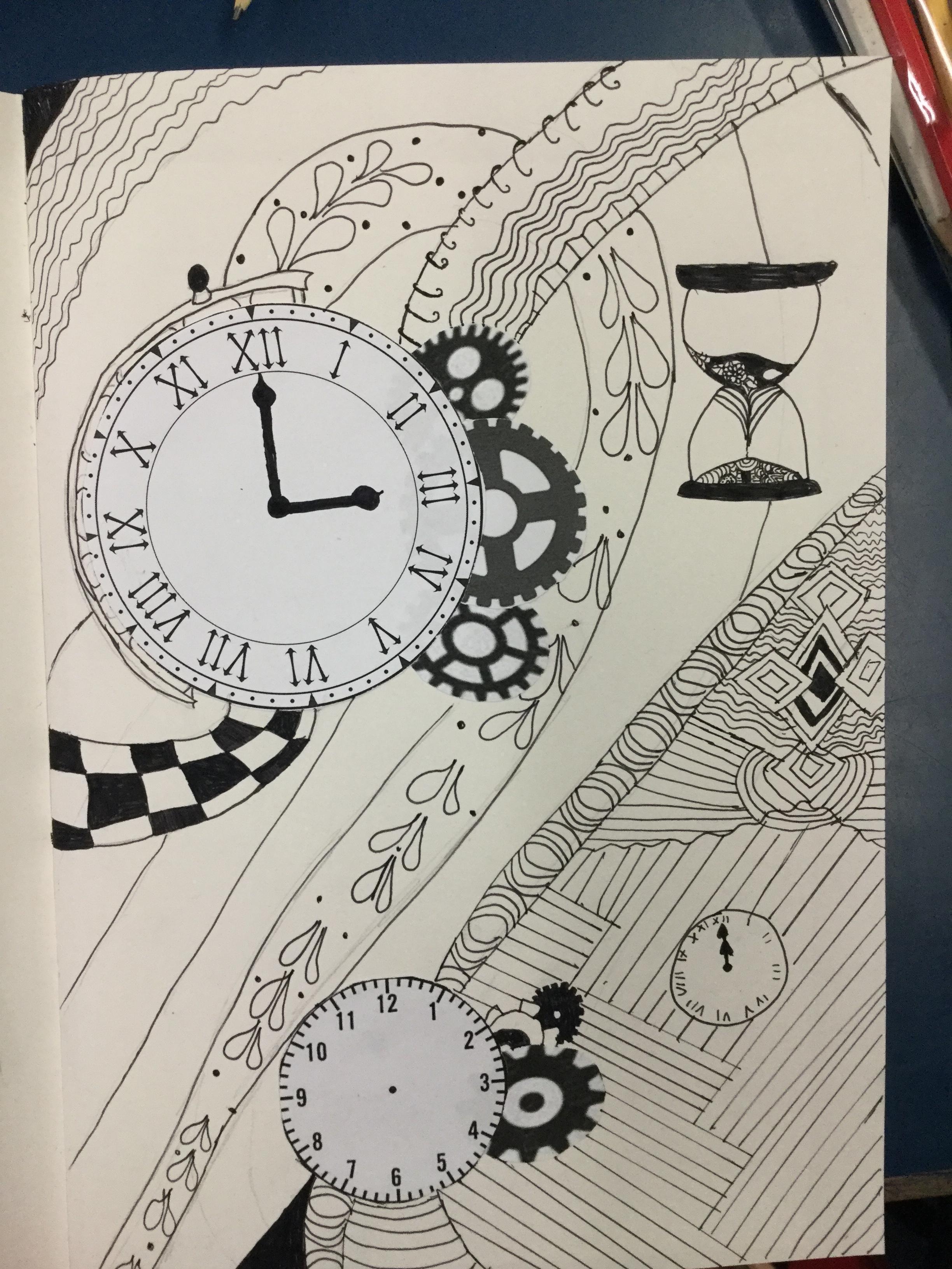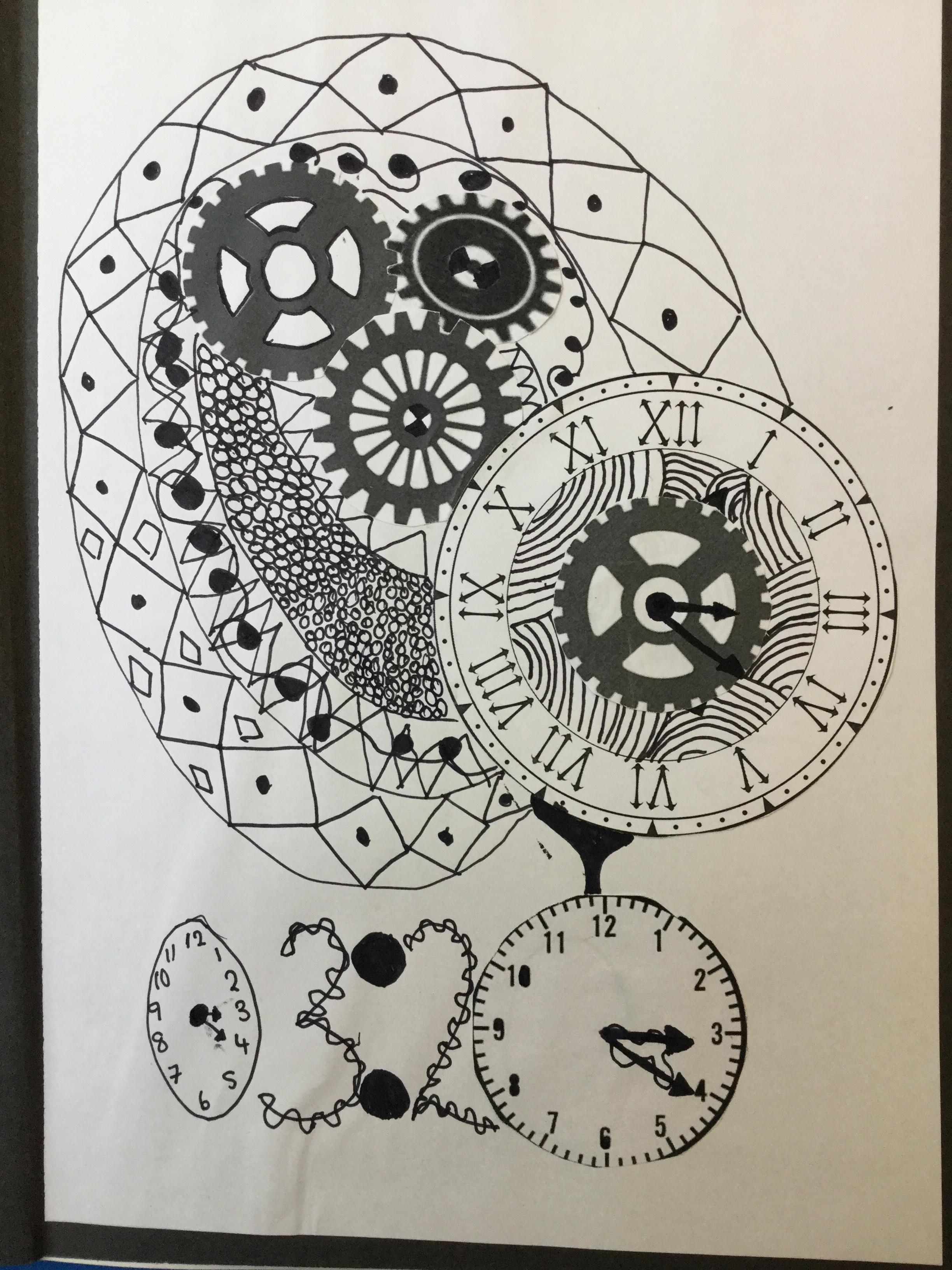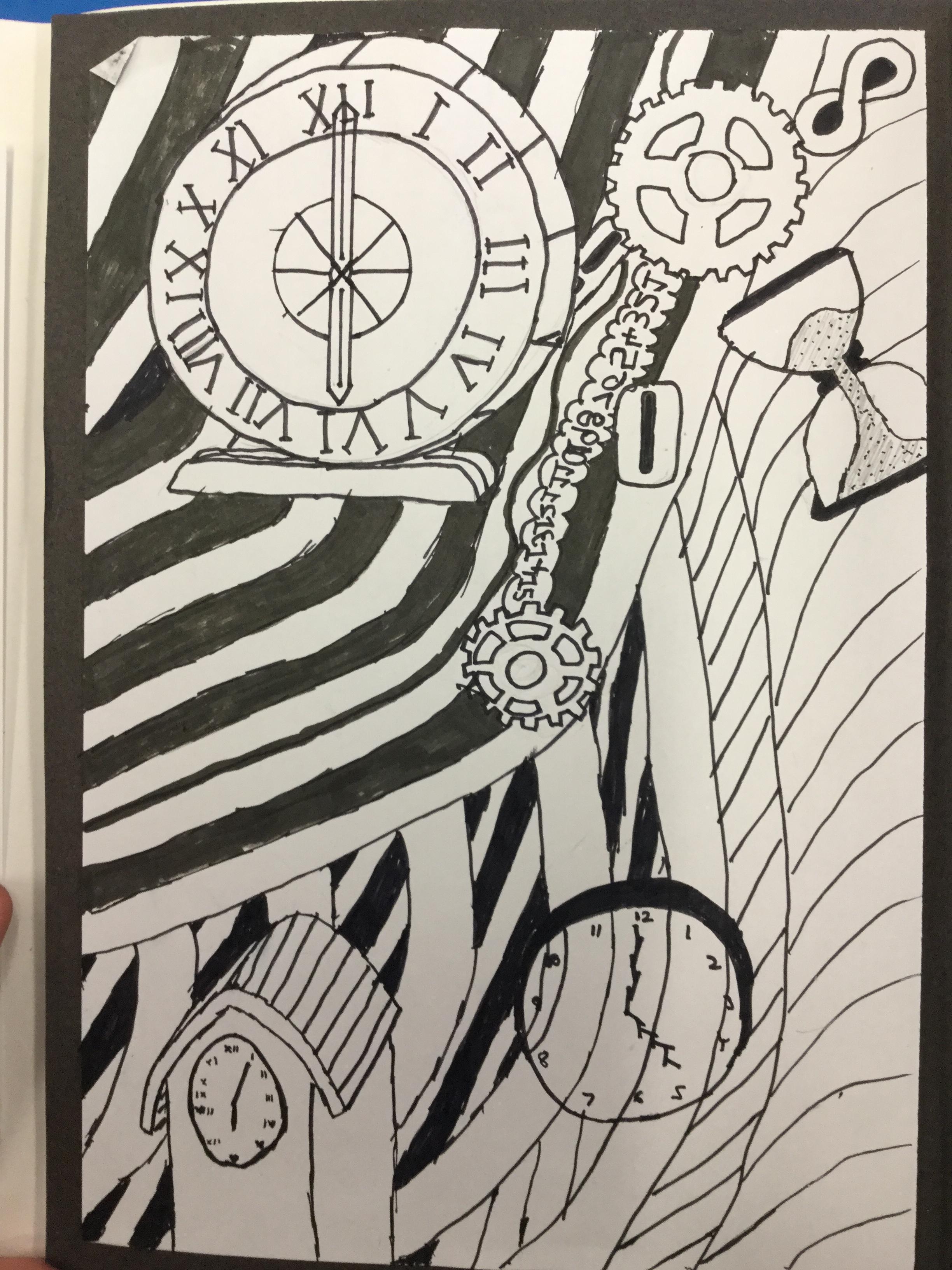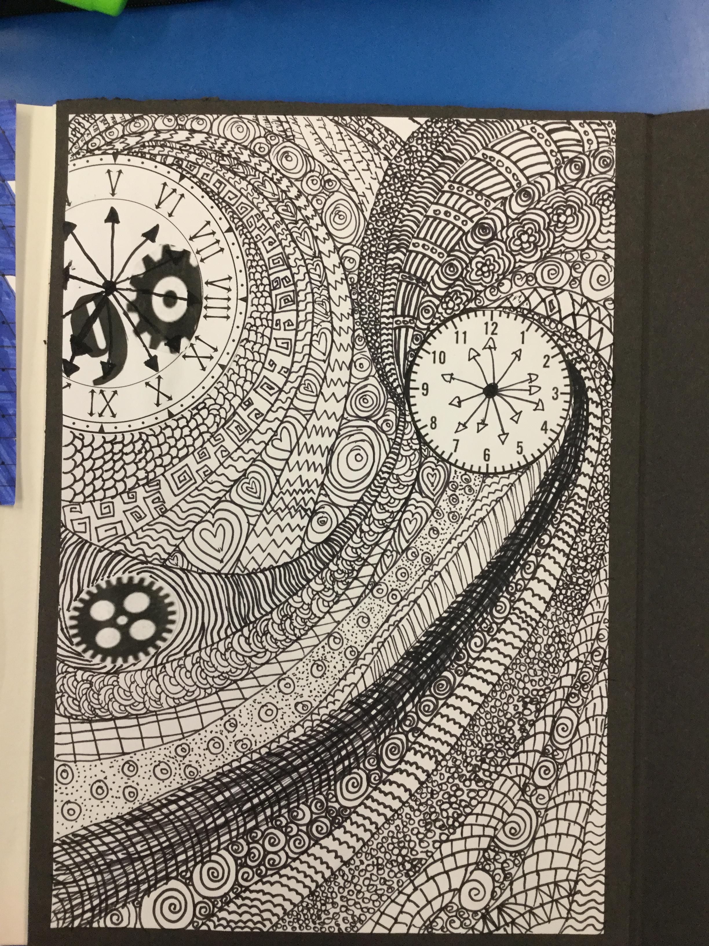 After discussing the symbolism of clocks through The Invention of Hugo Cabret, we created zen doodles related to time and clocks.