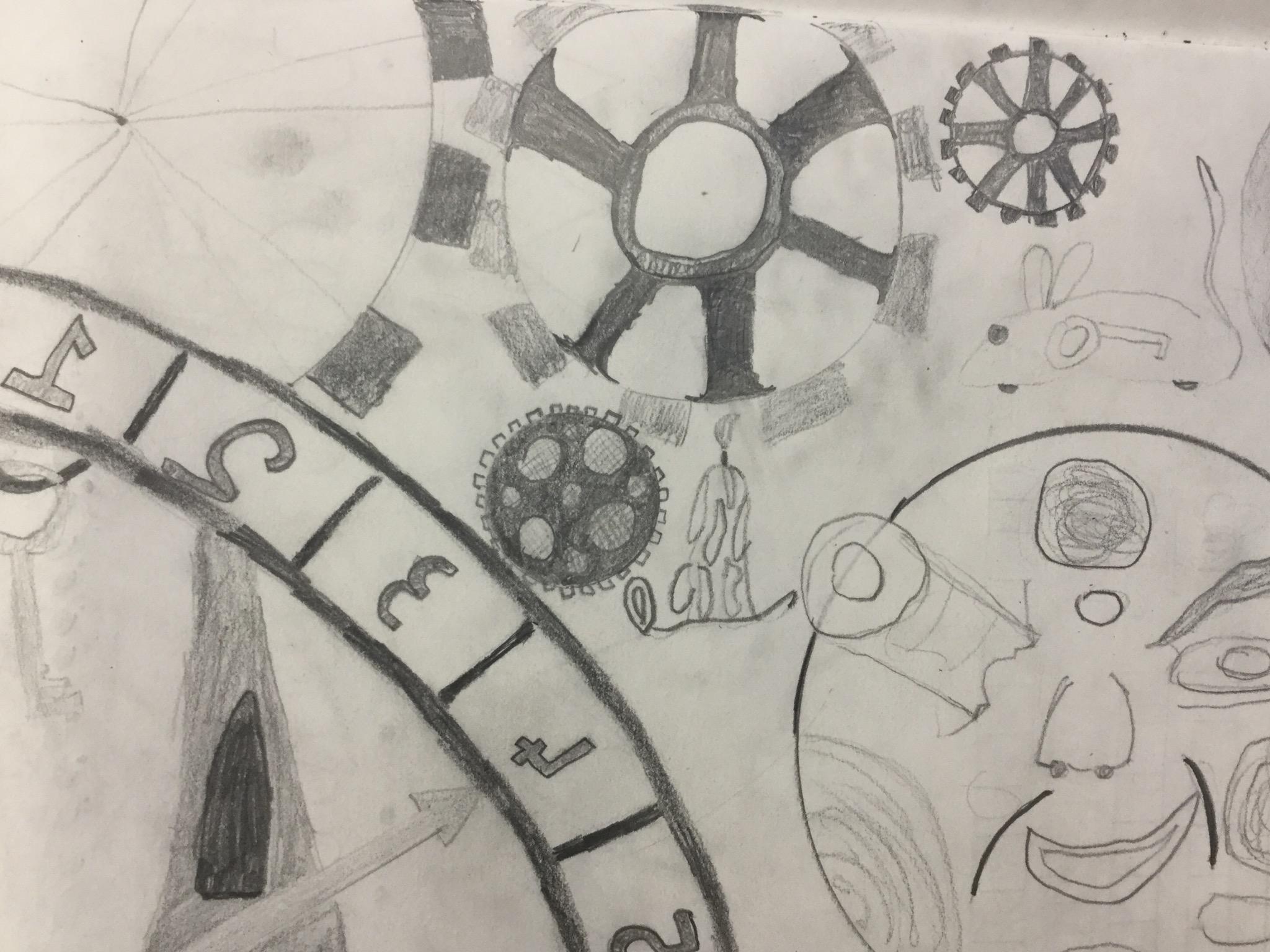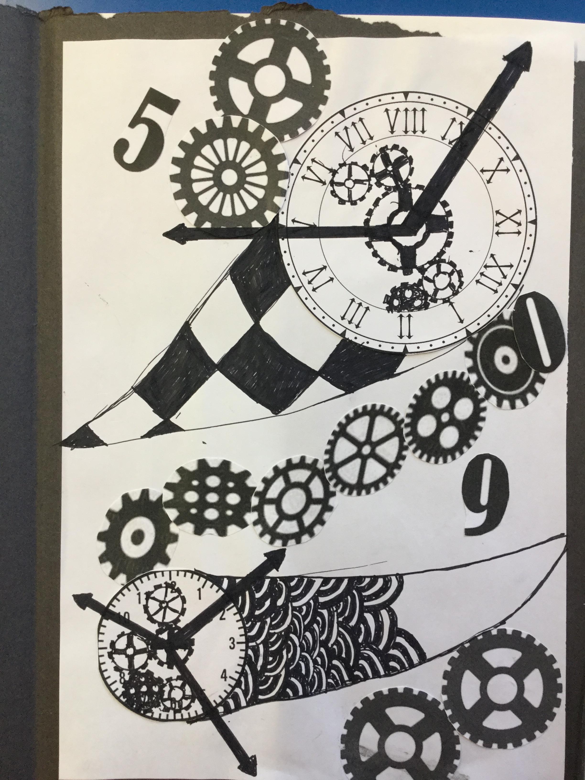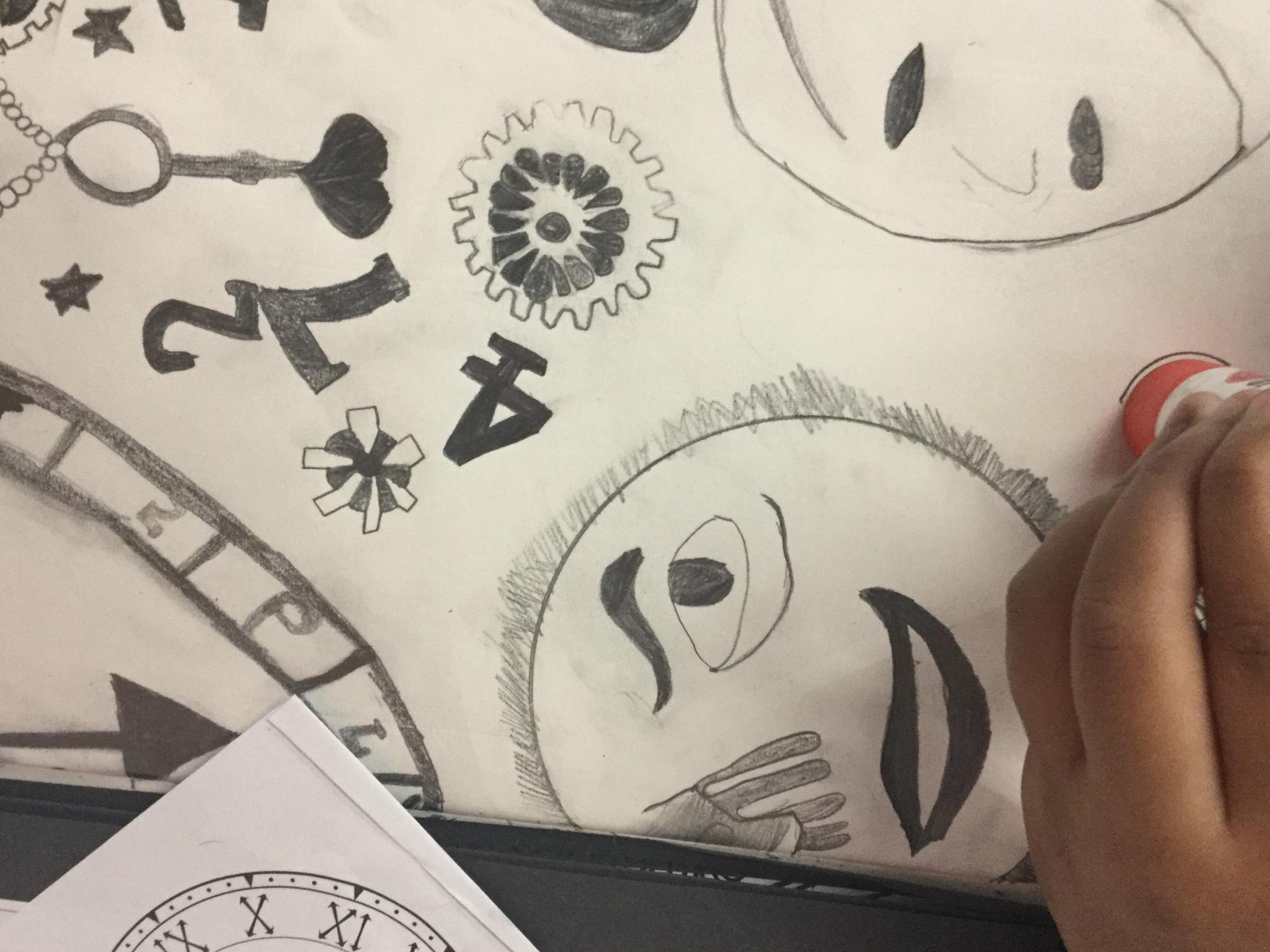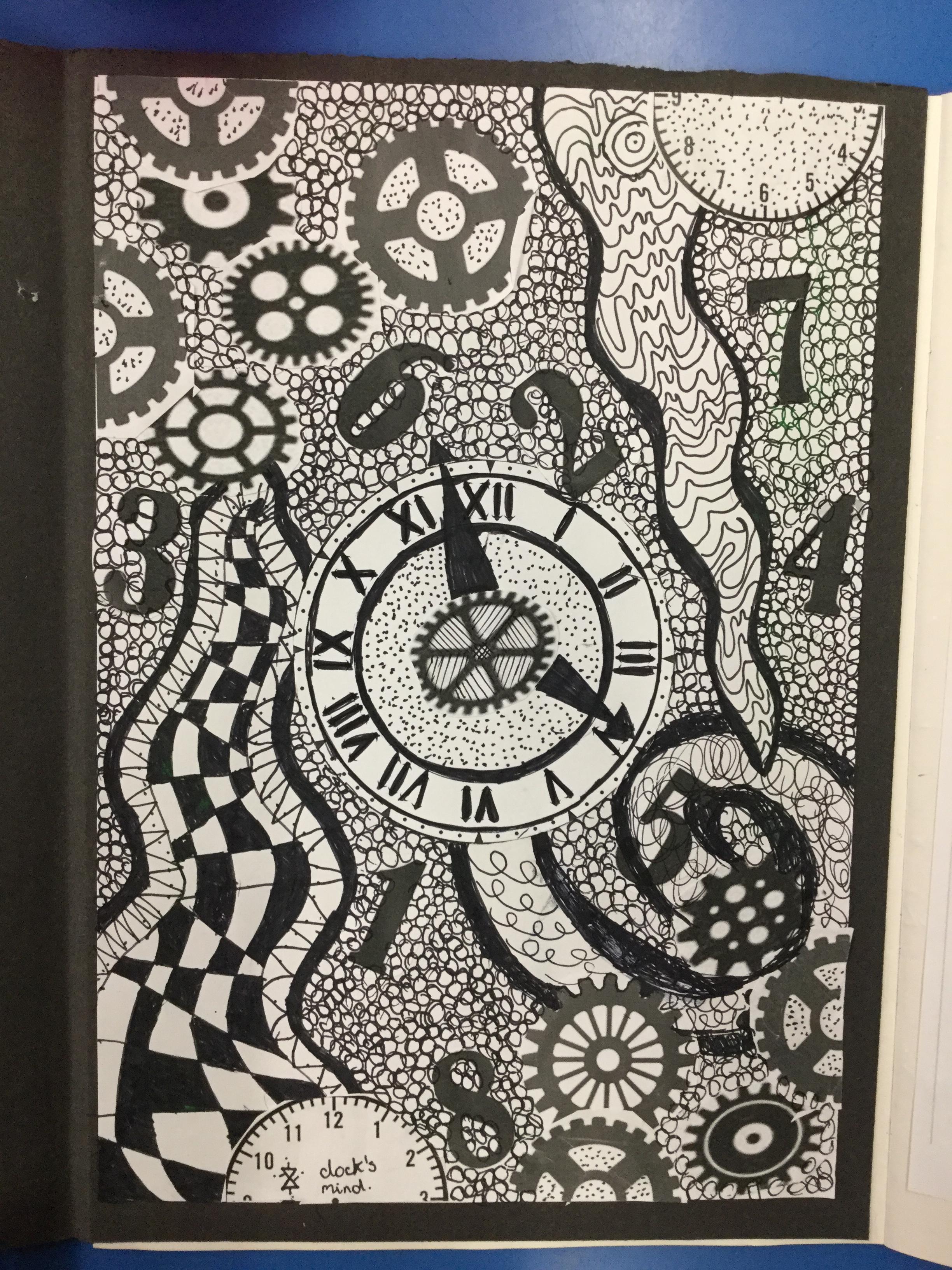 After discussing the symbolism of clocks through The Invention of Hugo Cabret, we created zen doodles related to time and clocks.
