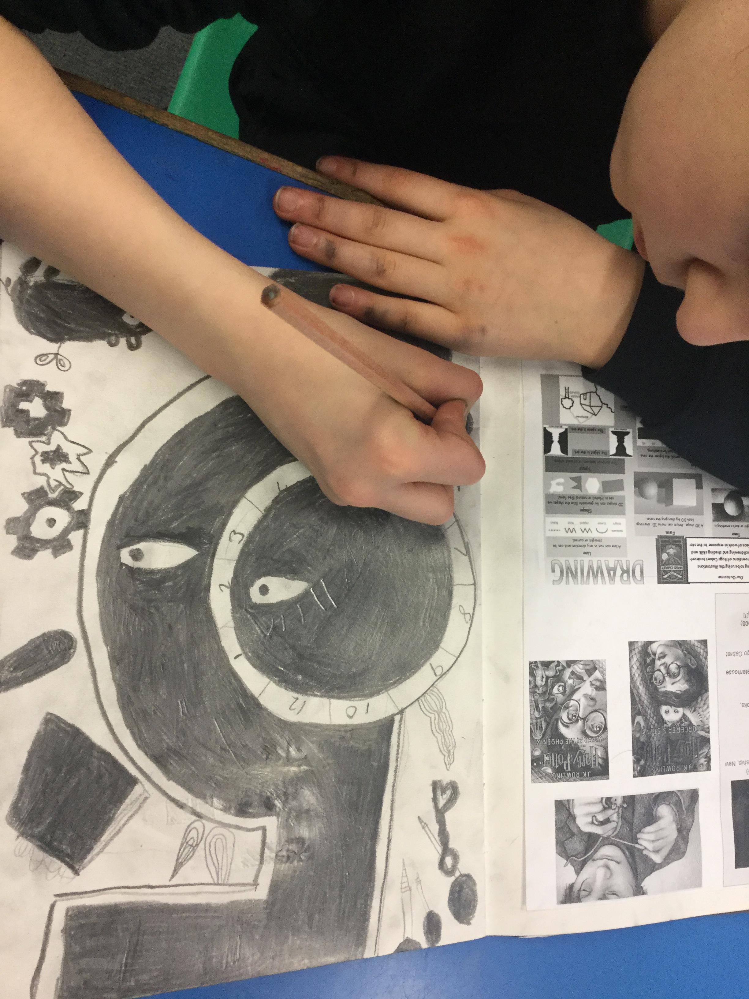 Year 6 have been experimenting with different stretching pencils and shading in preparation of creating their own illustration in the style of Brain Selznick (author of this half term’s text The Invention of Hugo Cabret).