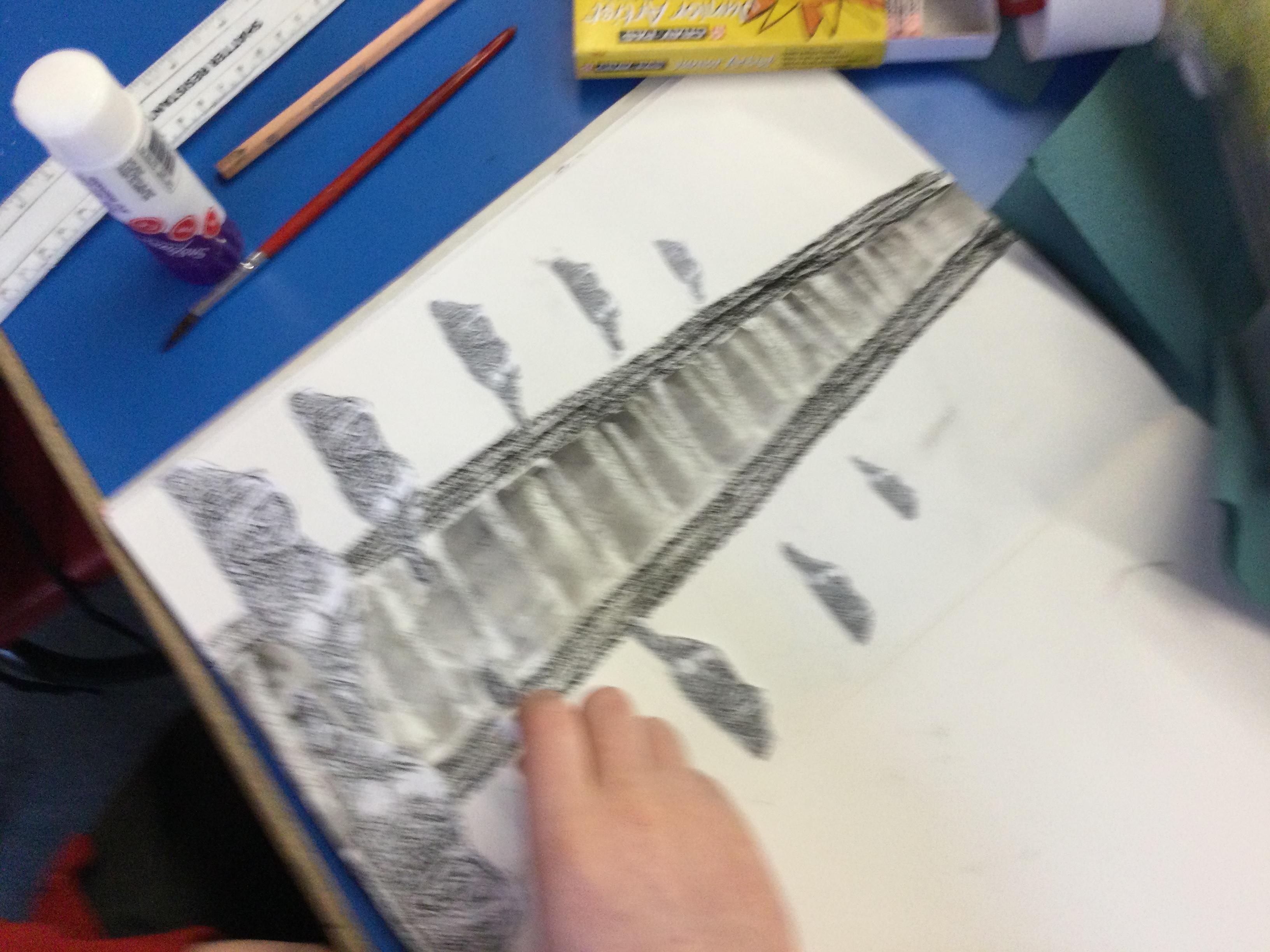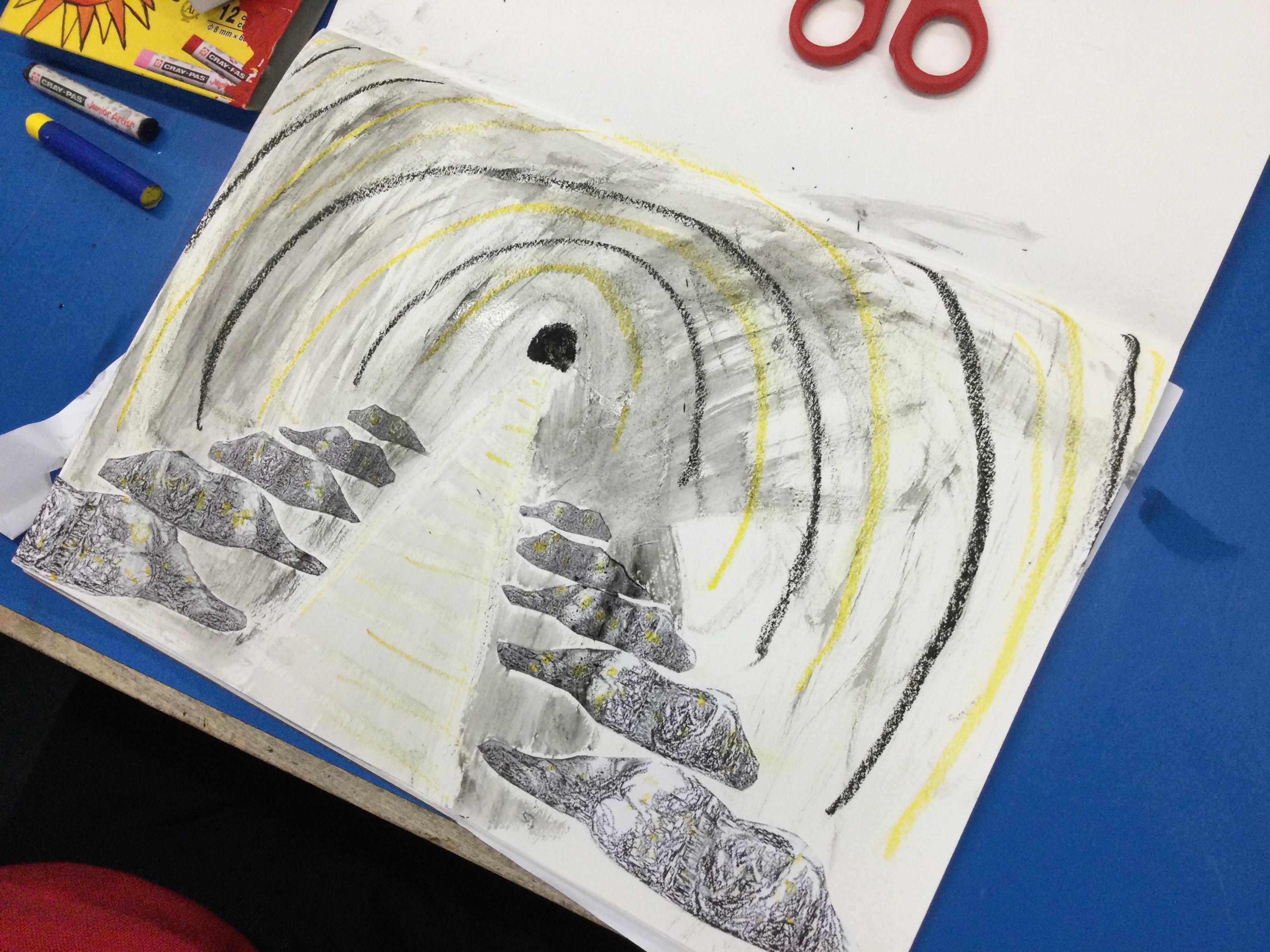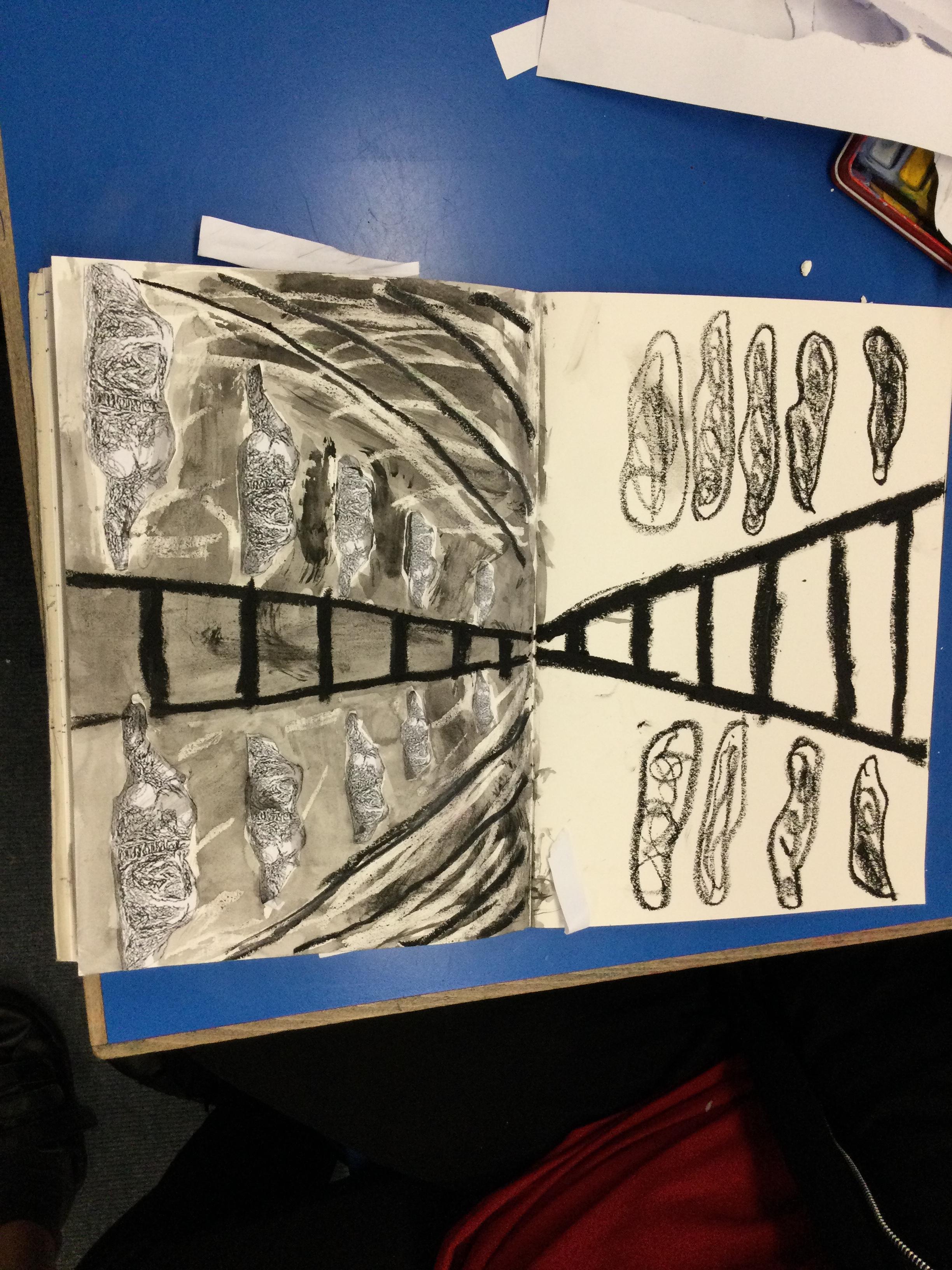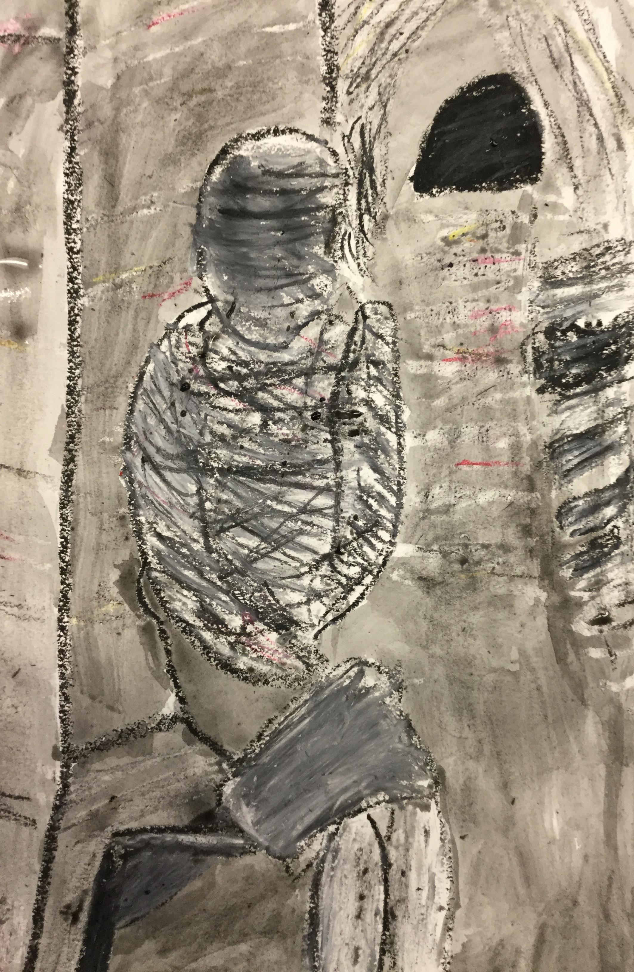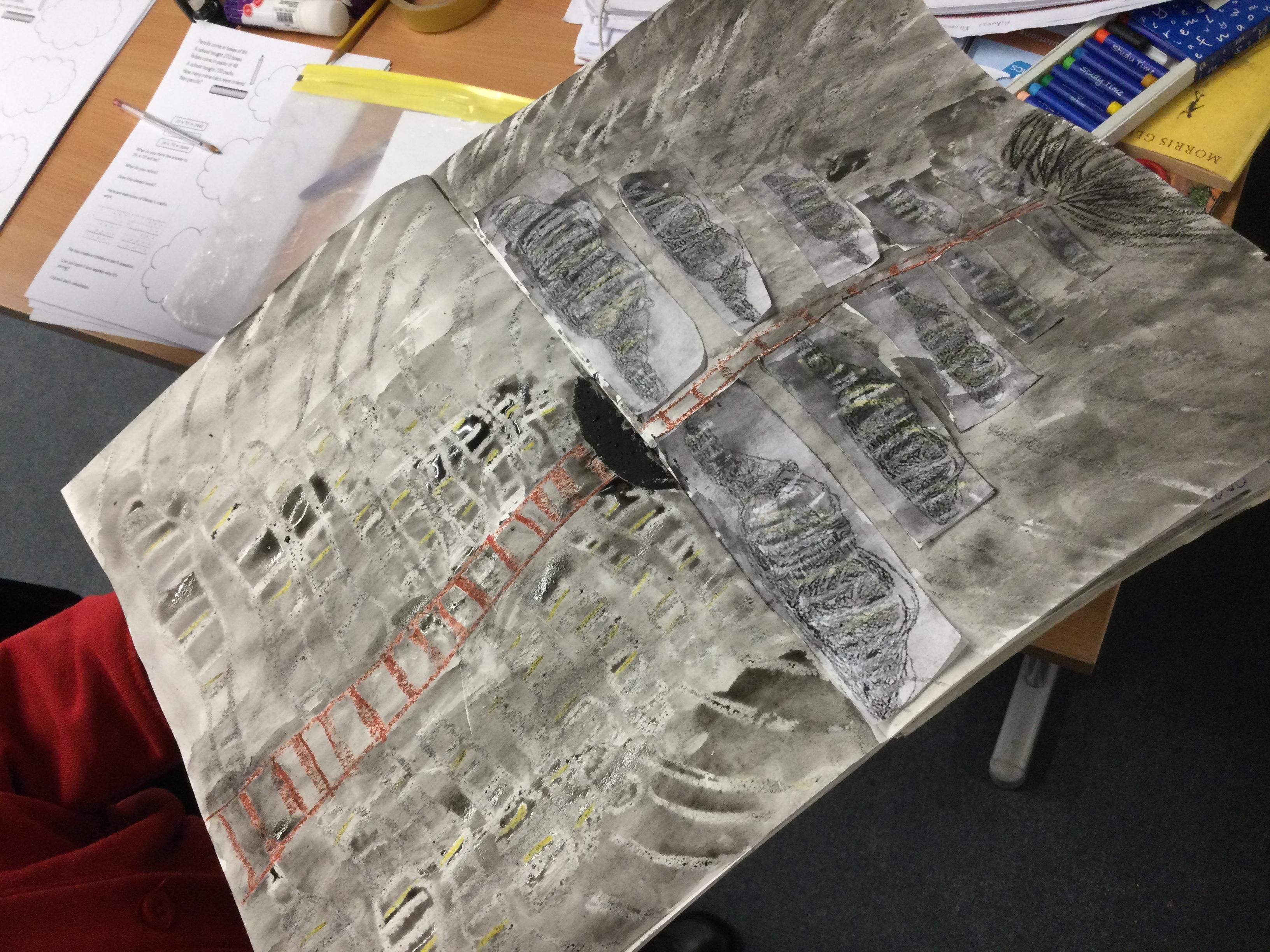 Moving on from our pencil work, we used Henry Moore’s resist techniques along with oil pastels to create atmospheric artwork depicting people using the underground as shelter during the Blitz.