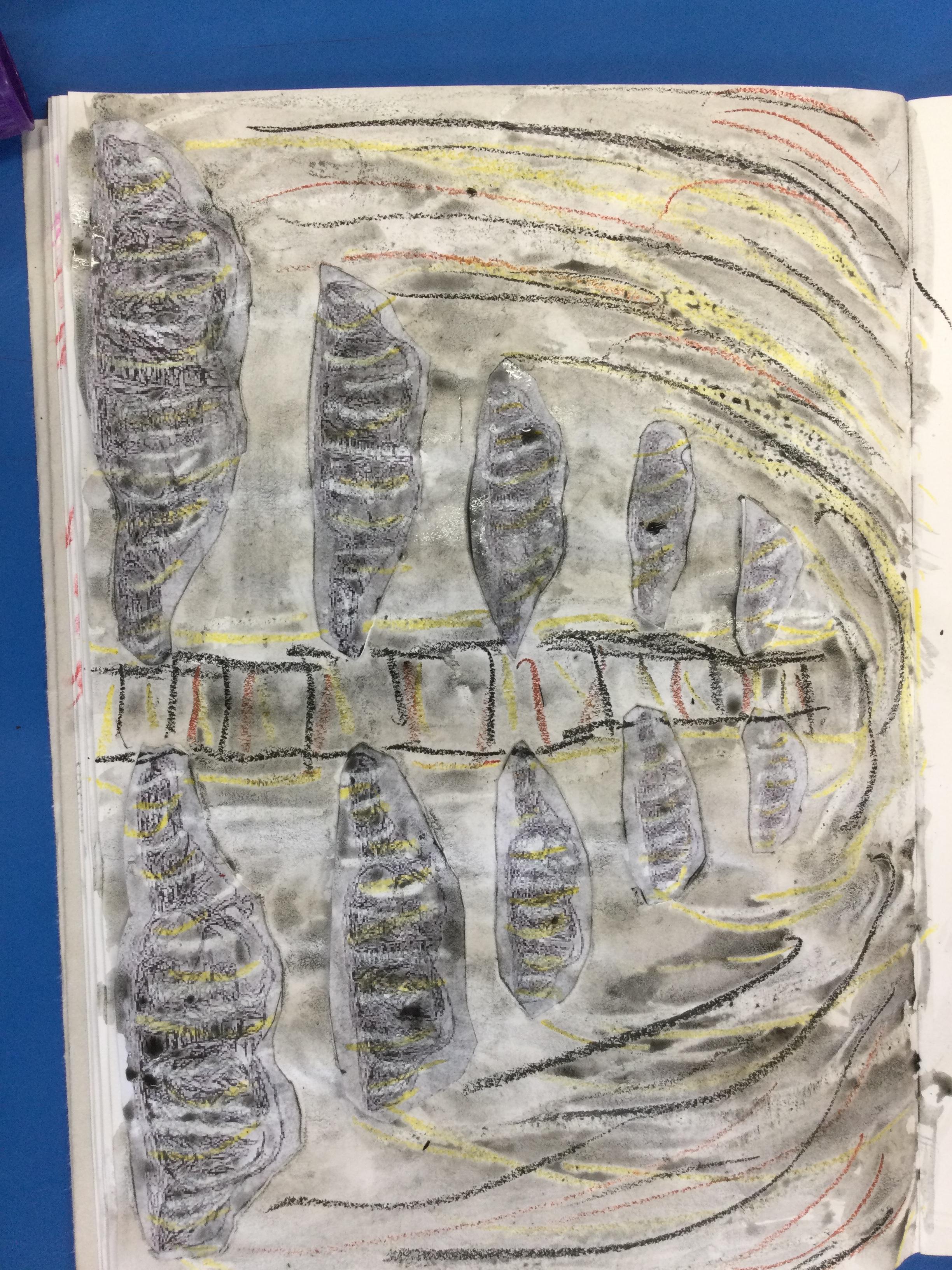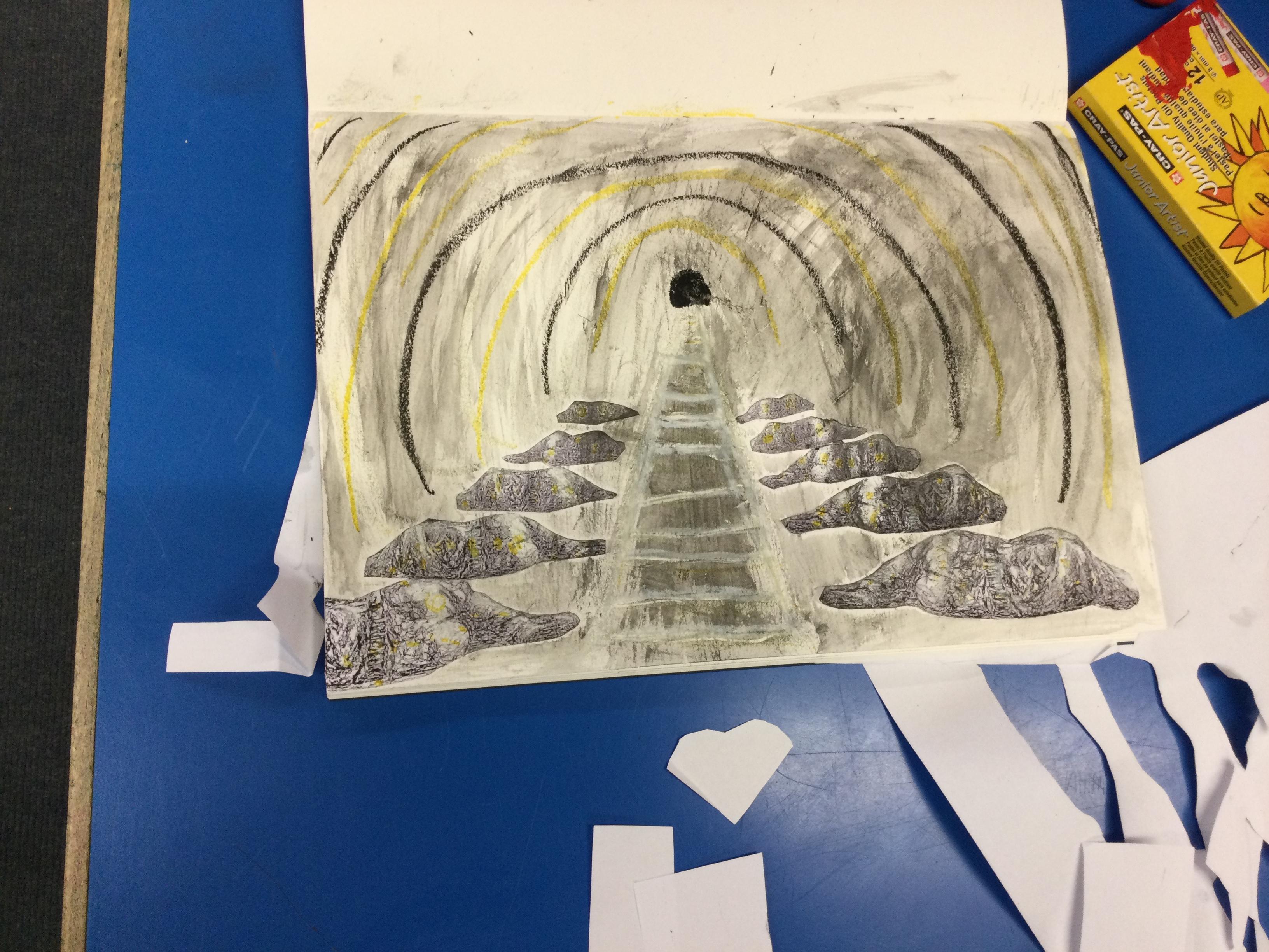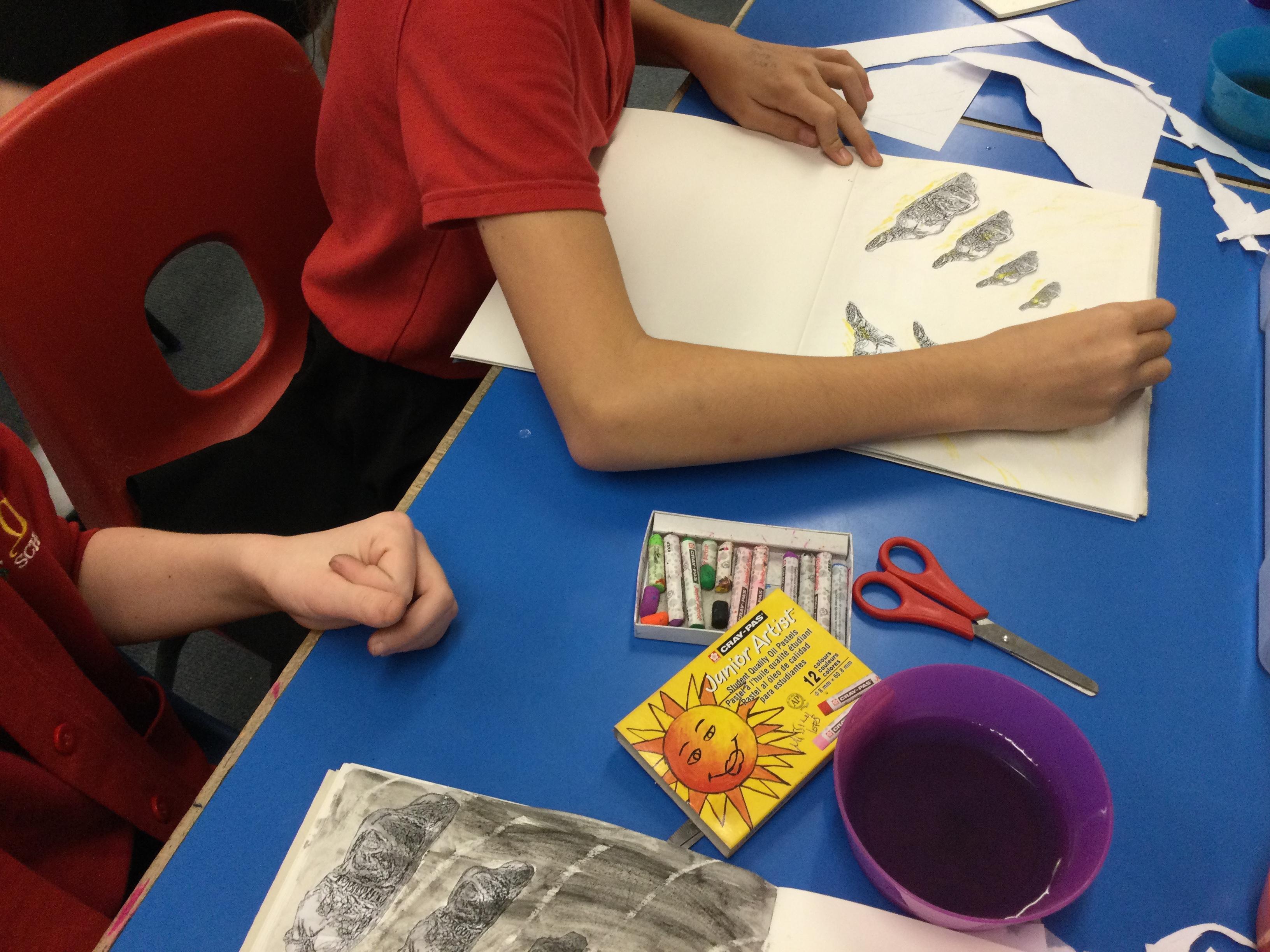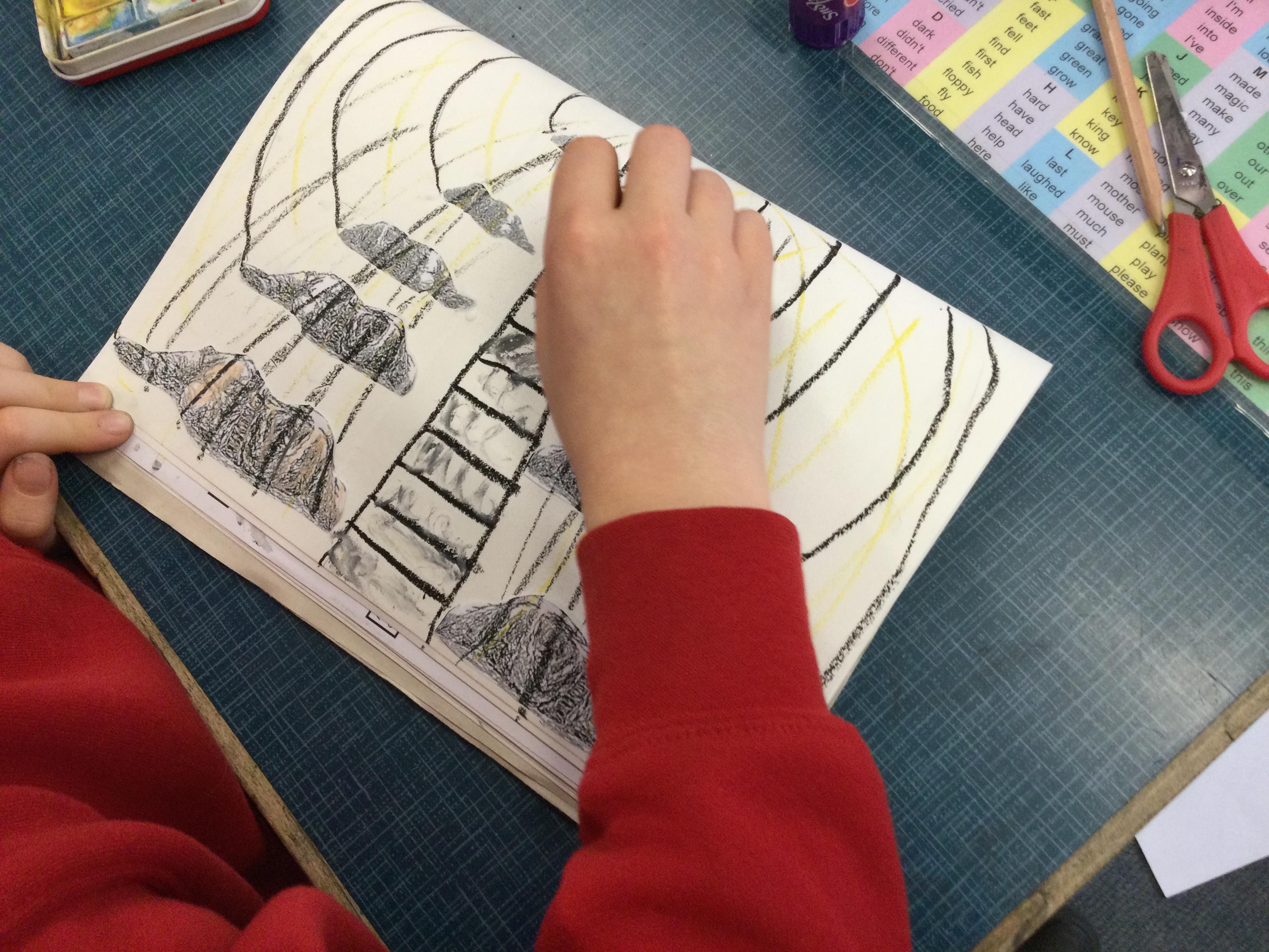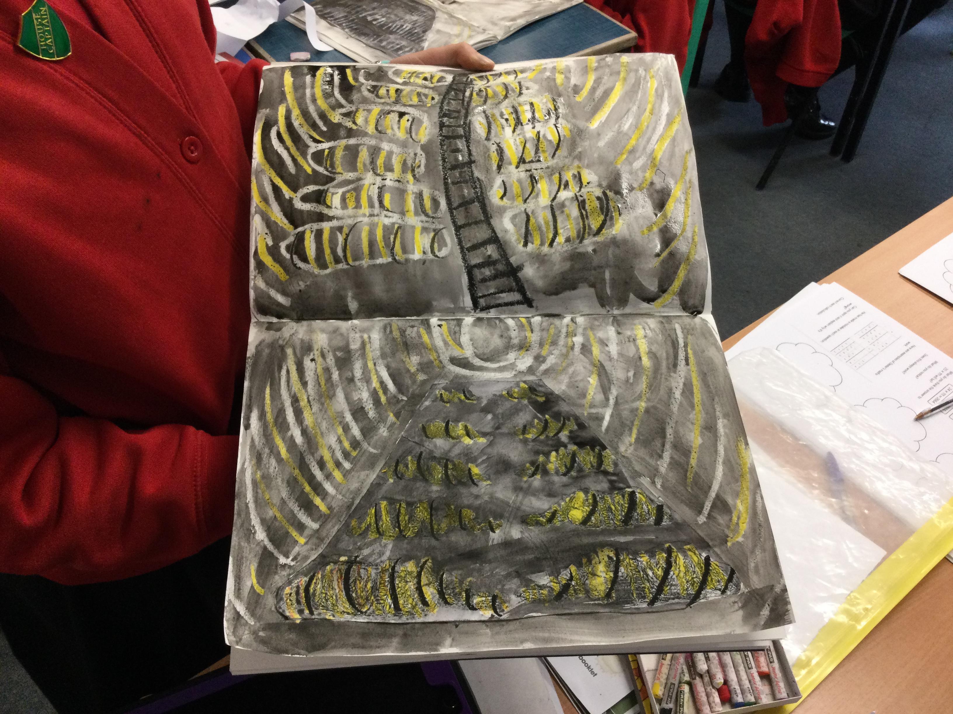Moving on from our pencil work, we used Henry Moore’s resist techniques along with oil pastels to create atmospheric artwork depicting people using the underground as shelter during the Blitz.