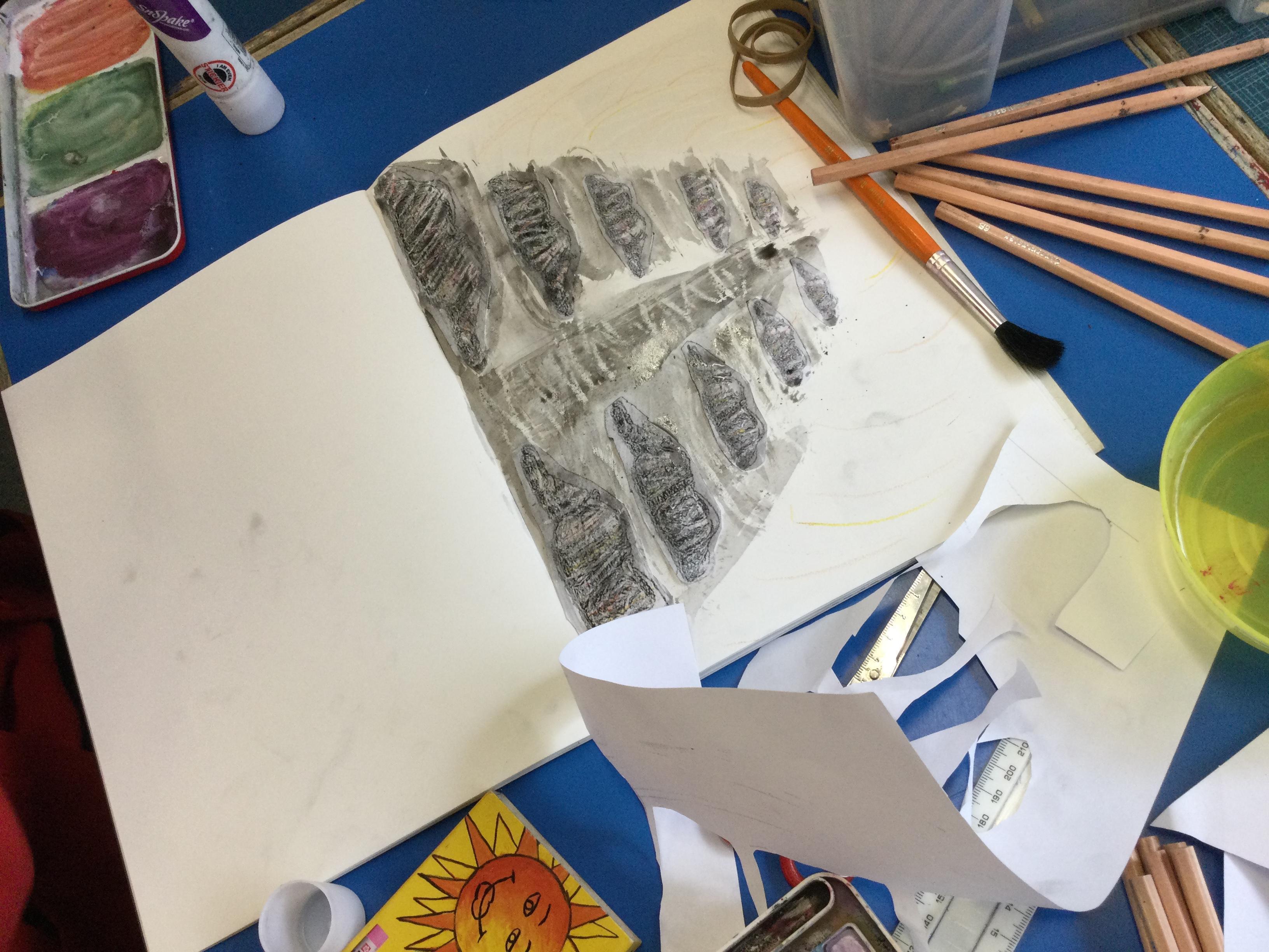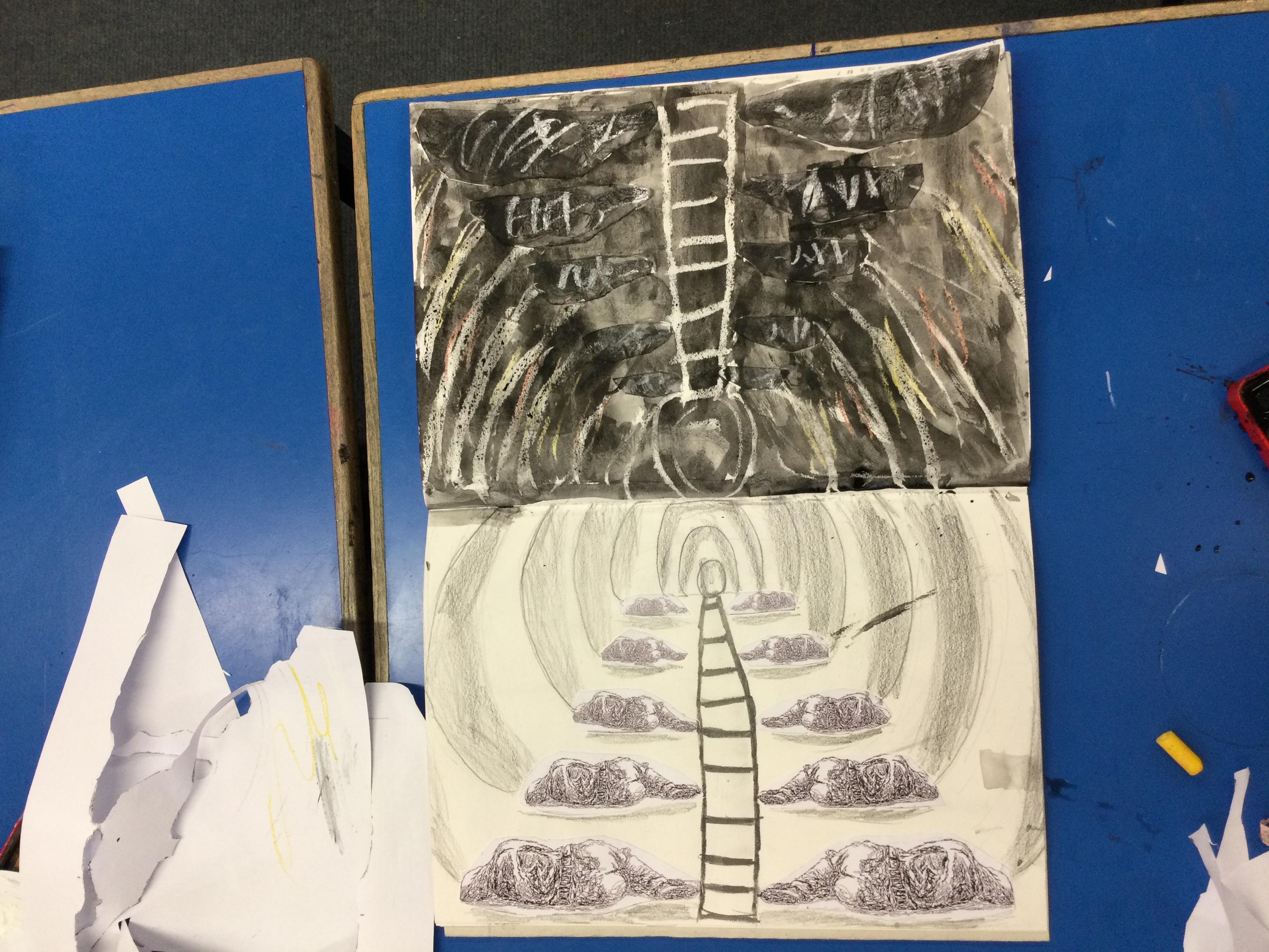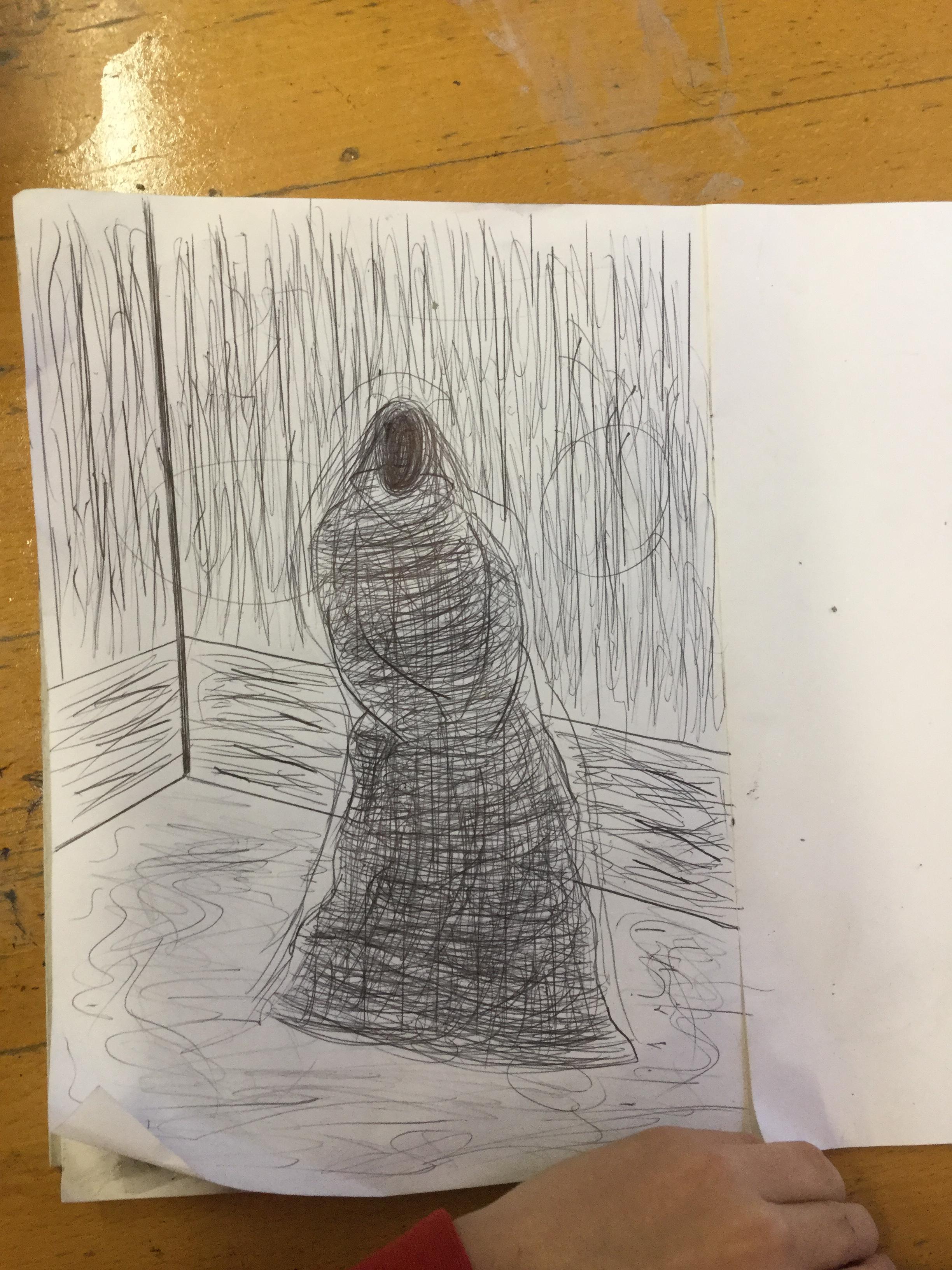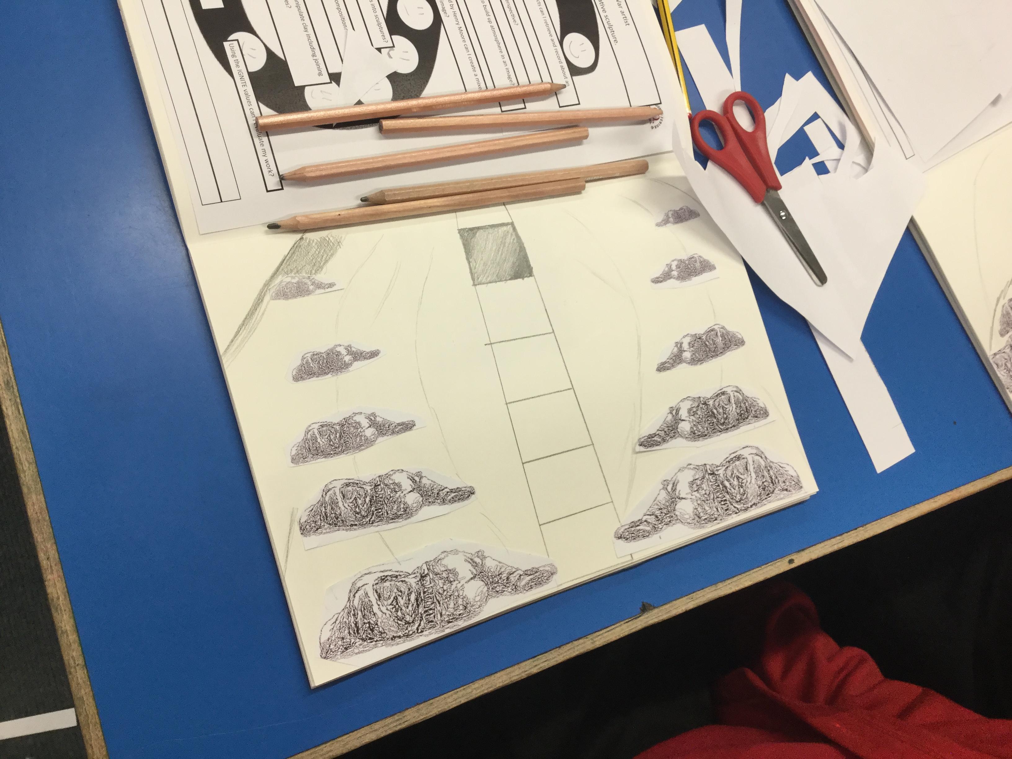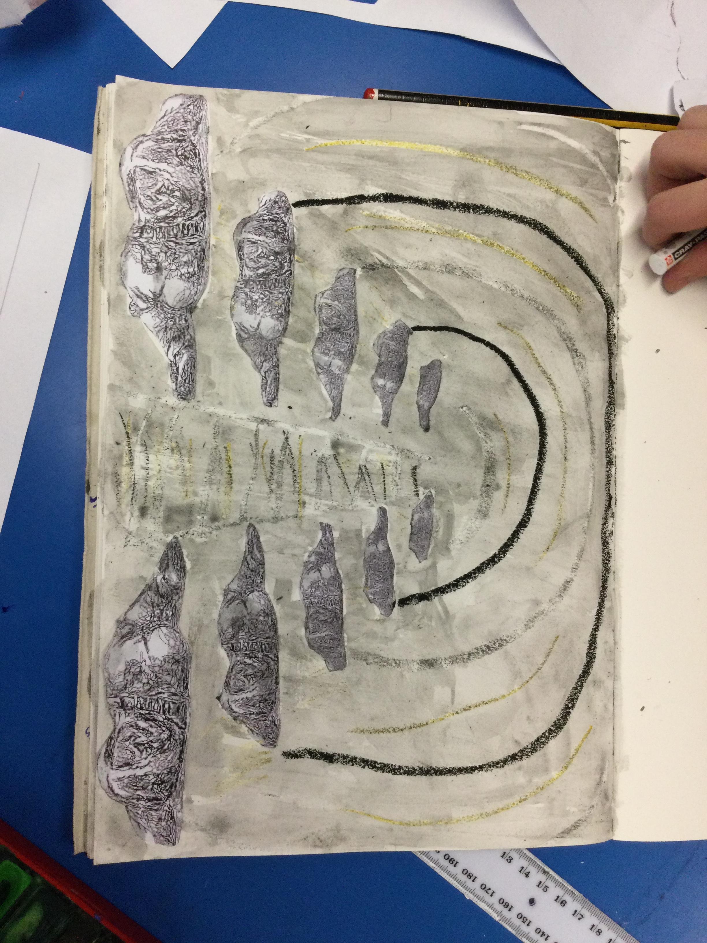 Moving on from our pencil work, we used Henry Moore’s resist techniques along with oil pastels to create atmospheric artwork depicting people using the underground as shelter during the Blitz.