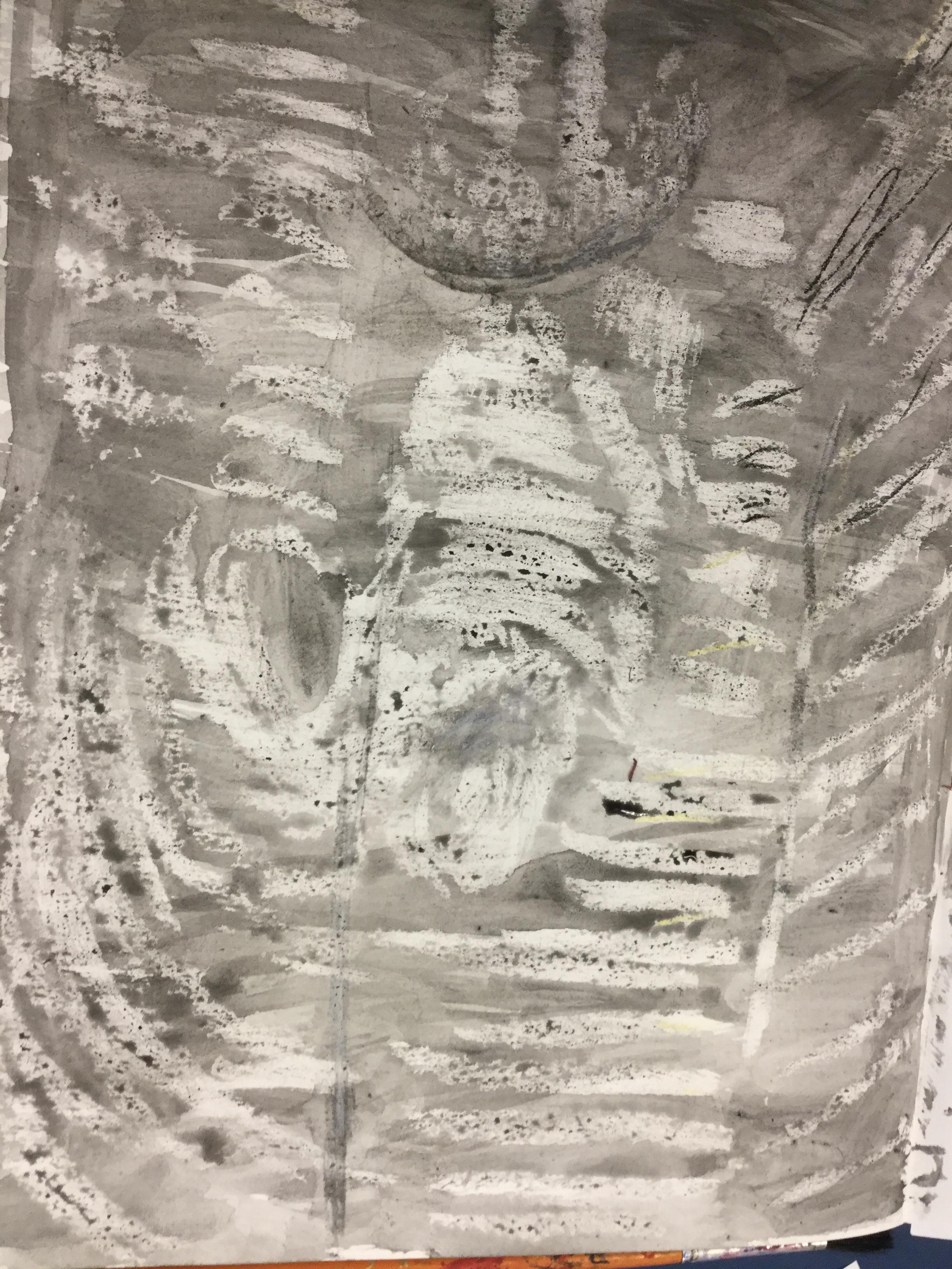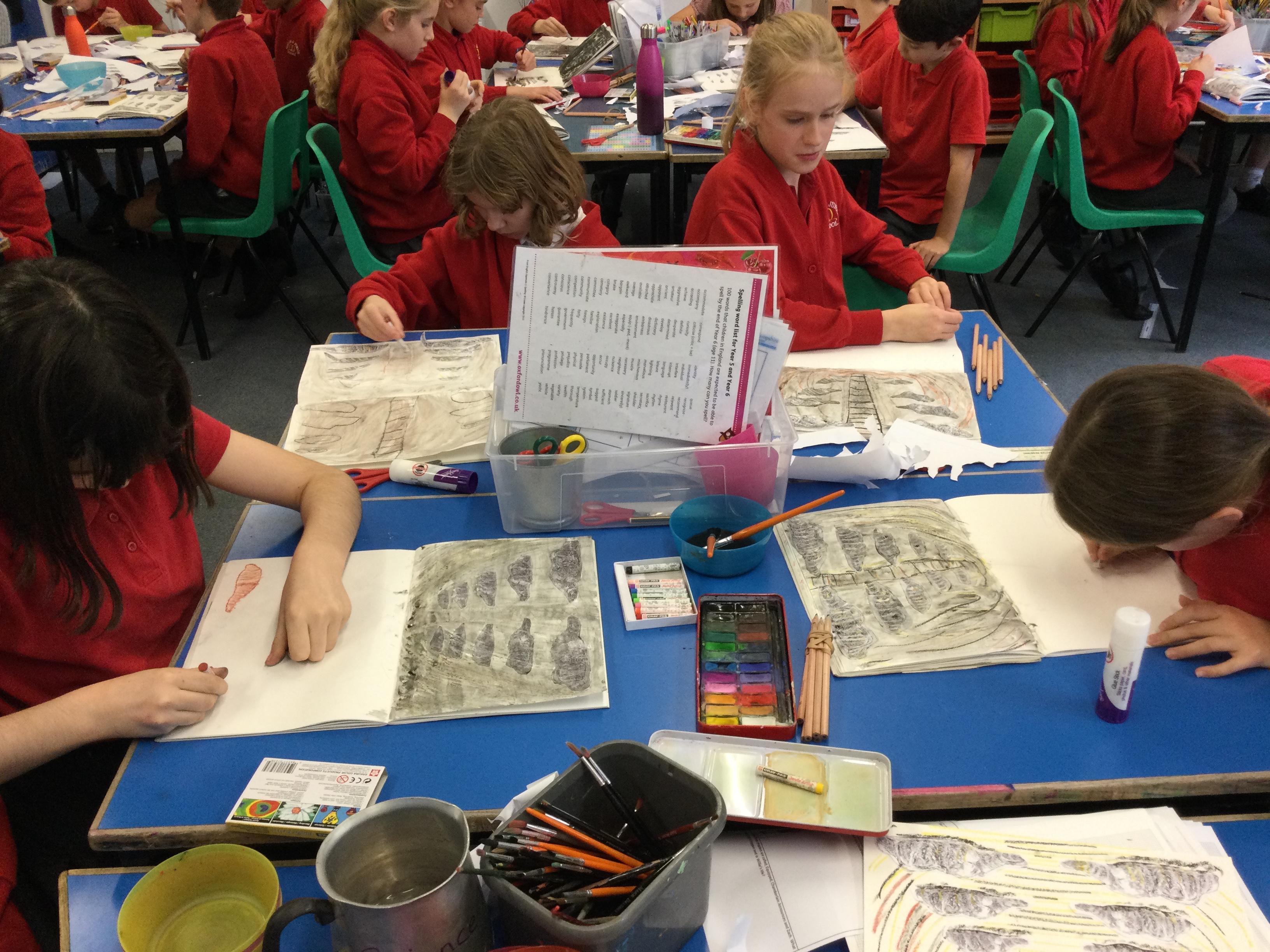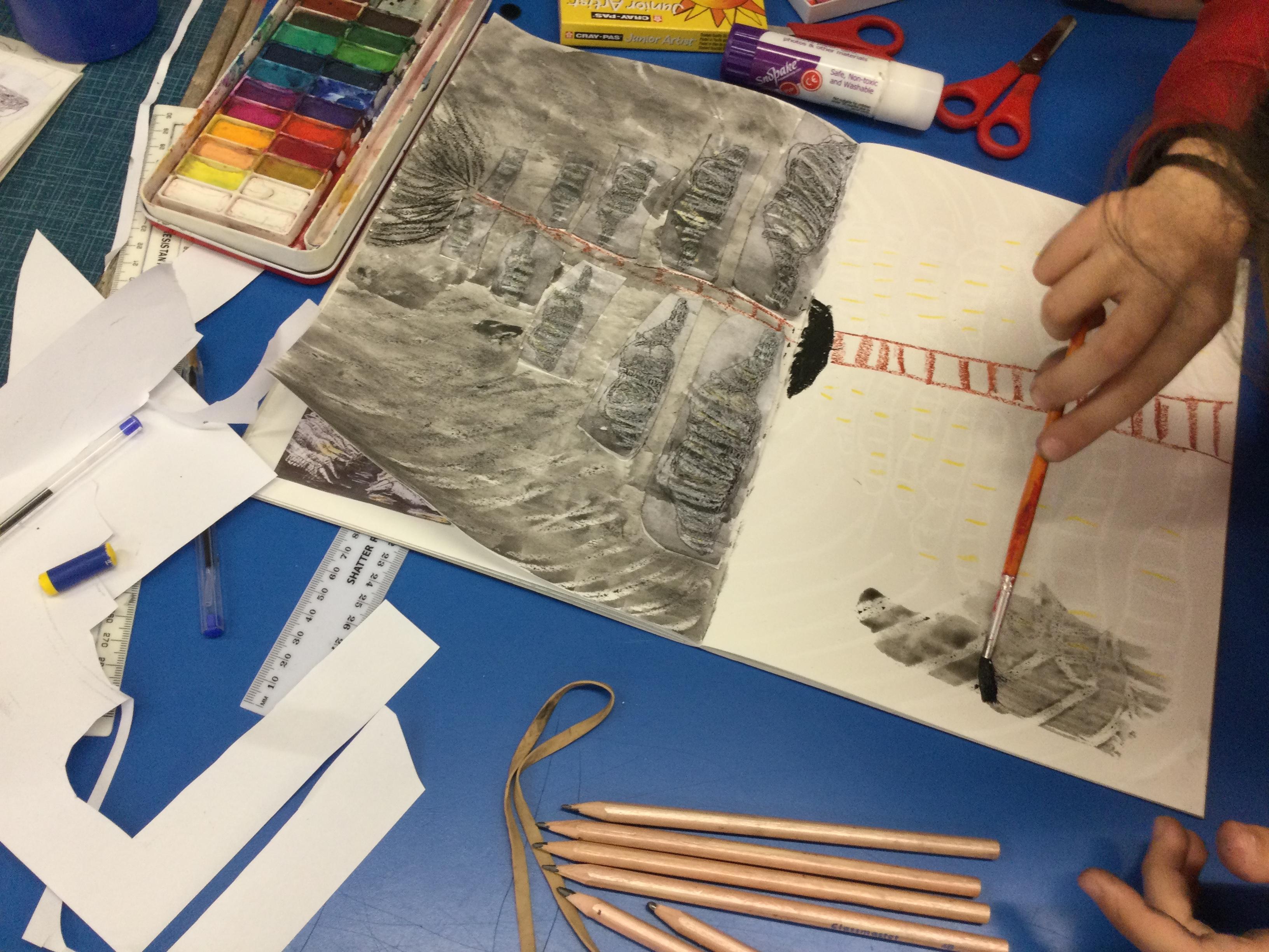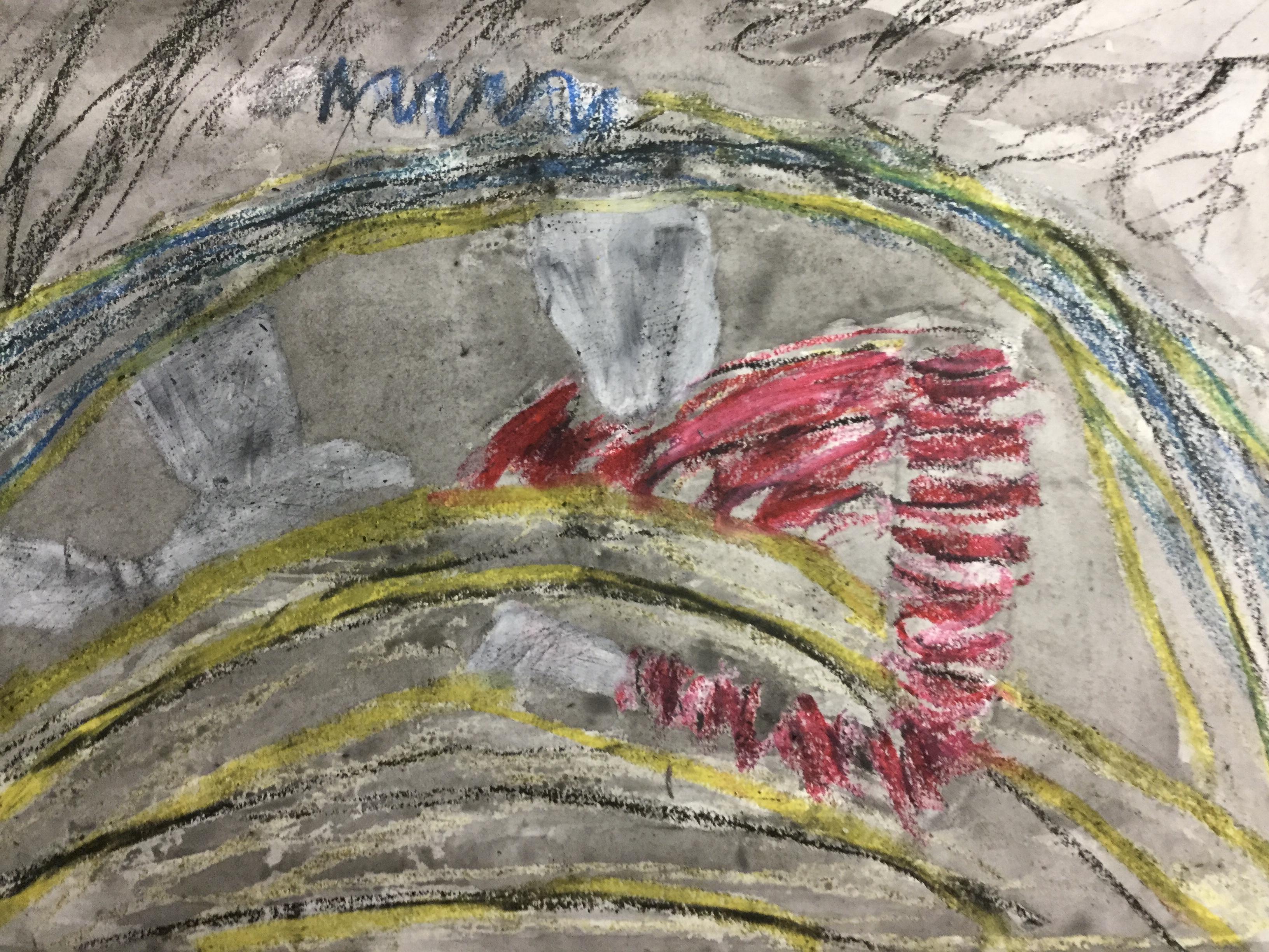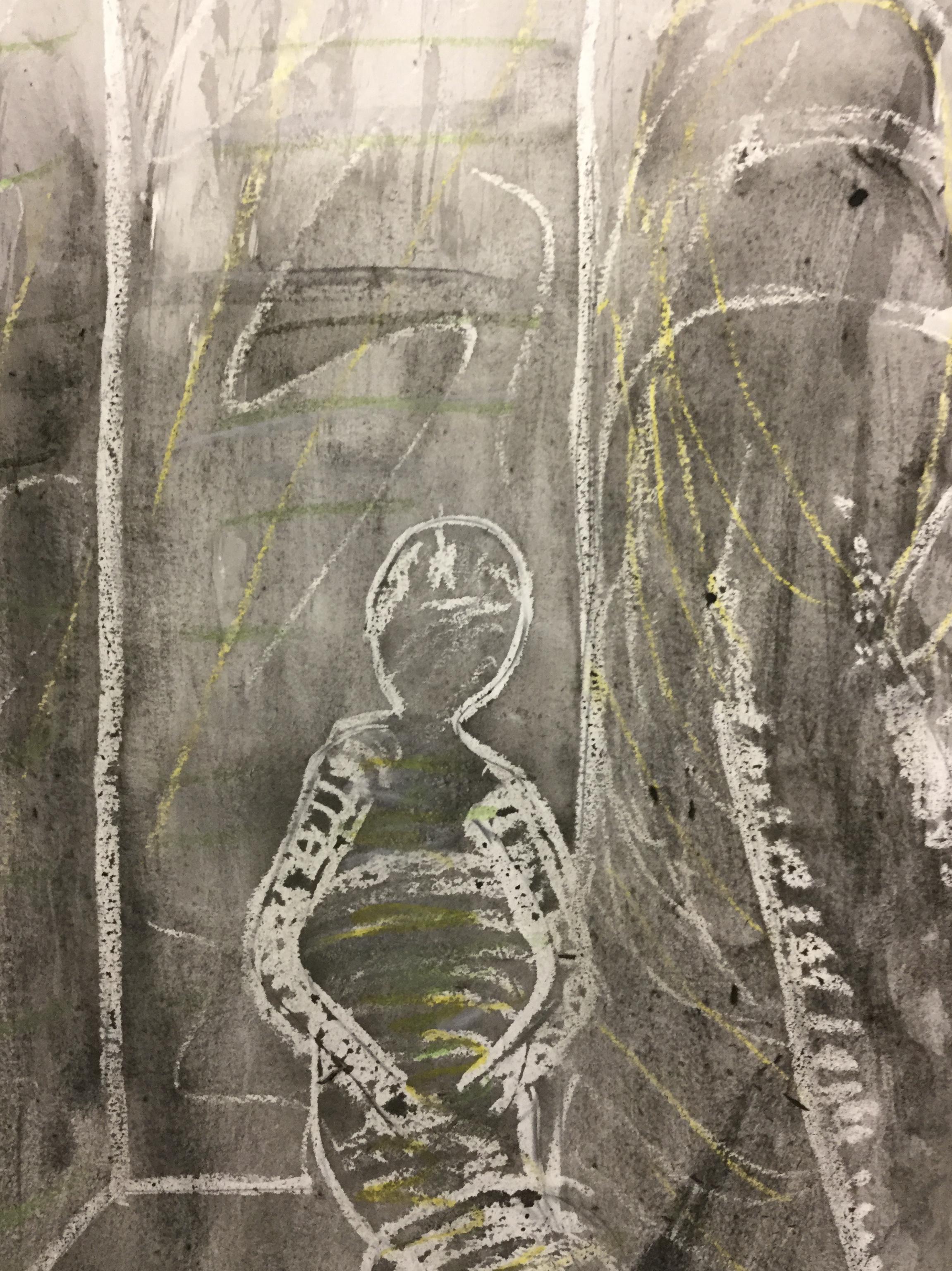 Moving on from our pencil work, we used Henry Moore’s resist techniques along with oil pastels to create atmospheric artwork depicting people using the underground as shelter during the Blitz.