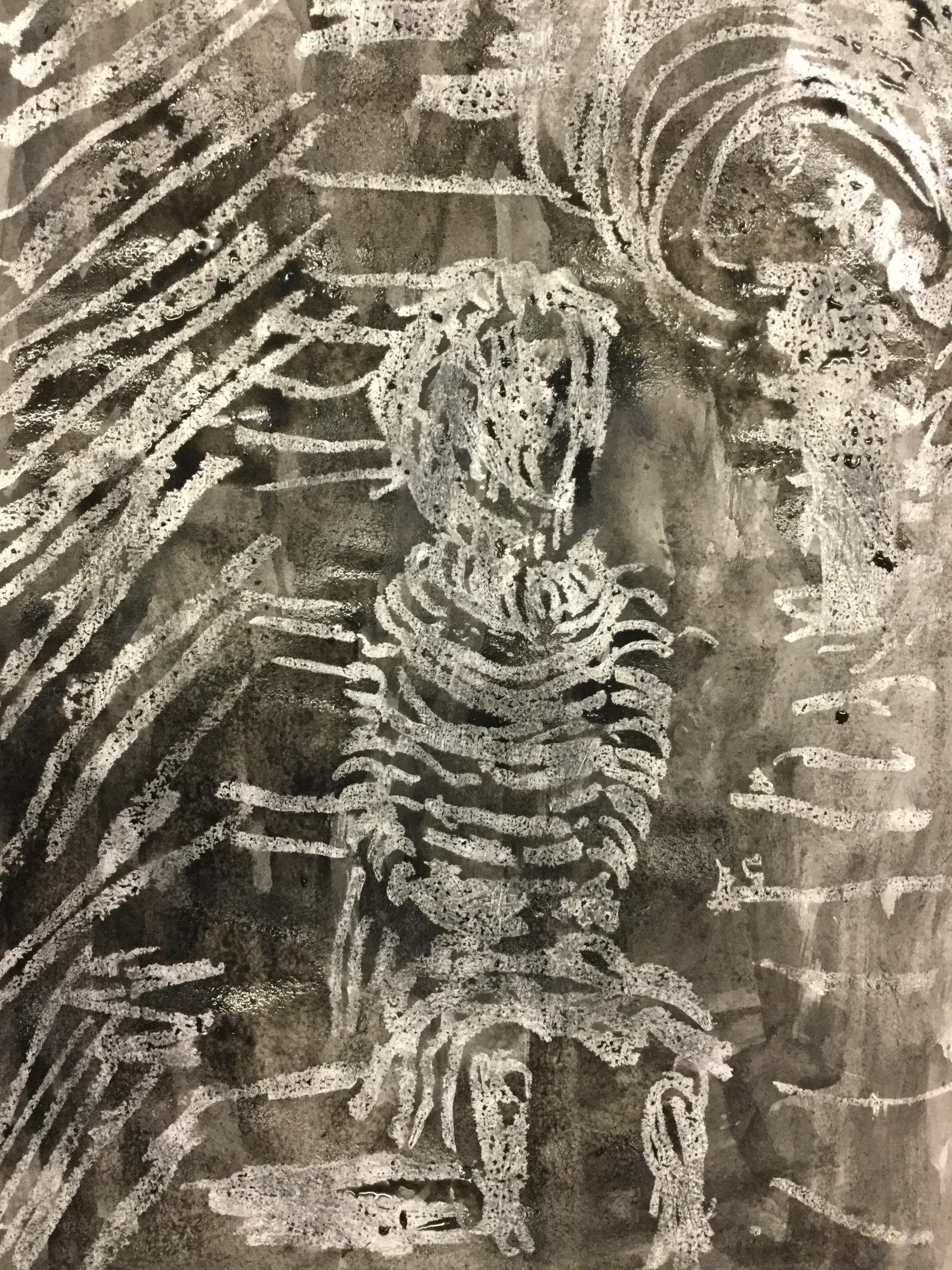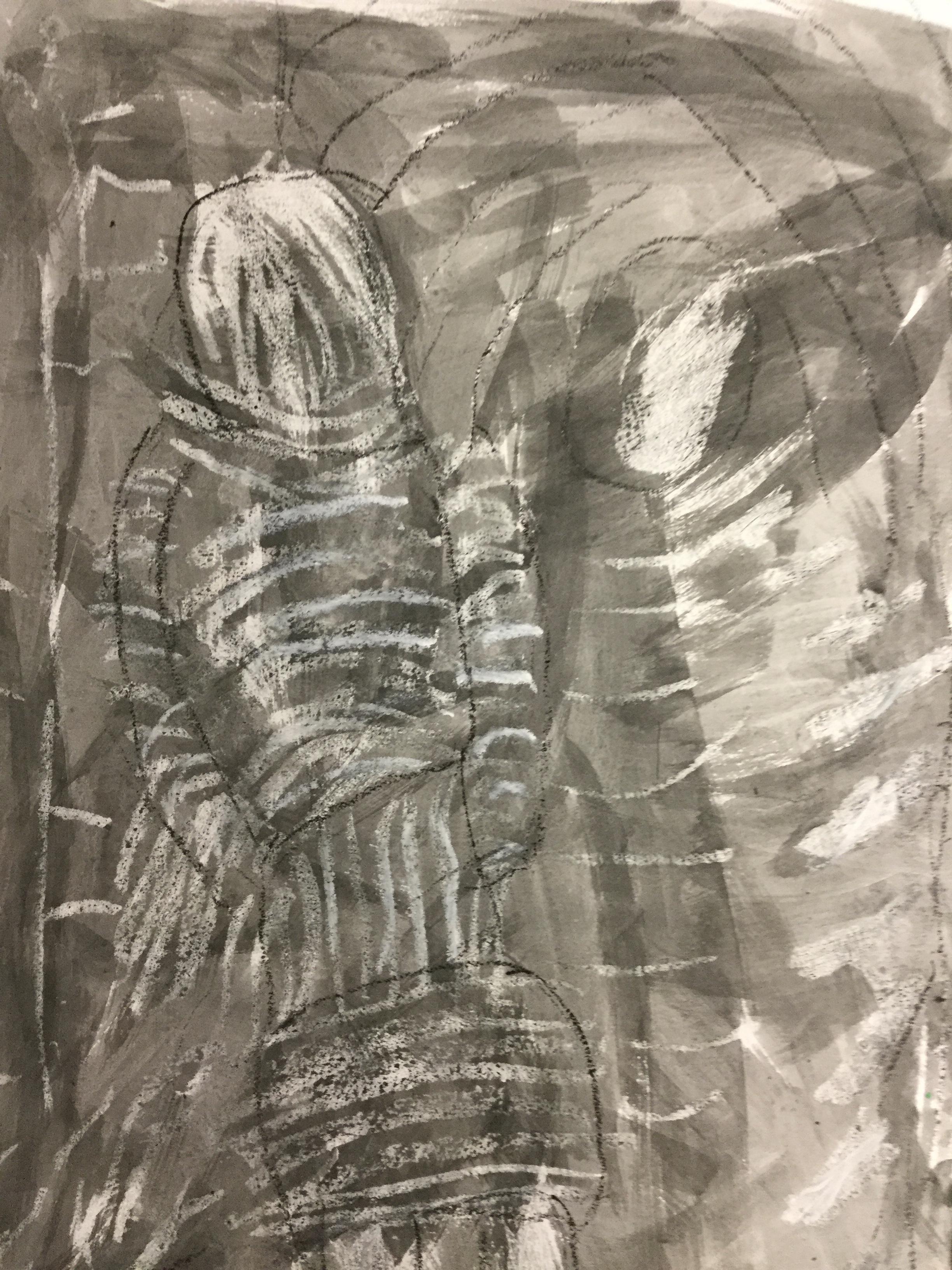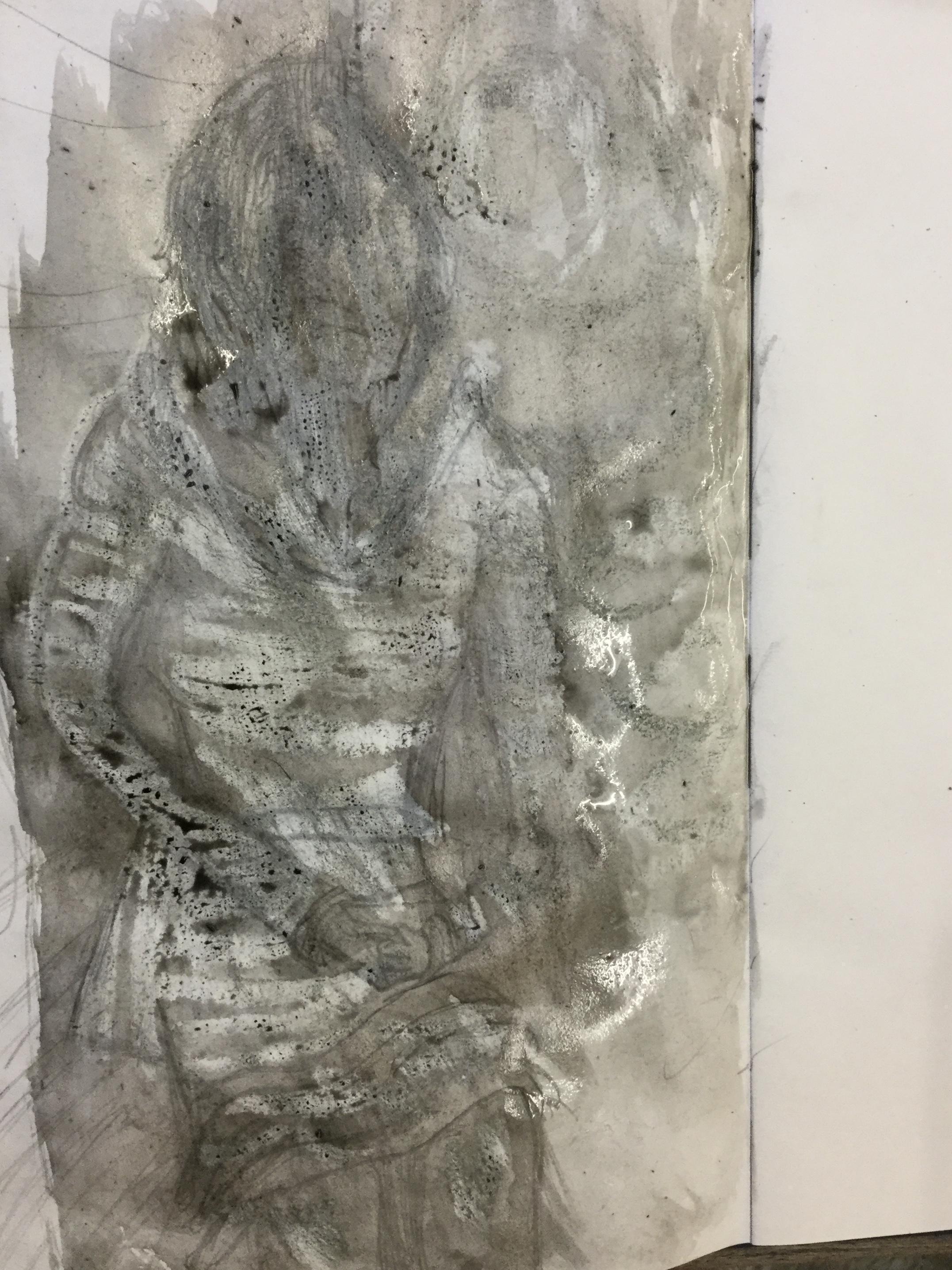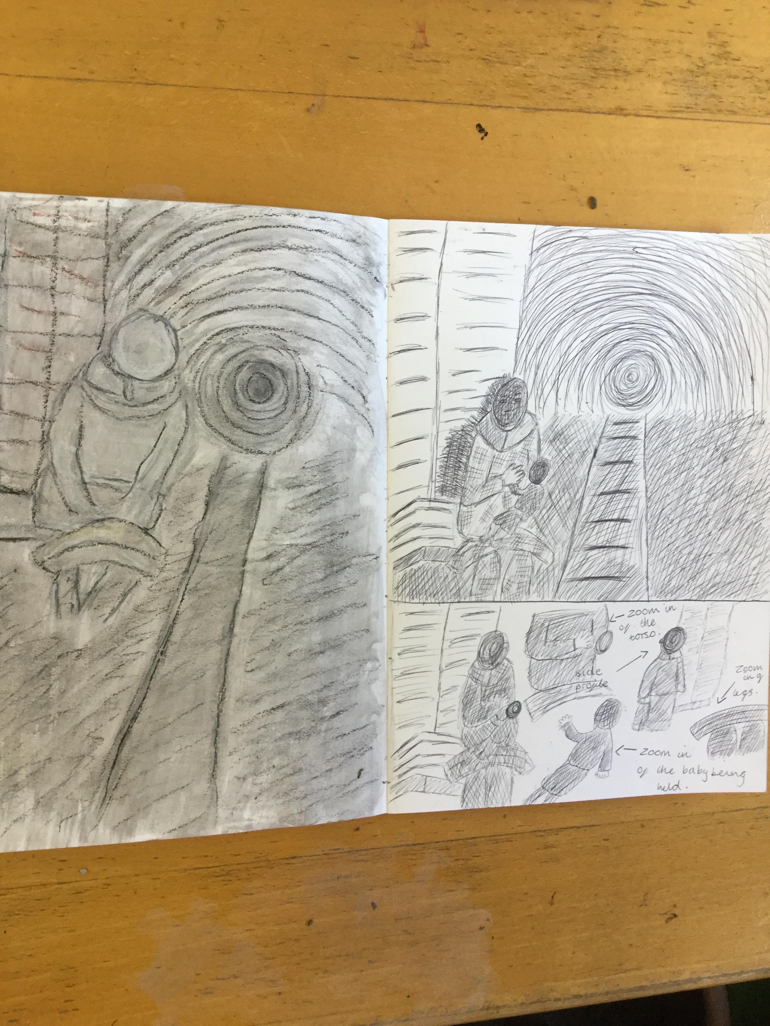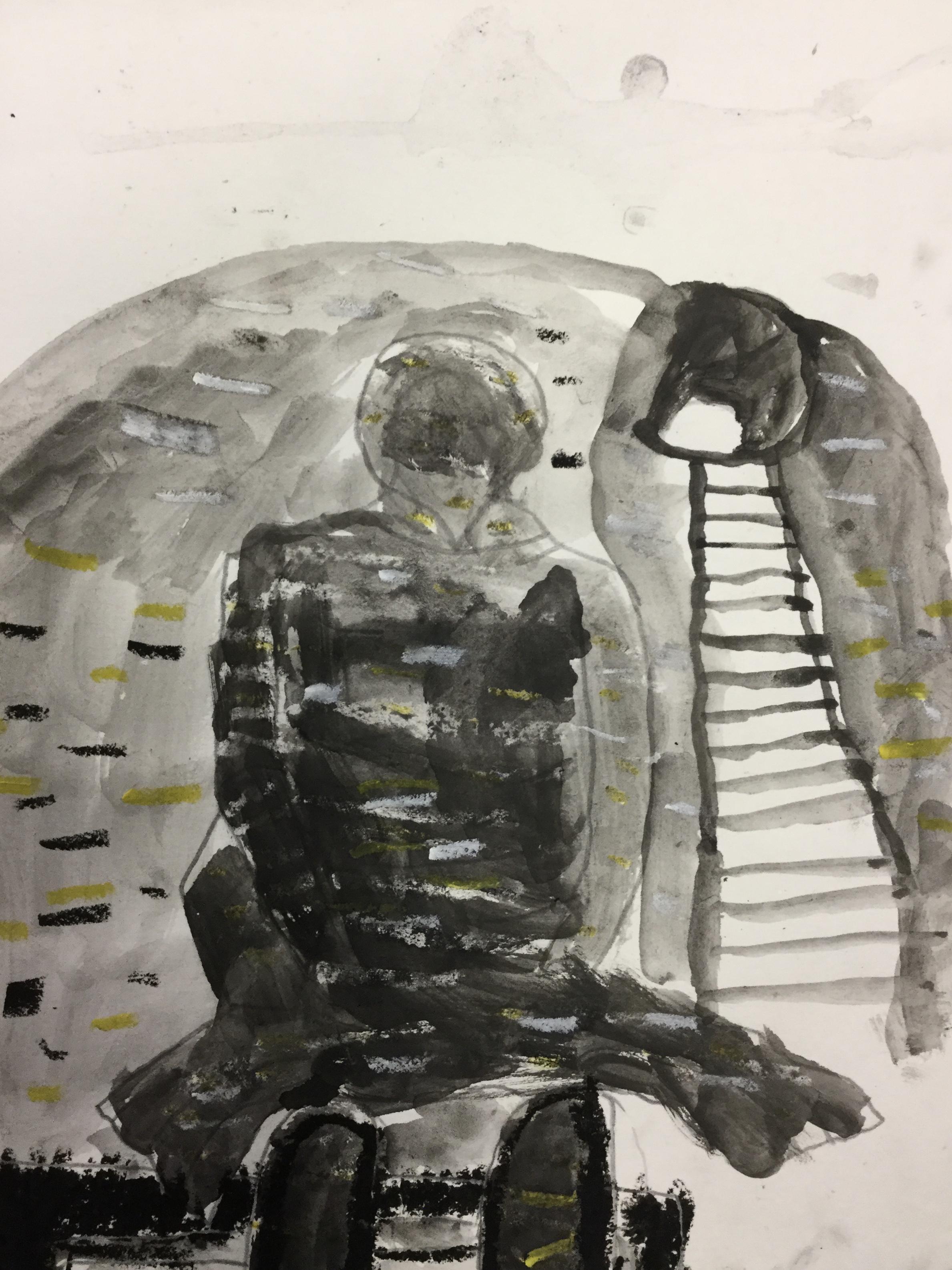 Moving on from our pencil work, we used Henry Moore’s resist techniques along with oil pastels to create atmospheric artwork depicting people using the underground as shelter during the Blitz.