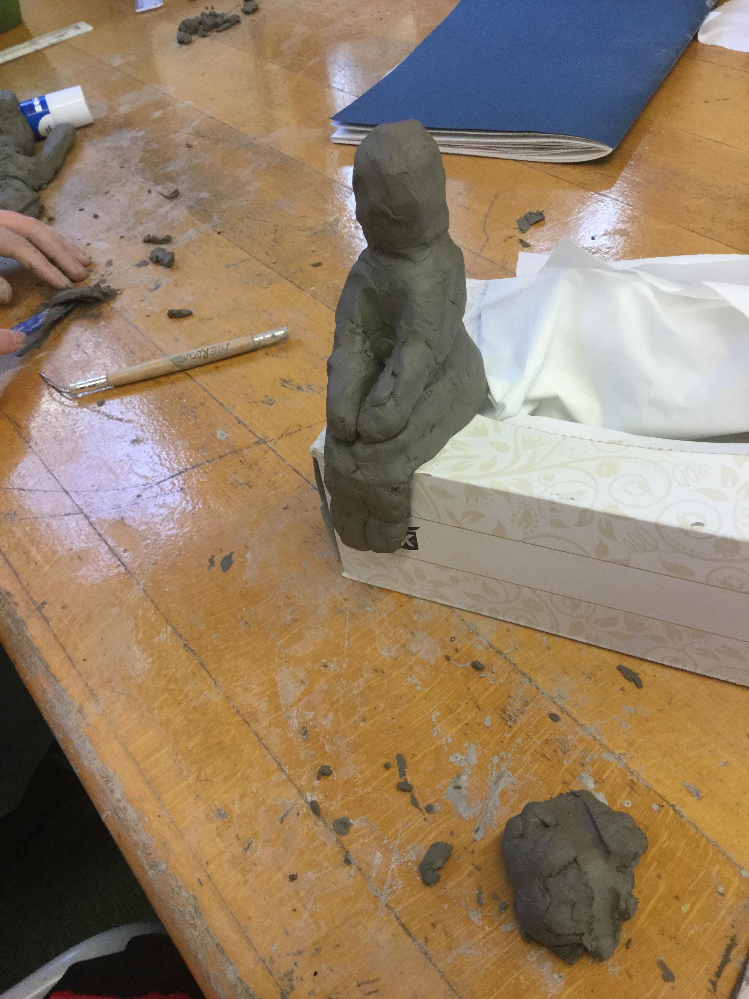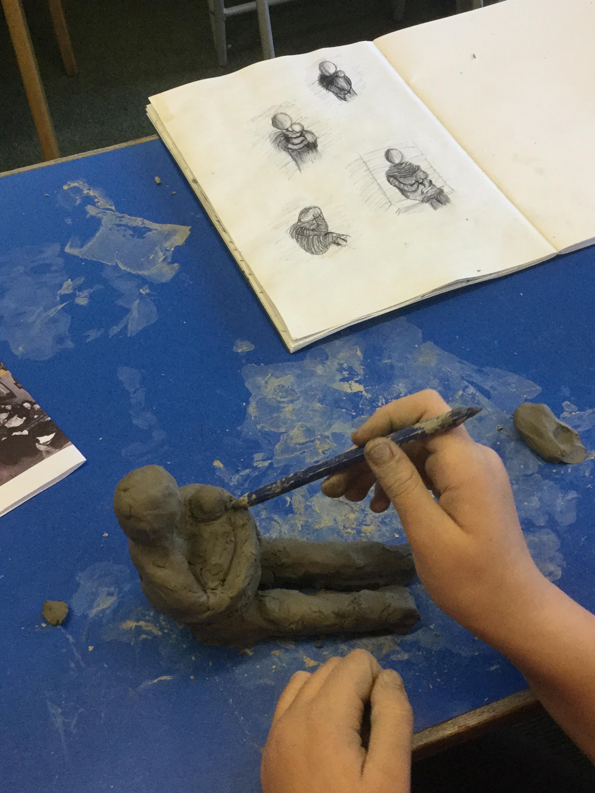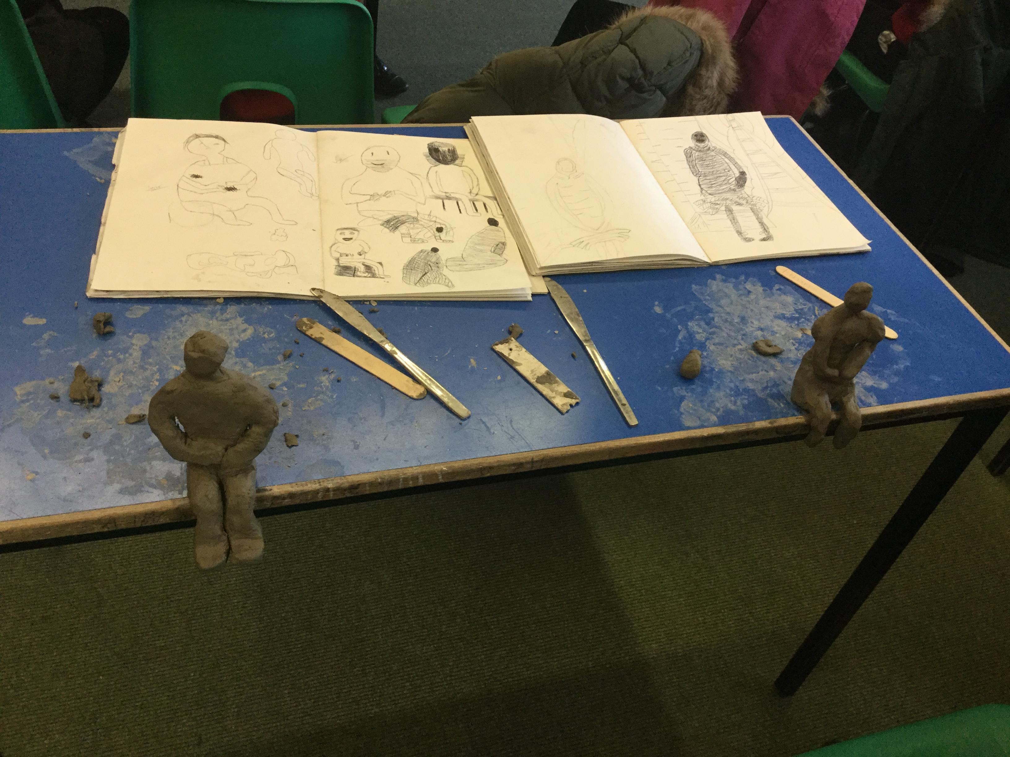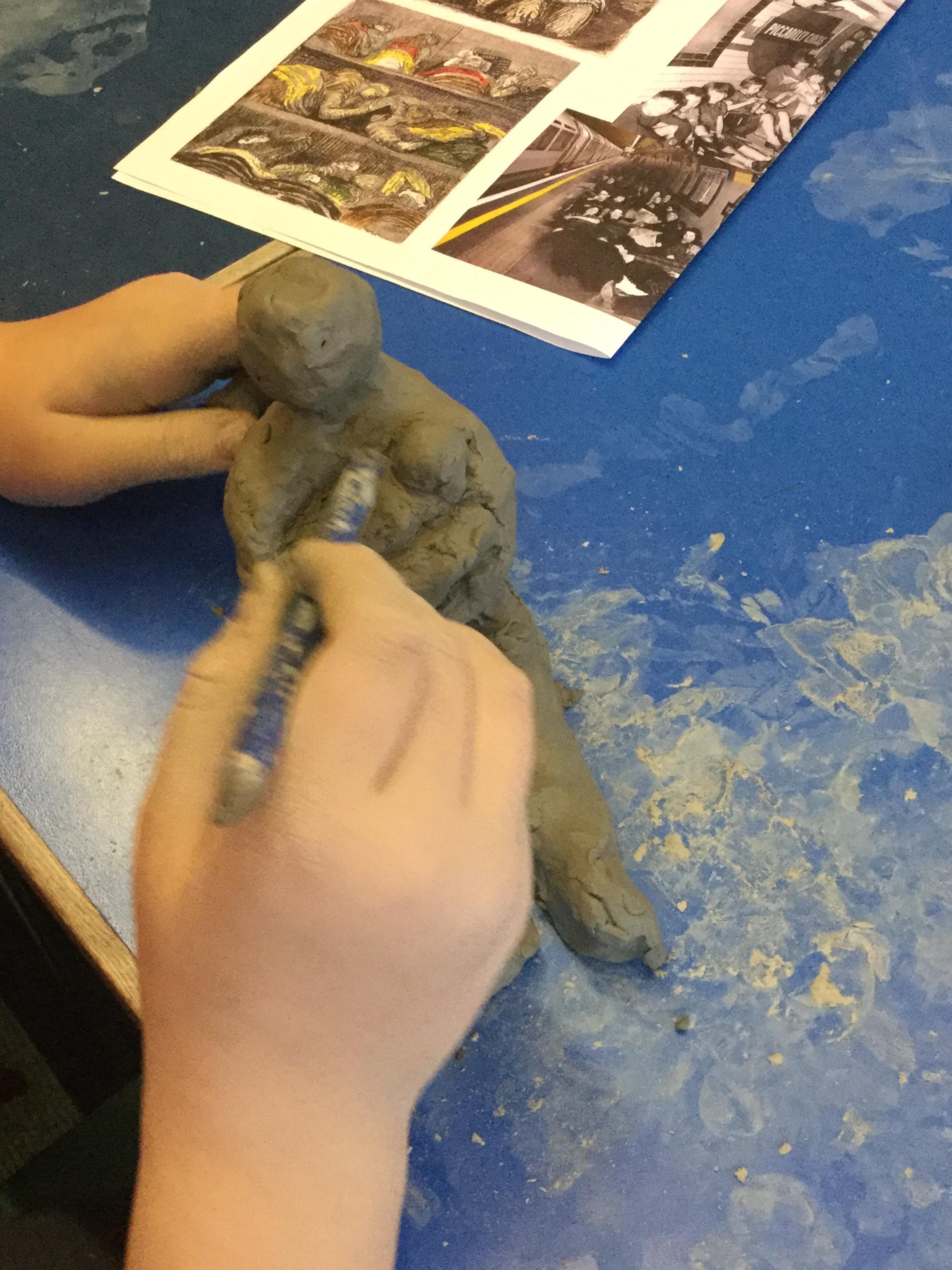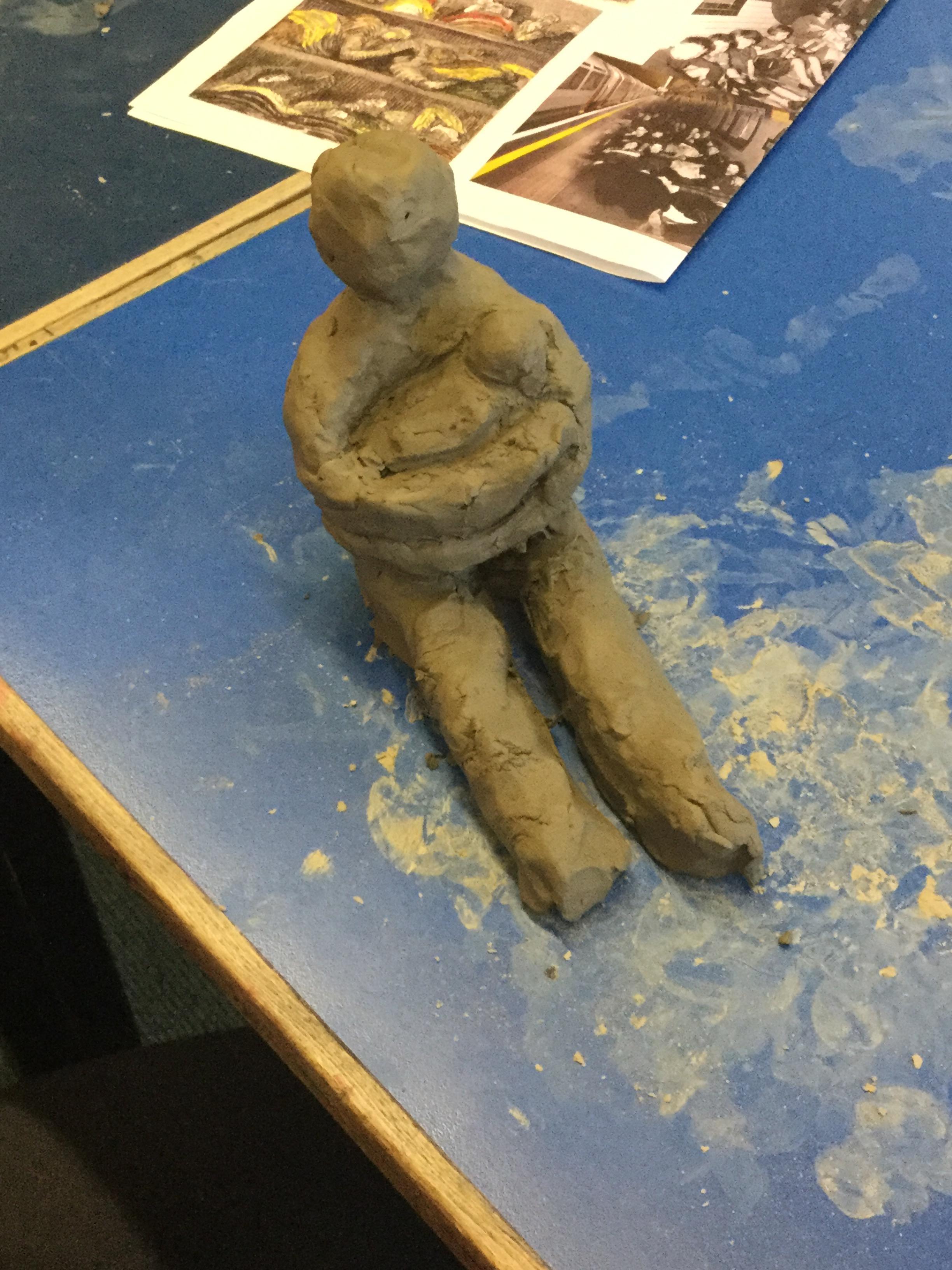 Designing our clay figures in the style of Henry Moore’s underground shelter figures.