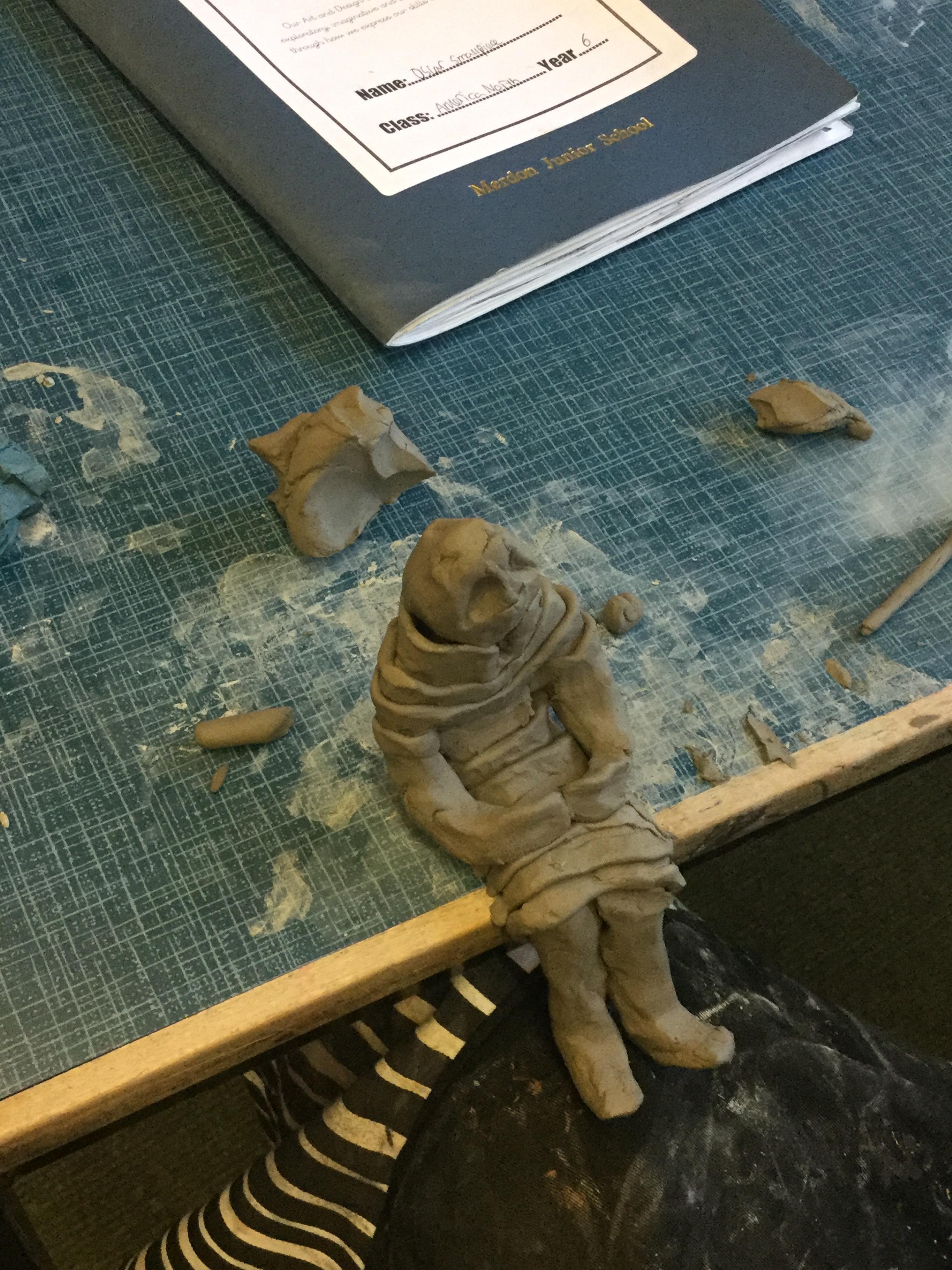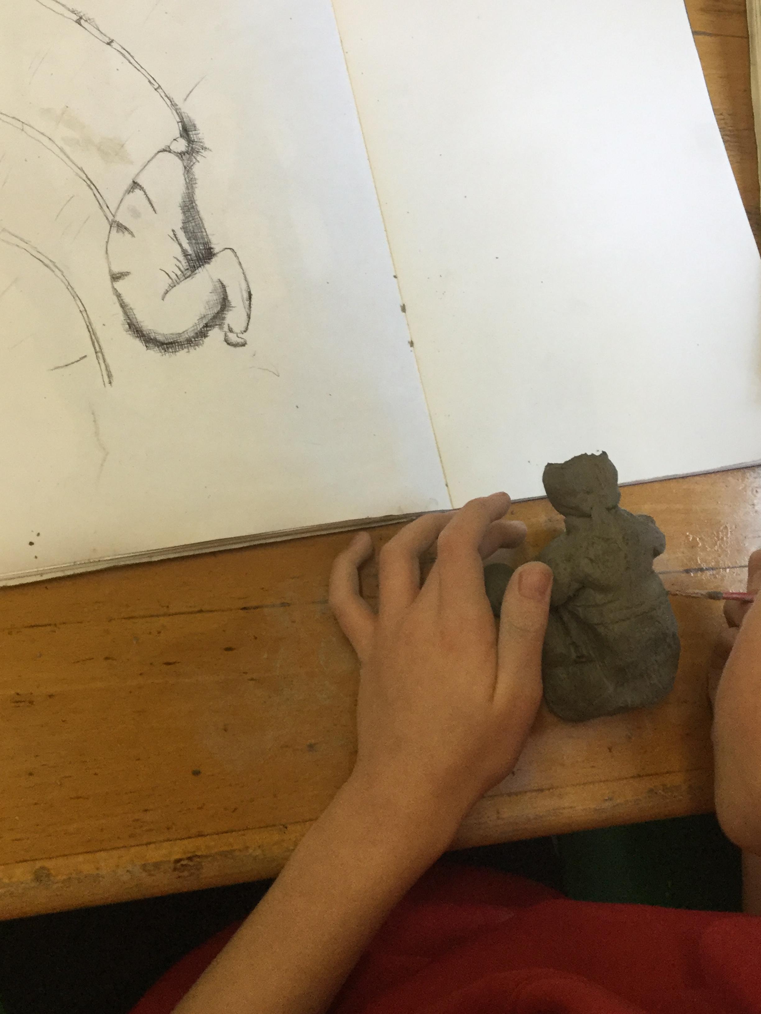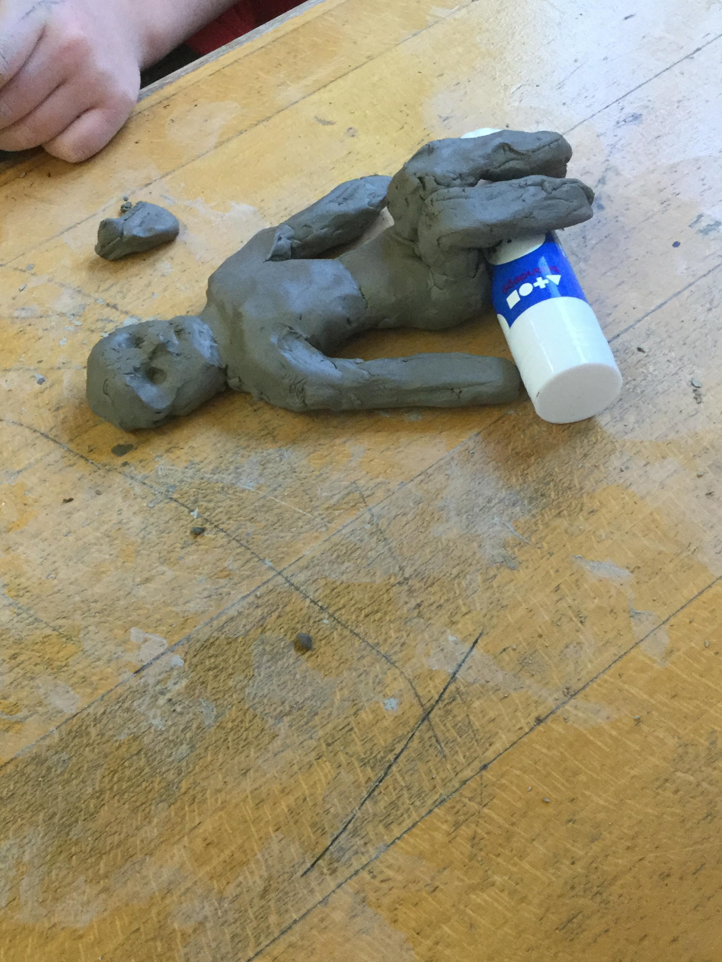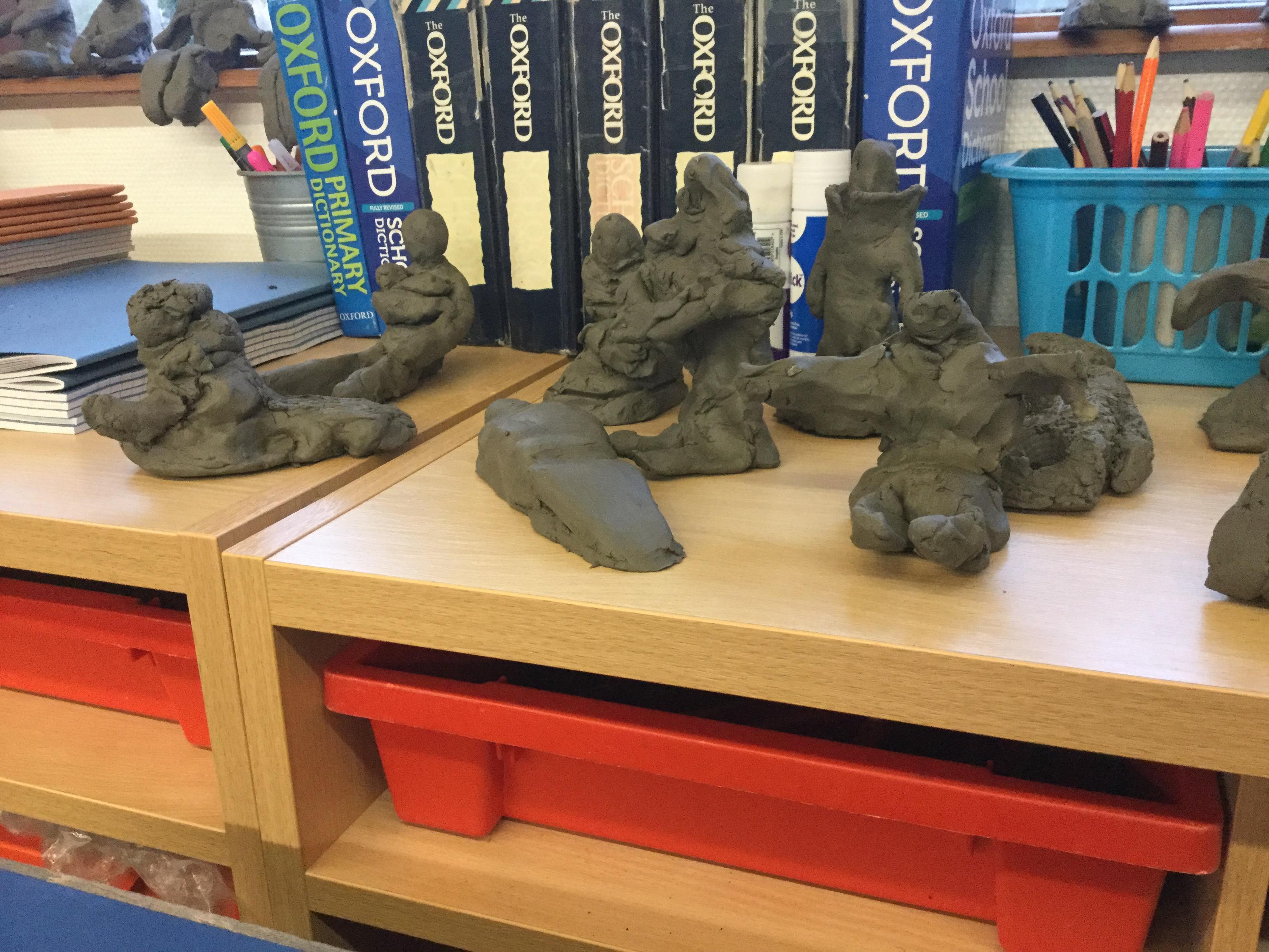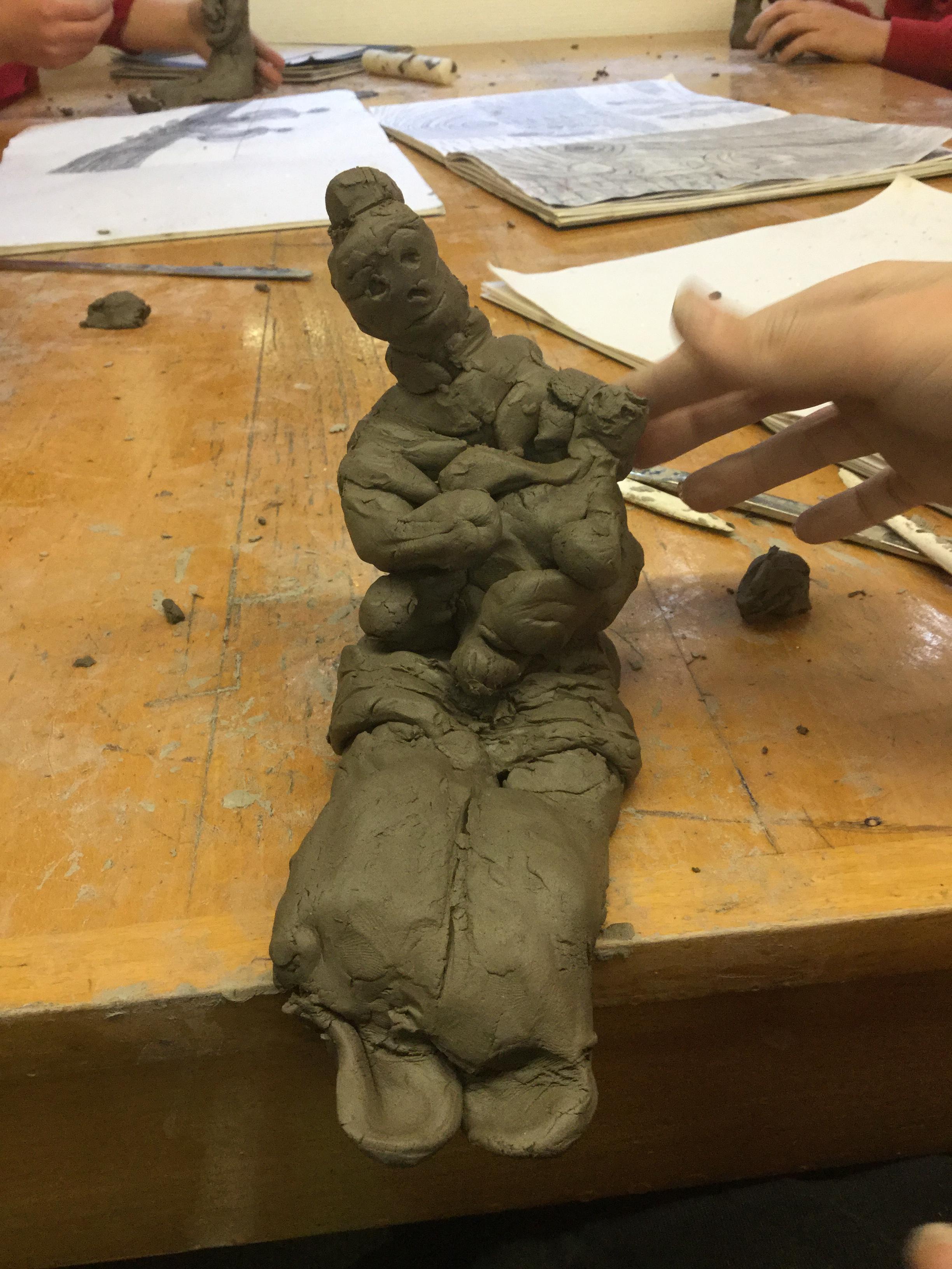 Designing our clay figures in the style of Henry Moore’s underground shelter figures.