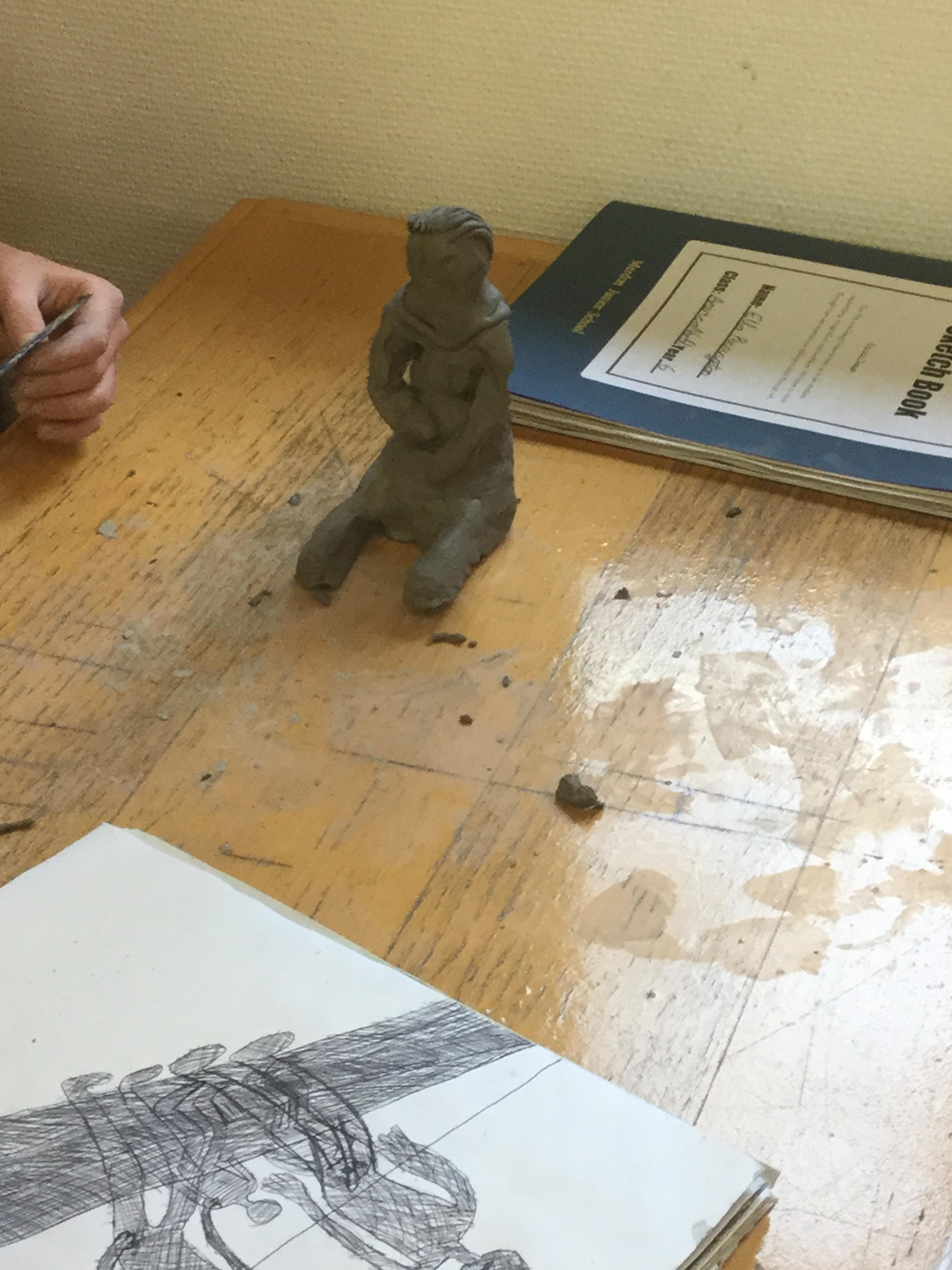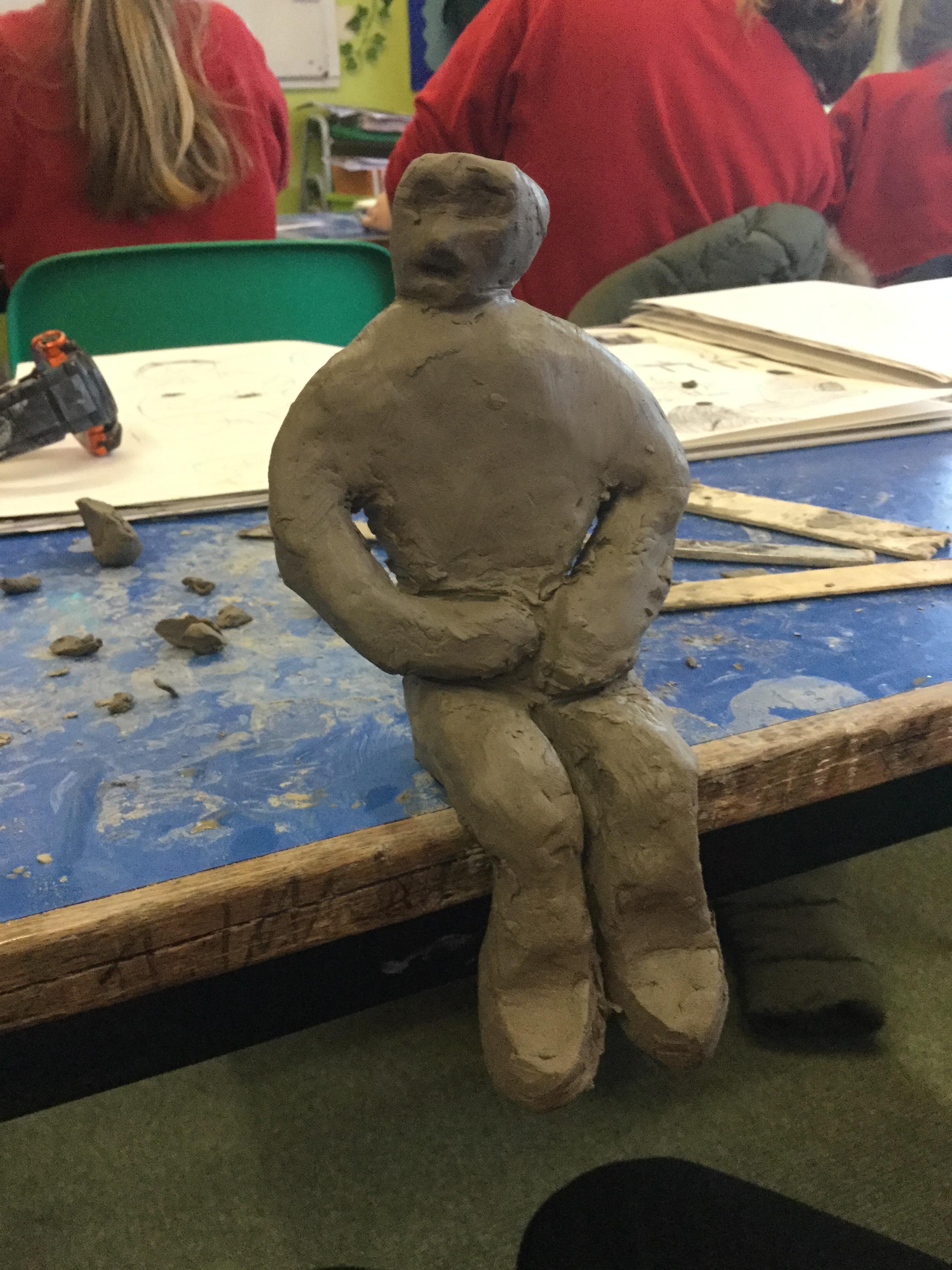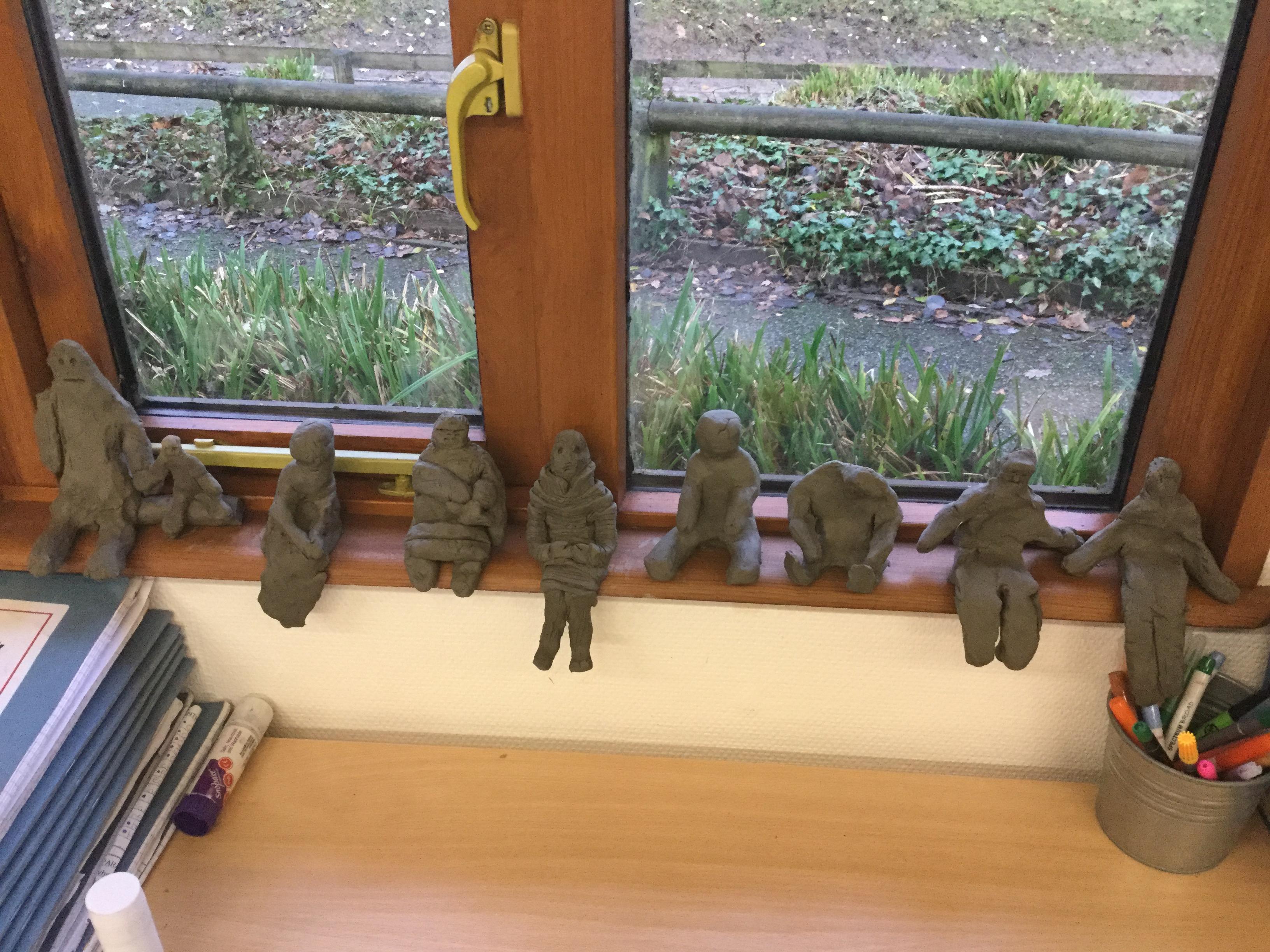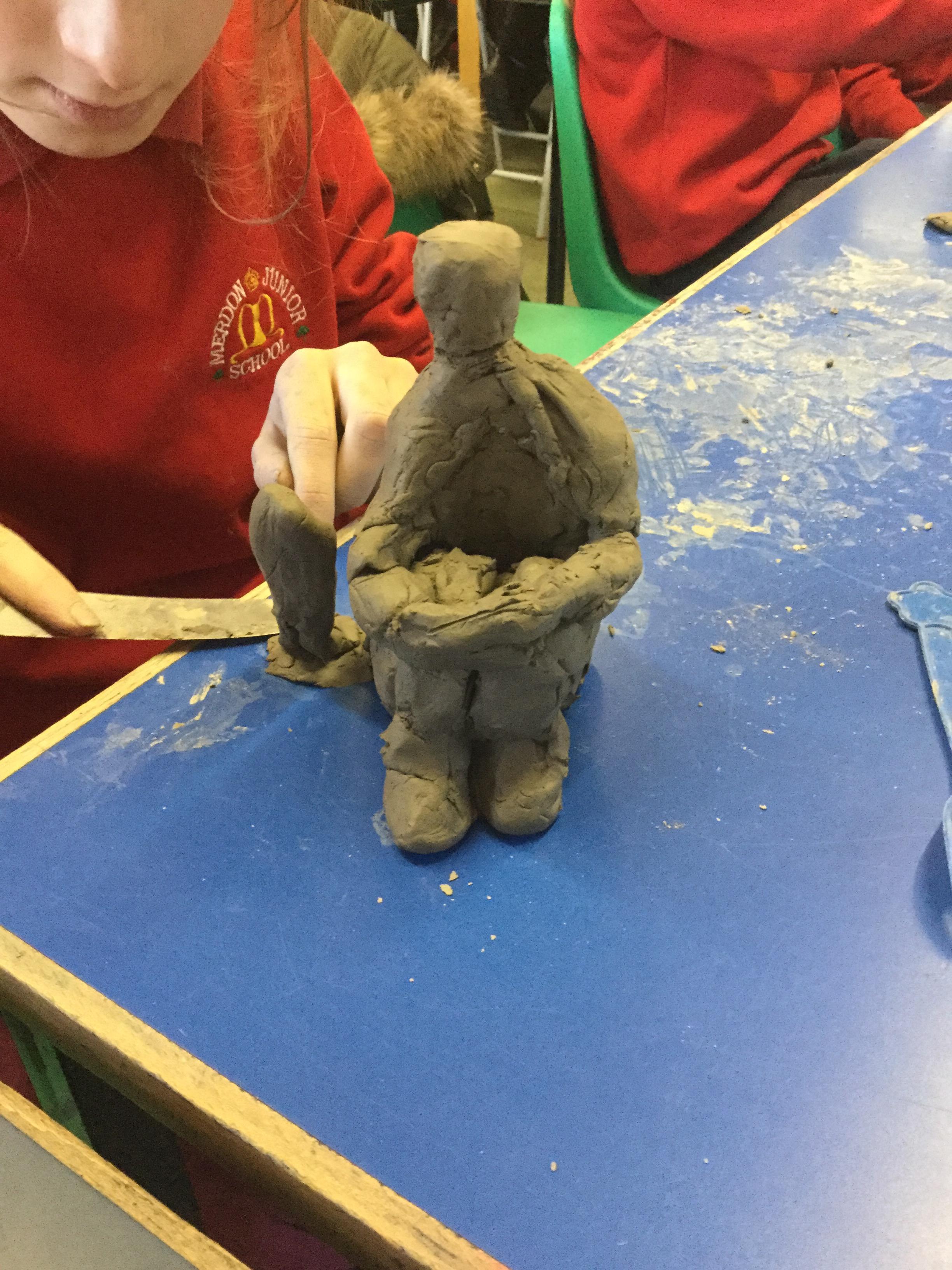 Designing our clay figures in the style of Henry Moore’s underground shelter figures.
