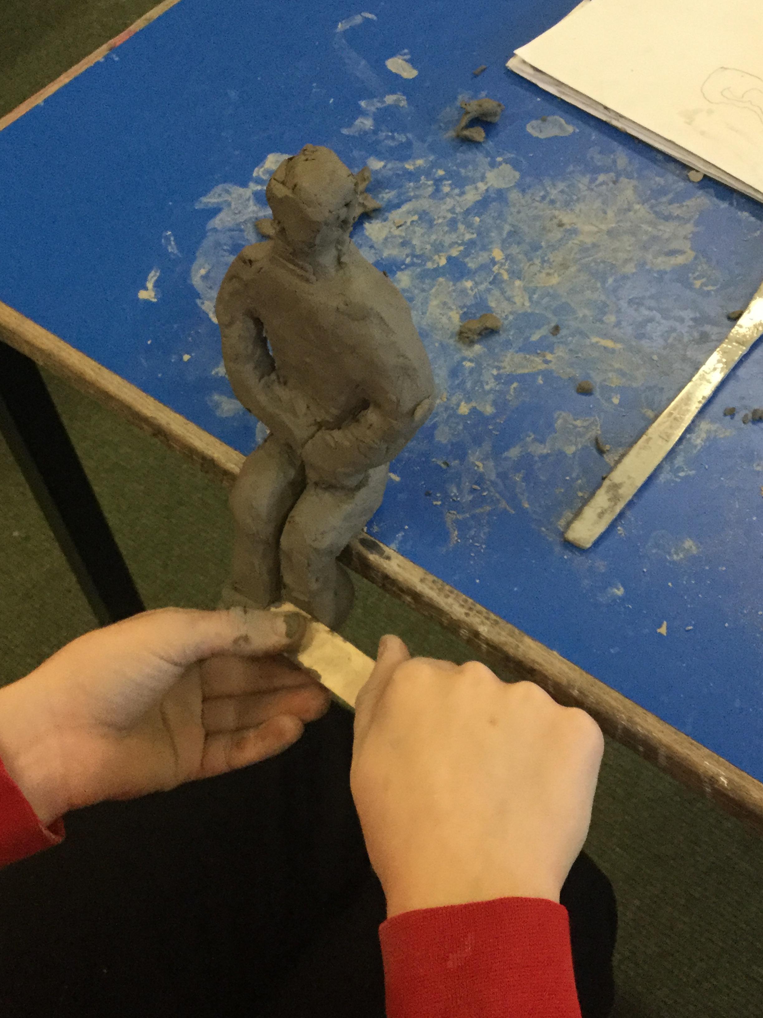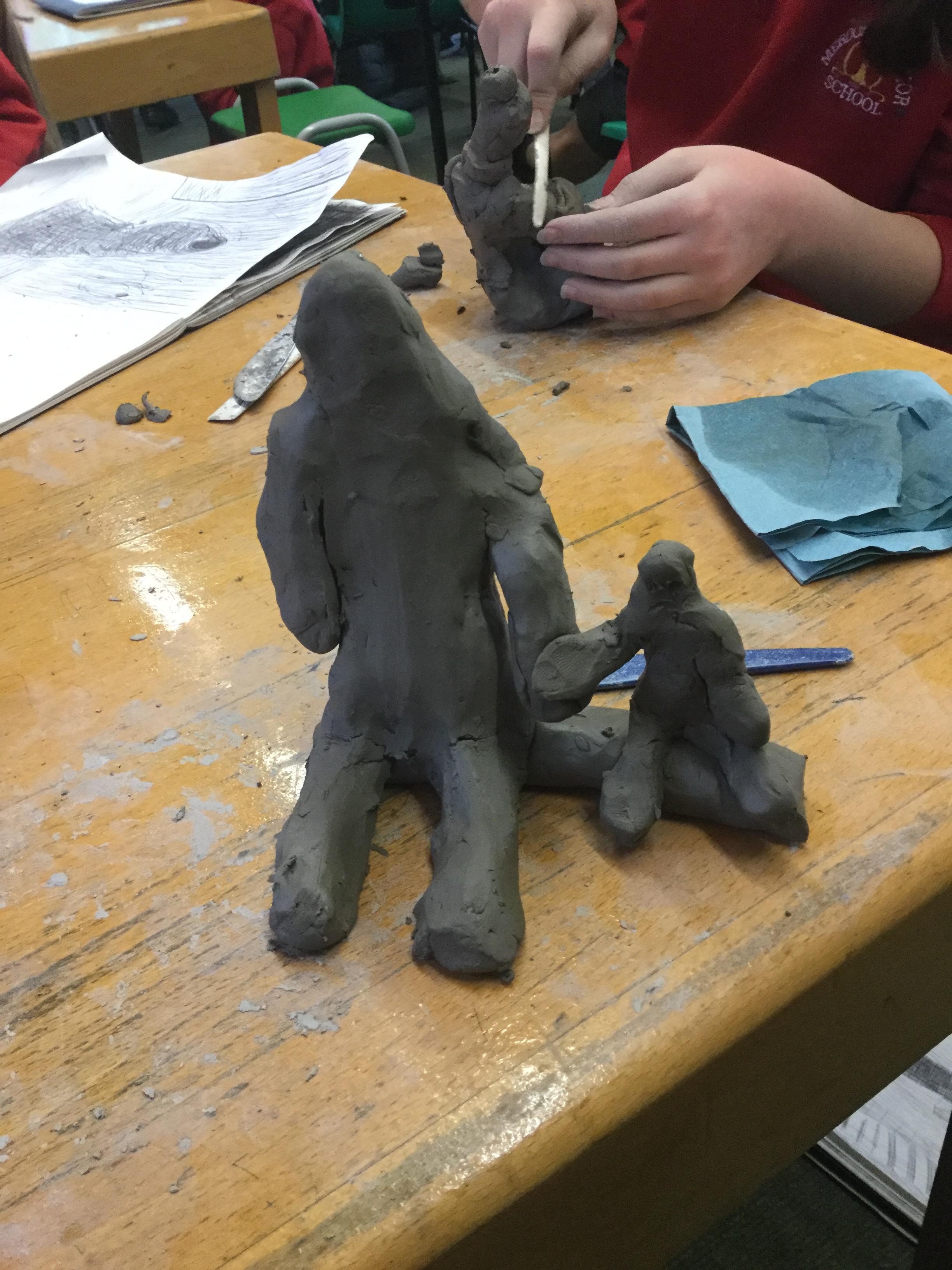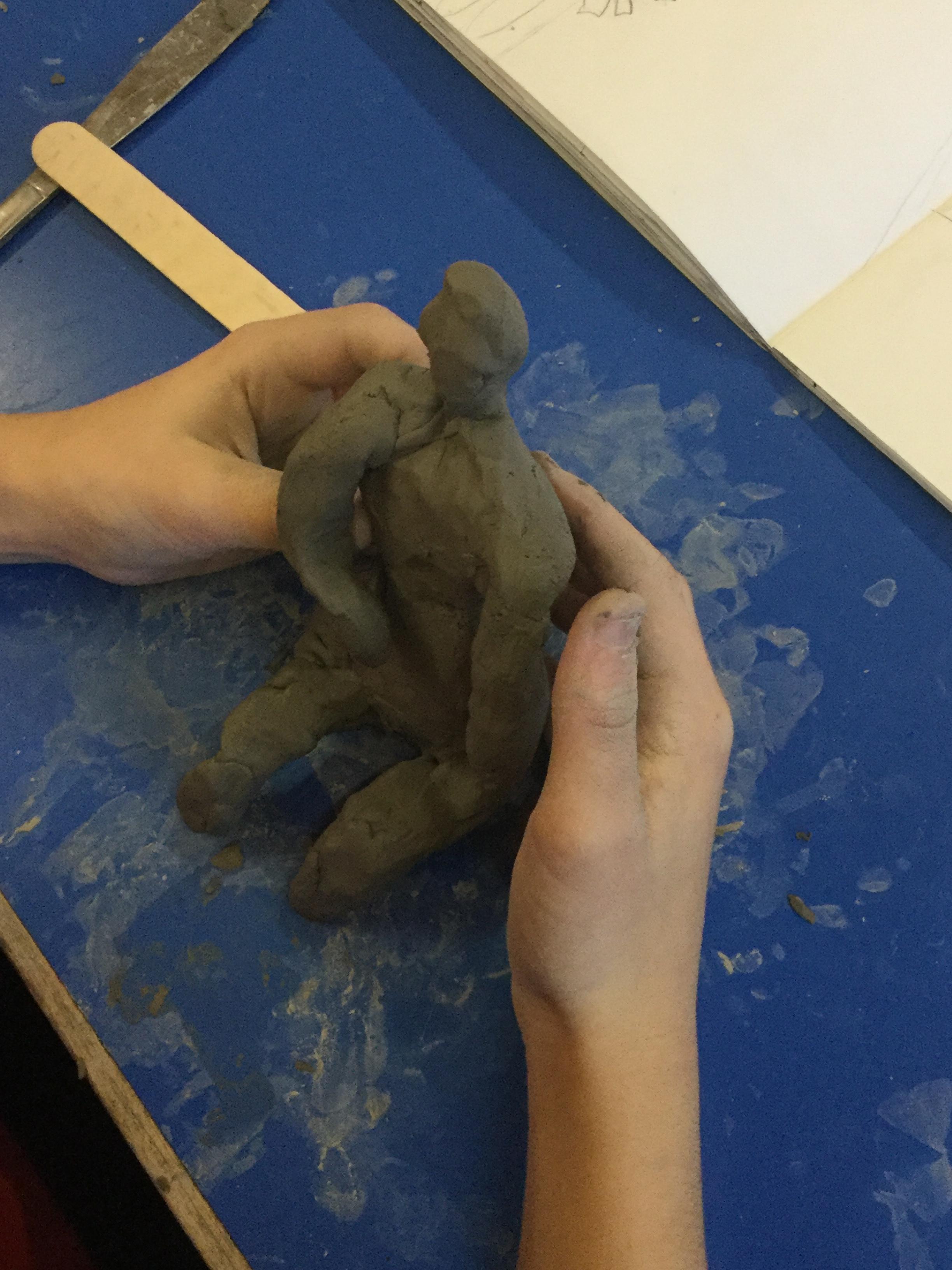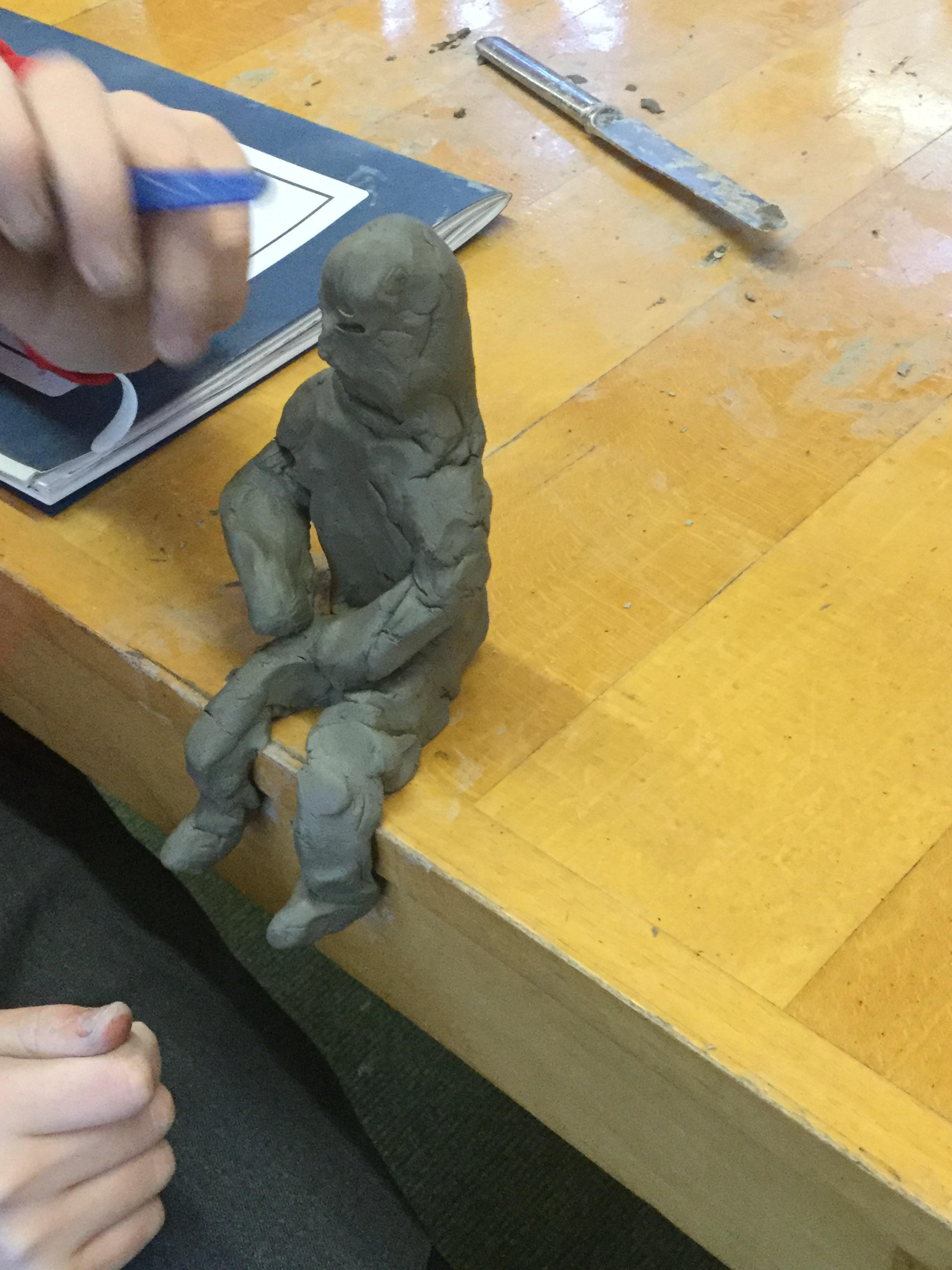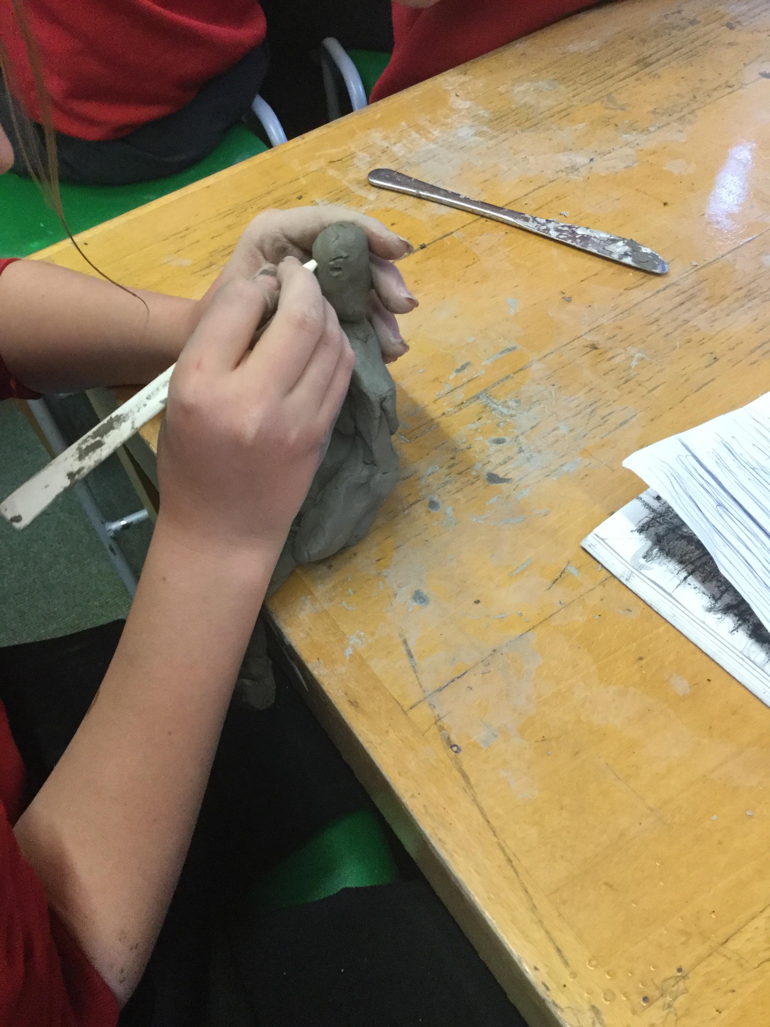 Designing our clay figures in the style of Henry Moore’s underground shelter figures.