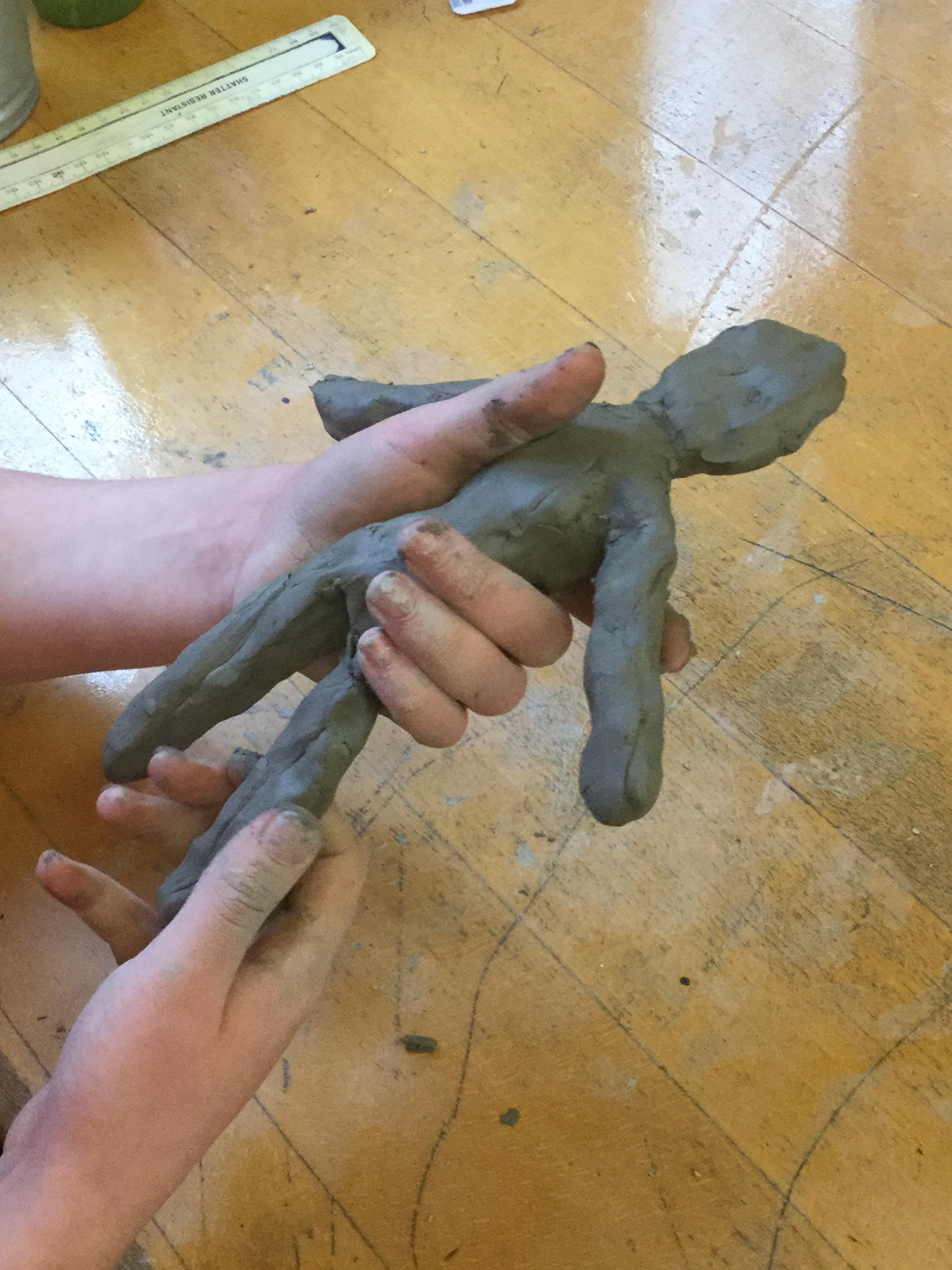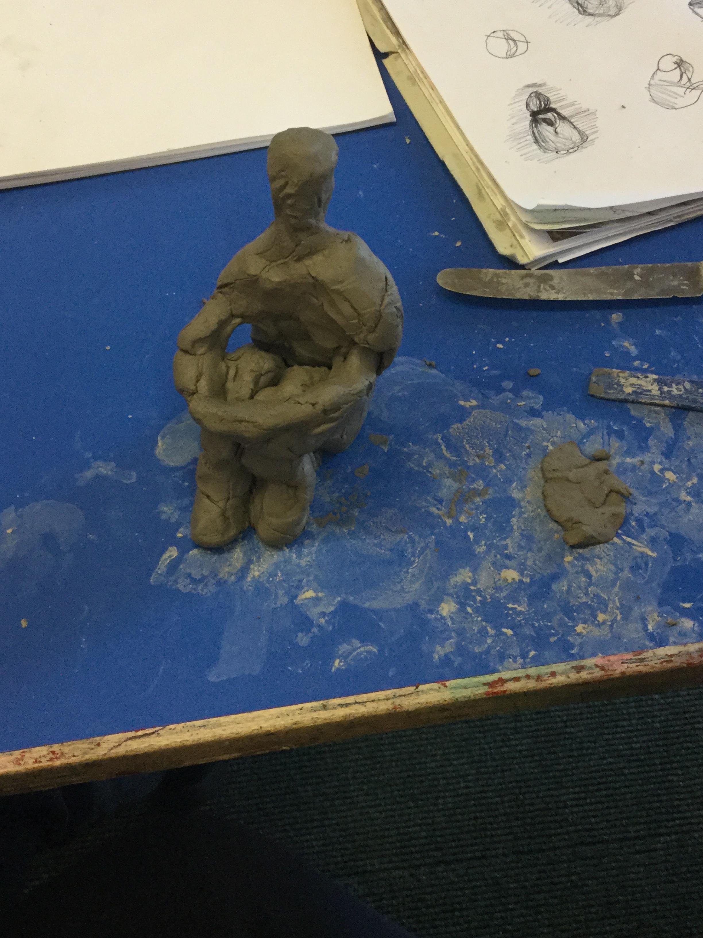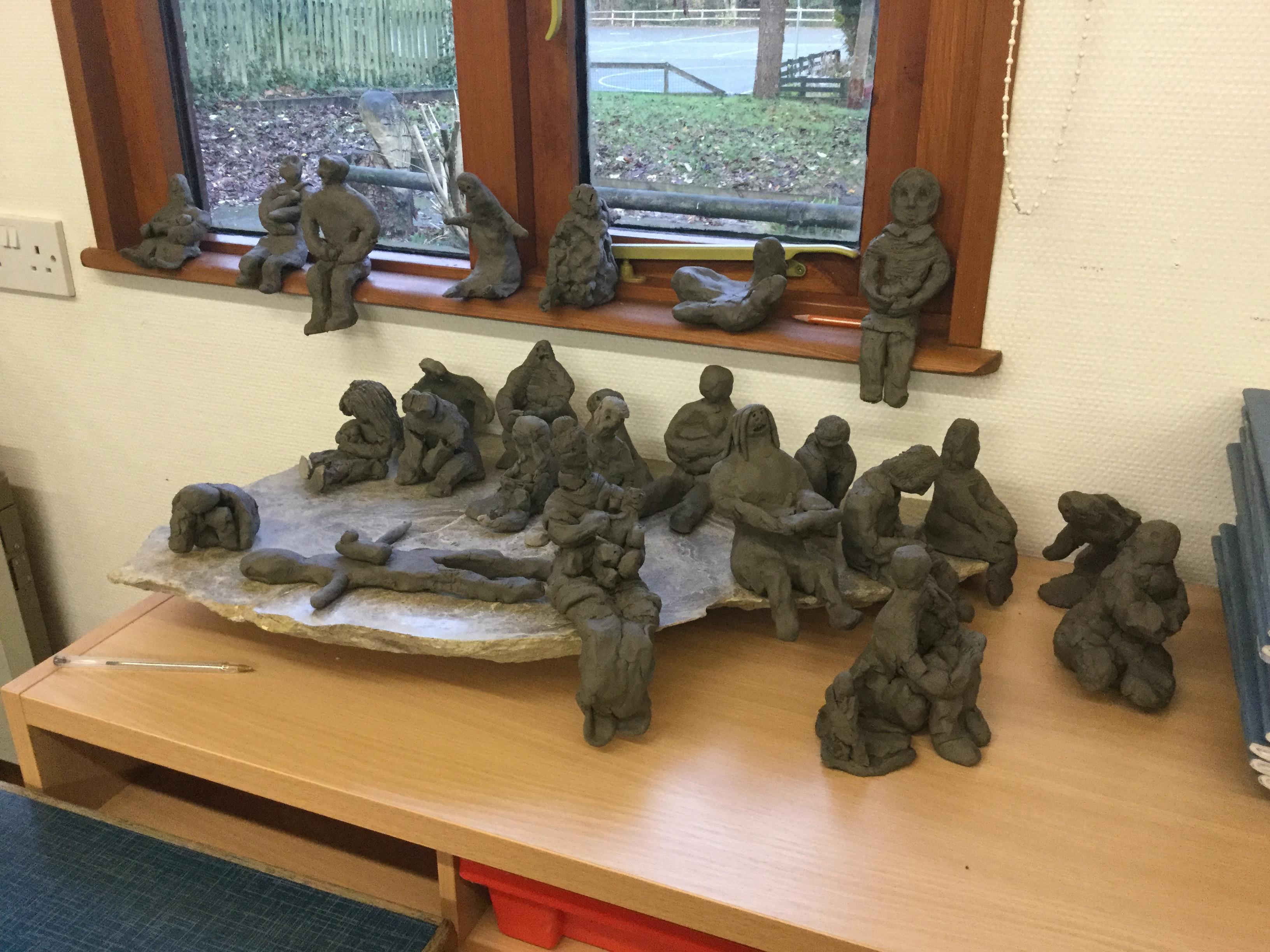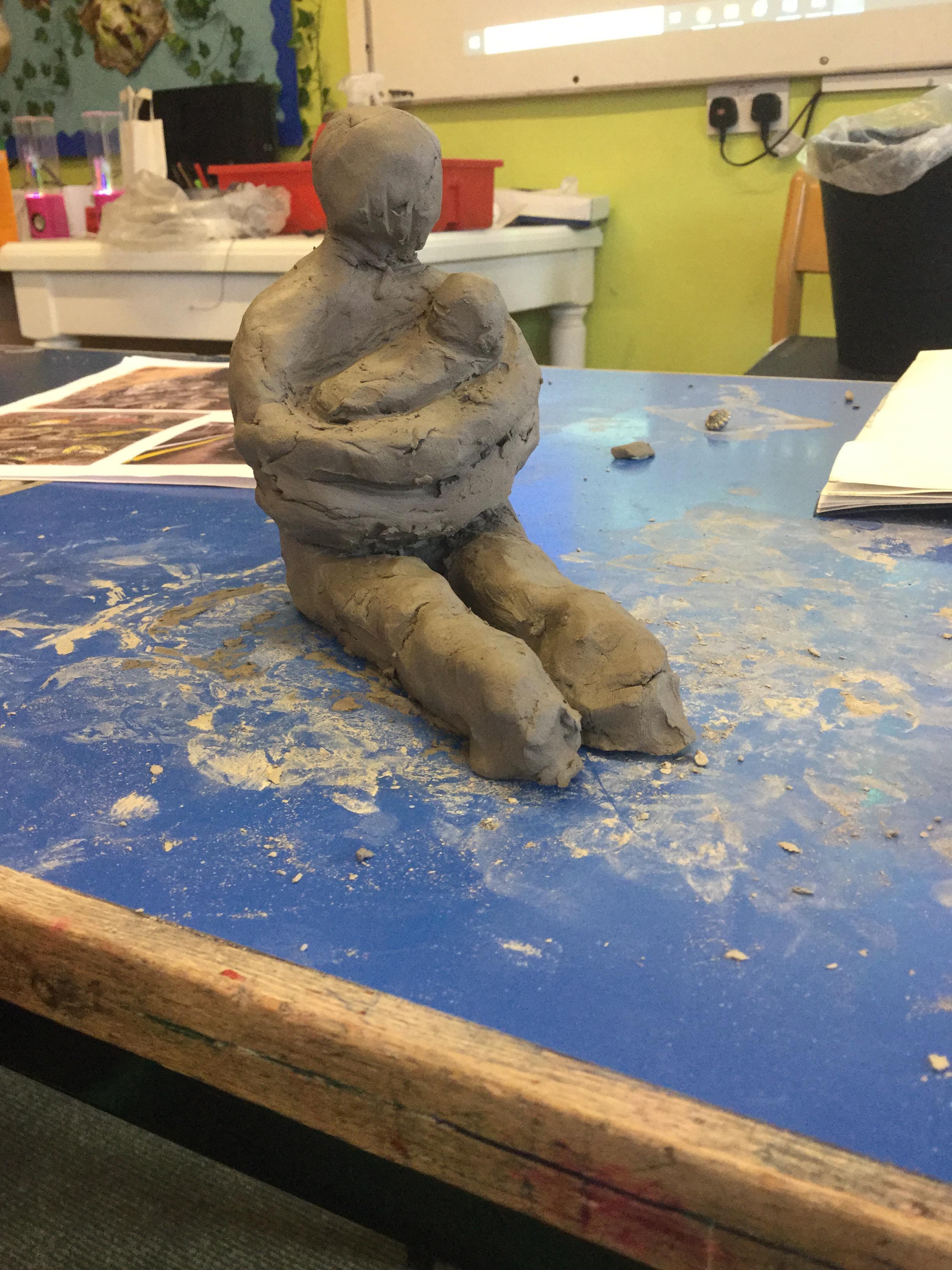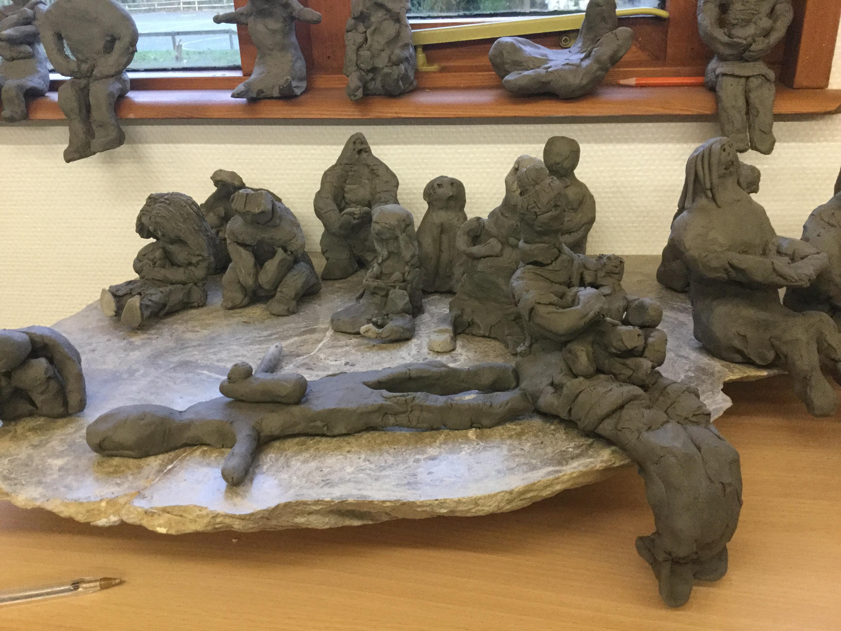 Designing our clay figures in the style of Henry Moore’s underground shelter figures.