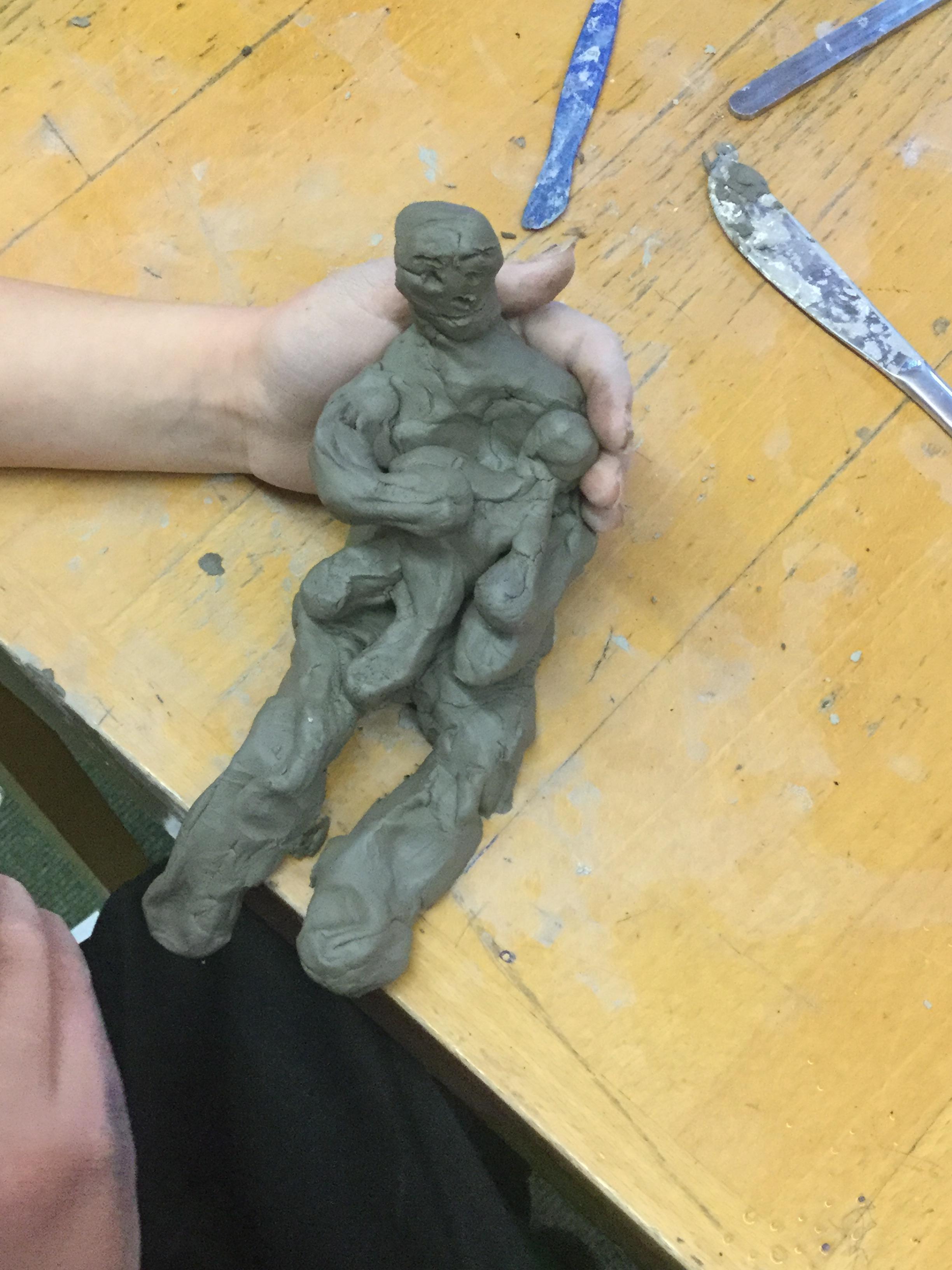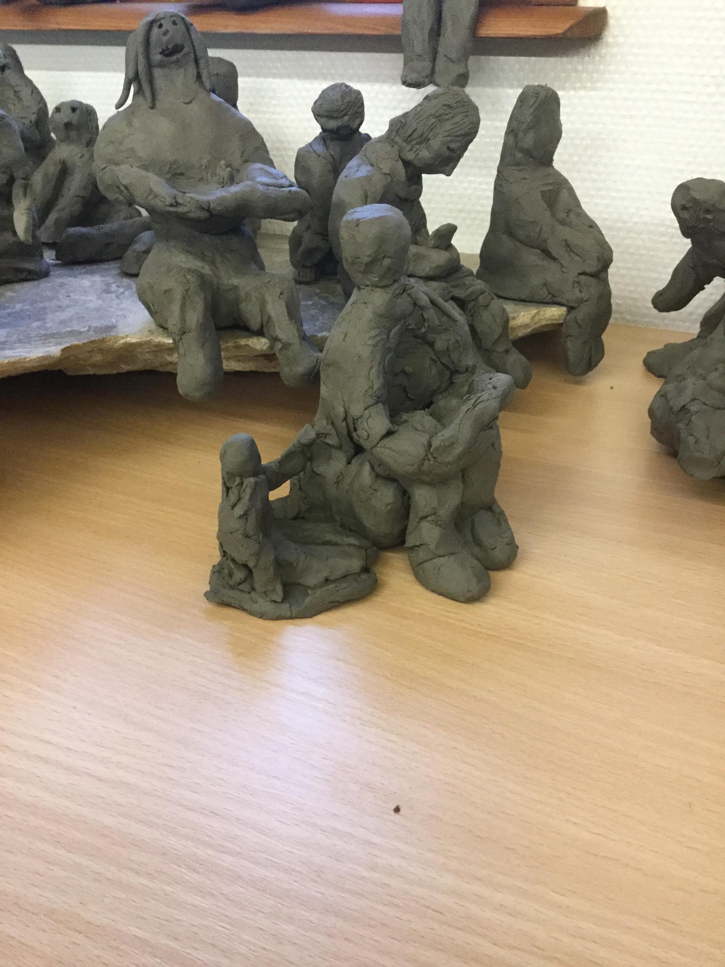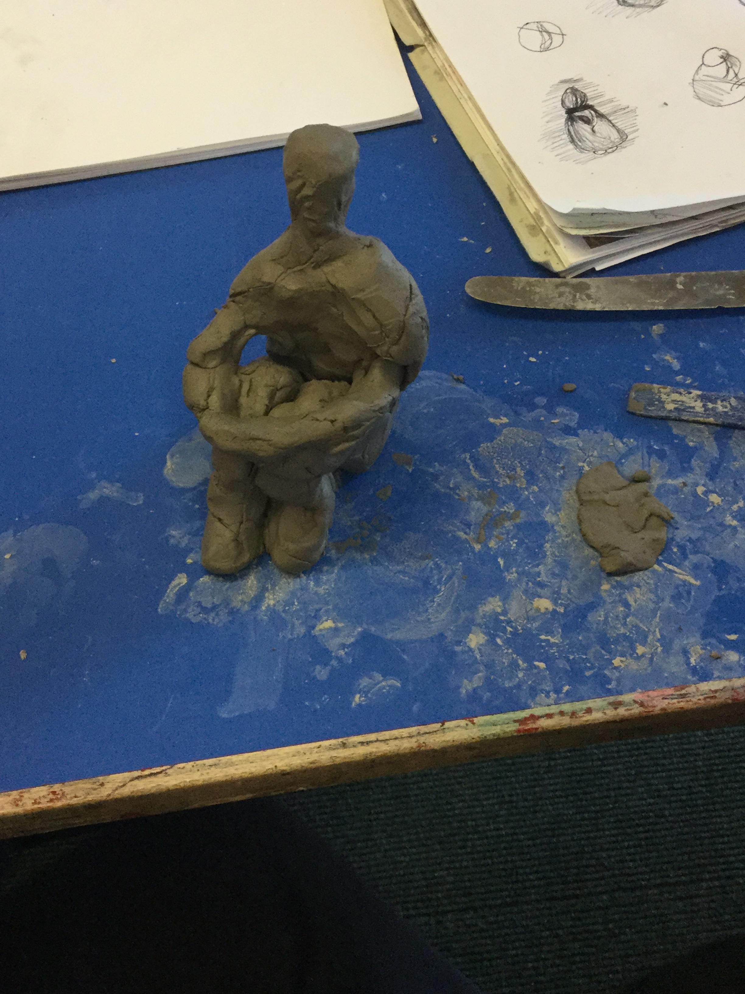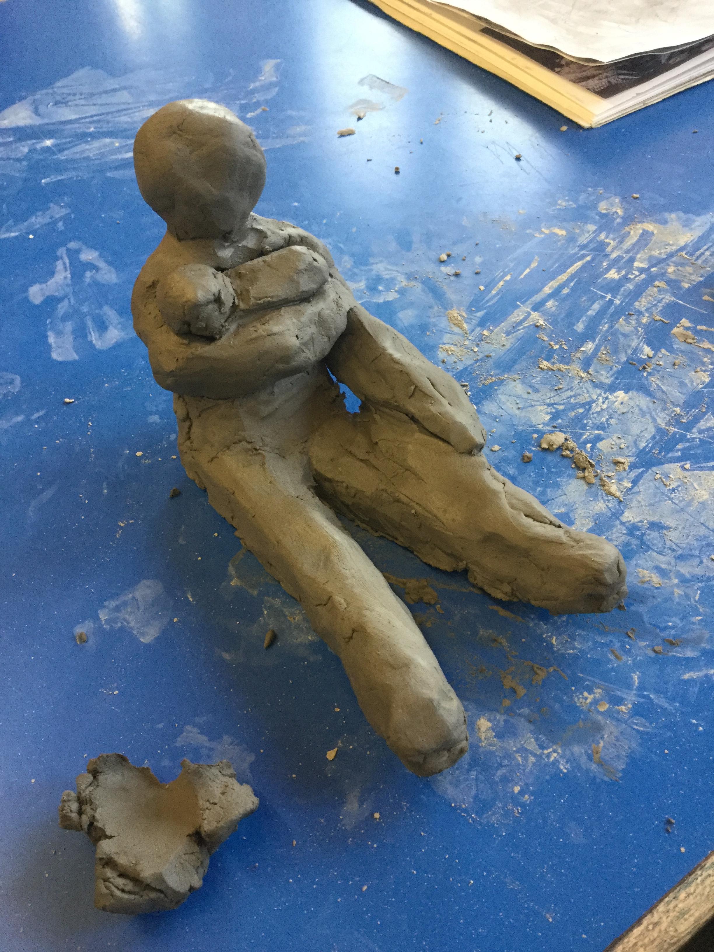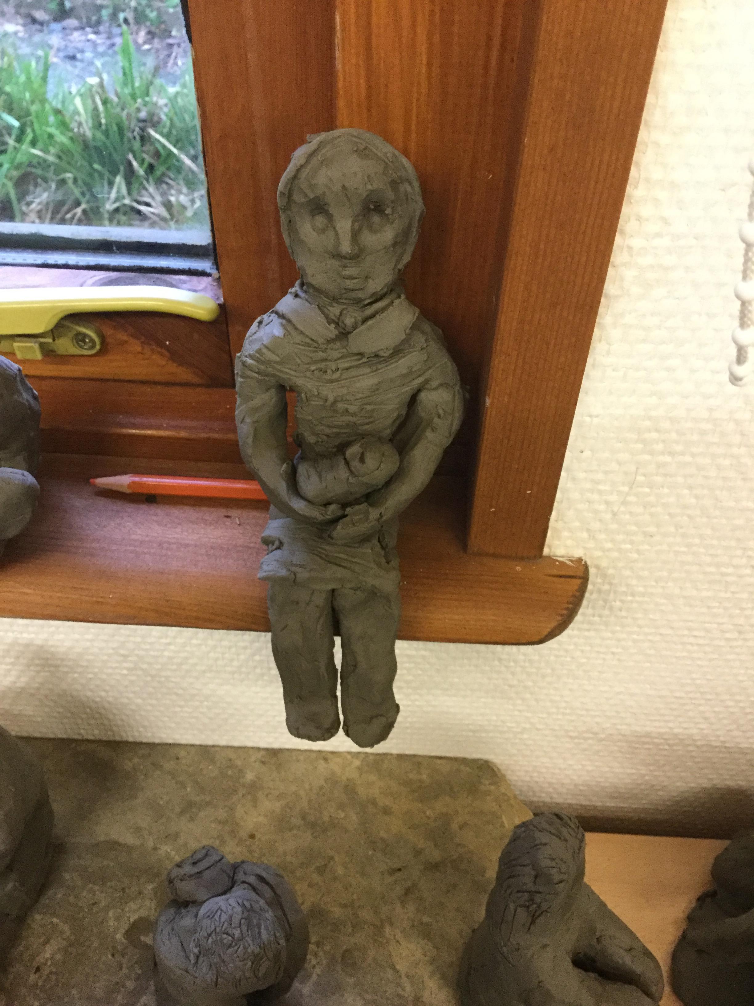 Designing our clay figures in the style of Henry Moore’s underground shelter figures.