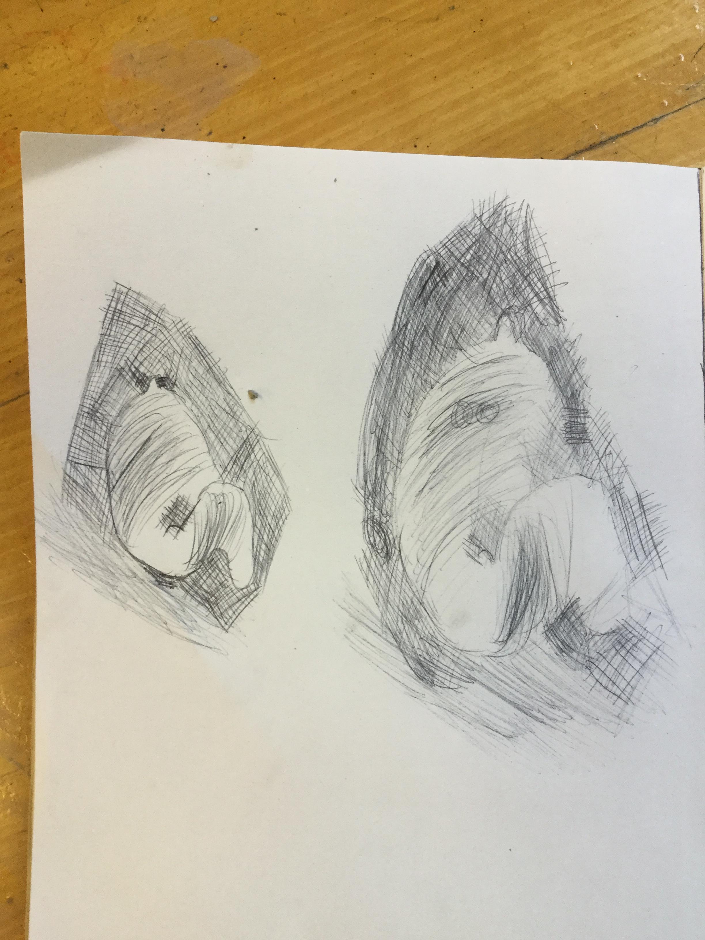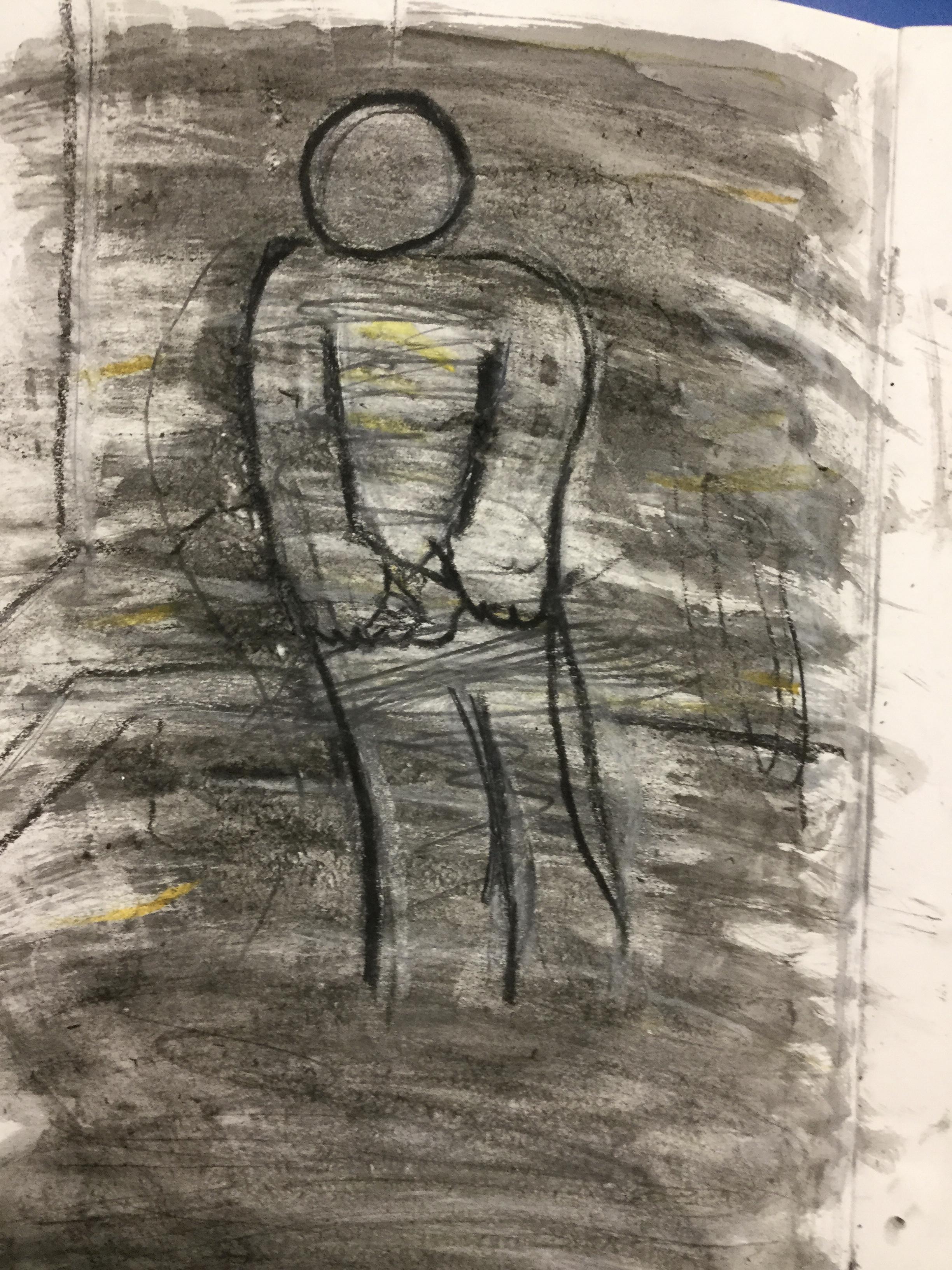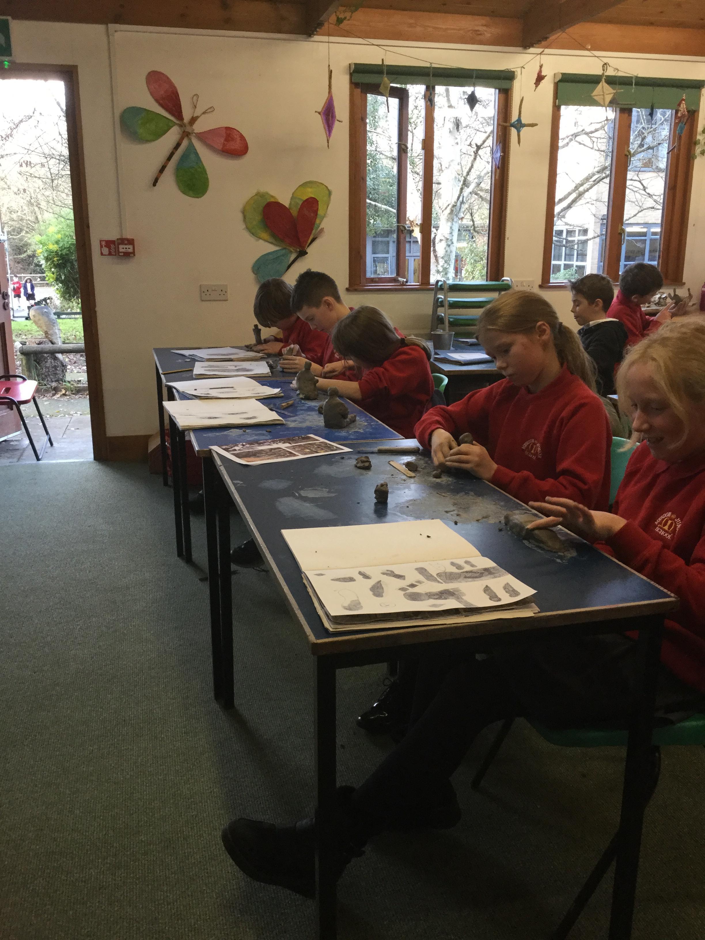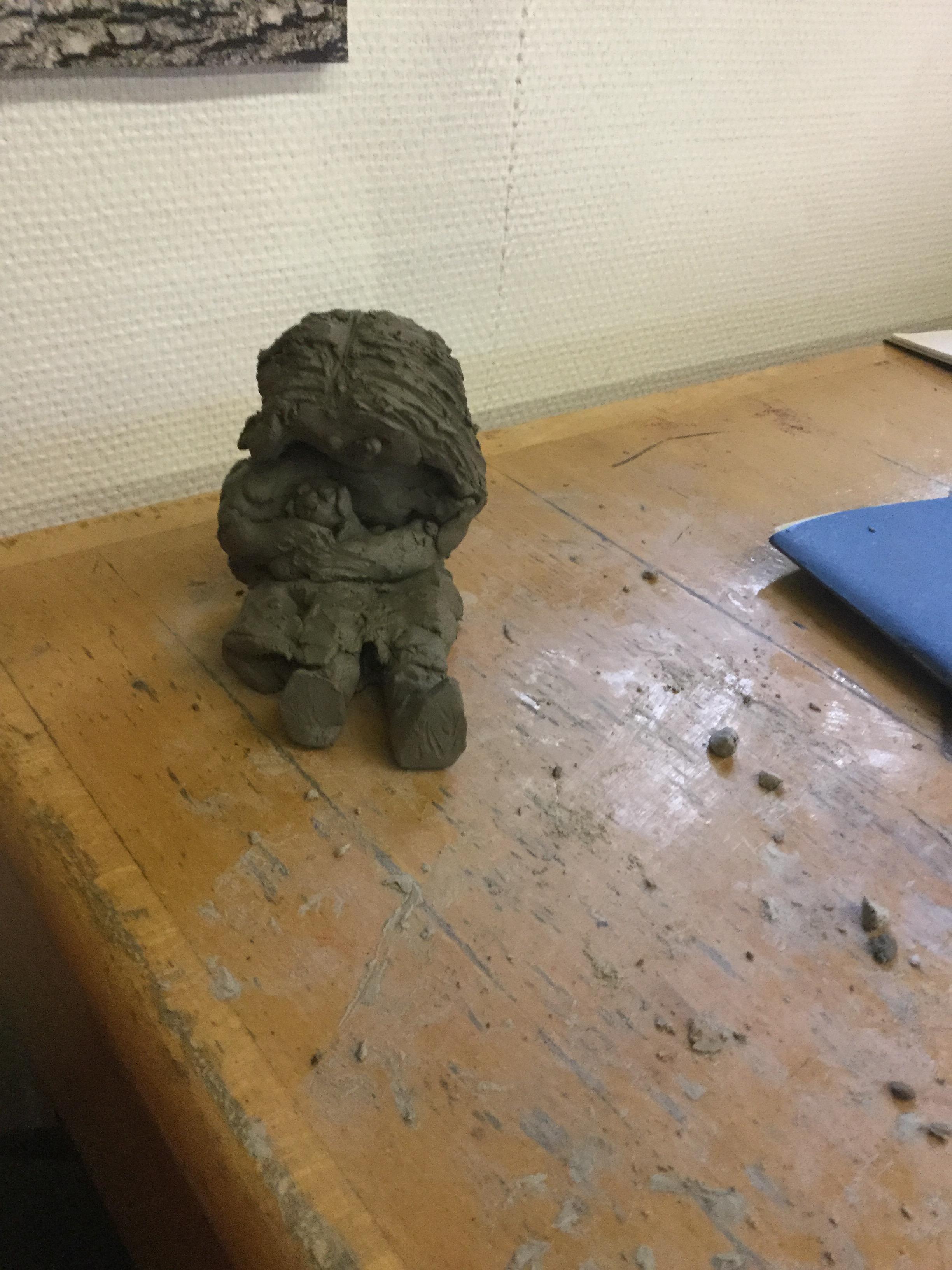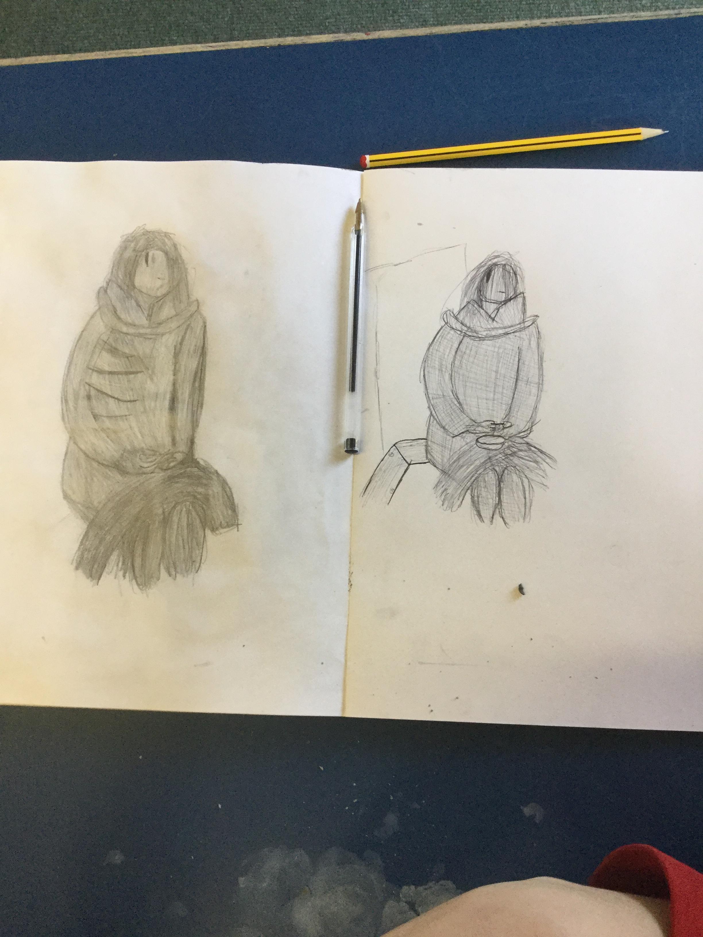 Designing our clay figures in the style of Henry Moore’s underground shelter figures.