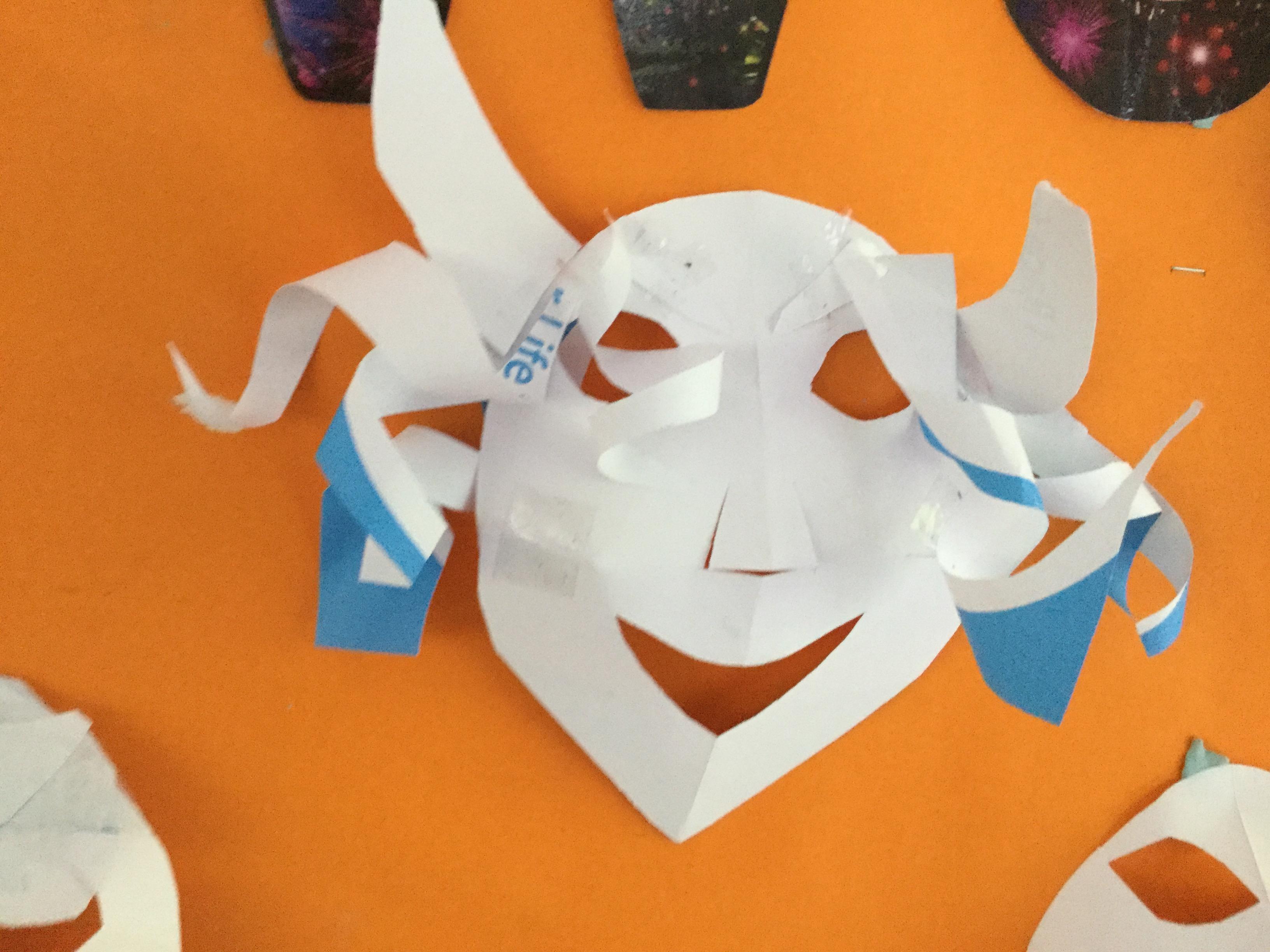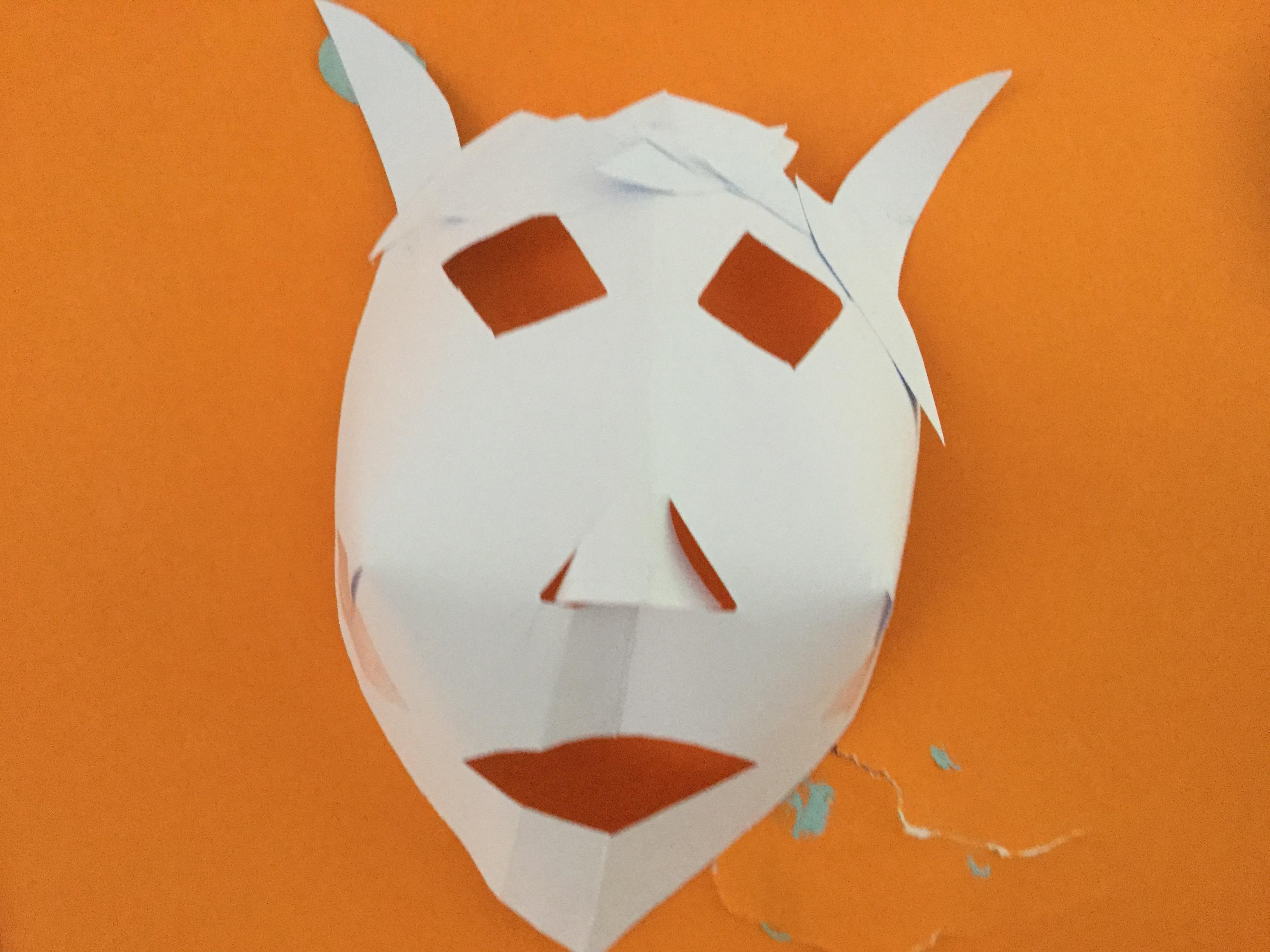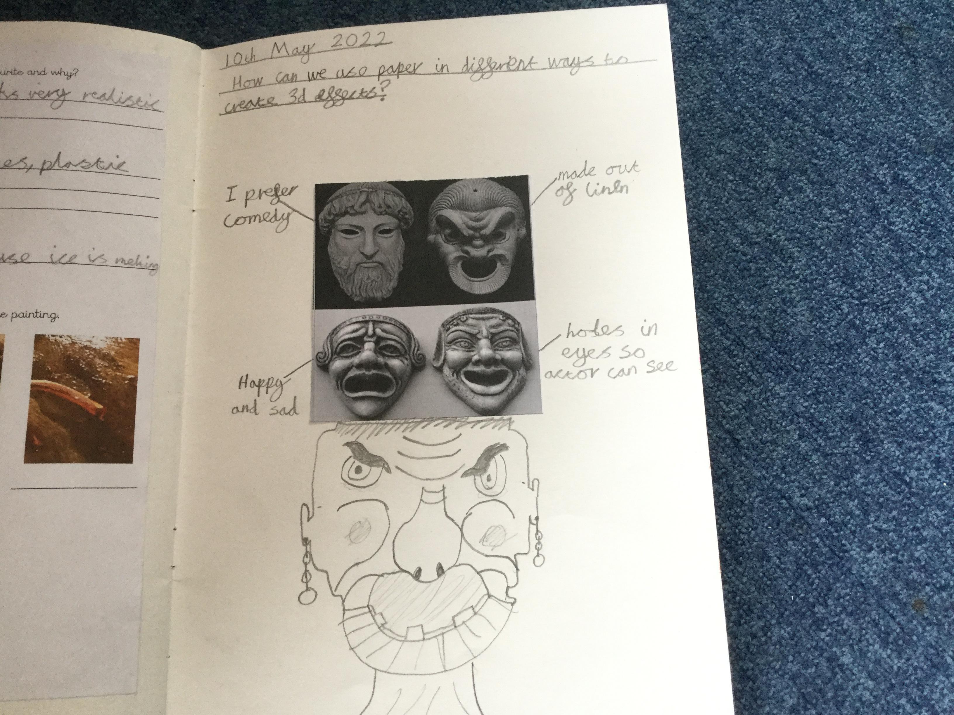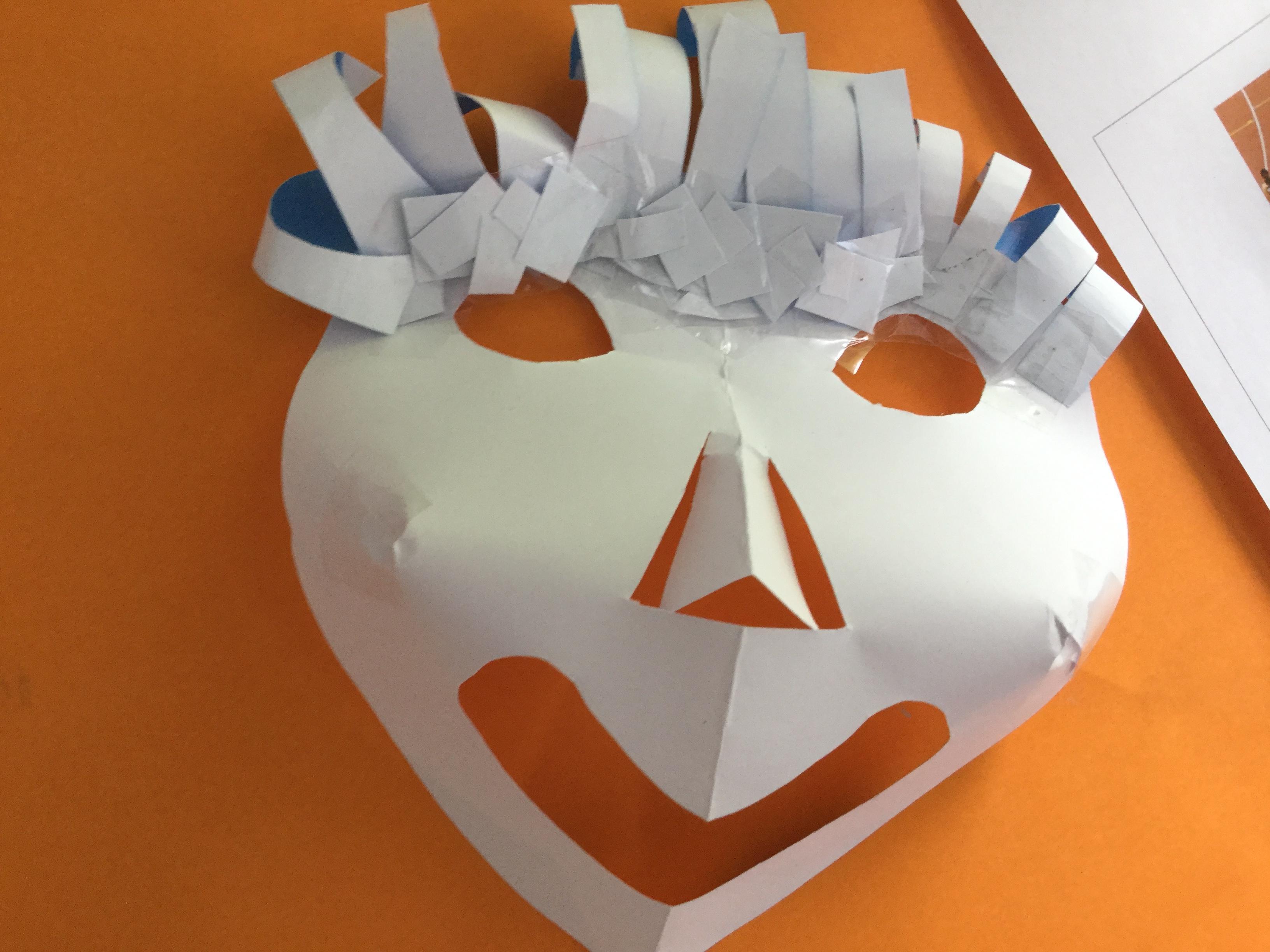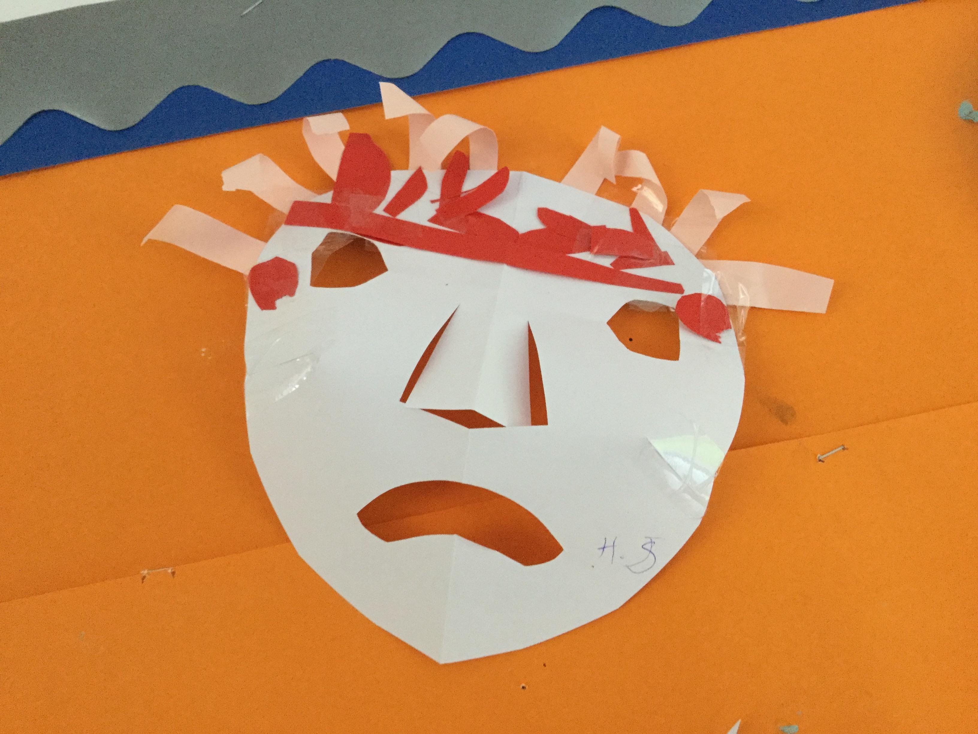 We learnt all about the Ancient Greek theatres today, leading to looking closely at different masks. We compared the shapes of the features on masks made for comedies and masks made for tragedies. We were then given a piece of paper and learnt how to cut and fold the paper in special ways to create 3D effects. In order to make our masks look Greek, we added paper cut, curled and folded in different ways to create desired features.