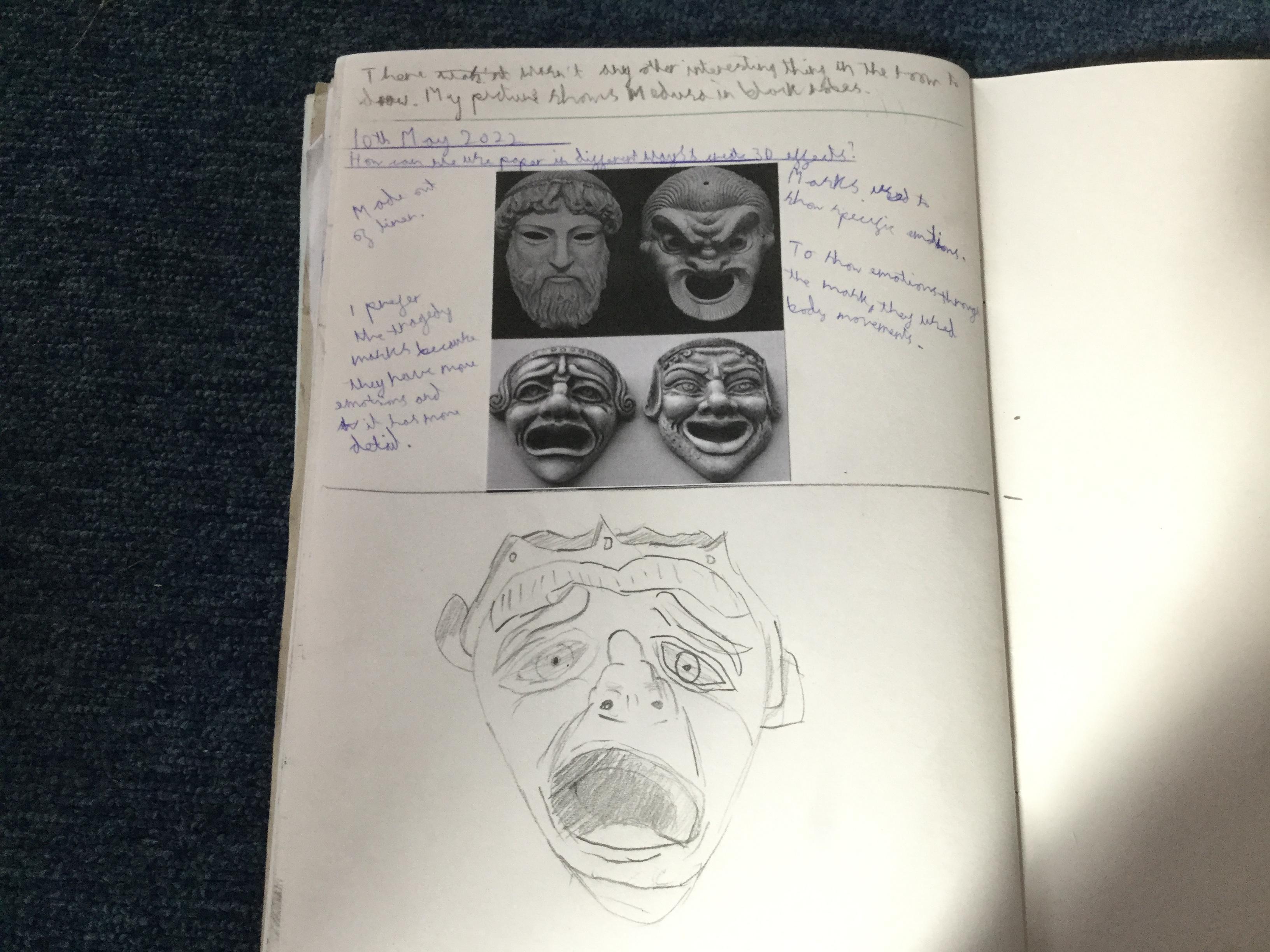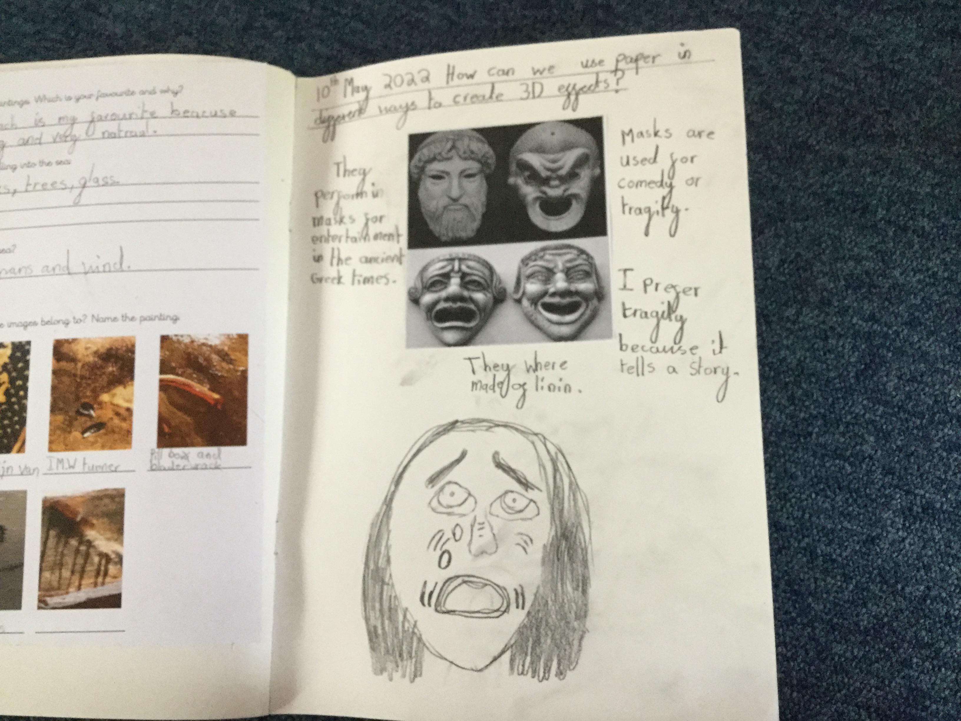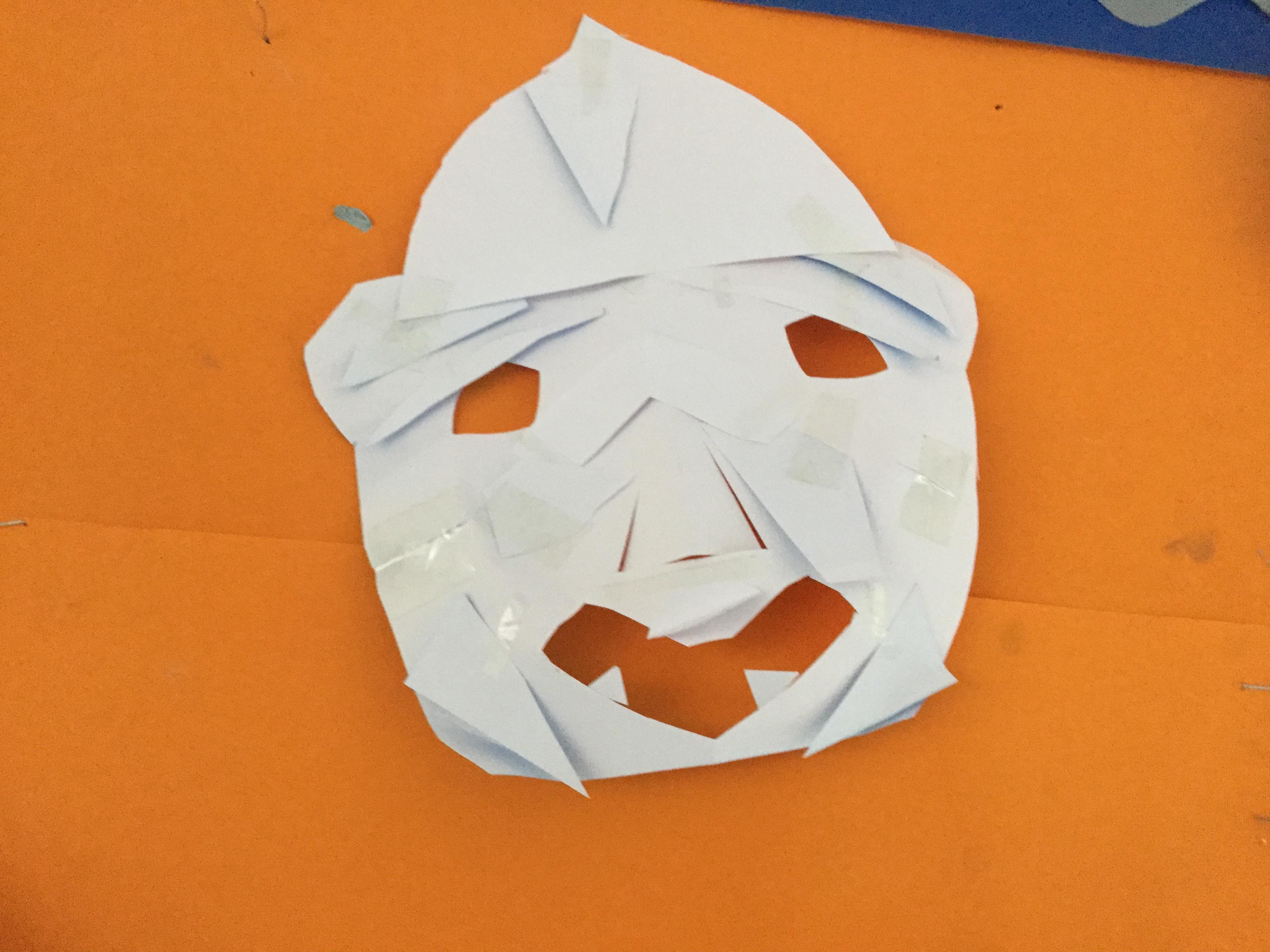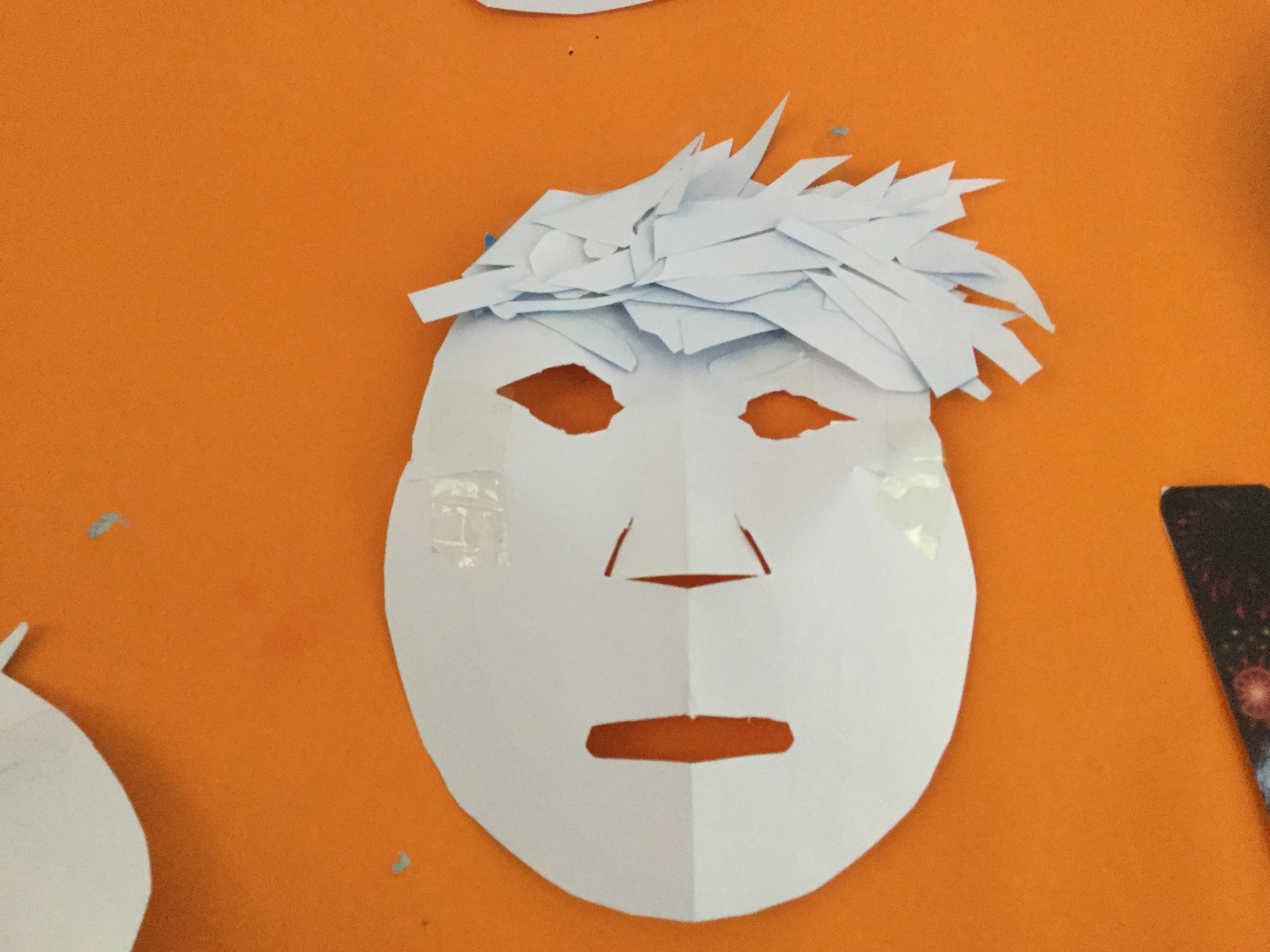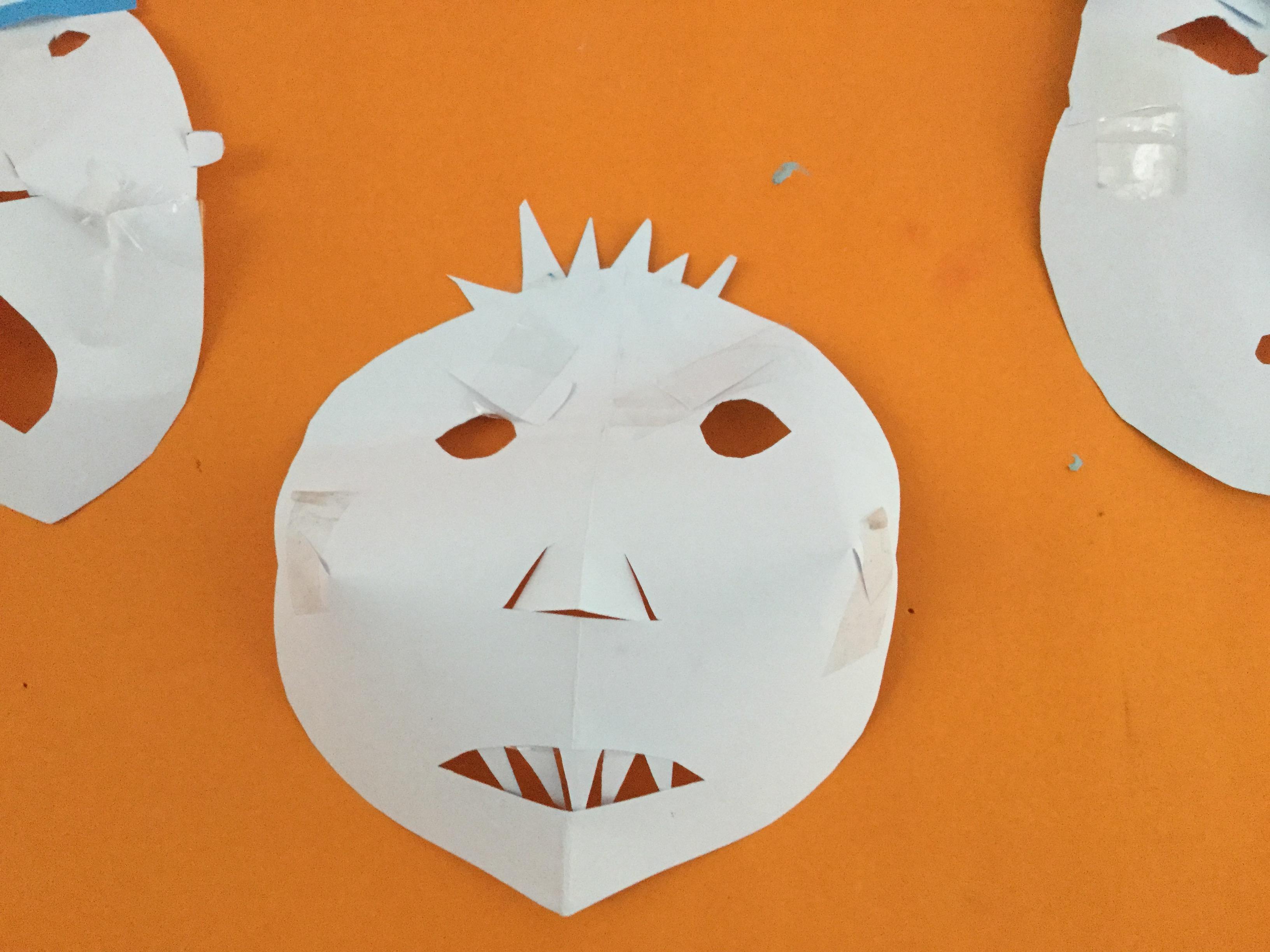 We learnt all about the Ancient Greek theatres today, leading to looking closely at different masks. We compared the shapes of the features on masks made for comedies and masks made for tragedies. We were then given a piece of paper and learnt how to cut and fold the paper in special ways to create 3D effects. In order to make our masks look Greek, we added paper cut, curled and folded in different ways to create desired features.