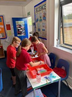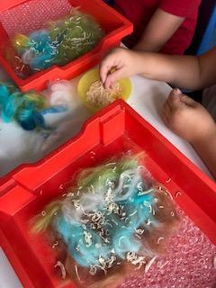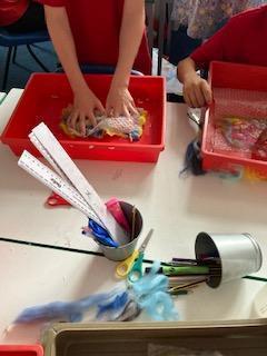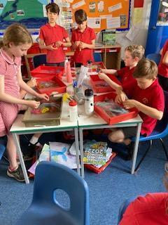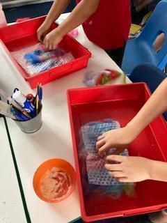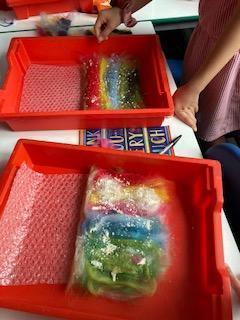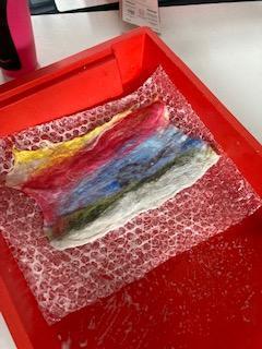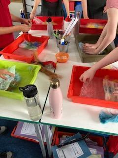 As part of our Rivers topic, the children designed and made felt. They had to make a base of thin fibres before adding their actual design. The whole piece was covered with a small amount of grated soap and then water was added. The children then had to massage the fibres together in the bubble wrap - eventually they were left with felt!