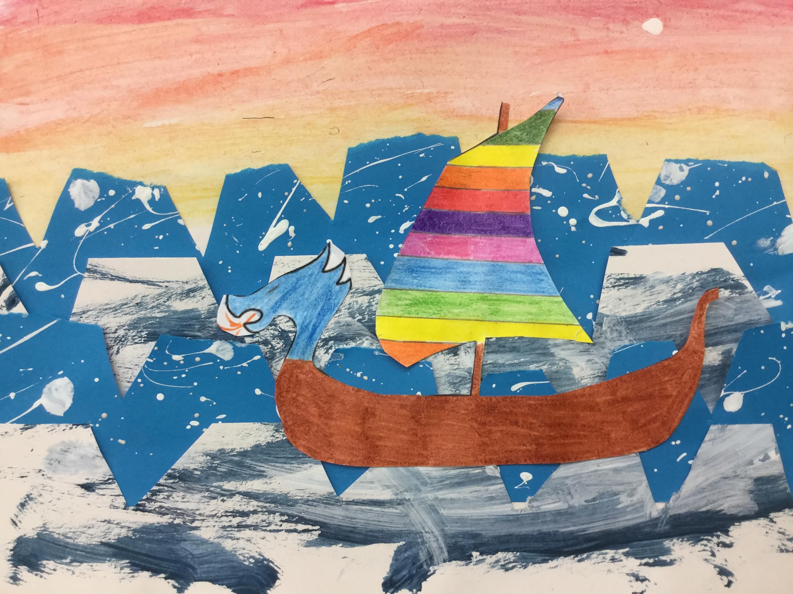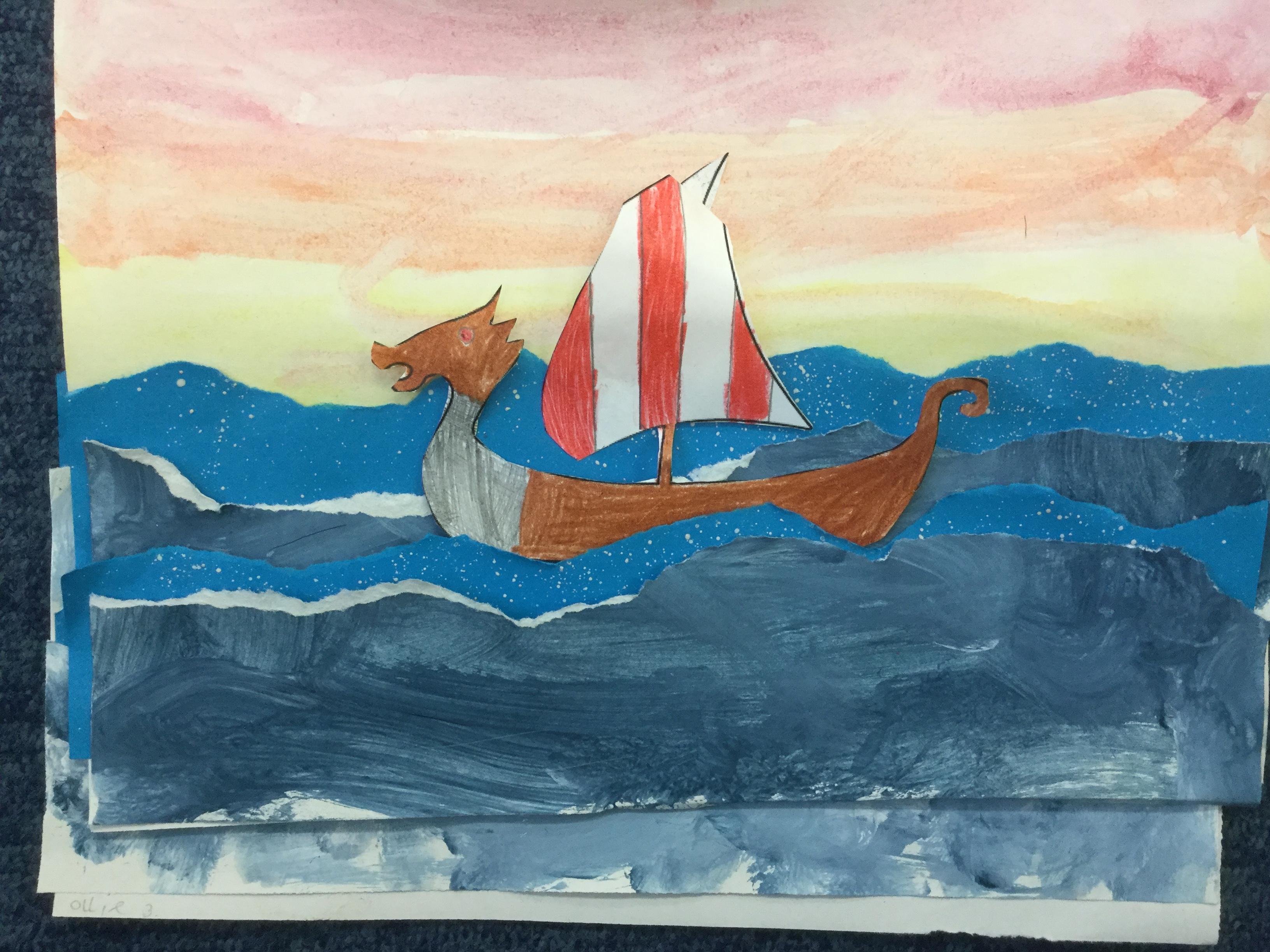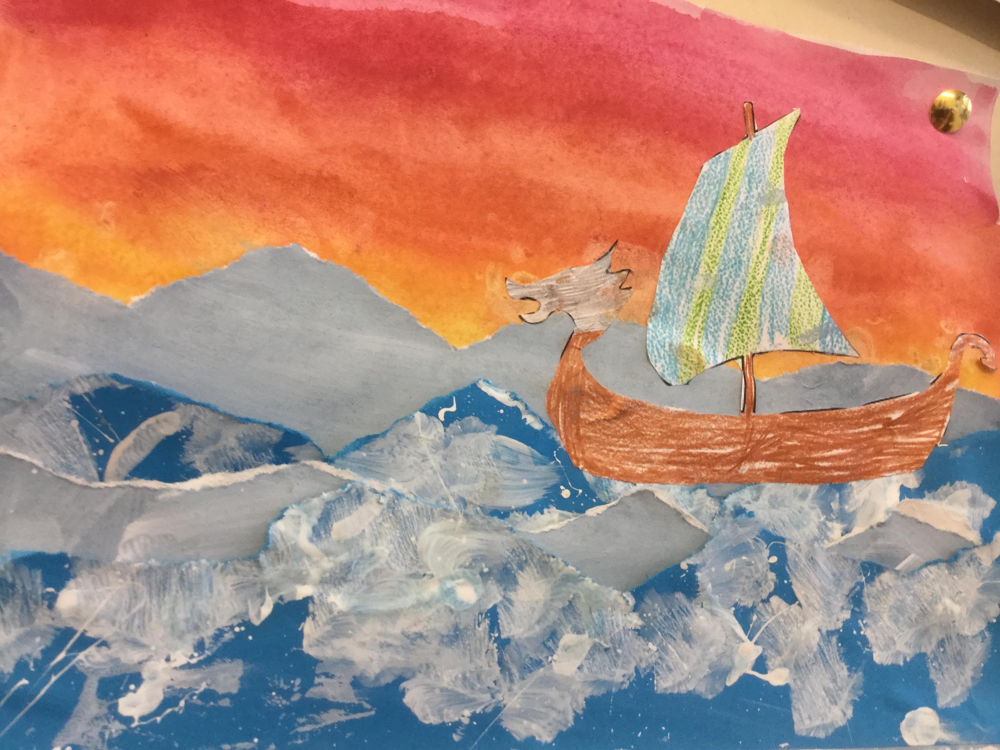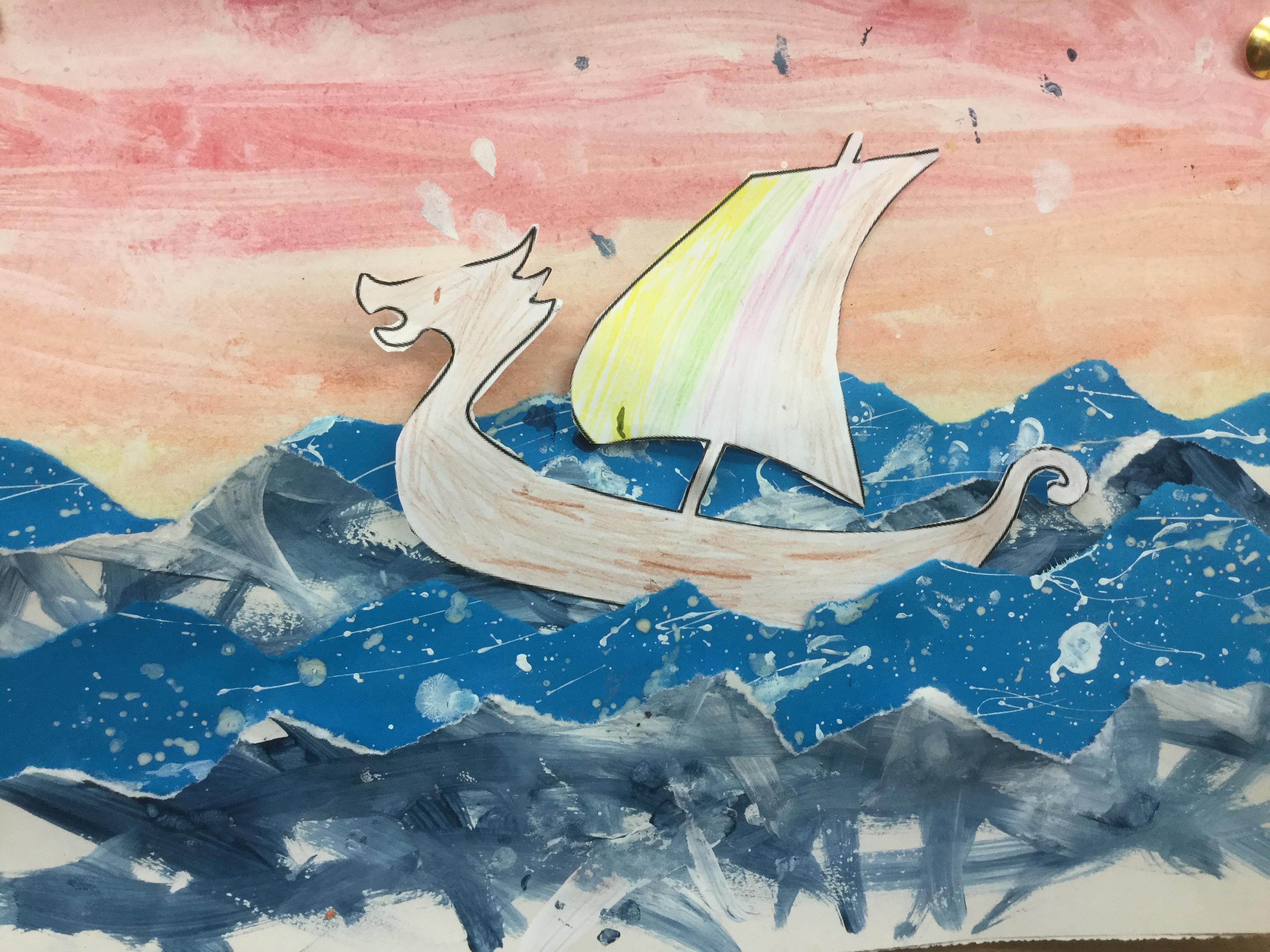 Today we made painting collages depicting a Viking ship sailing on the seas. We used different techniques to create the different effects of the sky and waves.