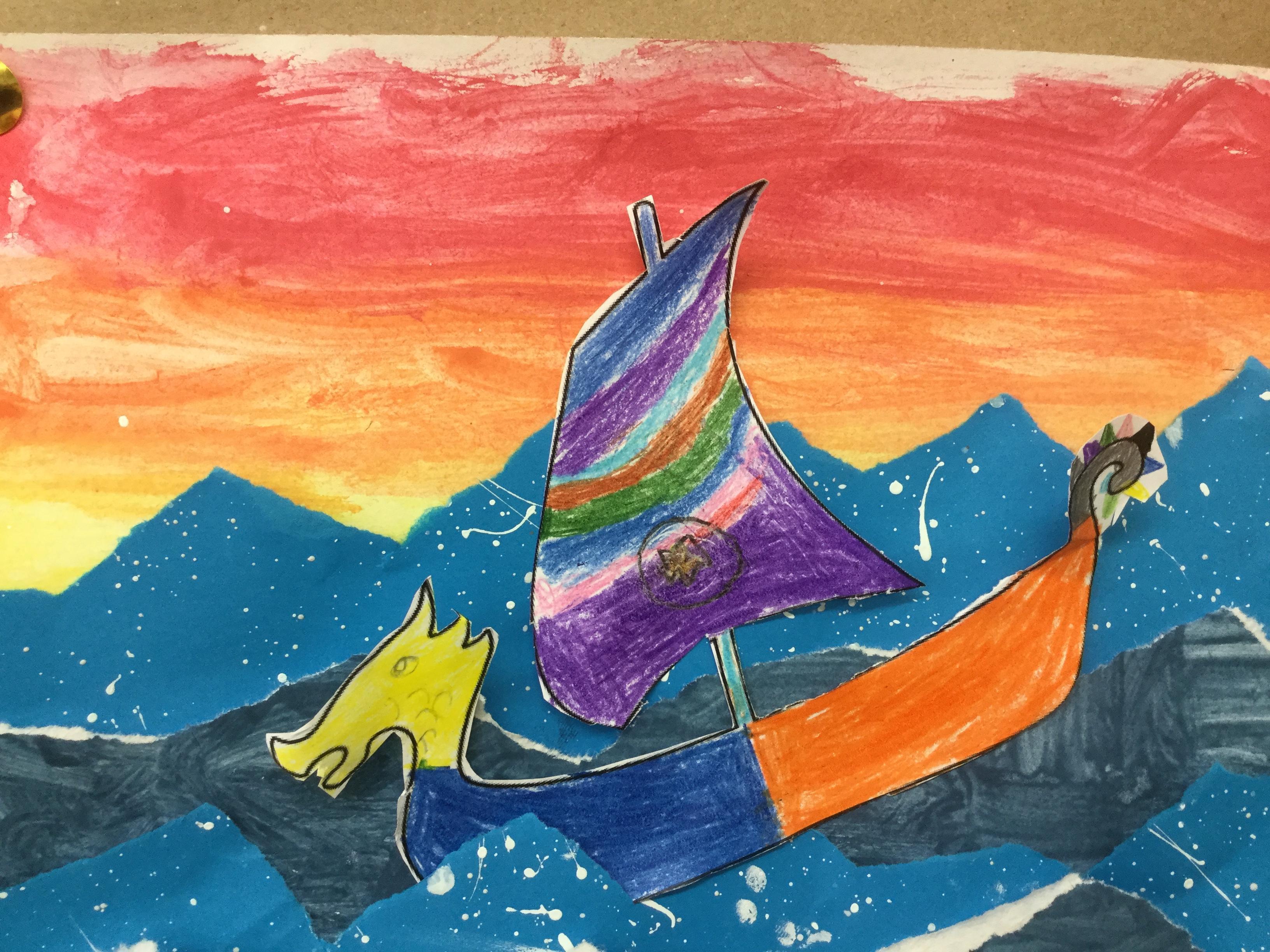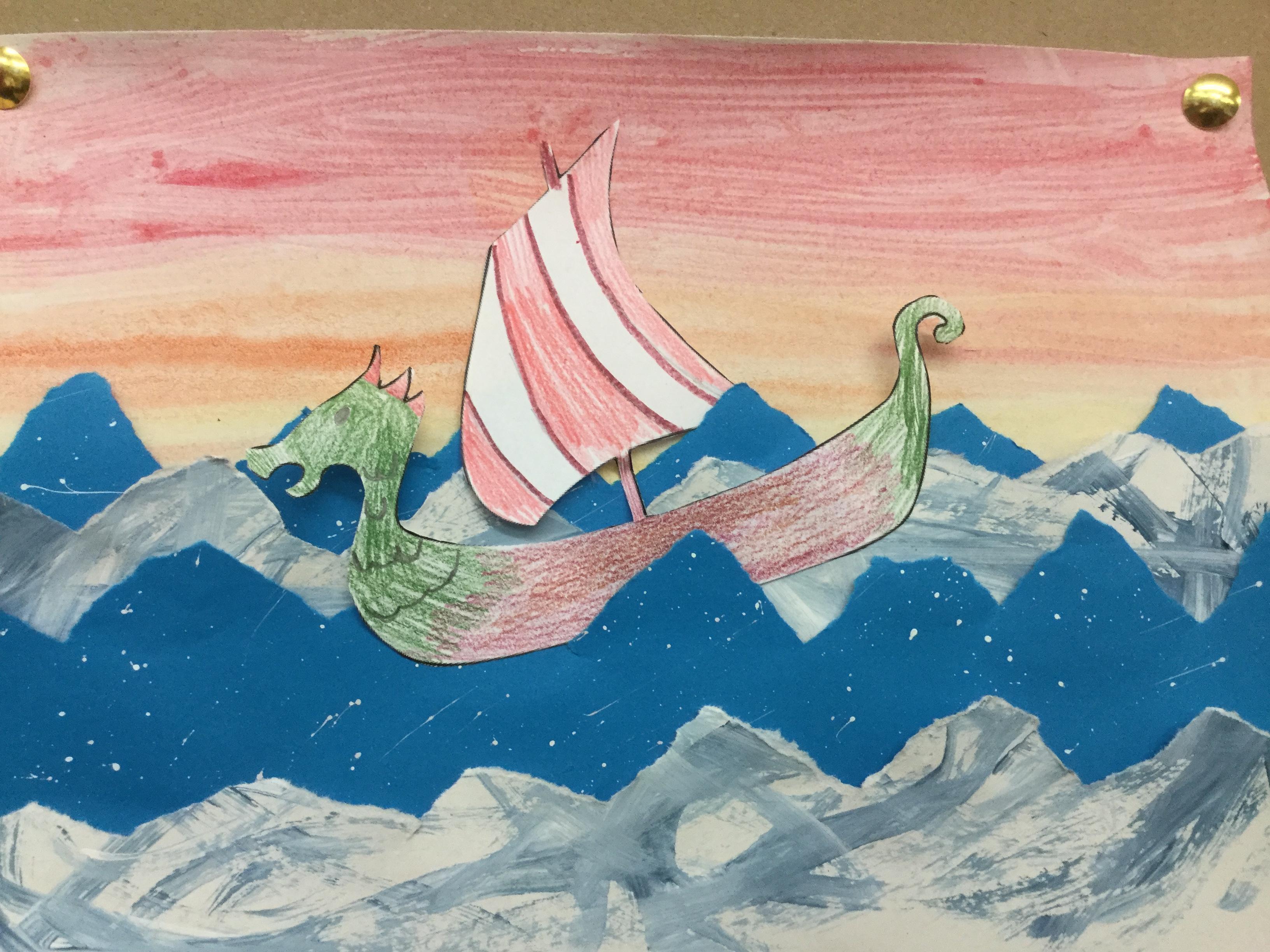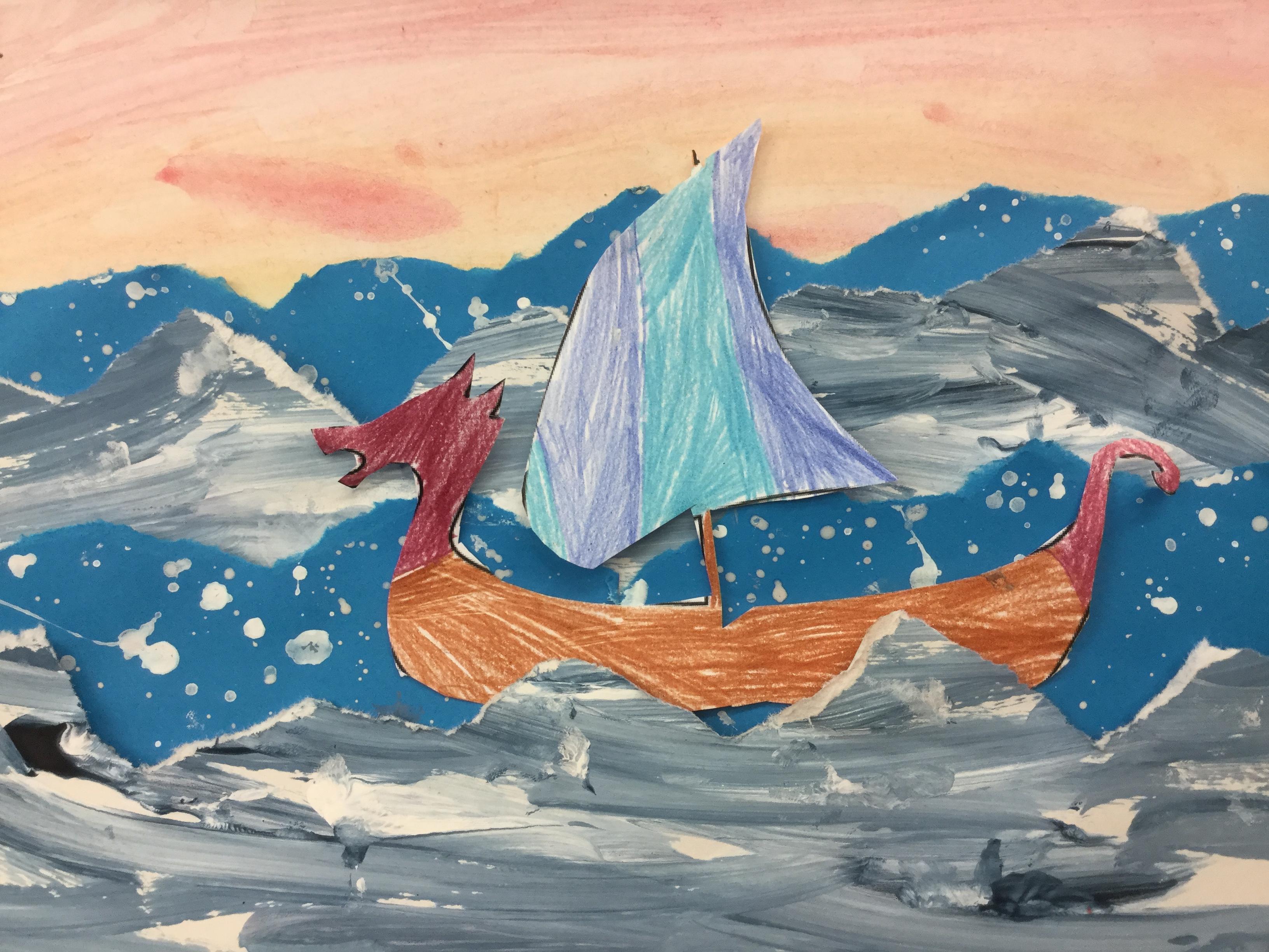 Today we made painting collages depicting a Viking ship sailing on the seas. We used different techniques to create the different effects of the sky and waves.