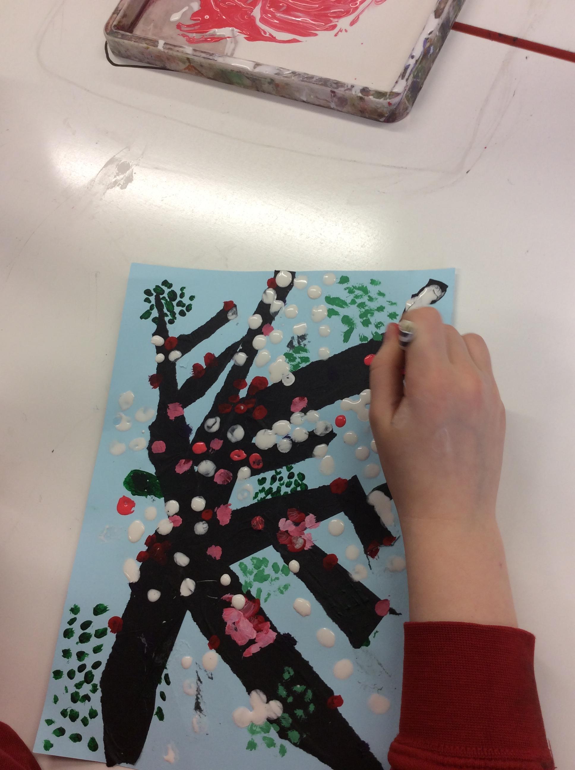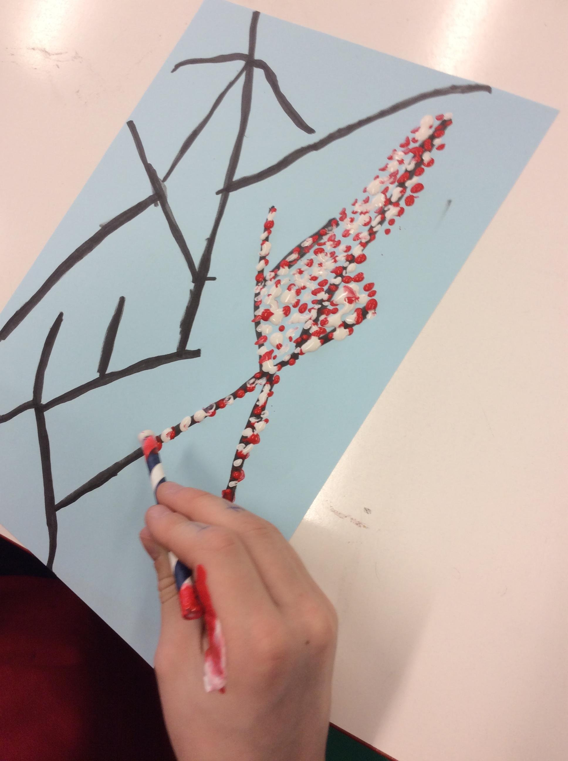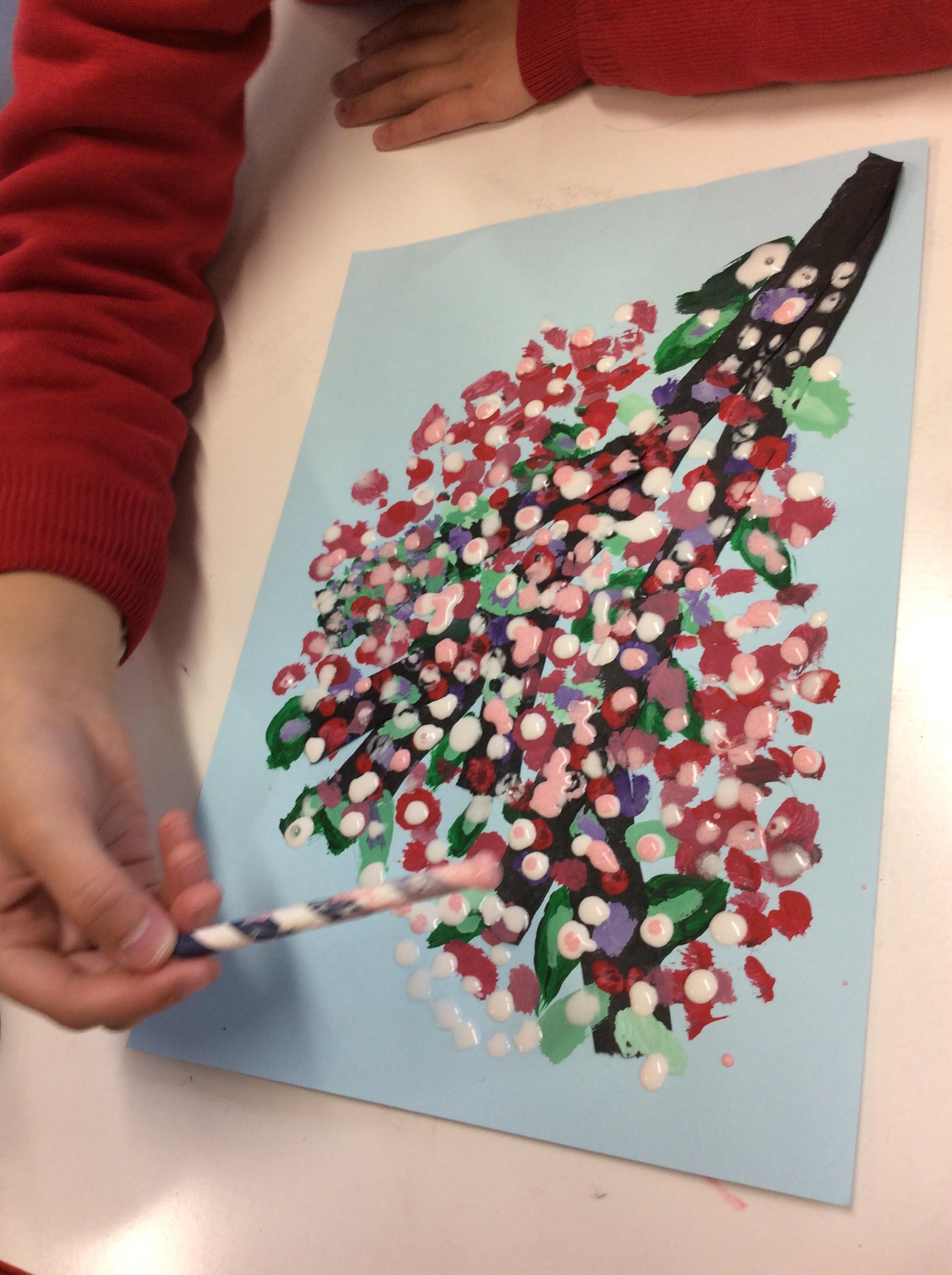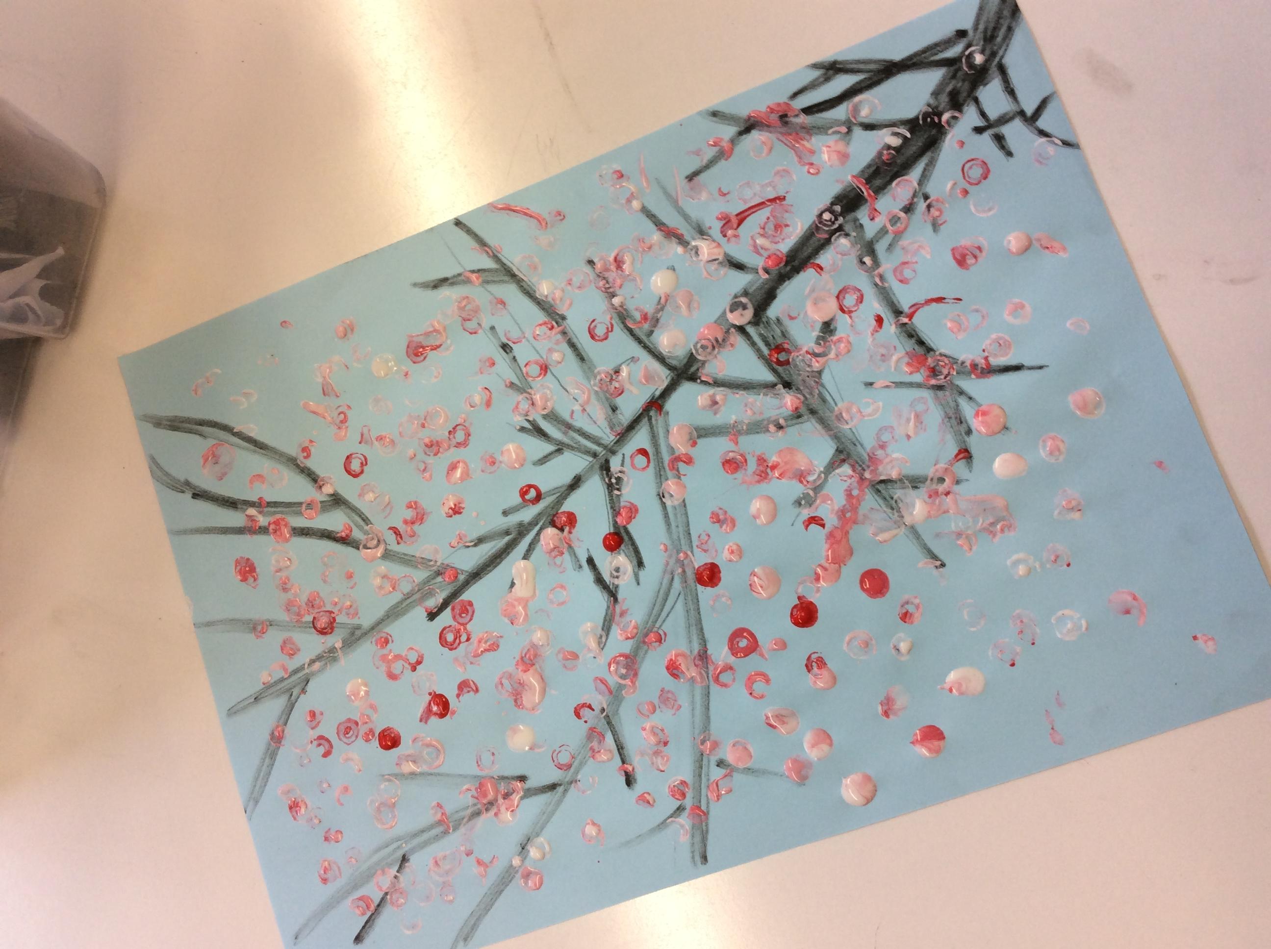 We experimented with inky paint, pipettes and straws to recreate Kensuke’s Japanese blossom tree paintings.