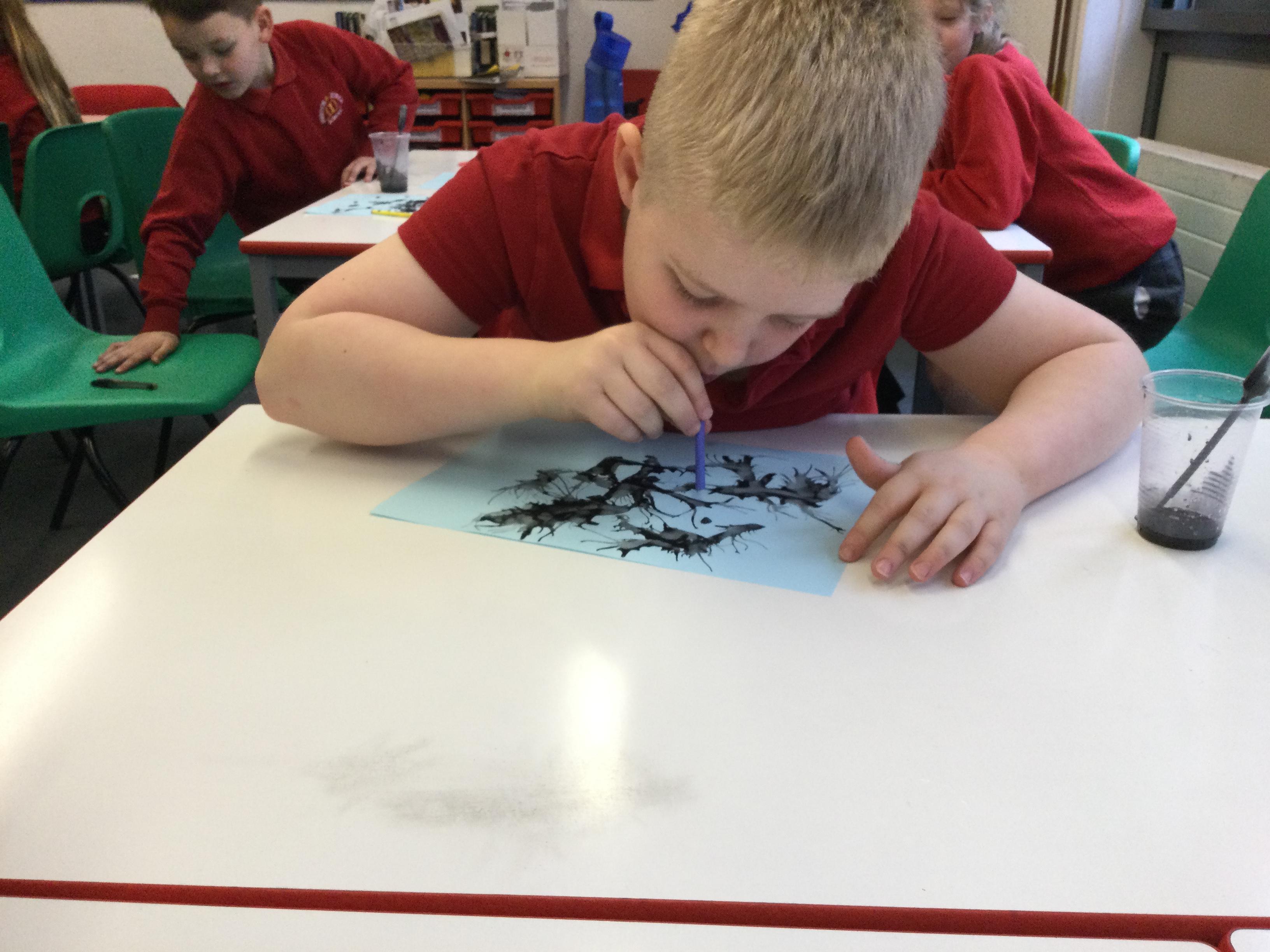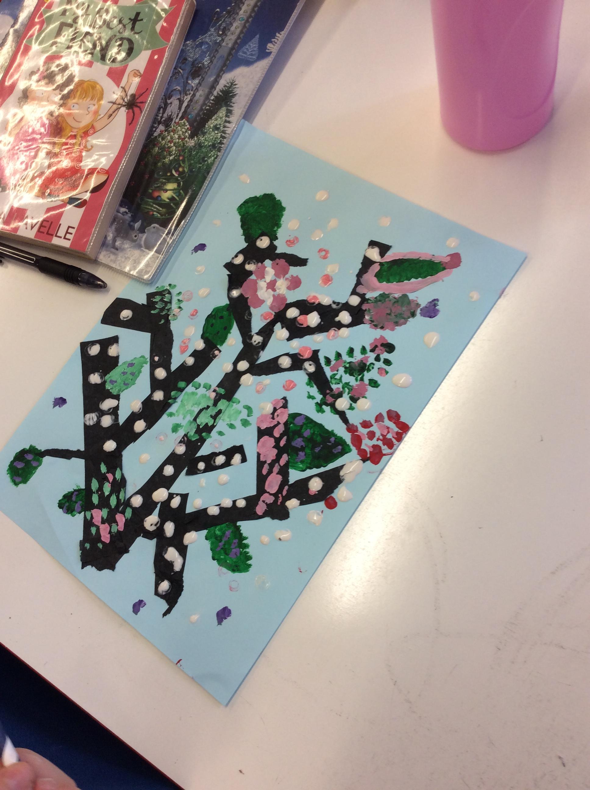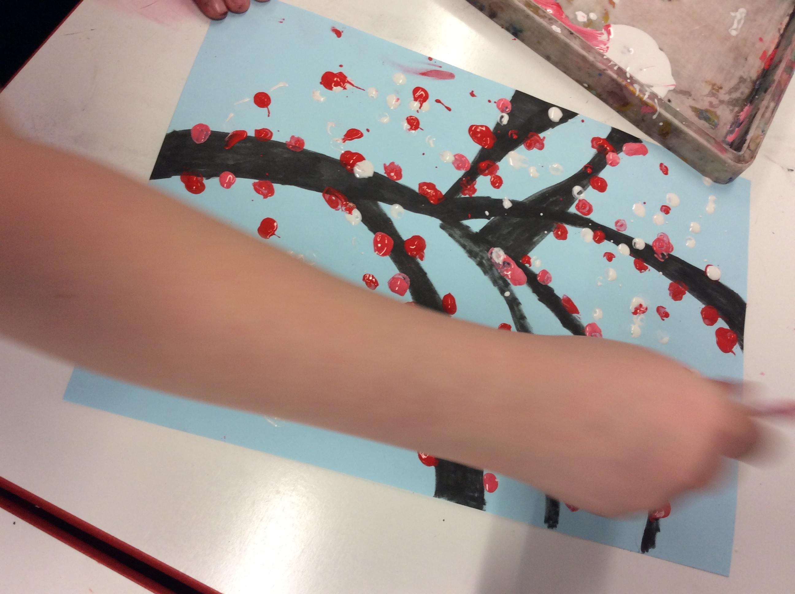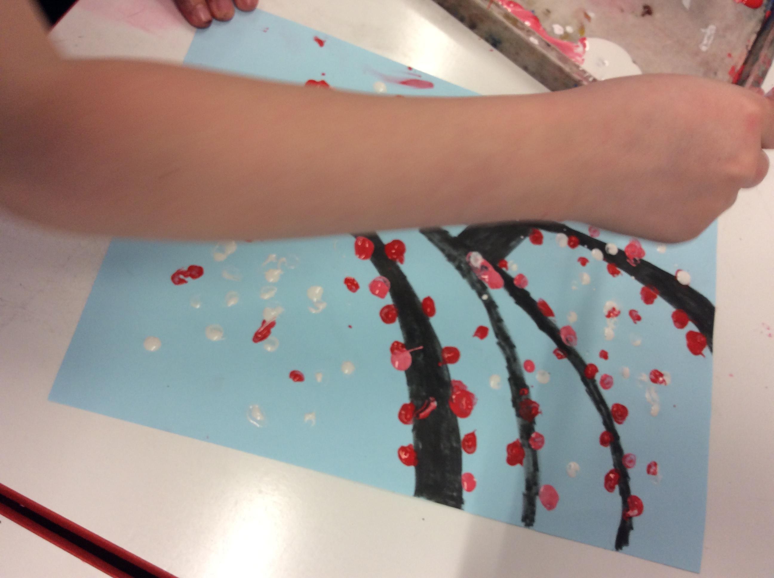 We experimented with inky paint, pipettes and straws to recreate Kensuke’s Japanese blossom tree paintings.
