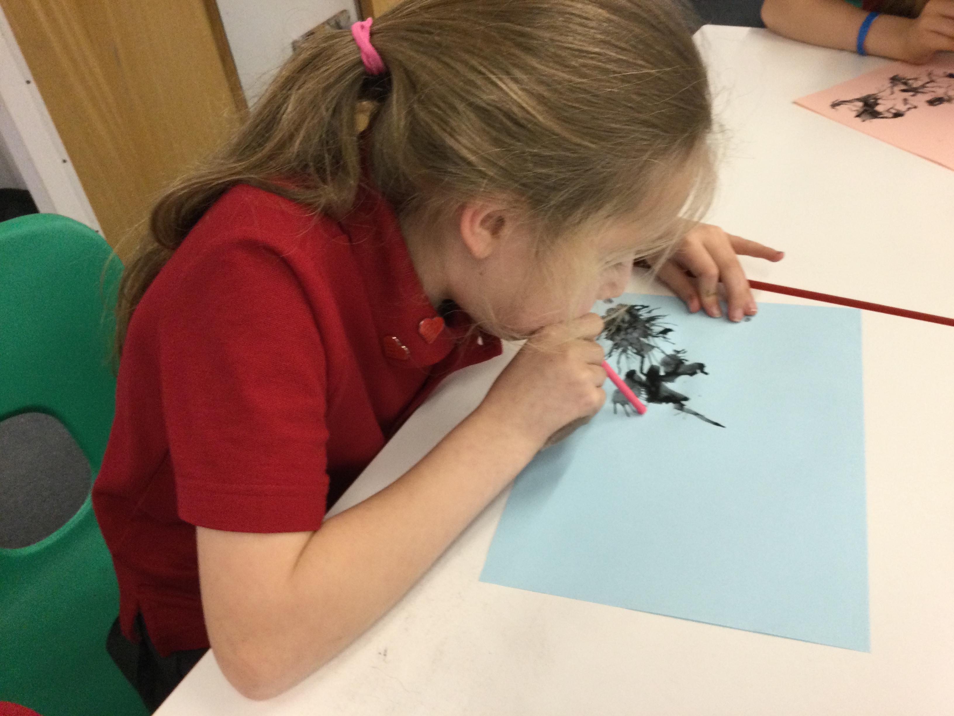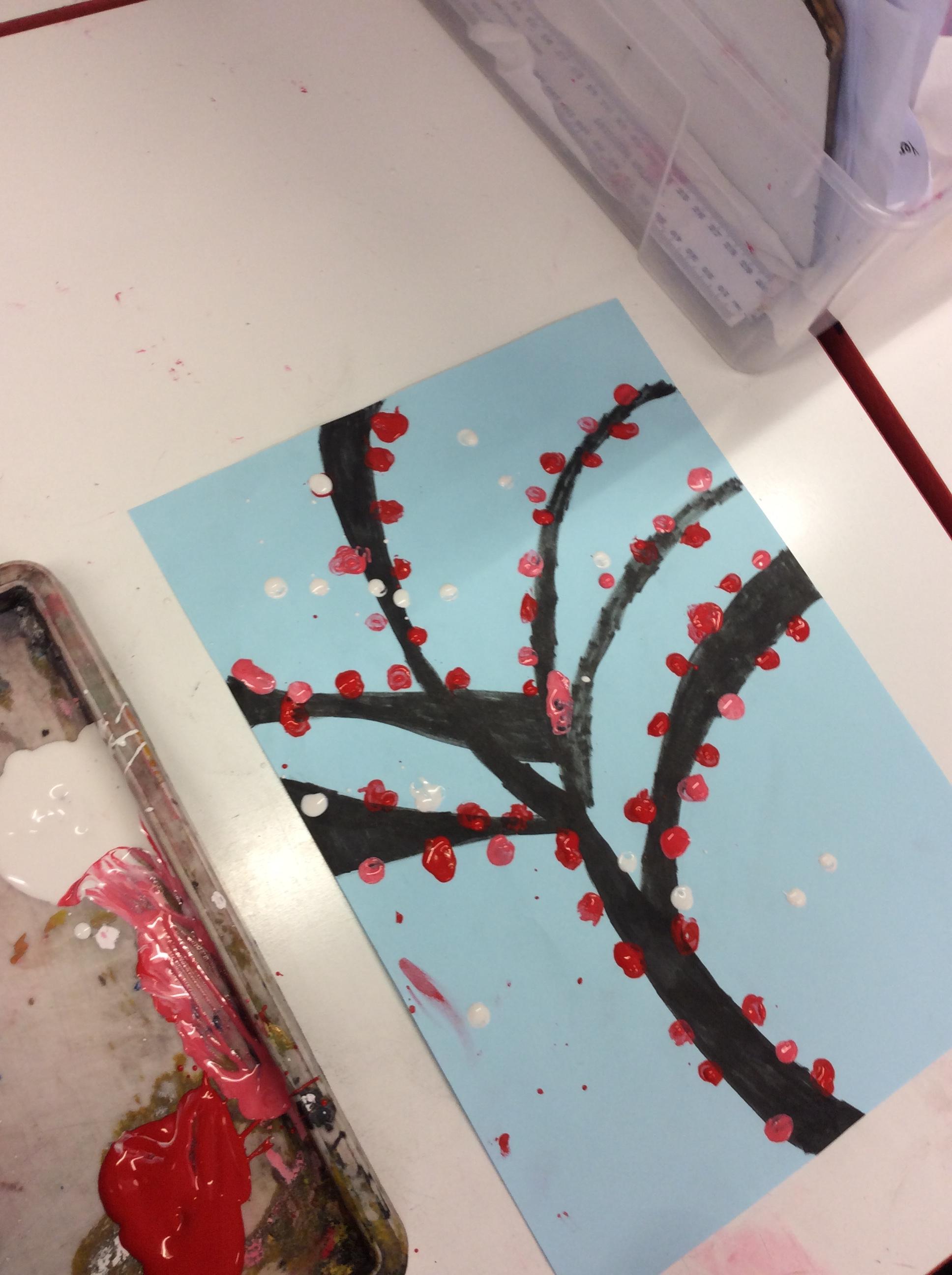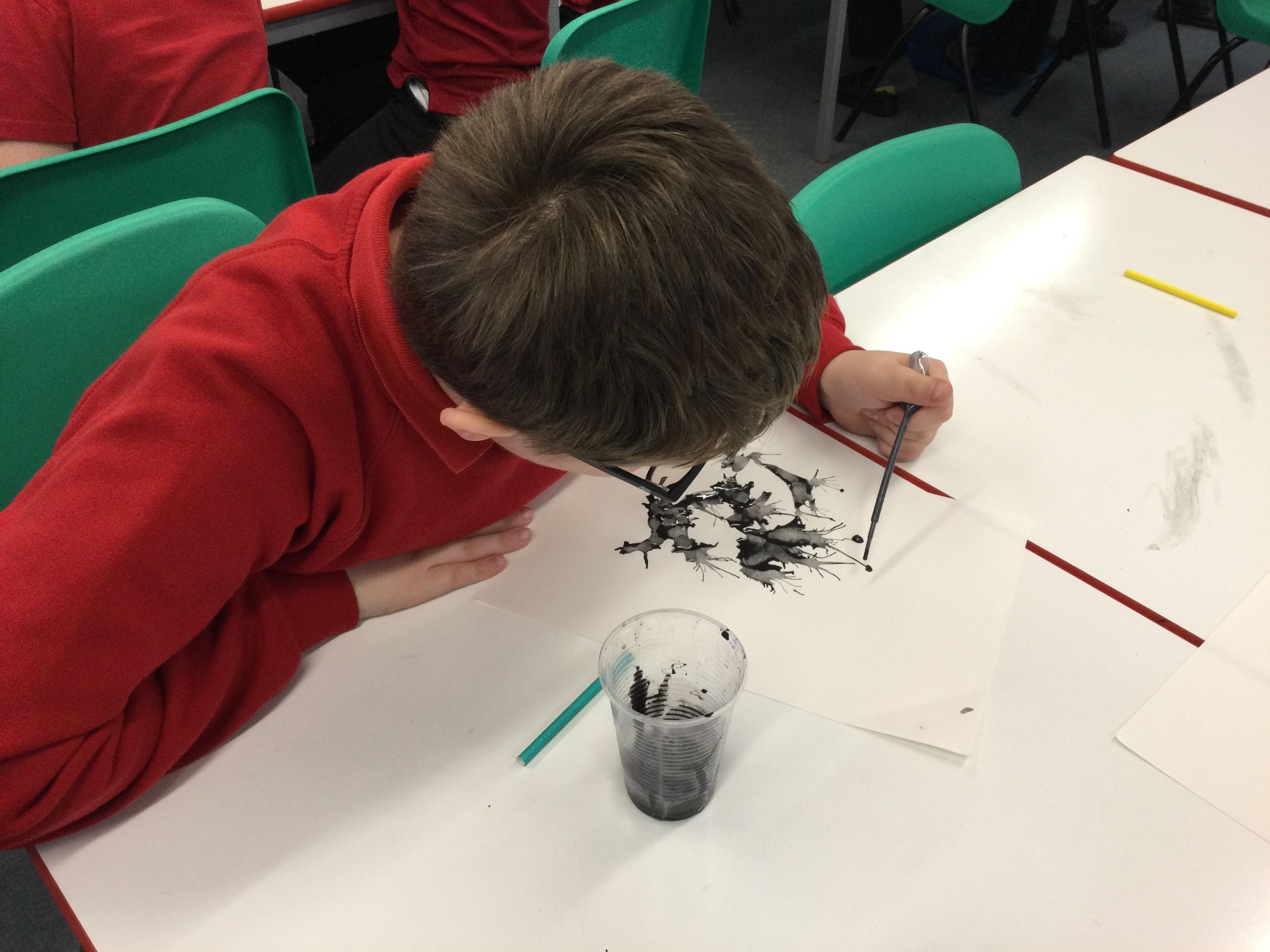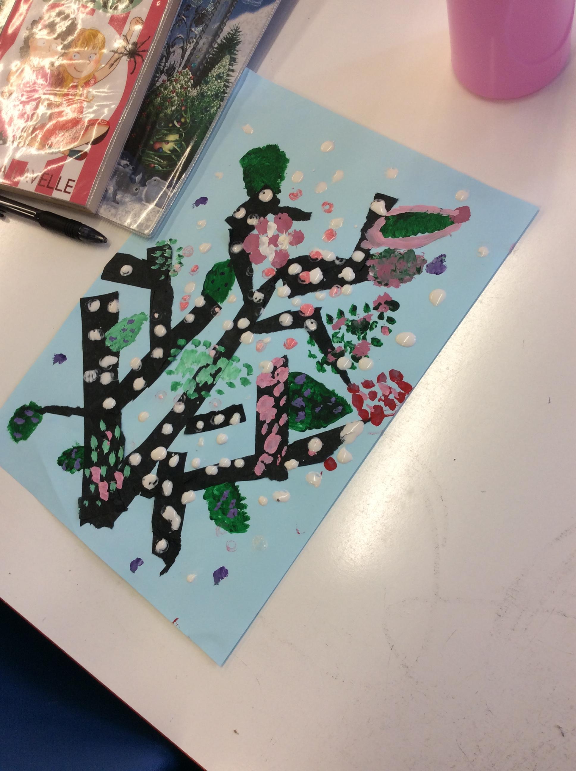 We experimented with inky paint, pipettes and straws to recreate Kensuke’s Japanese blossom tree paintings.