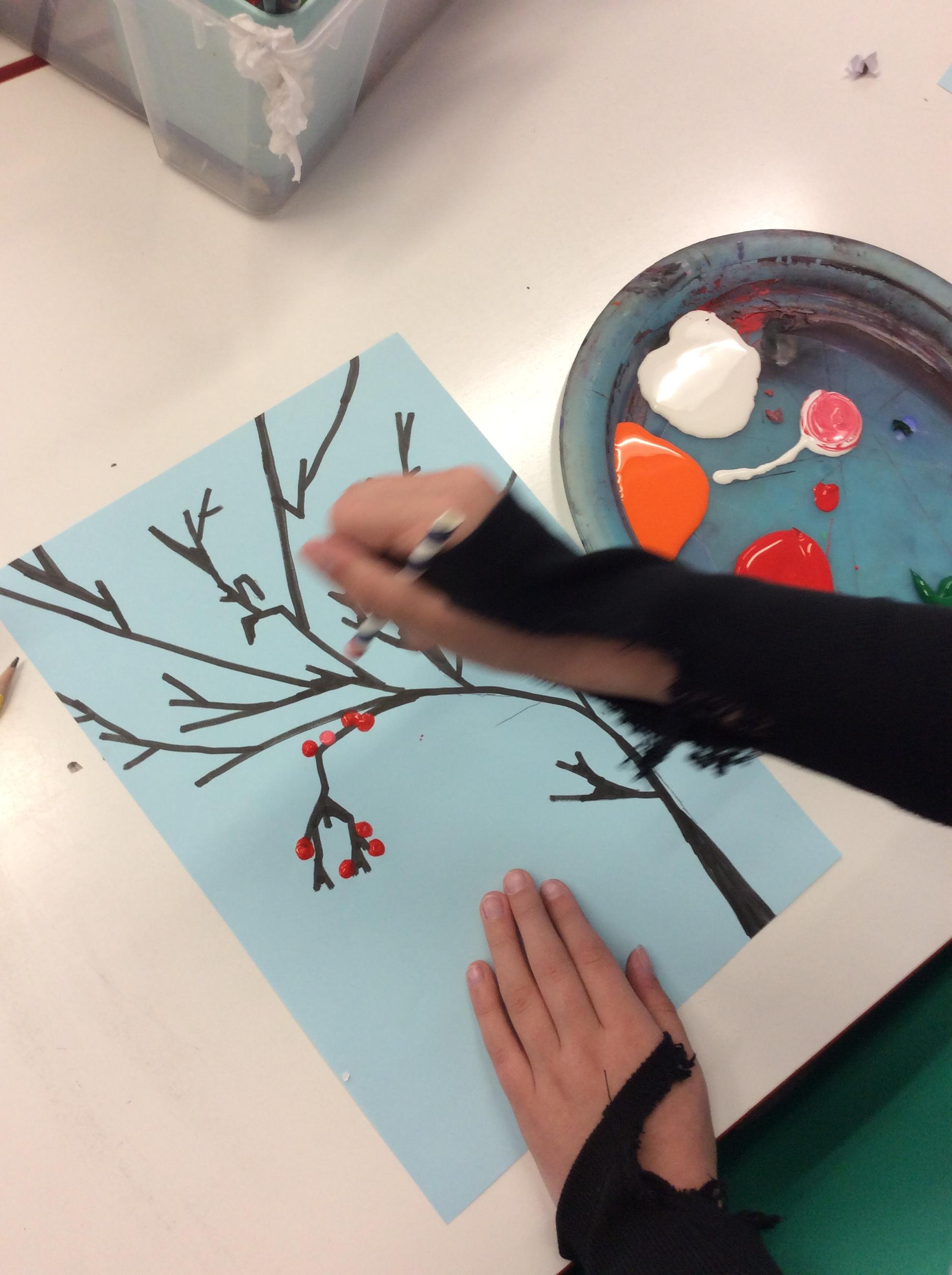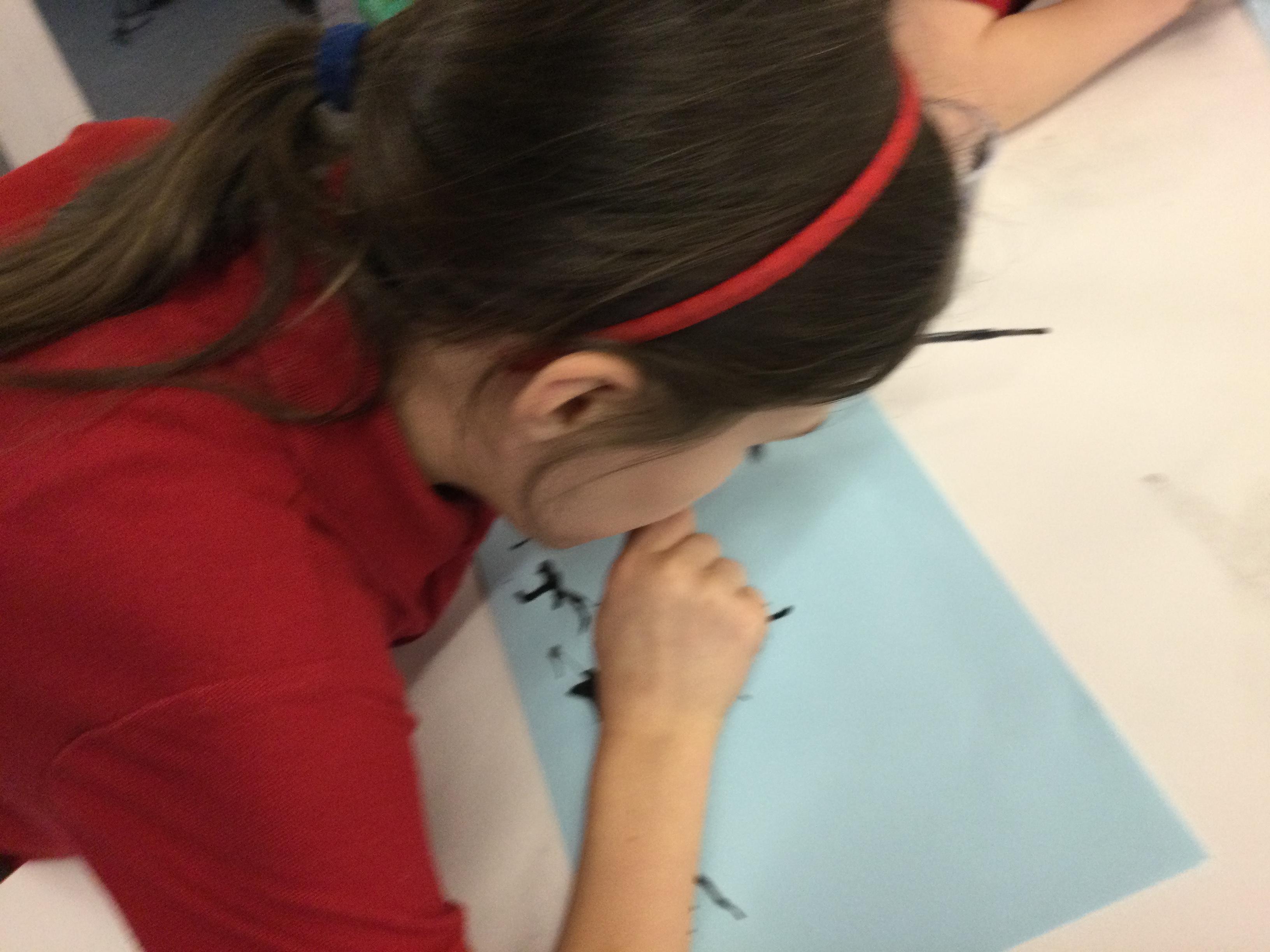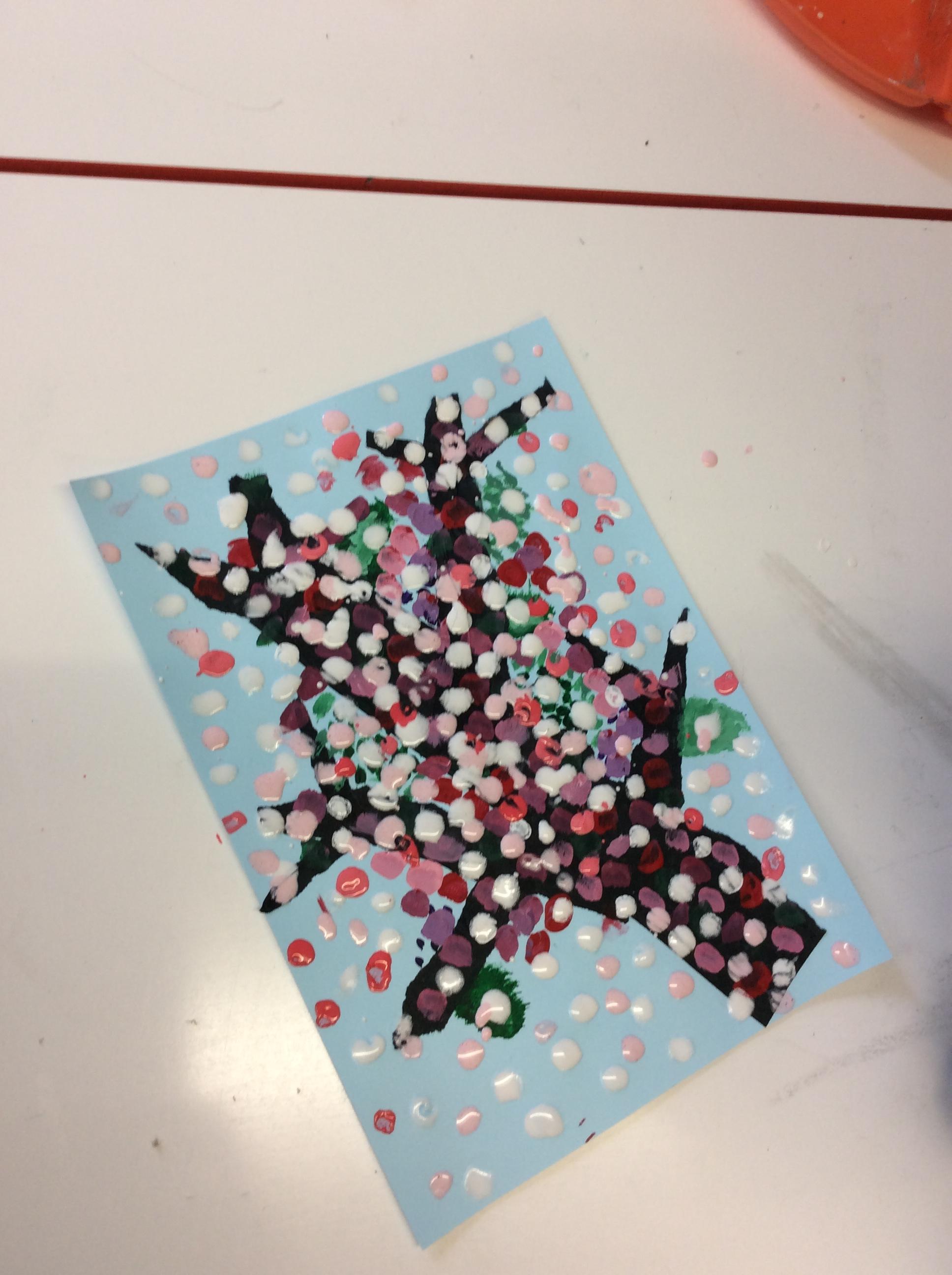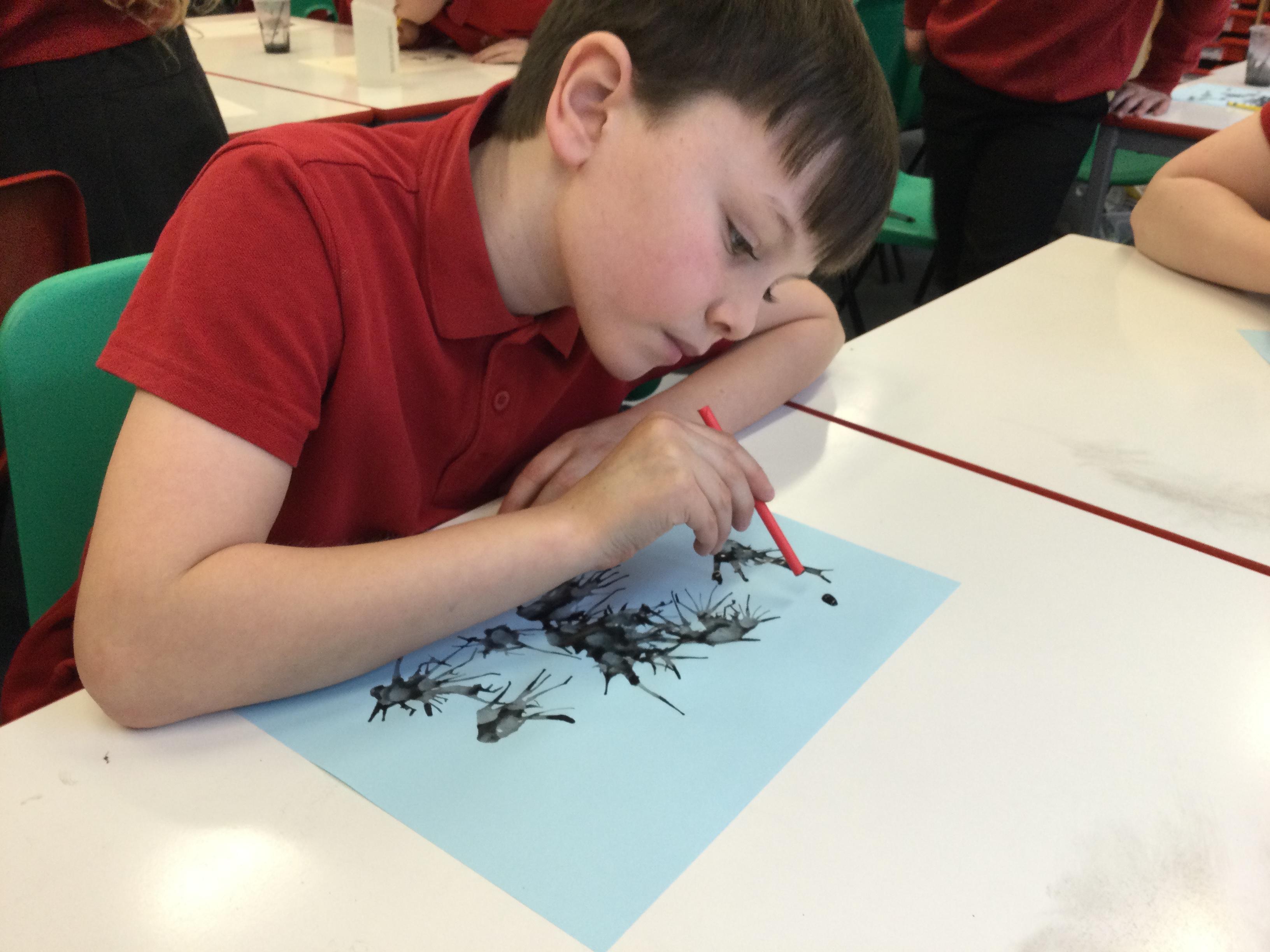 We experimented with inky paint, pipettes and straws to recreate Kensuke’s Japanese blossom tree paintings.