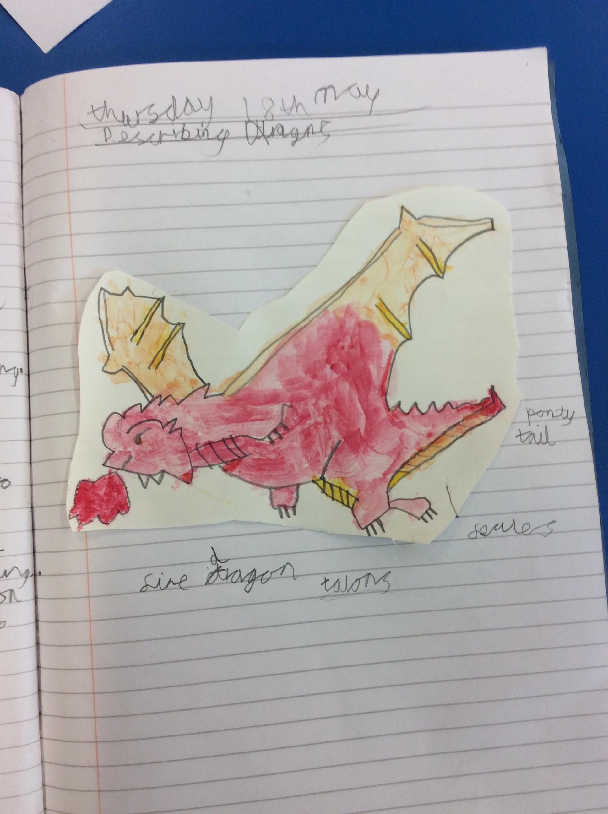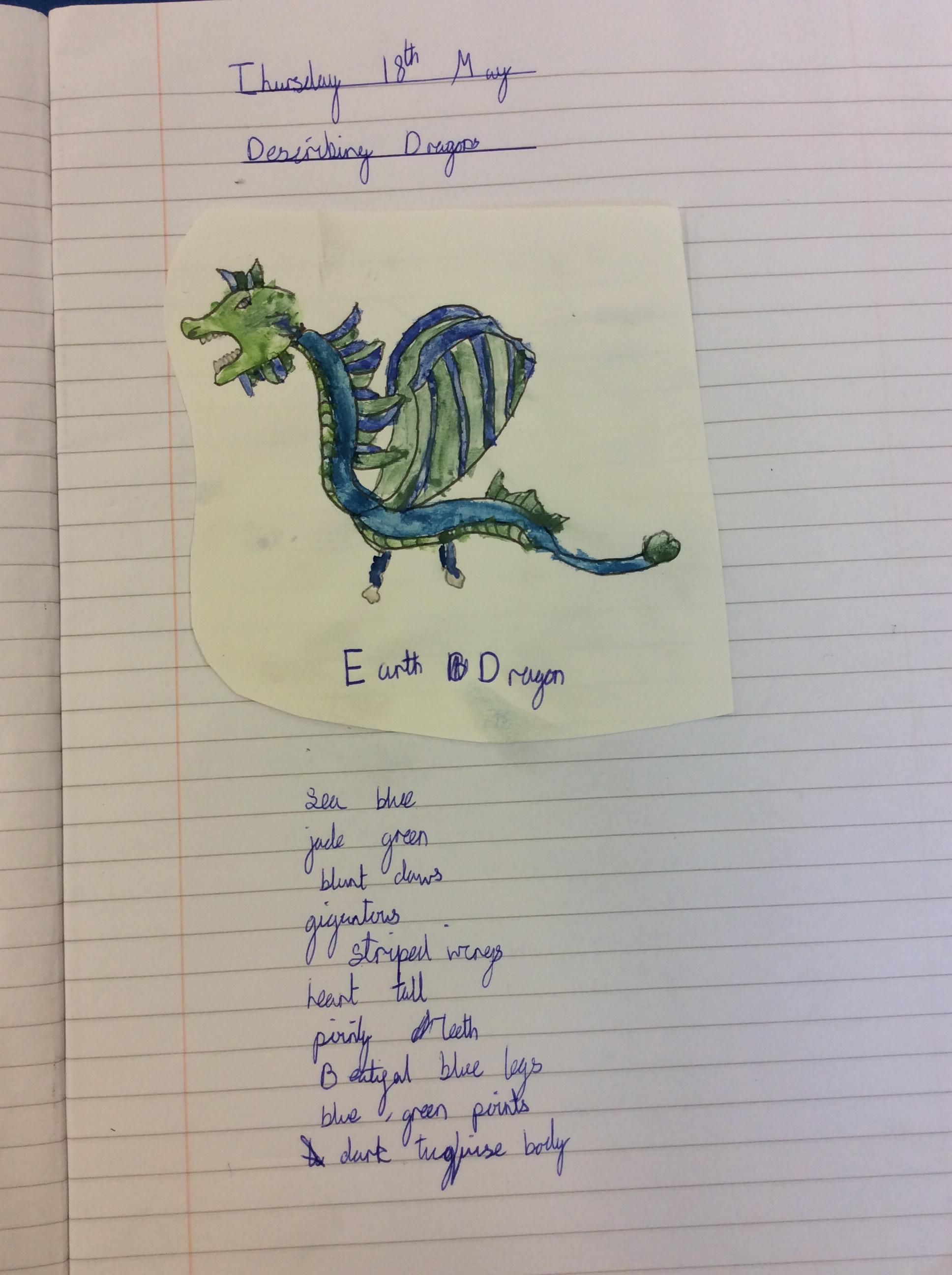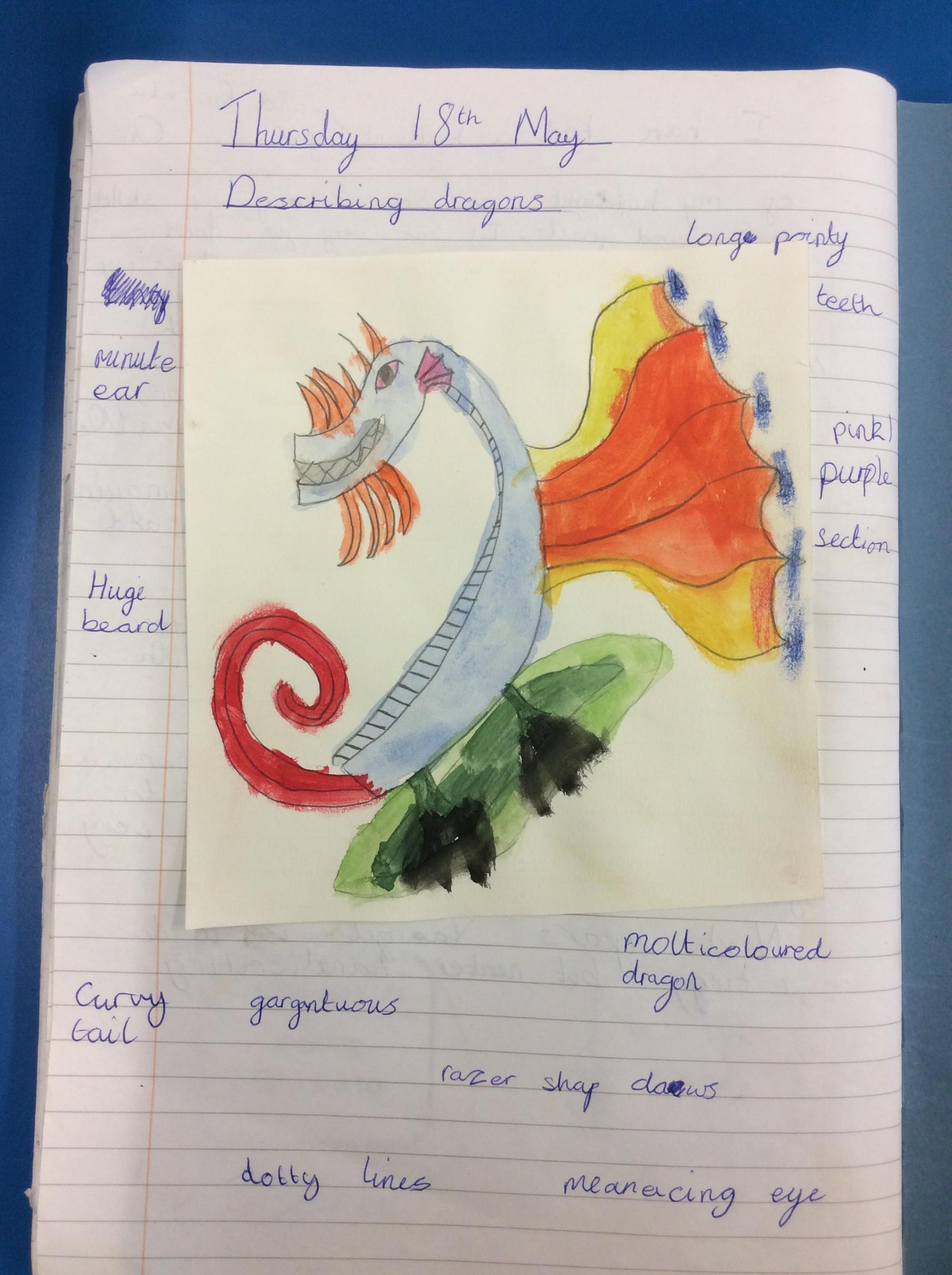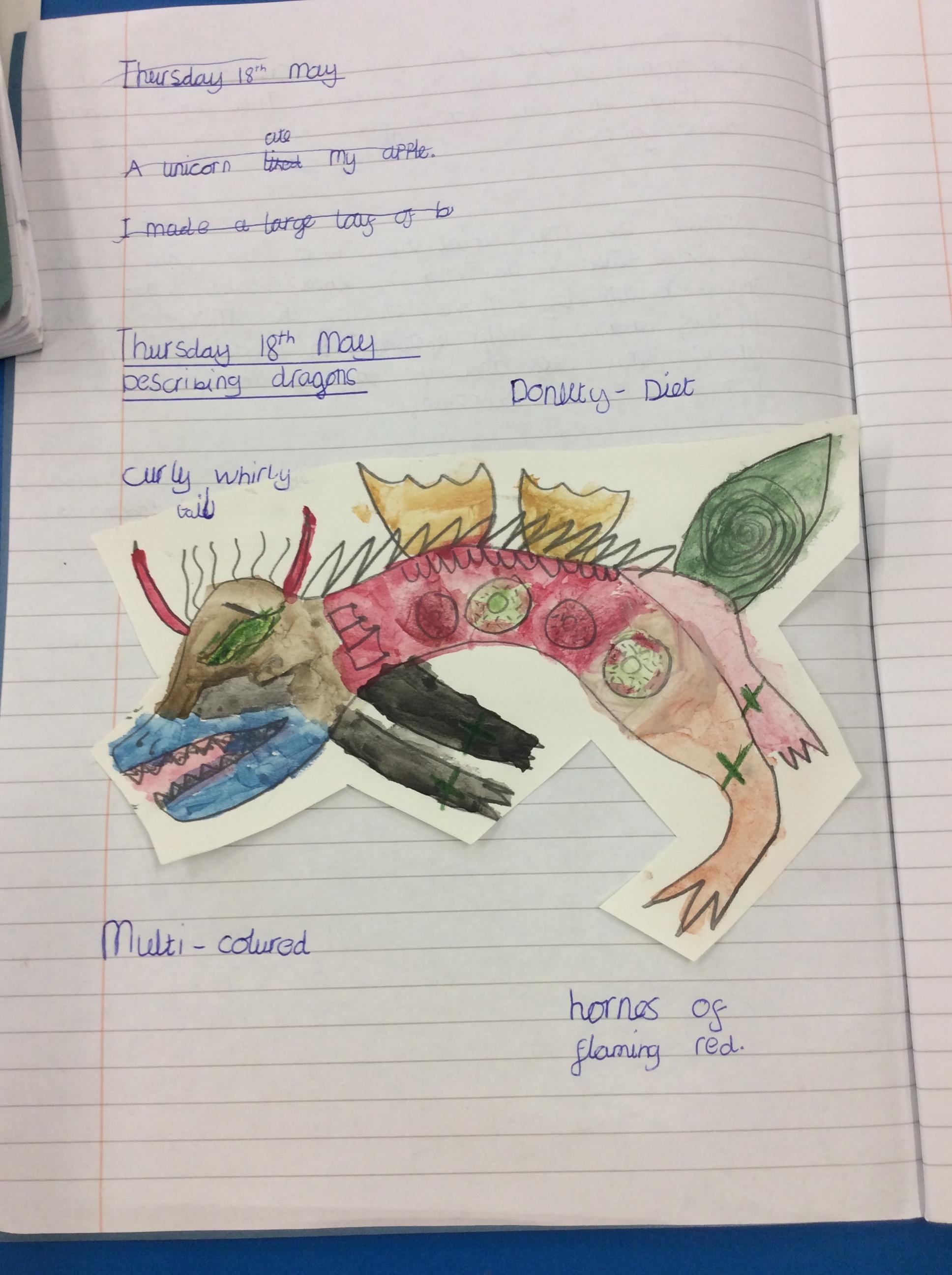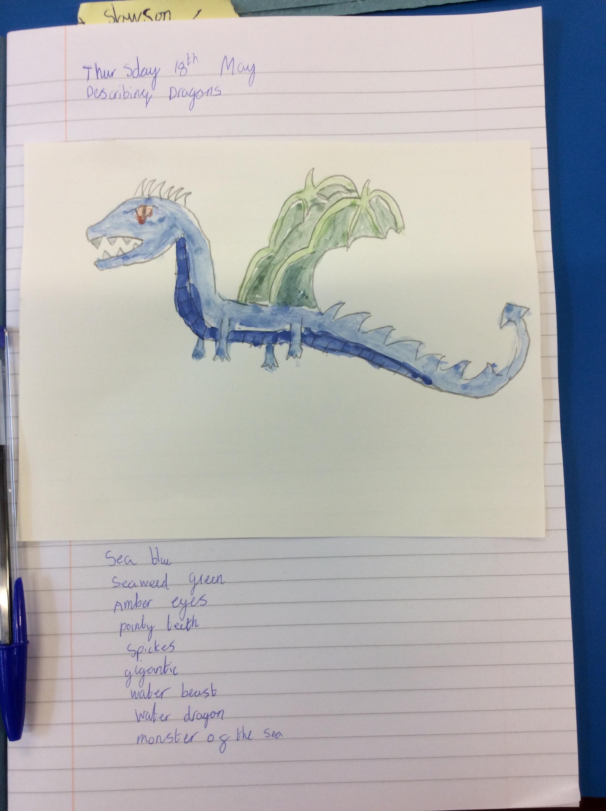 We created our own dragons to write descriptions for.  We used watercolours and coloured pencils to add colour.