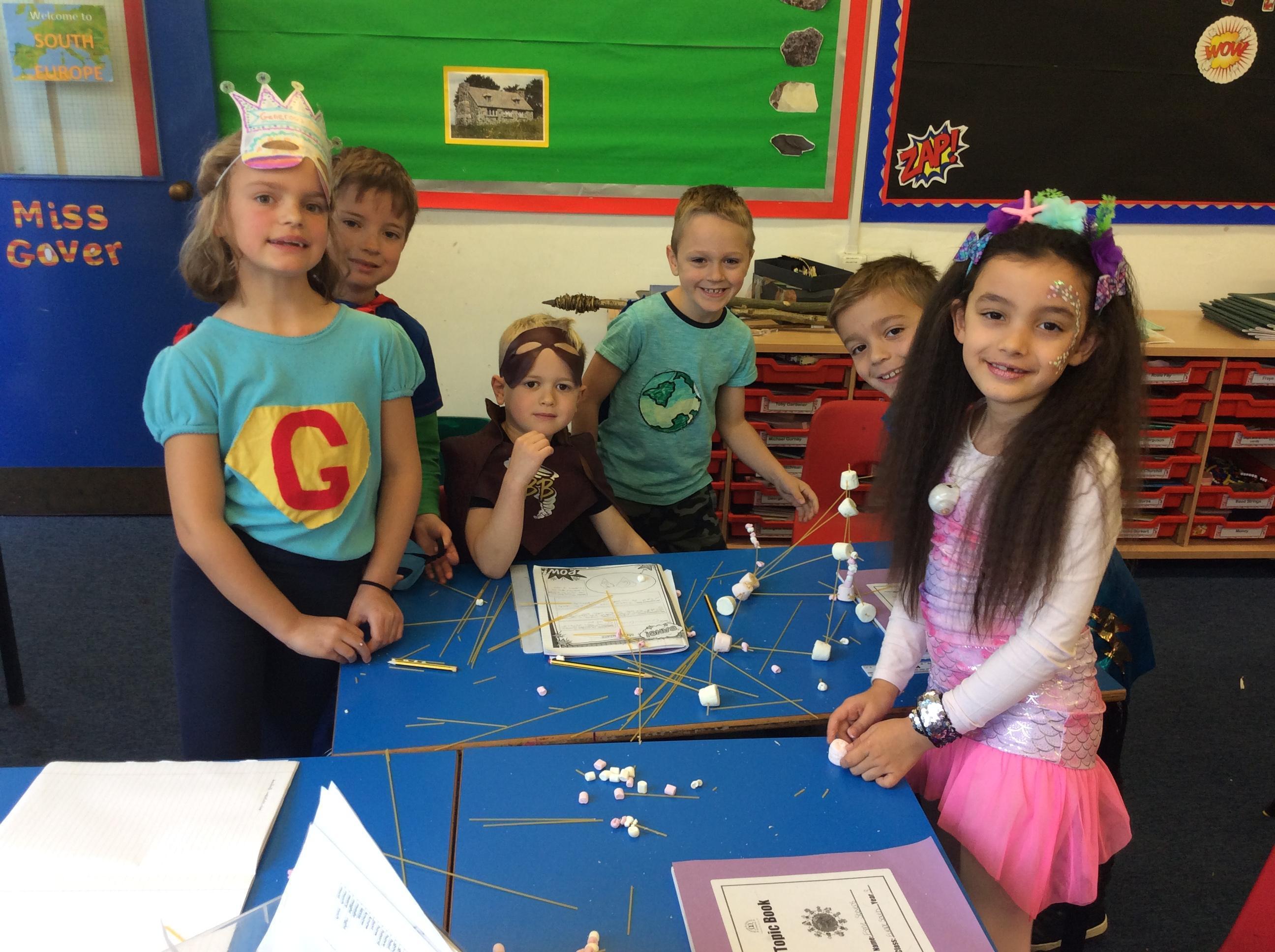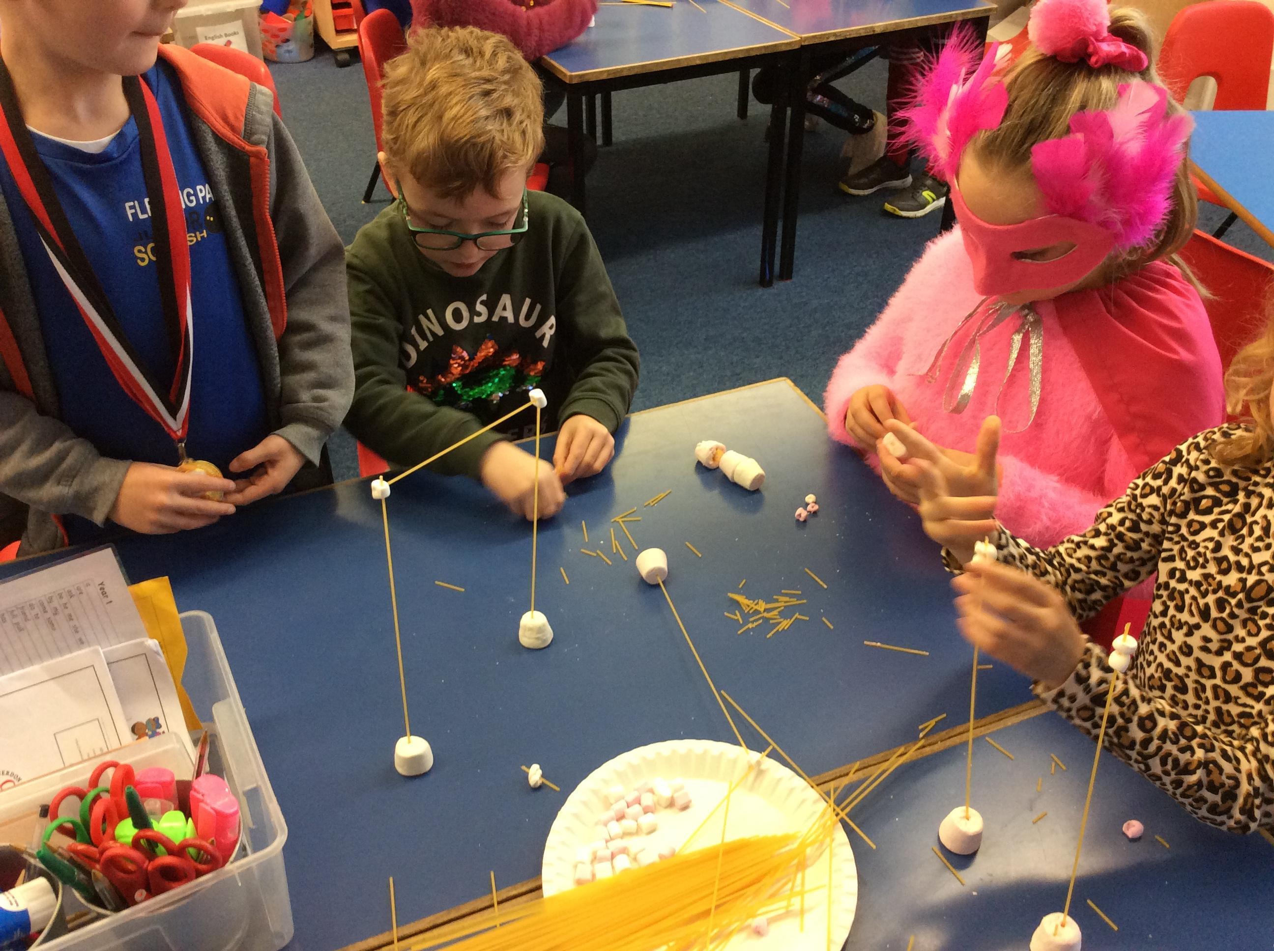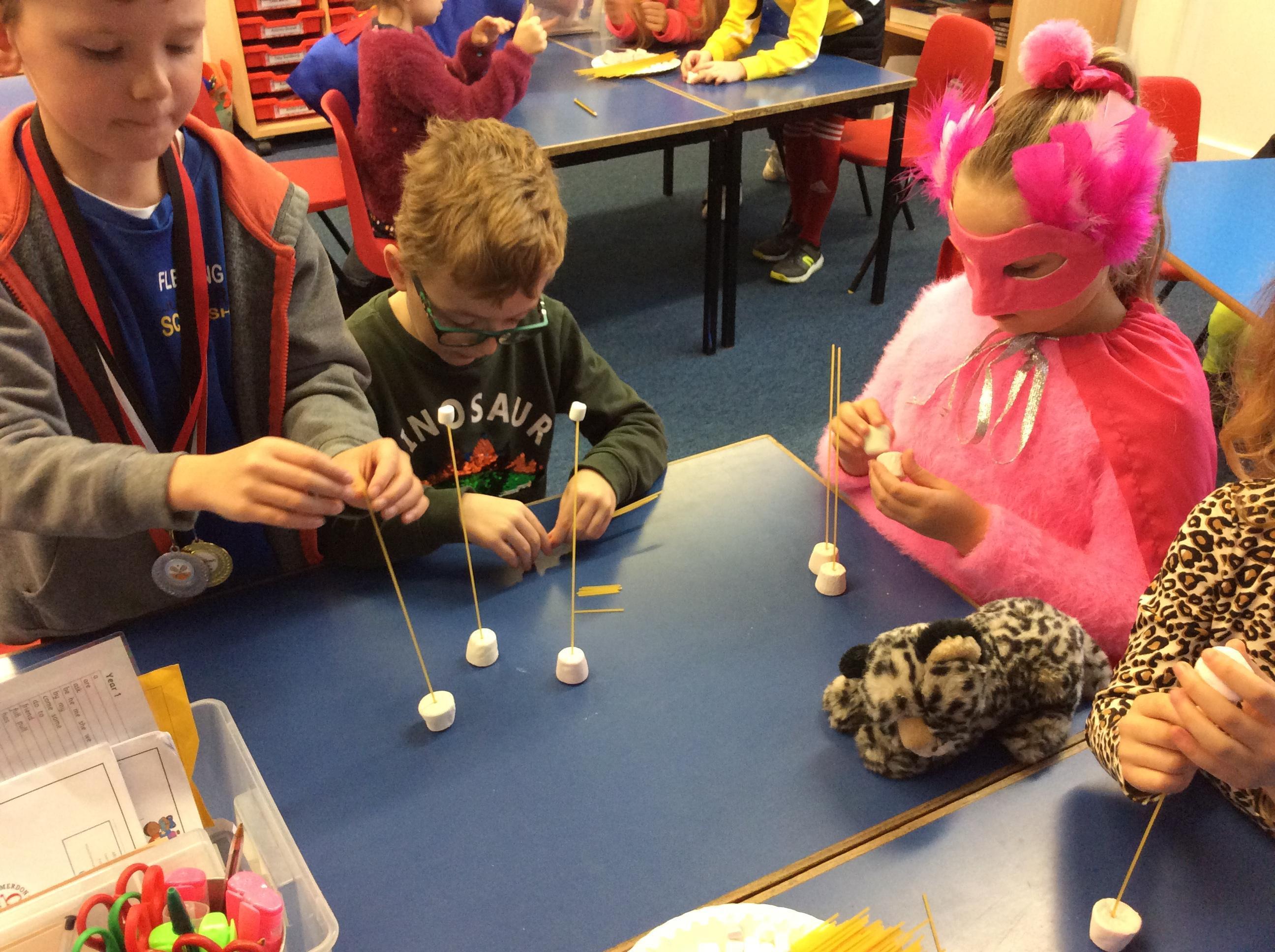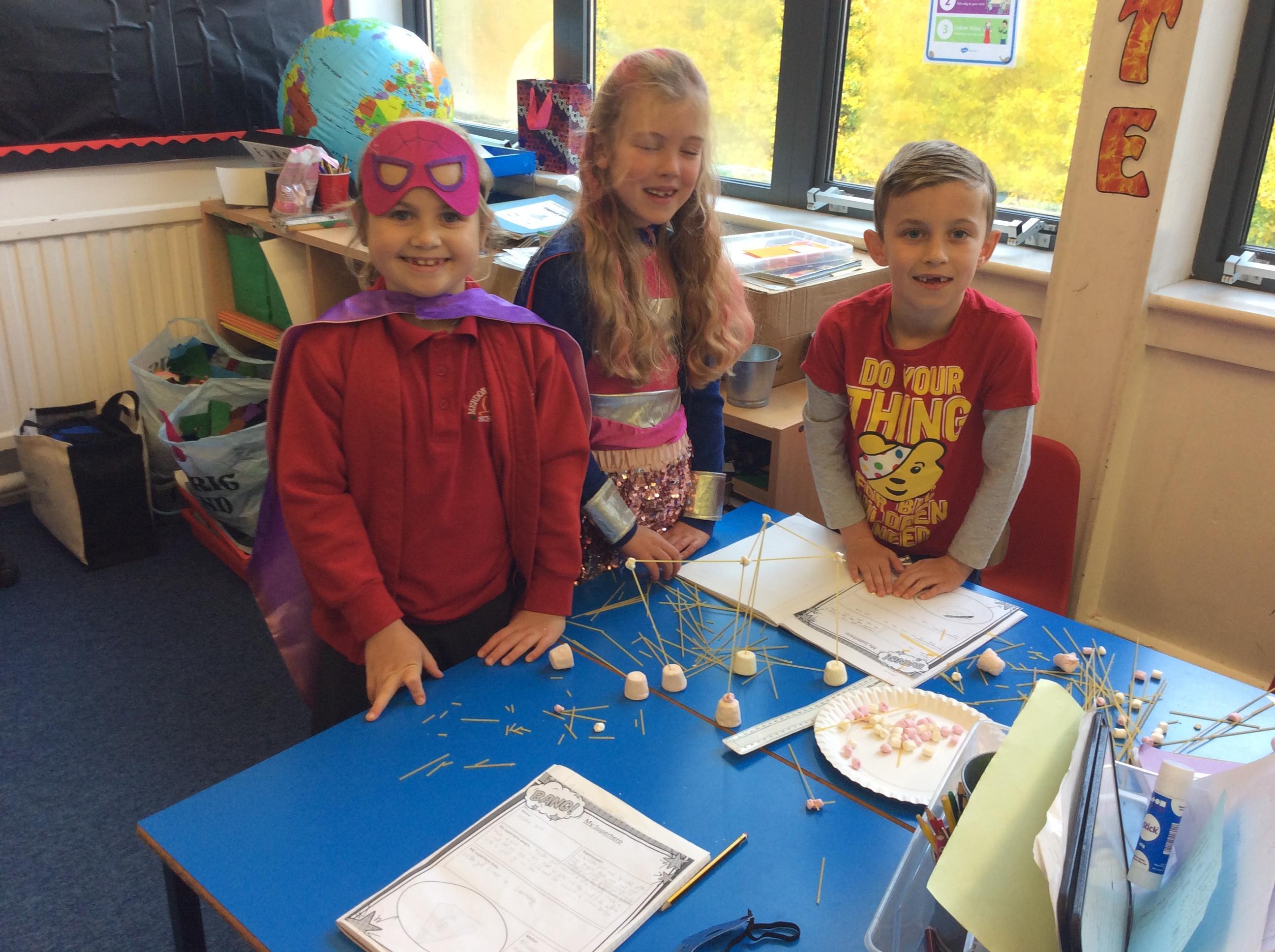 Our day started with creating a profile for our superhero, along with a badge and motto. Next, we had a challenge - we had to work in teams to build a tall tower using only marshmallows and dried spaghetti!