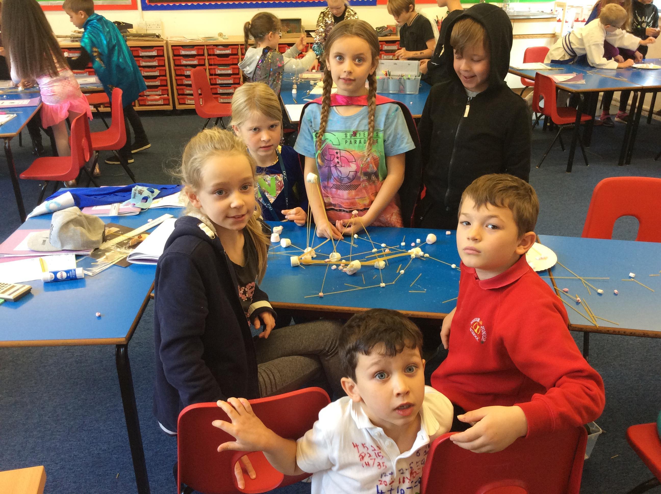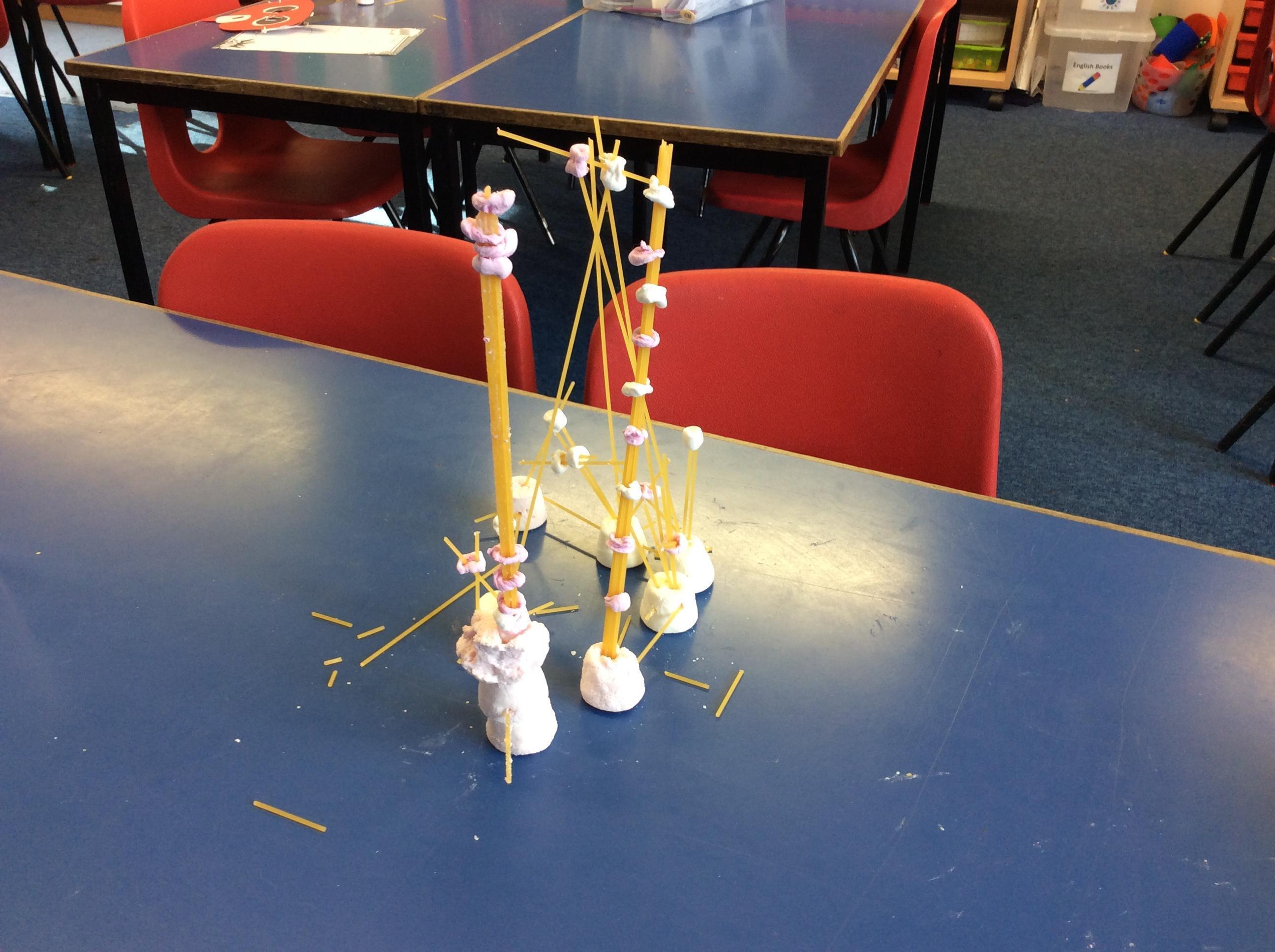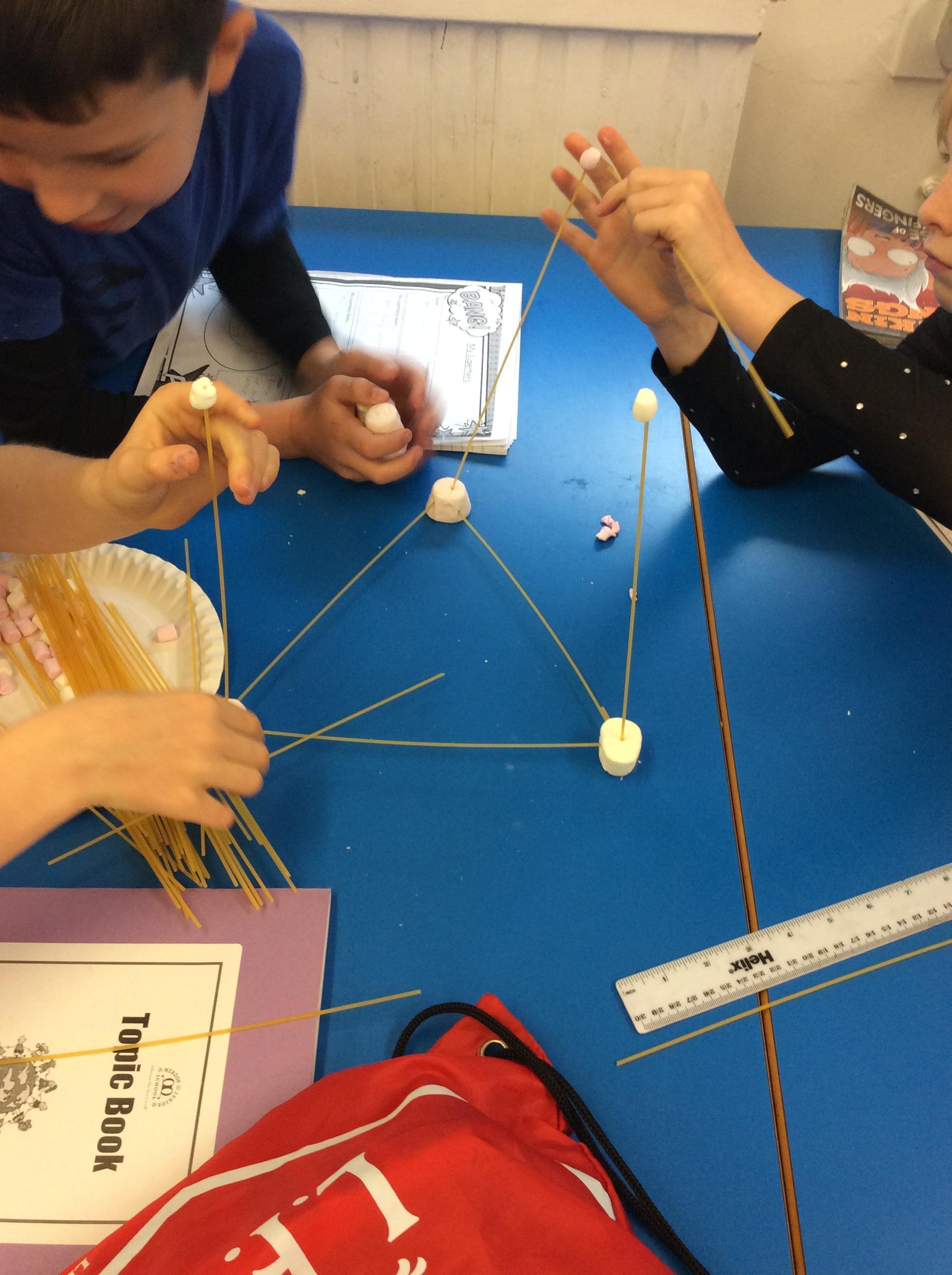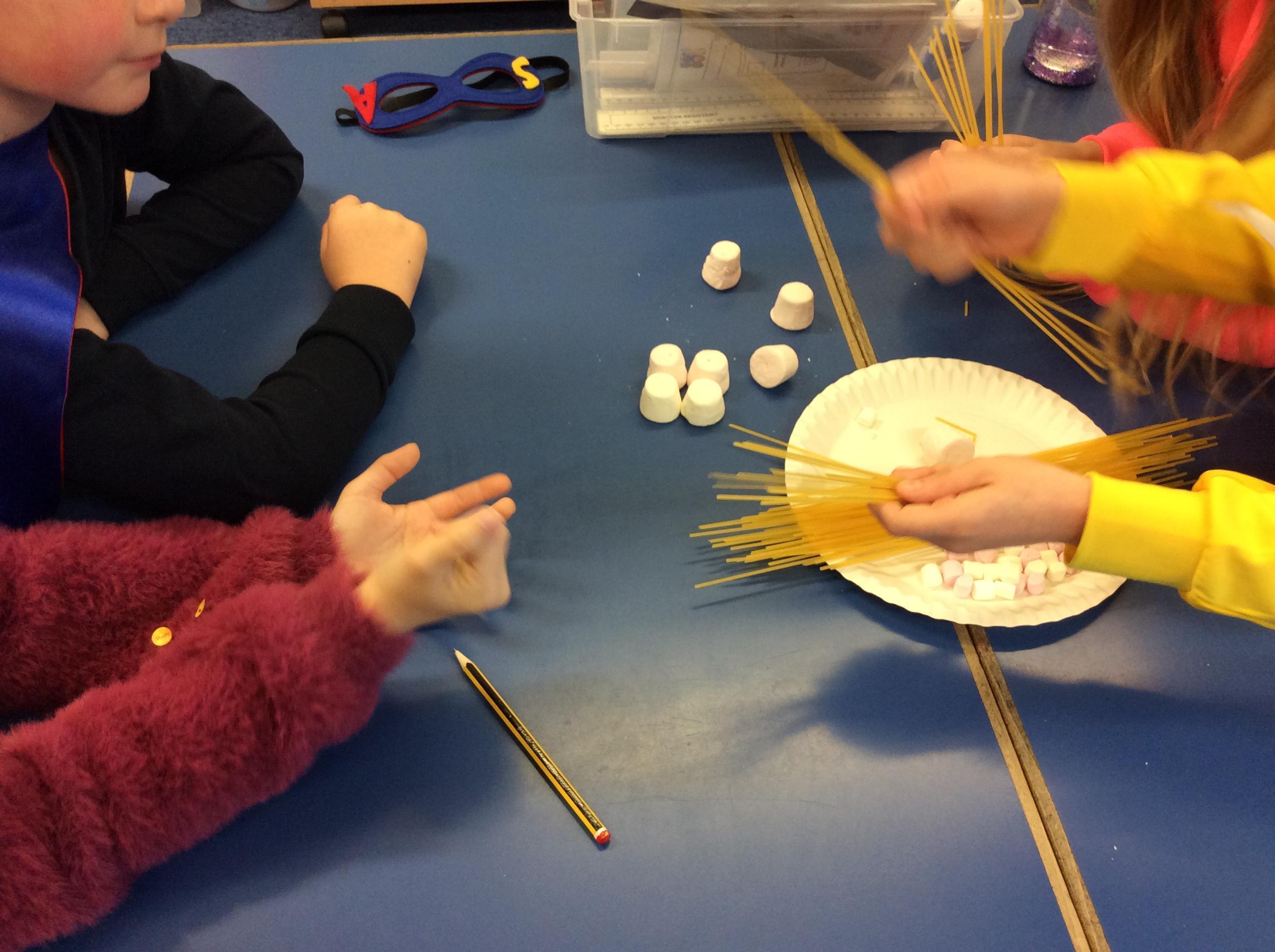Our day started with creating a profile for our superhero, along with a badge and motto. Next, we had a challenge - we had to work in teams to build a tall tower using only marshmallows and dried spaghetti!