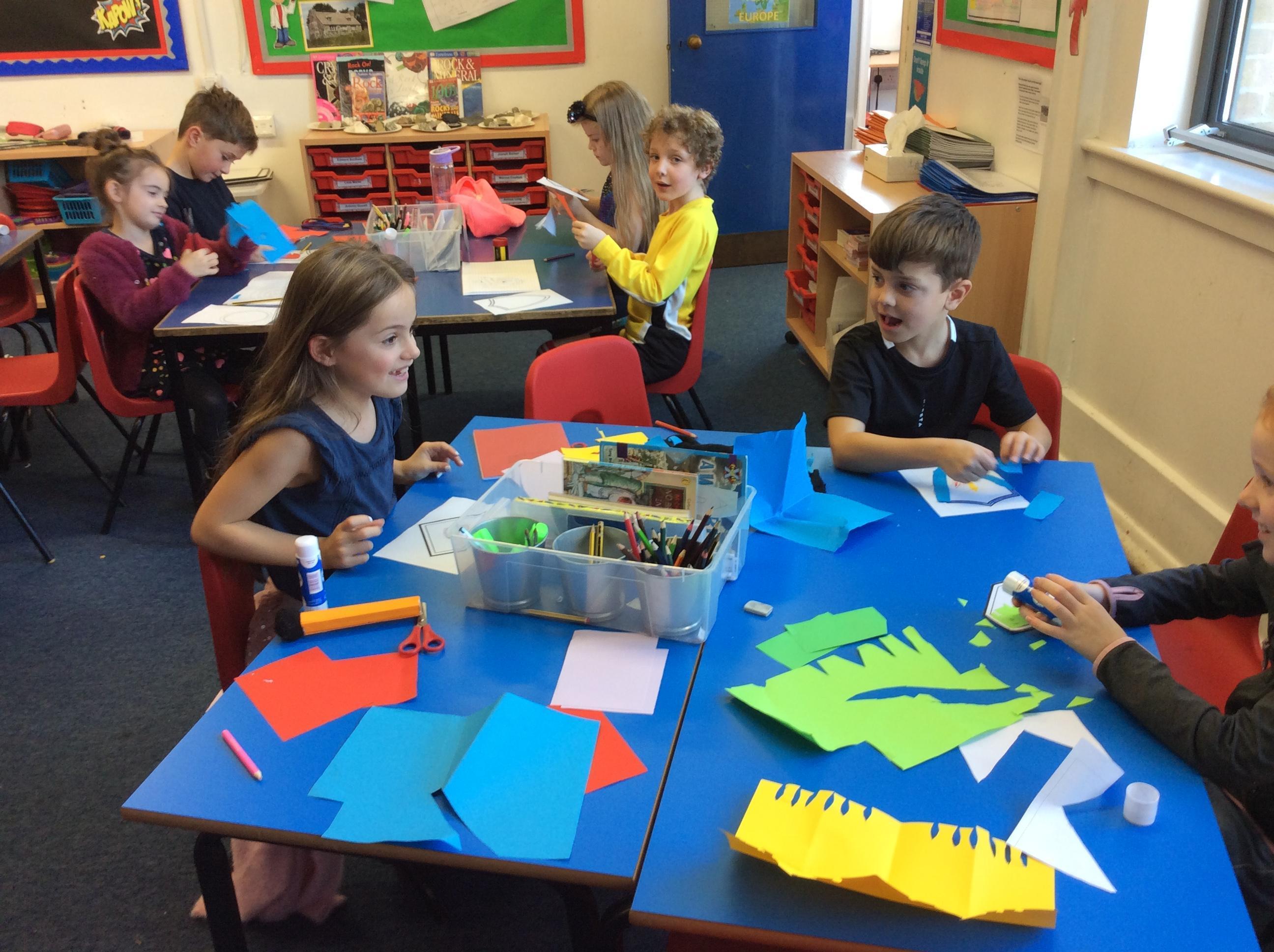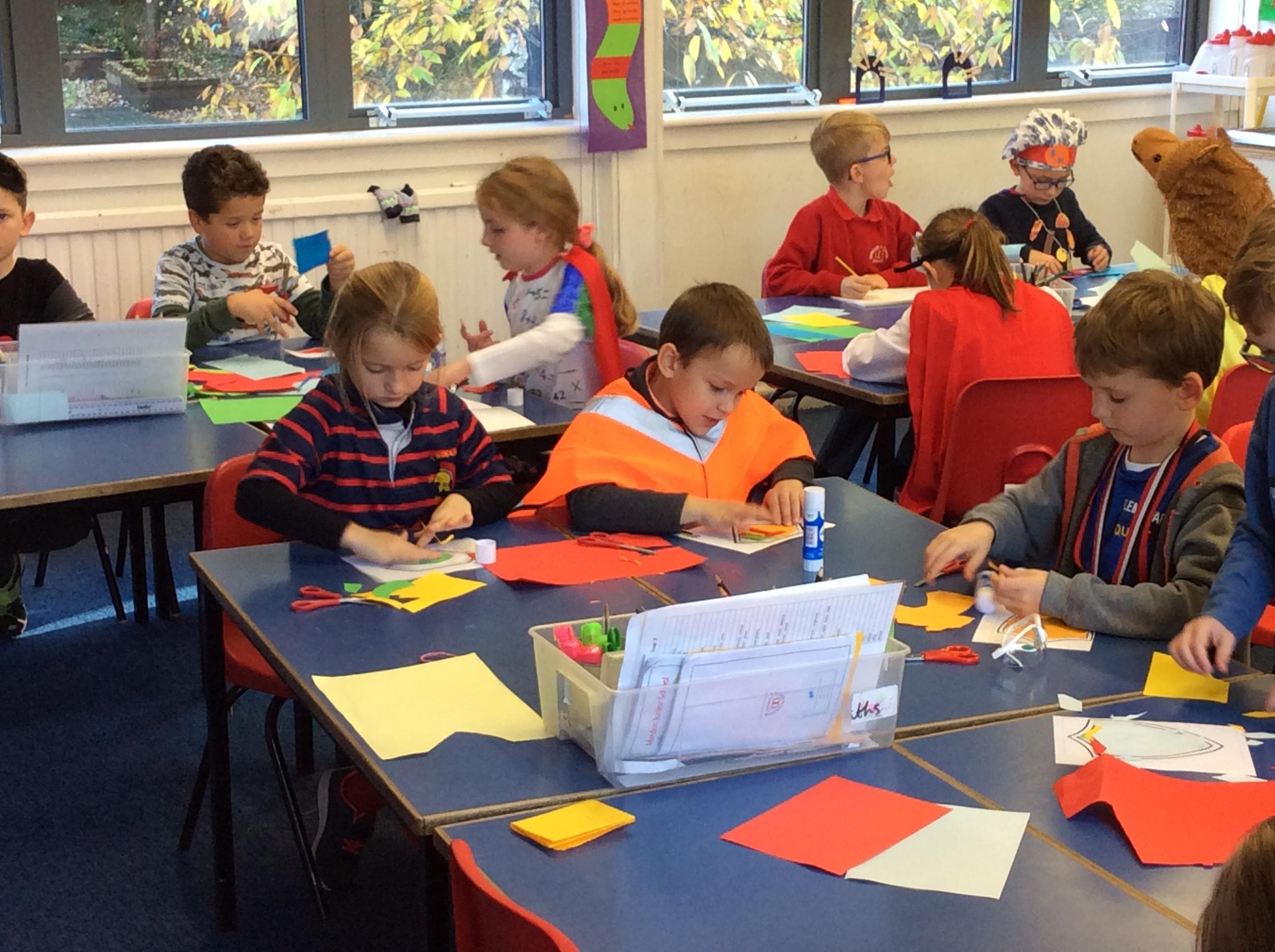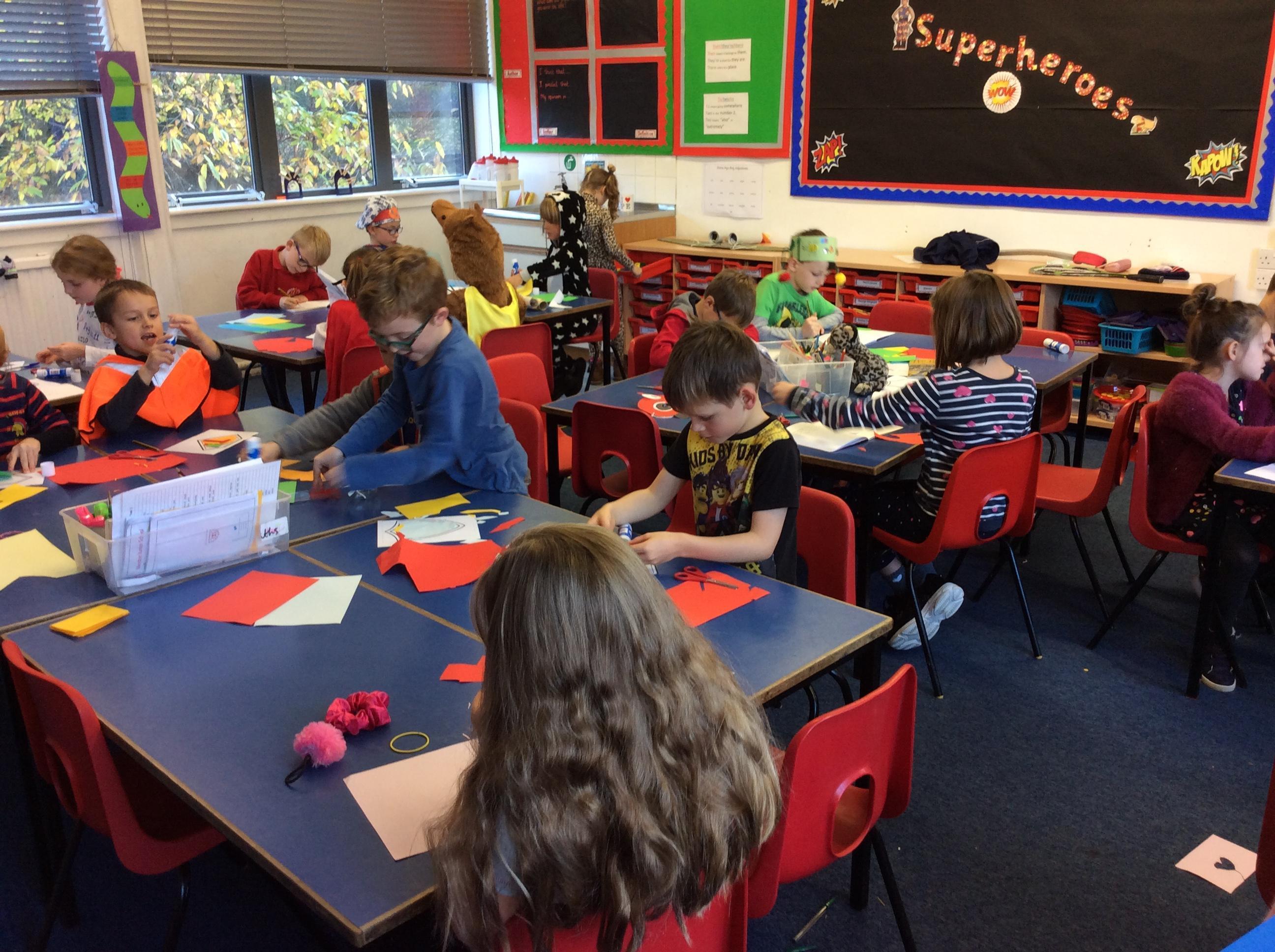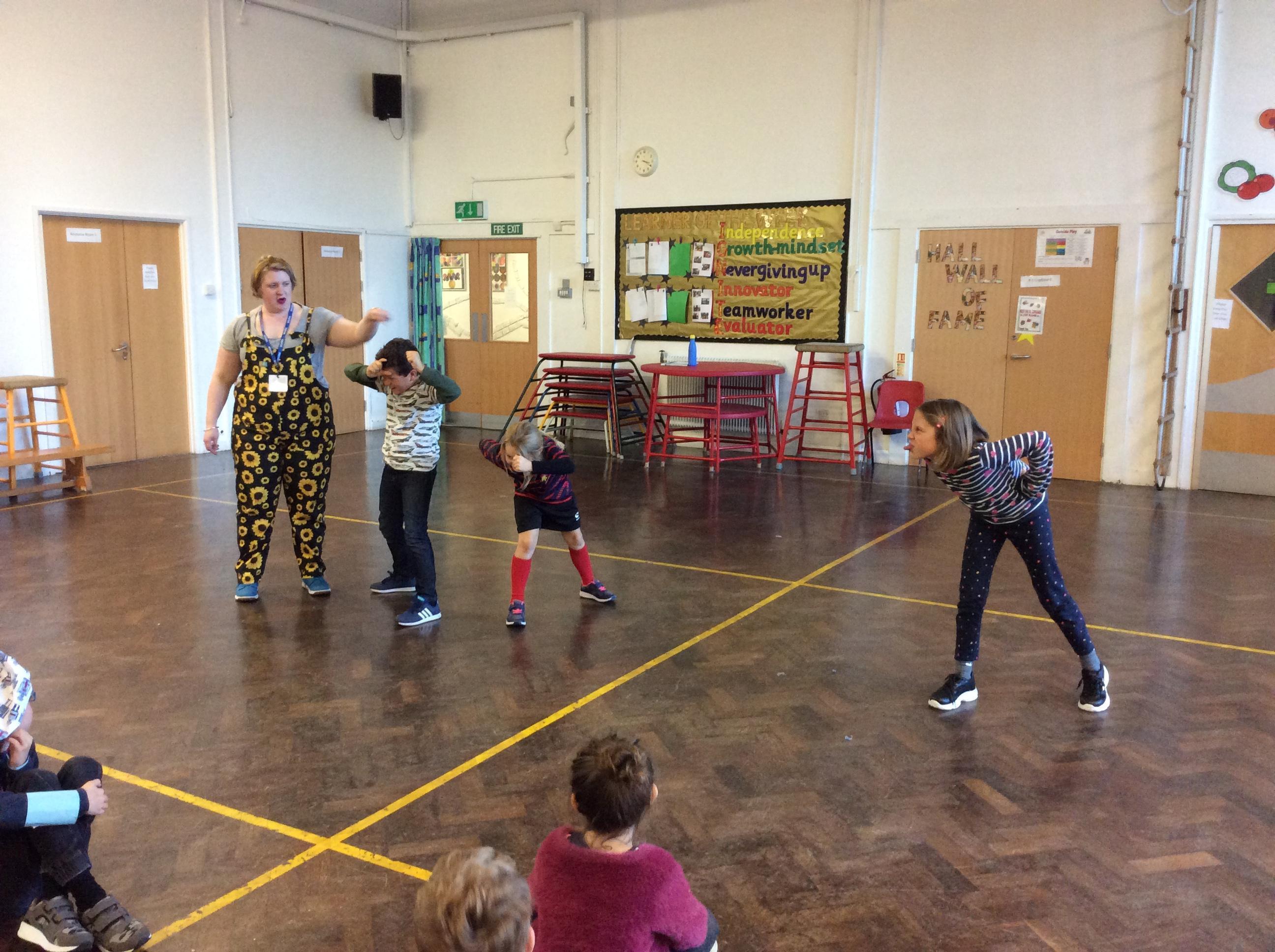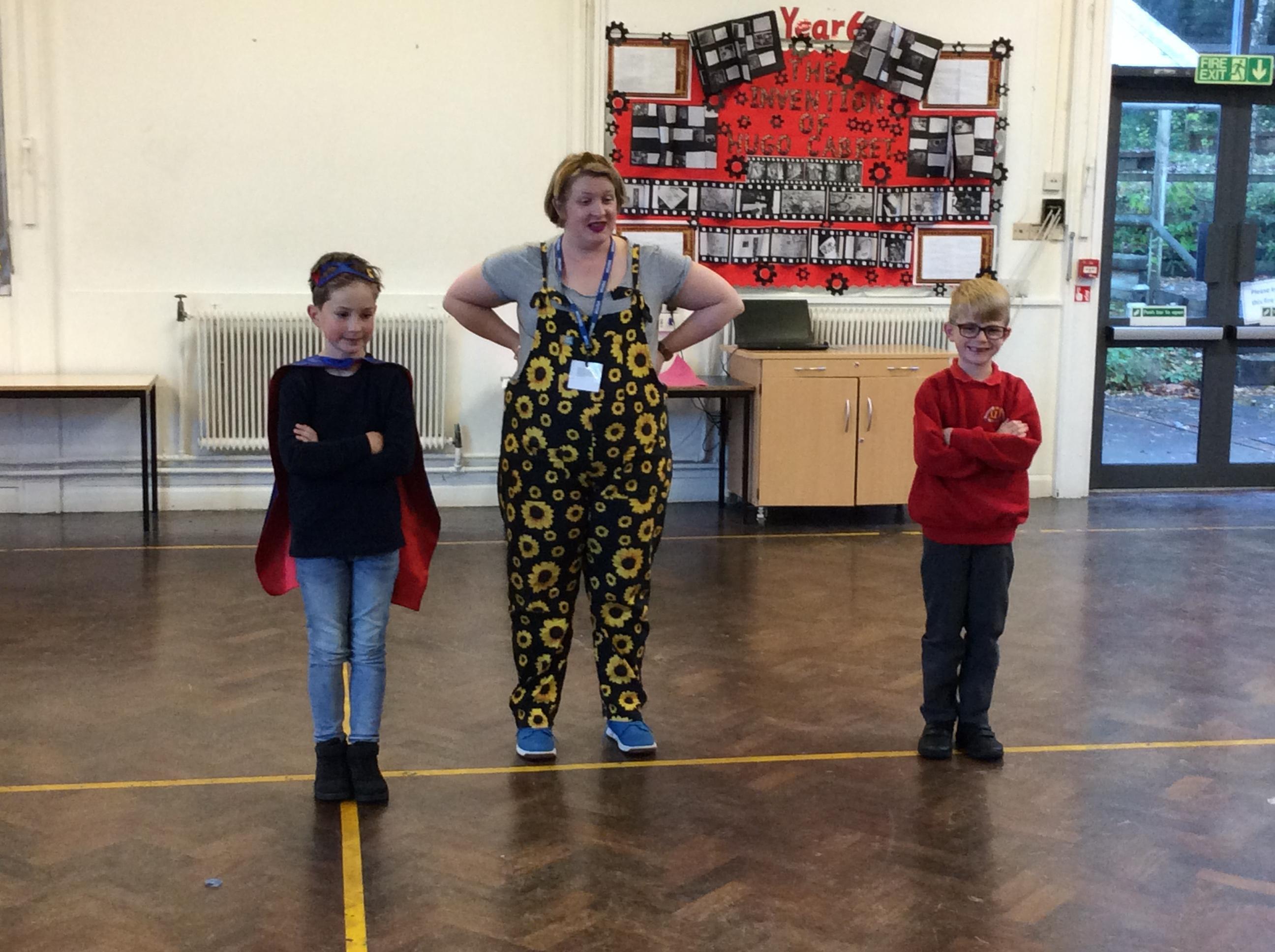 After lunch, we were lucky enough to have Jo to do a workshop with us about exploring physicality. Then, we created our own superhero badge using coloured paper to collage.