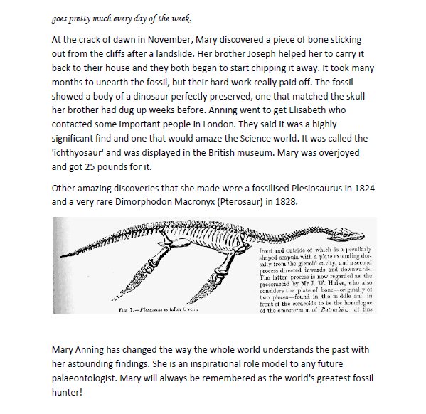 After that Mary was thrilled for what to come next. But in the books that the science men wrote, didn’t mention Mary at all. In those days’ women didn’t have a lot of rights to do things, so they basically forgot about her. But after a few years women’s rights got better and they here able to do more things. So, they added her to their books and now she’s known for fining one of the first major fossils.