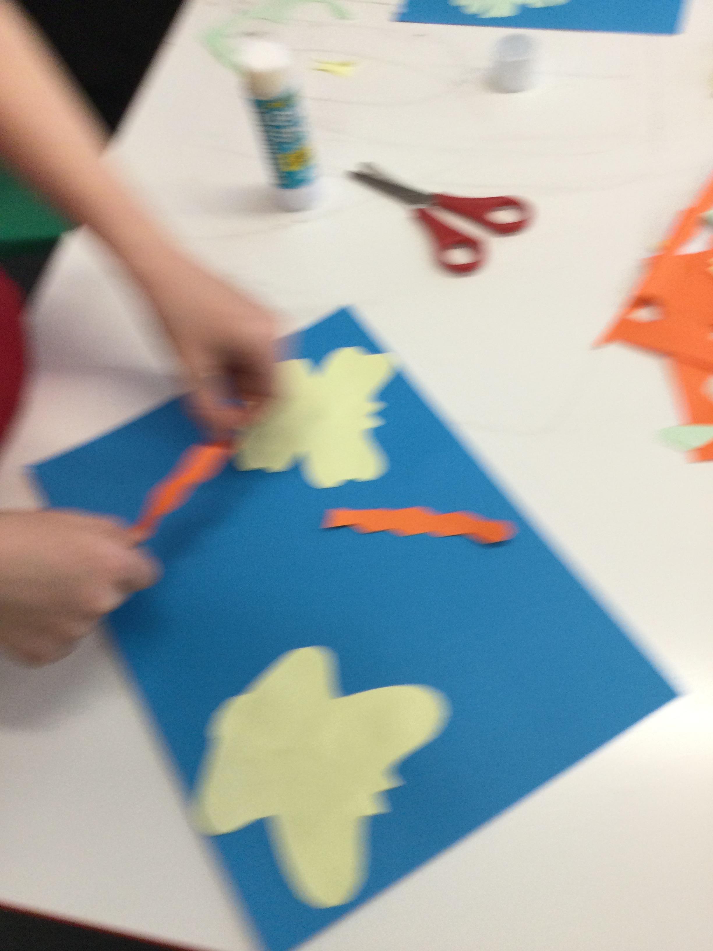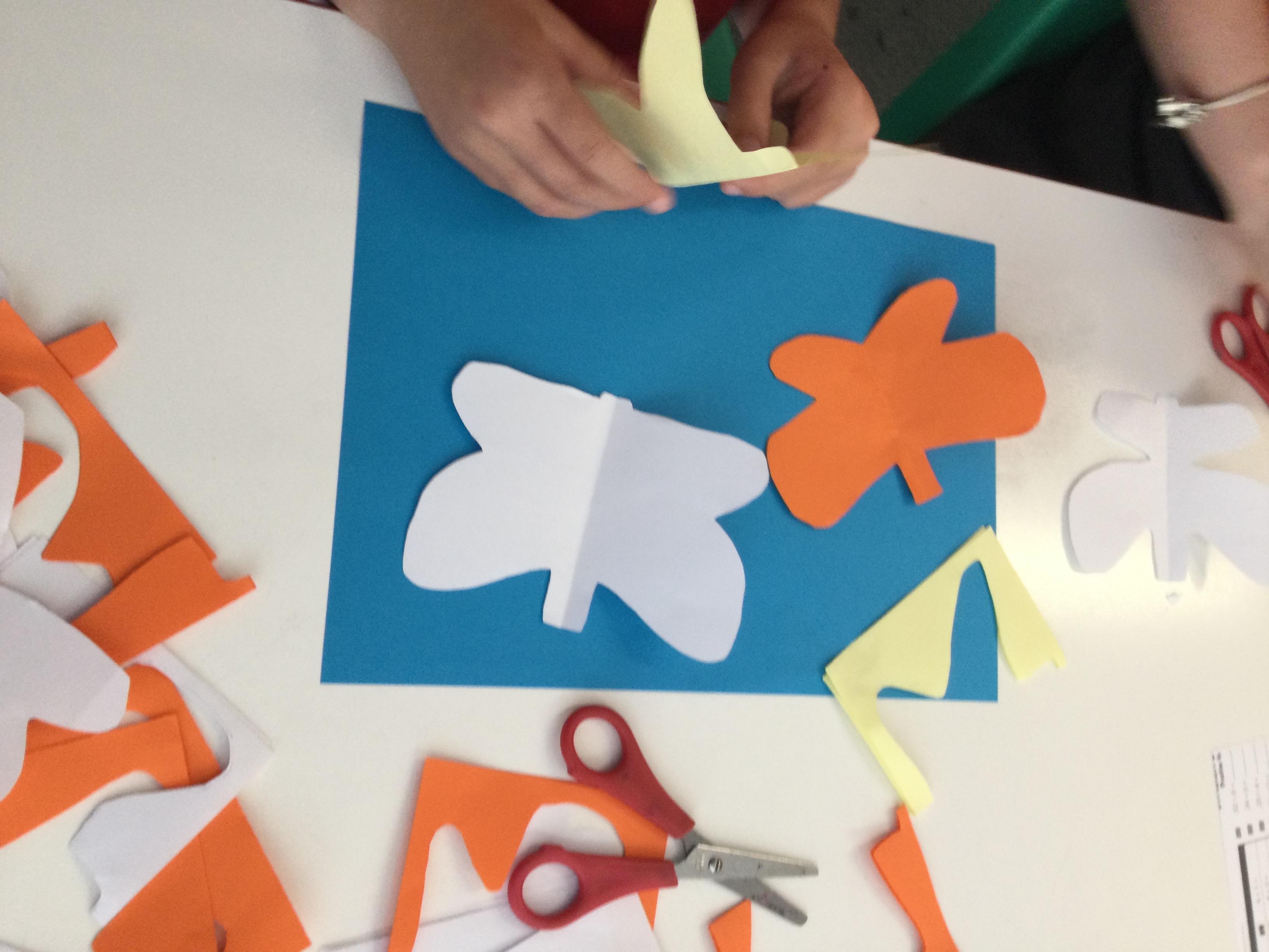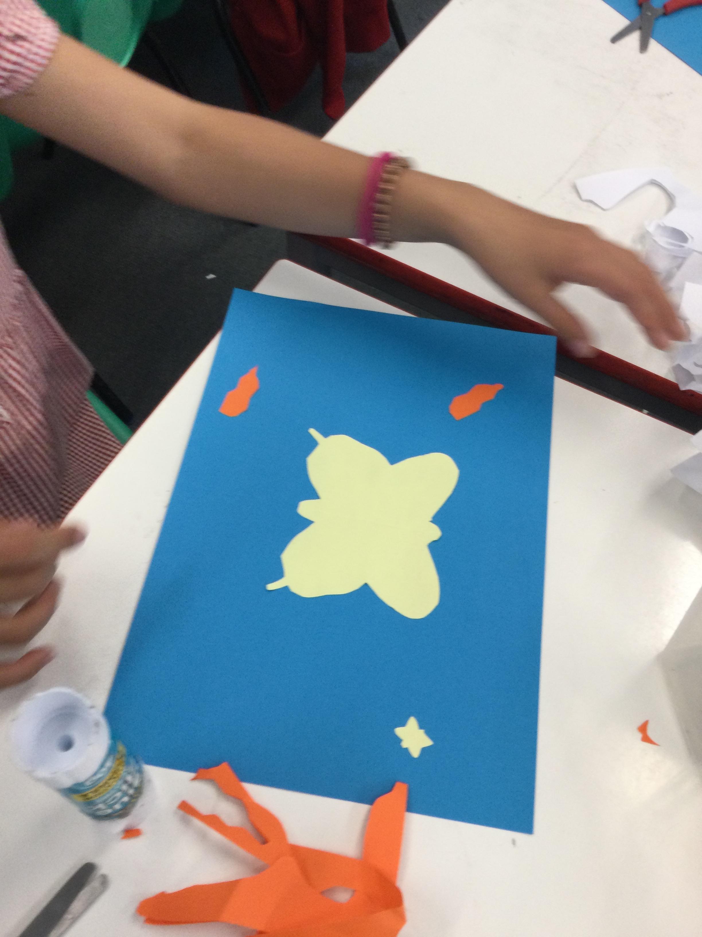 The children then made butterflies that they added to a collaborative pieces of art to display outside the classroom . They use cutting And collaging skills to make their beautiful butterflies.