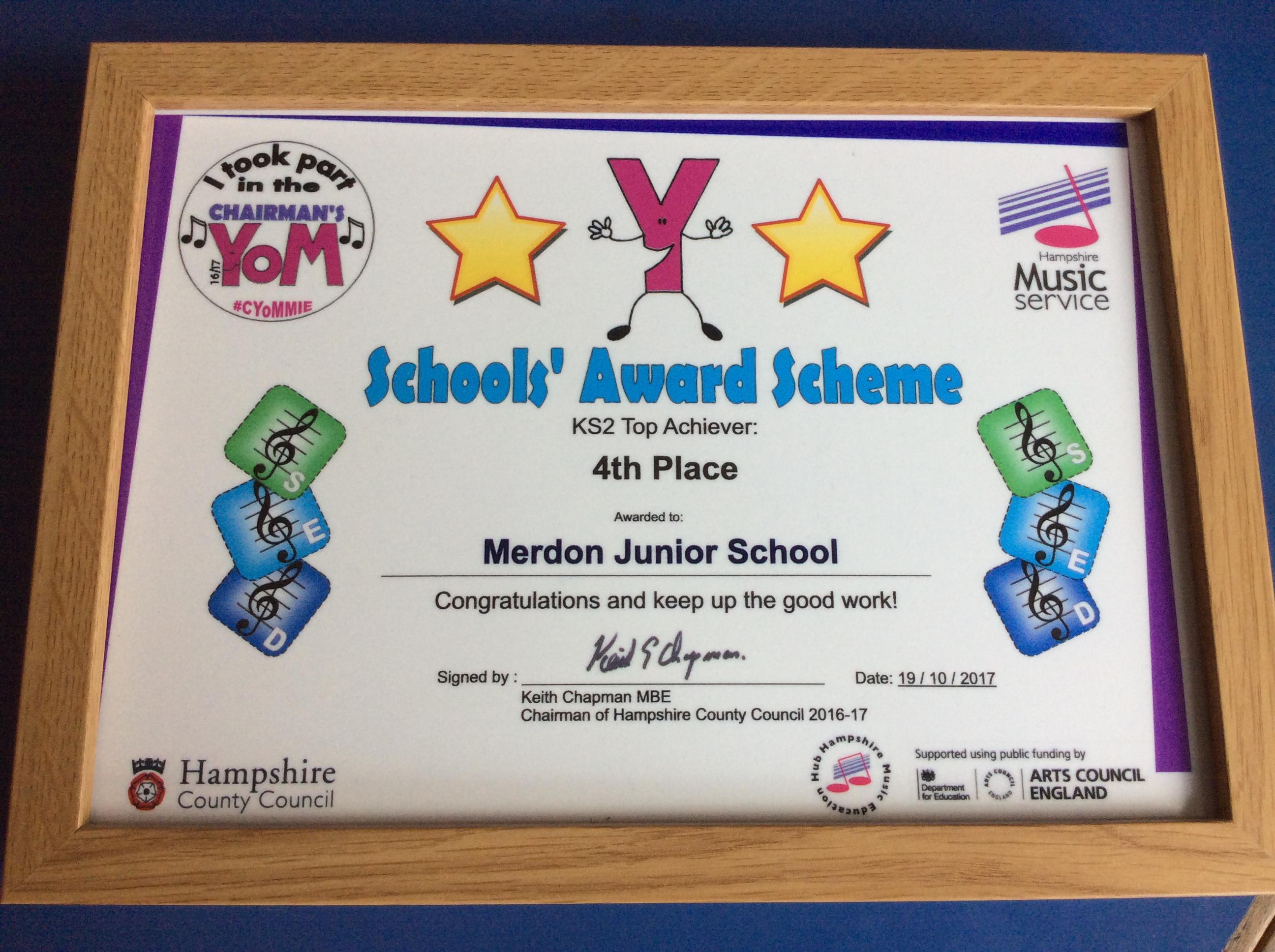 During this year, along with many other Hampshire schools, we logged all our usual musical activities, from singing assemblies, to instrumental lessons to performances, term by term. At the end of the year, we were thrilled to be presented with a special award of 4th place in the Key Stage 2 entries, for musical participation and activities!