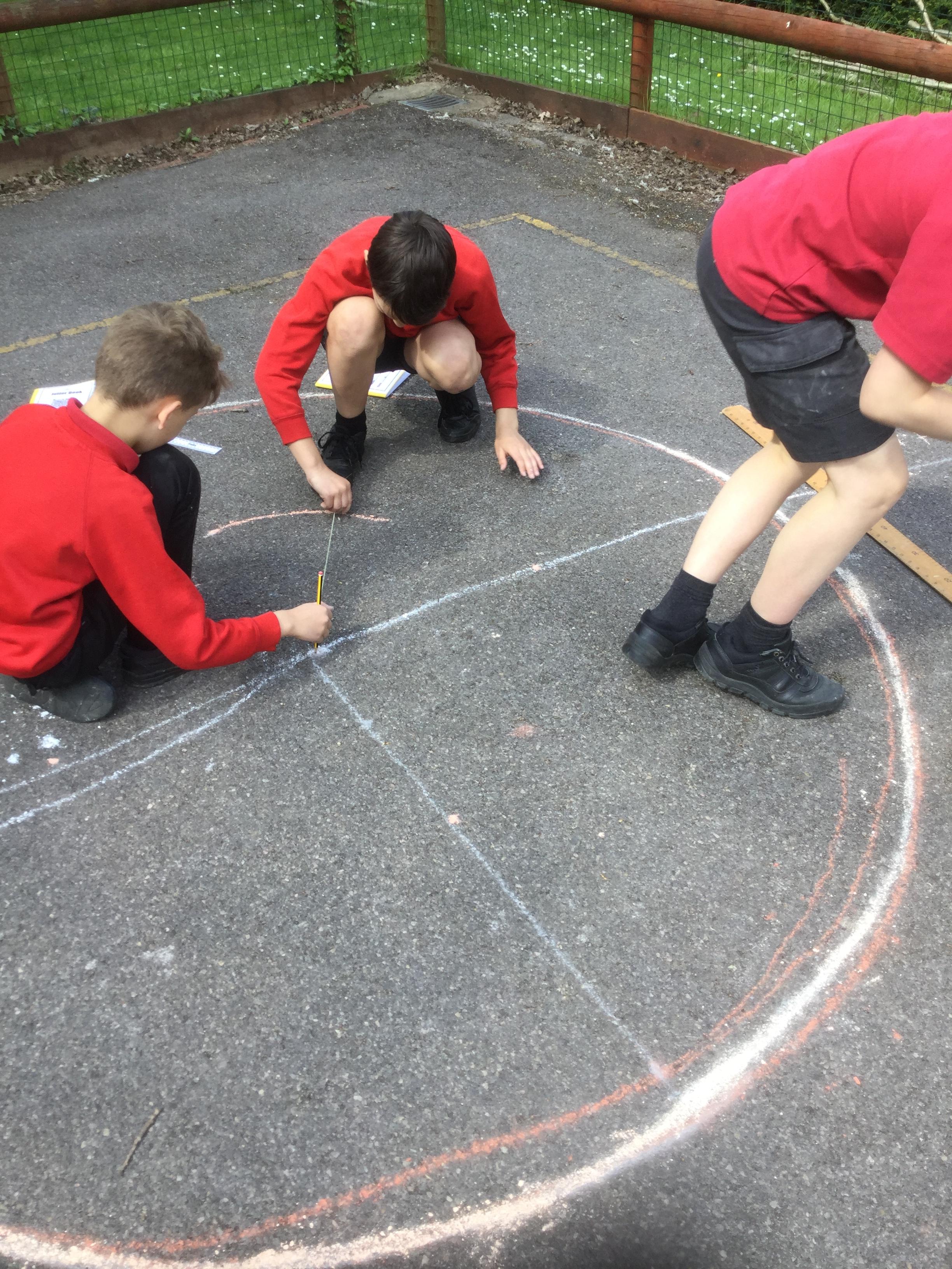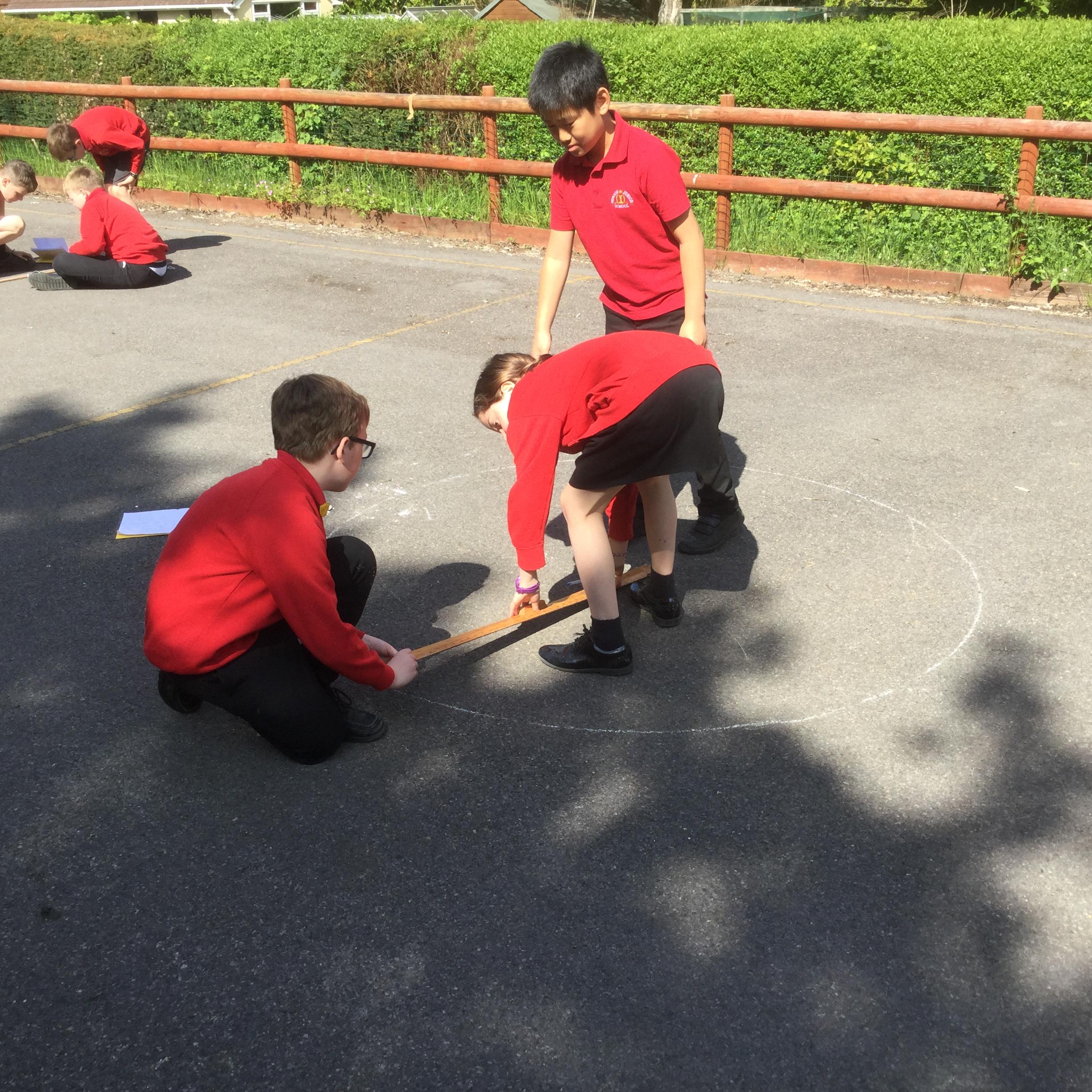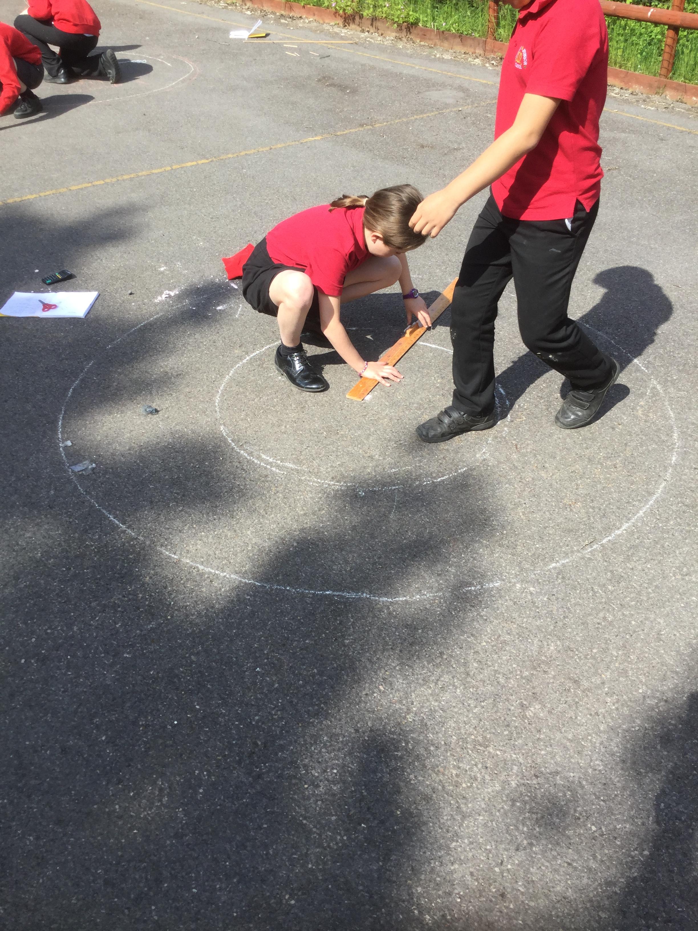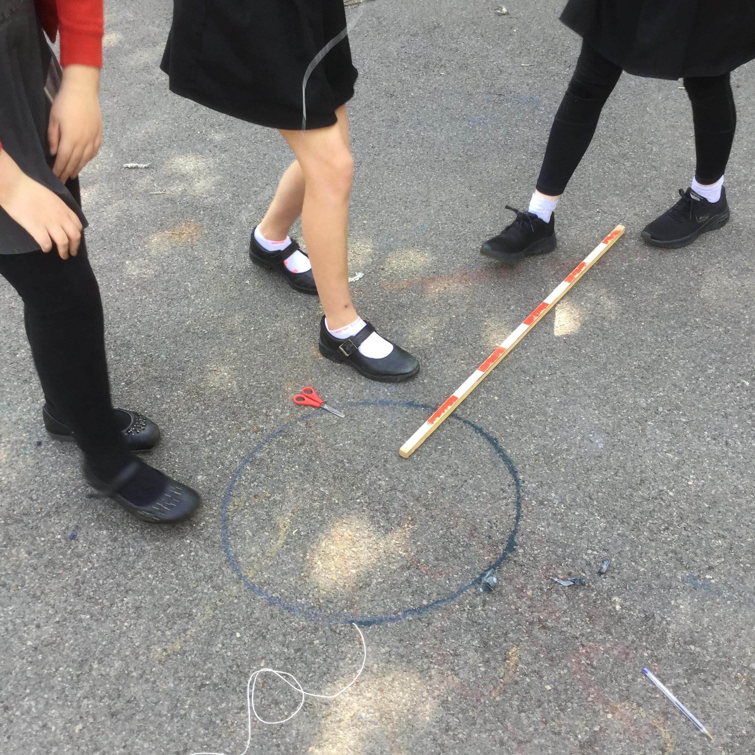 We were asked to accurately draw circles on the playground with a variety of radii. We had to think about how we may do this in terms of strategy, equipment and measurement. We were also told that we would be to find a way of measuring the circumference of the different circles to see if we could find a relationship between radius, diameter and circumference of circles.