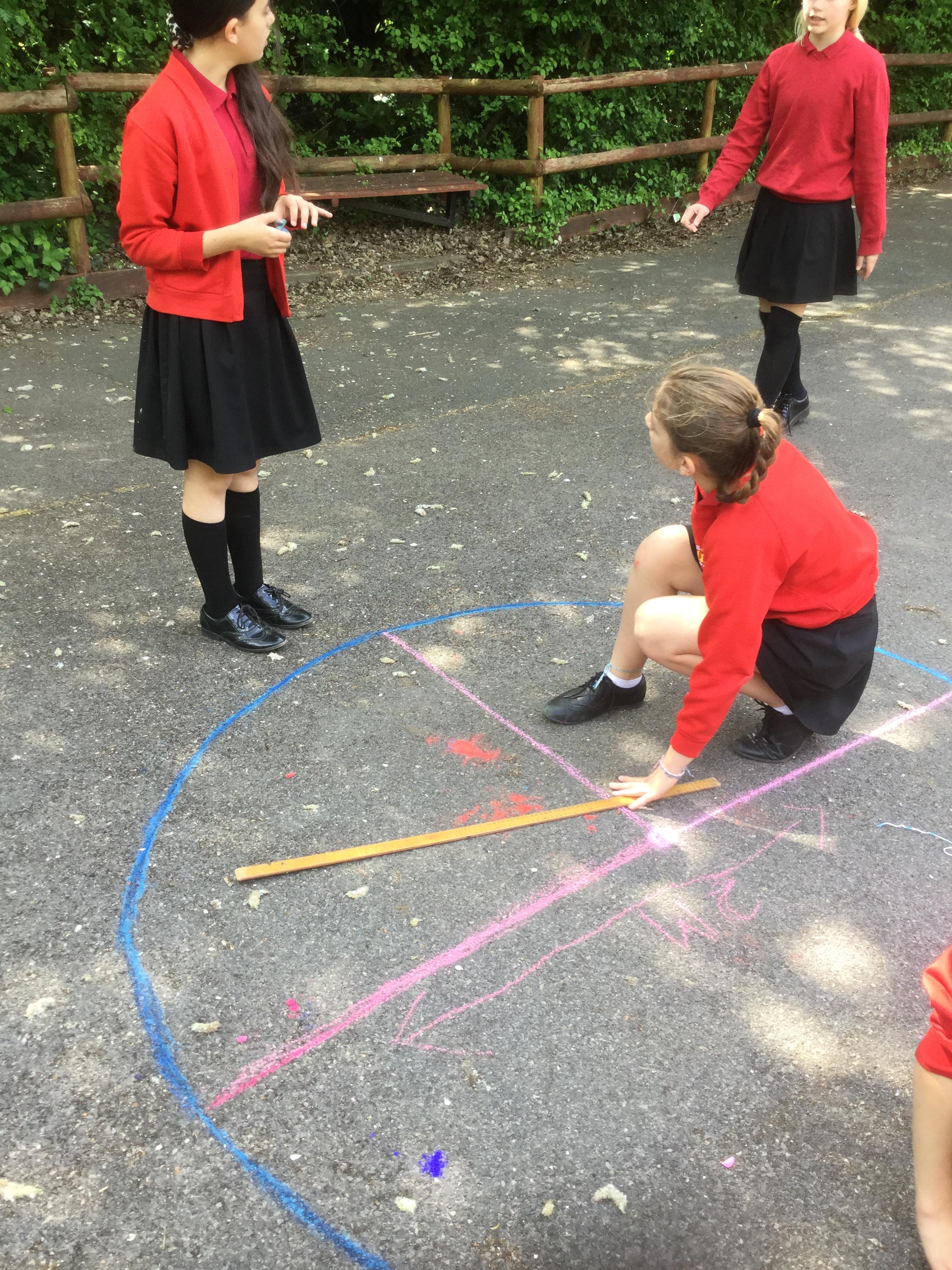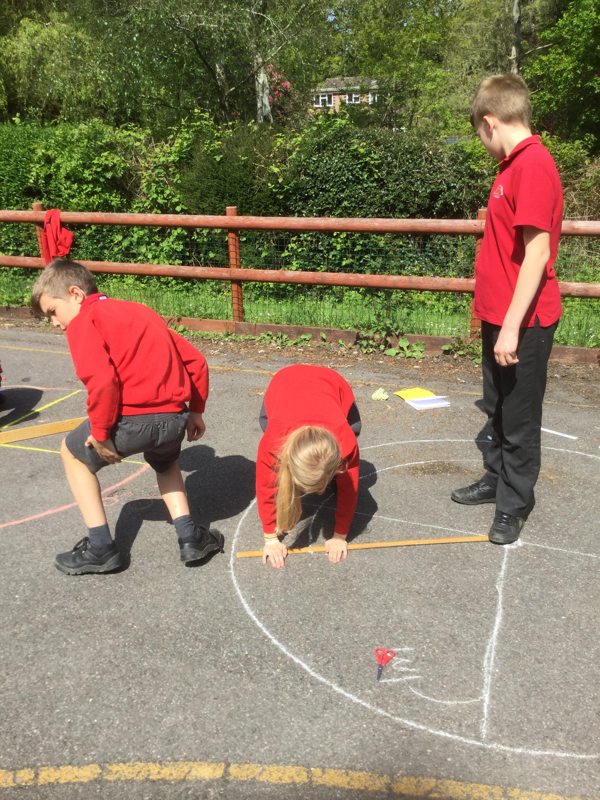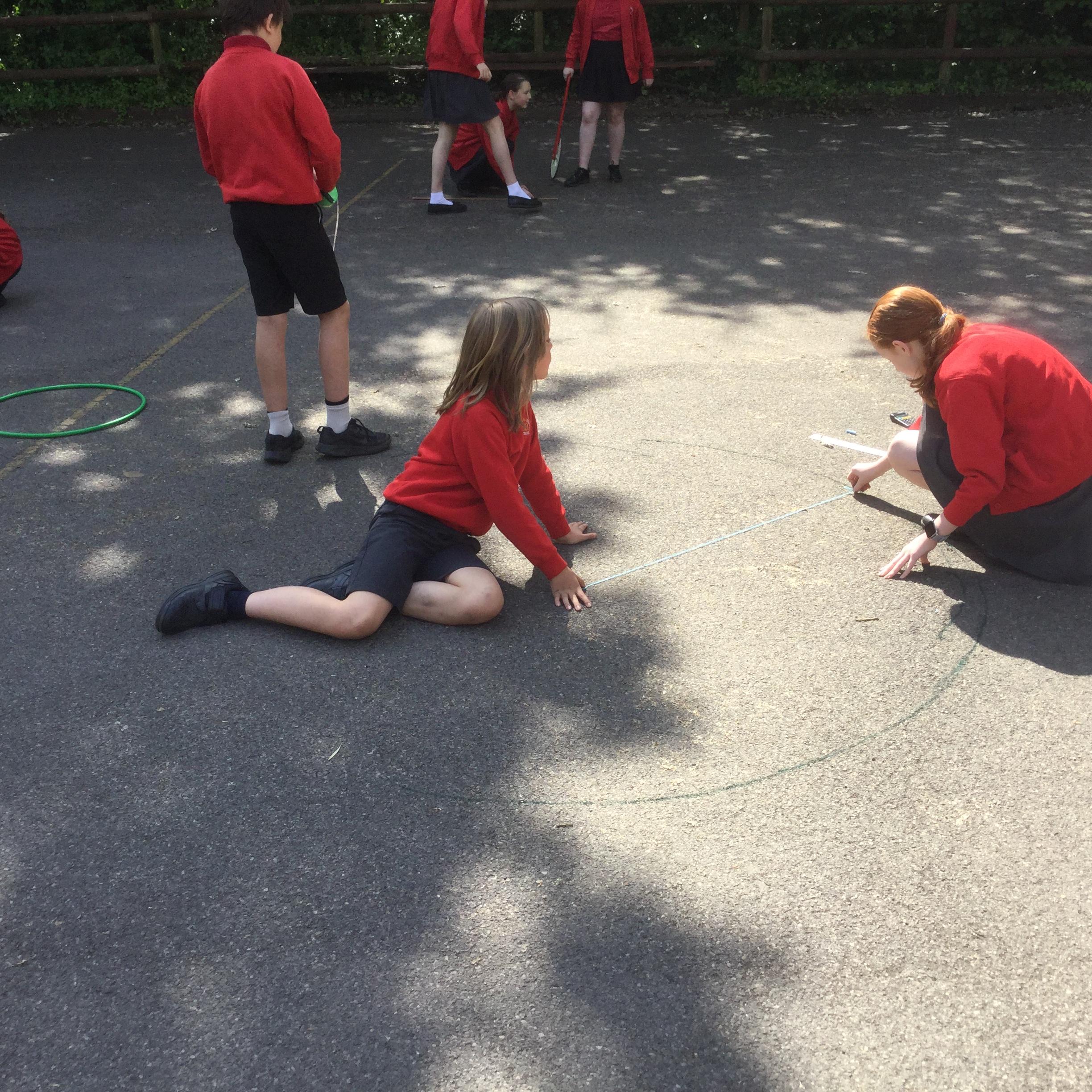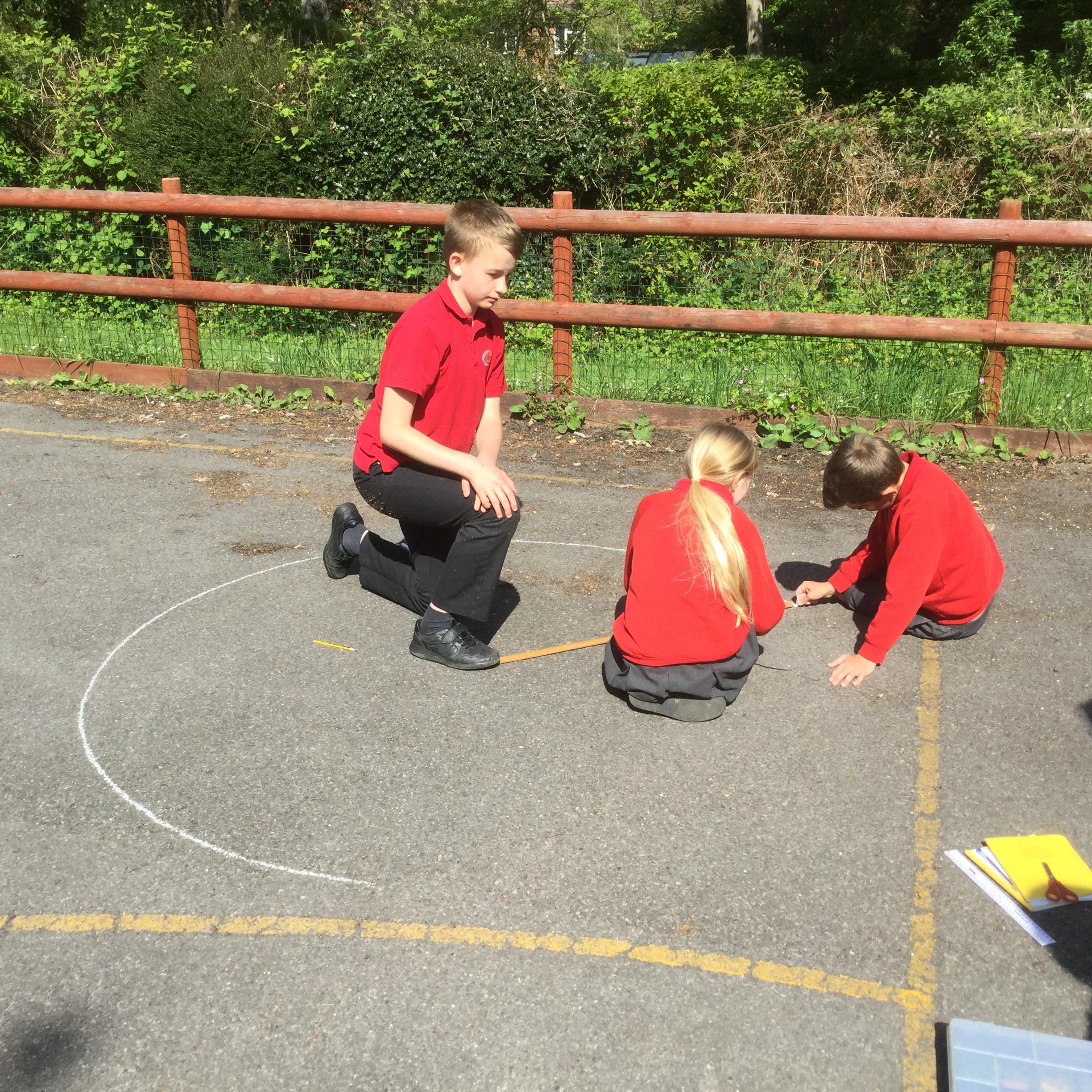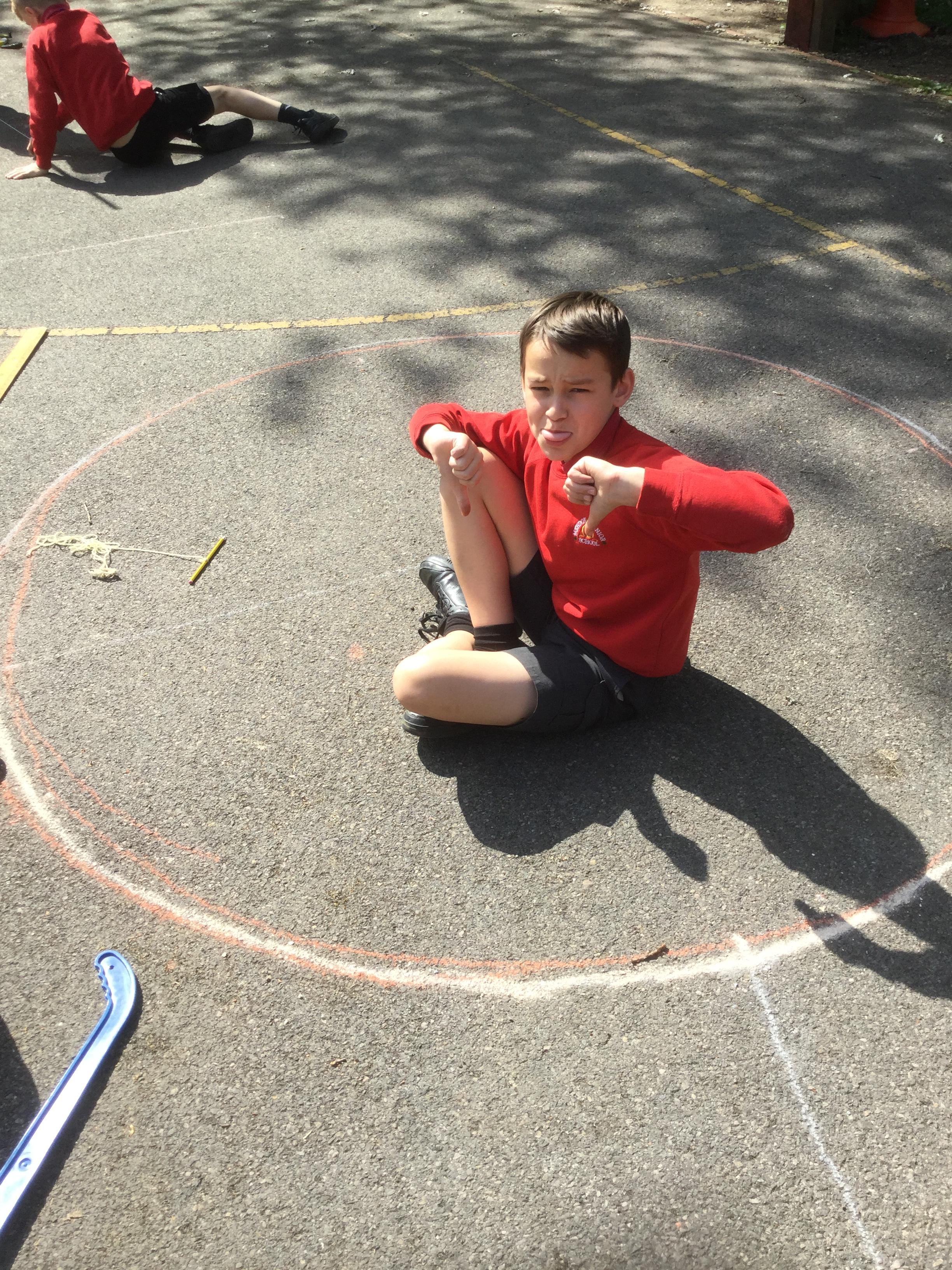 We were asked to accurately draw circles on the playground with a variety of radii. We had to think about how we may do this in terms of strategy, equipment and measurement. We were also told that we would be to find a way of measuring the circumference of the different circles to see if we could find a relationship between radius, diameter and circumference of circles.