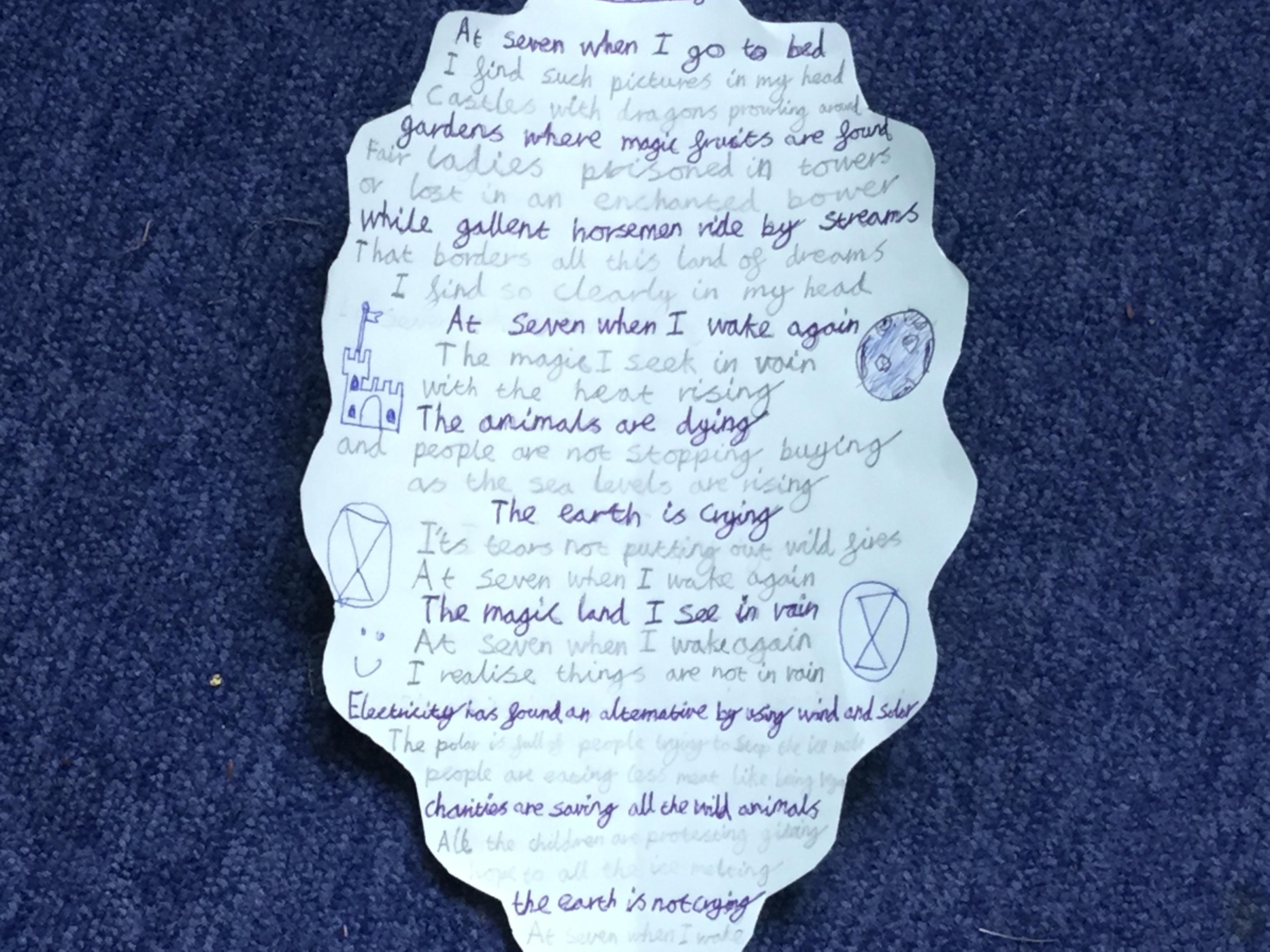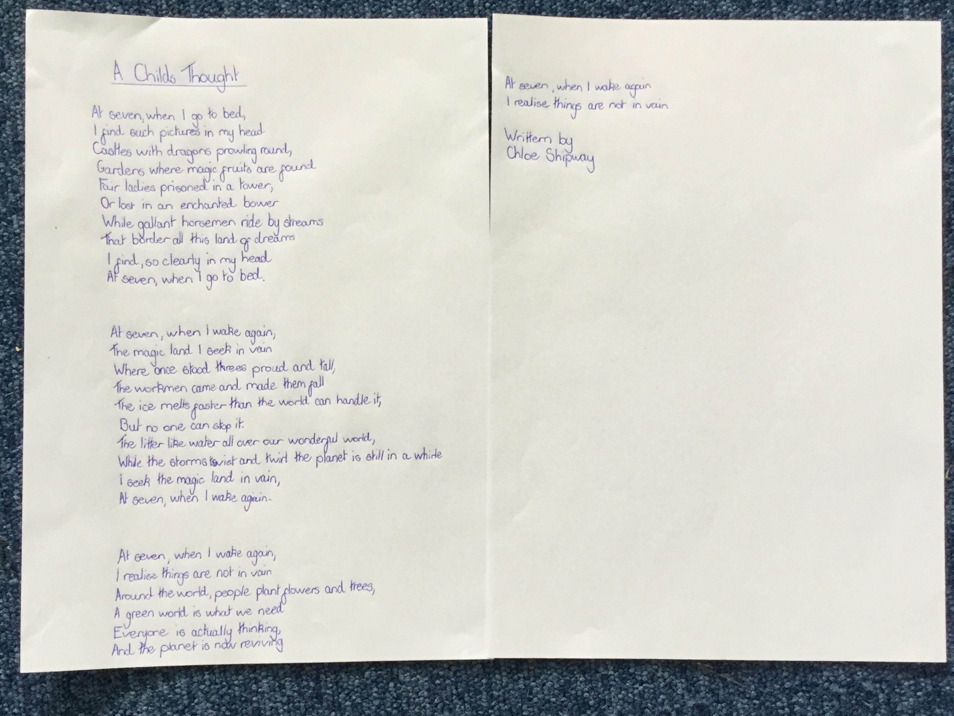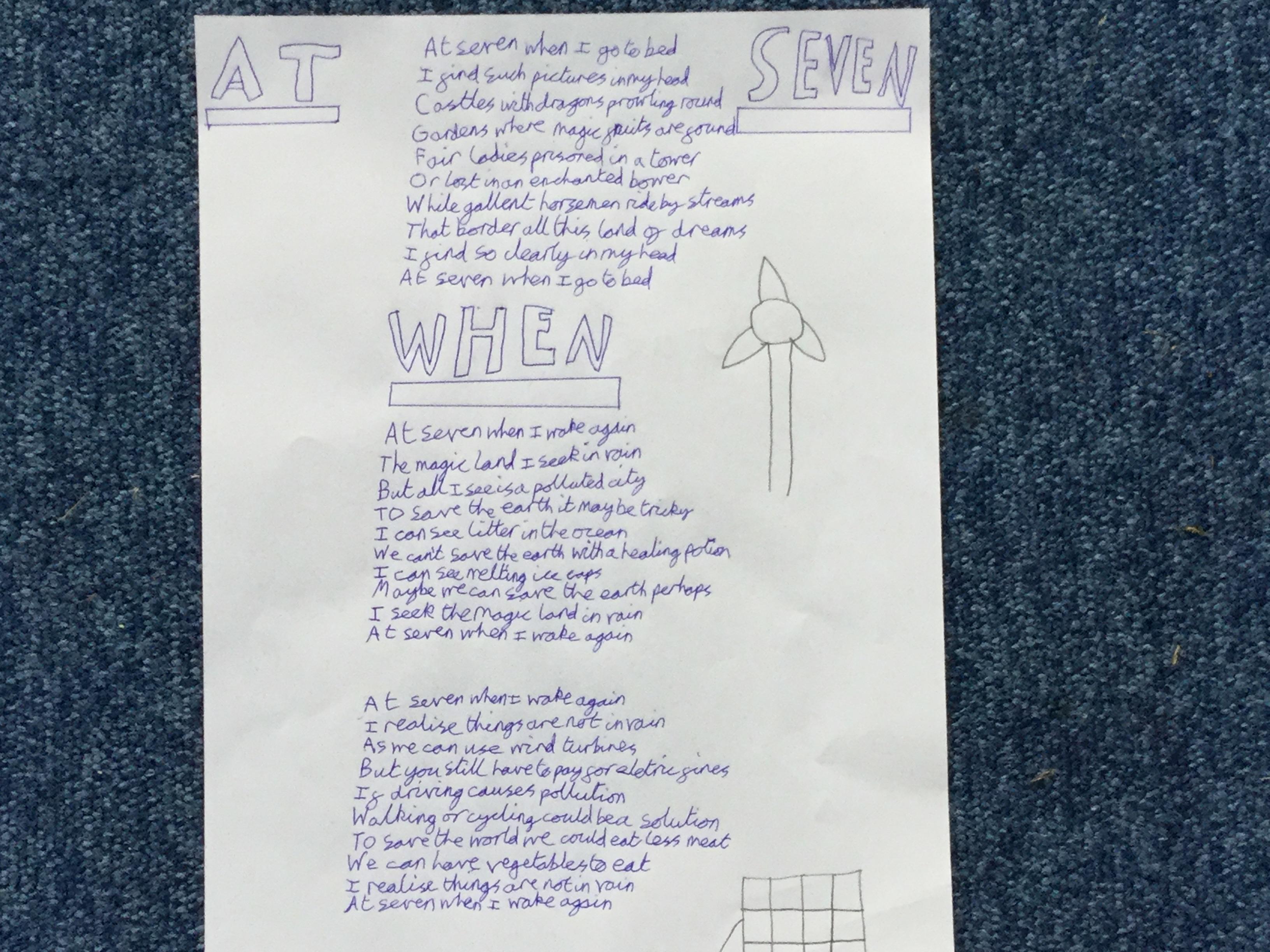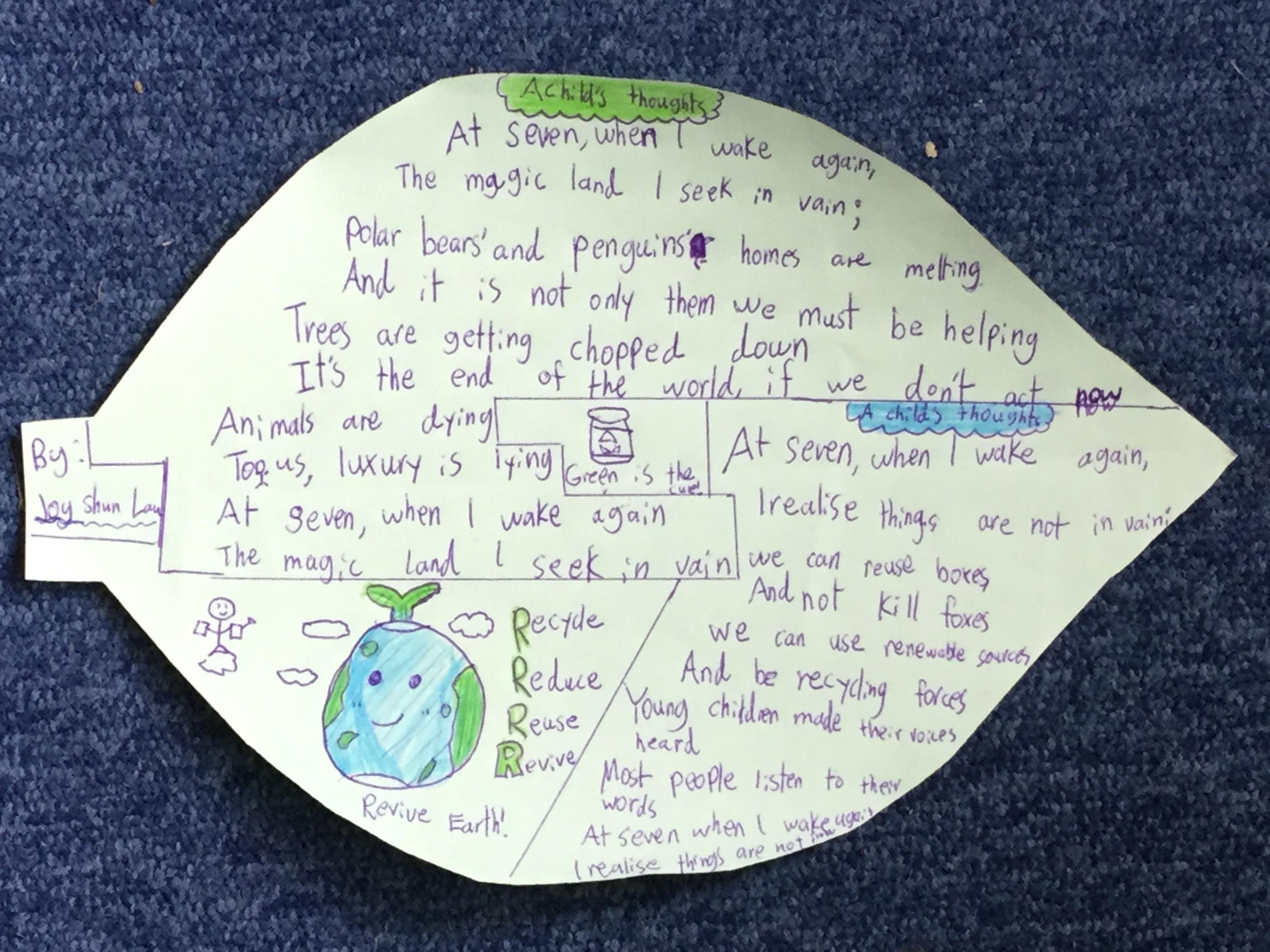 Using the first verse of An Child’s Thought’ by Robert Lewis Stevenson as inspiration, the children wrote a second verse about the impact of climate change on our planet. They then composed a third verse focused on how we can make a difference!