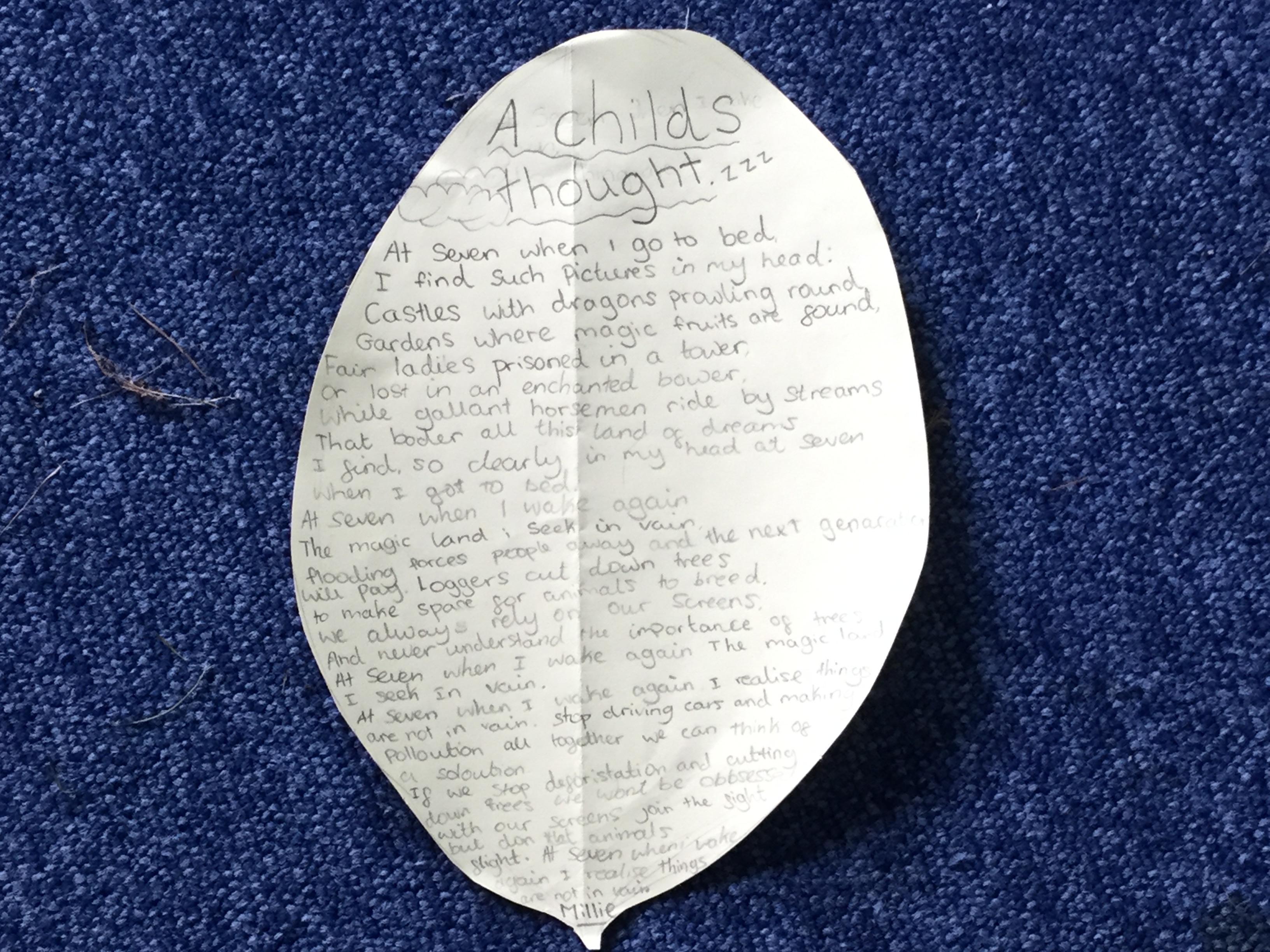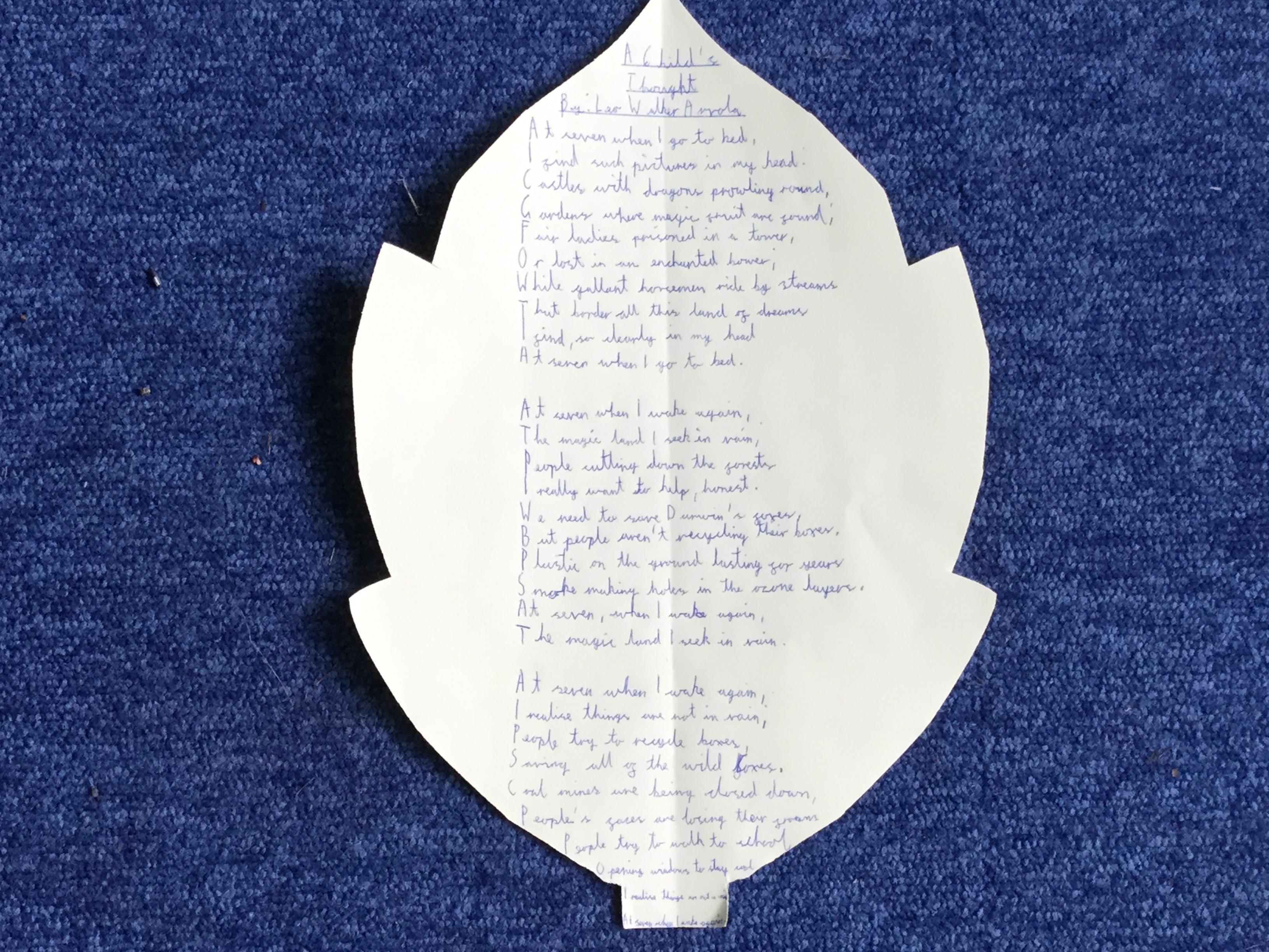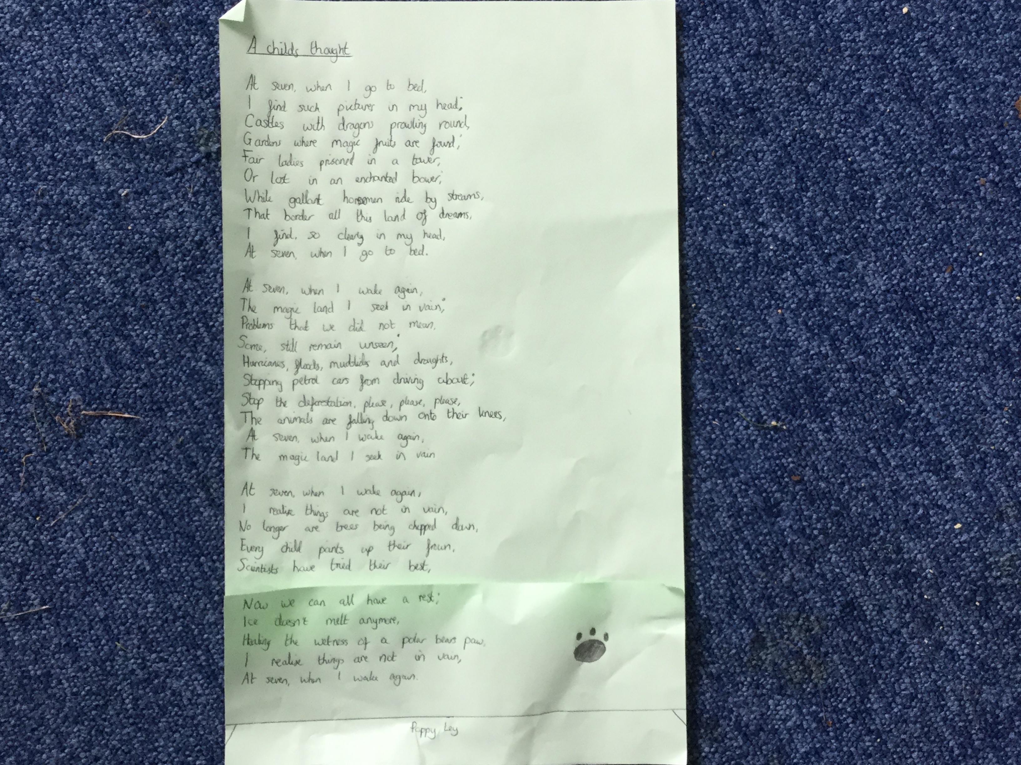 Using the first verse of An Child’s Thought’ by Robert Lewis Stevenson as inspiration, the children wrote a second verse about the impact of climate change on our planet. They then composed a third verse focused on how we can make a difference!