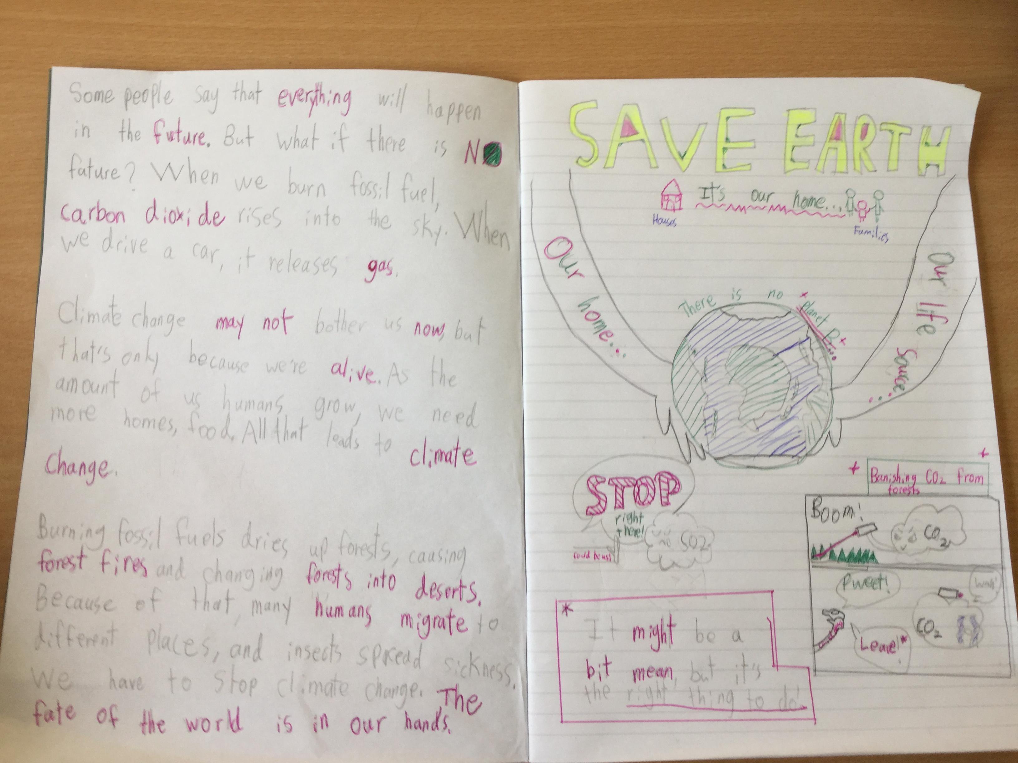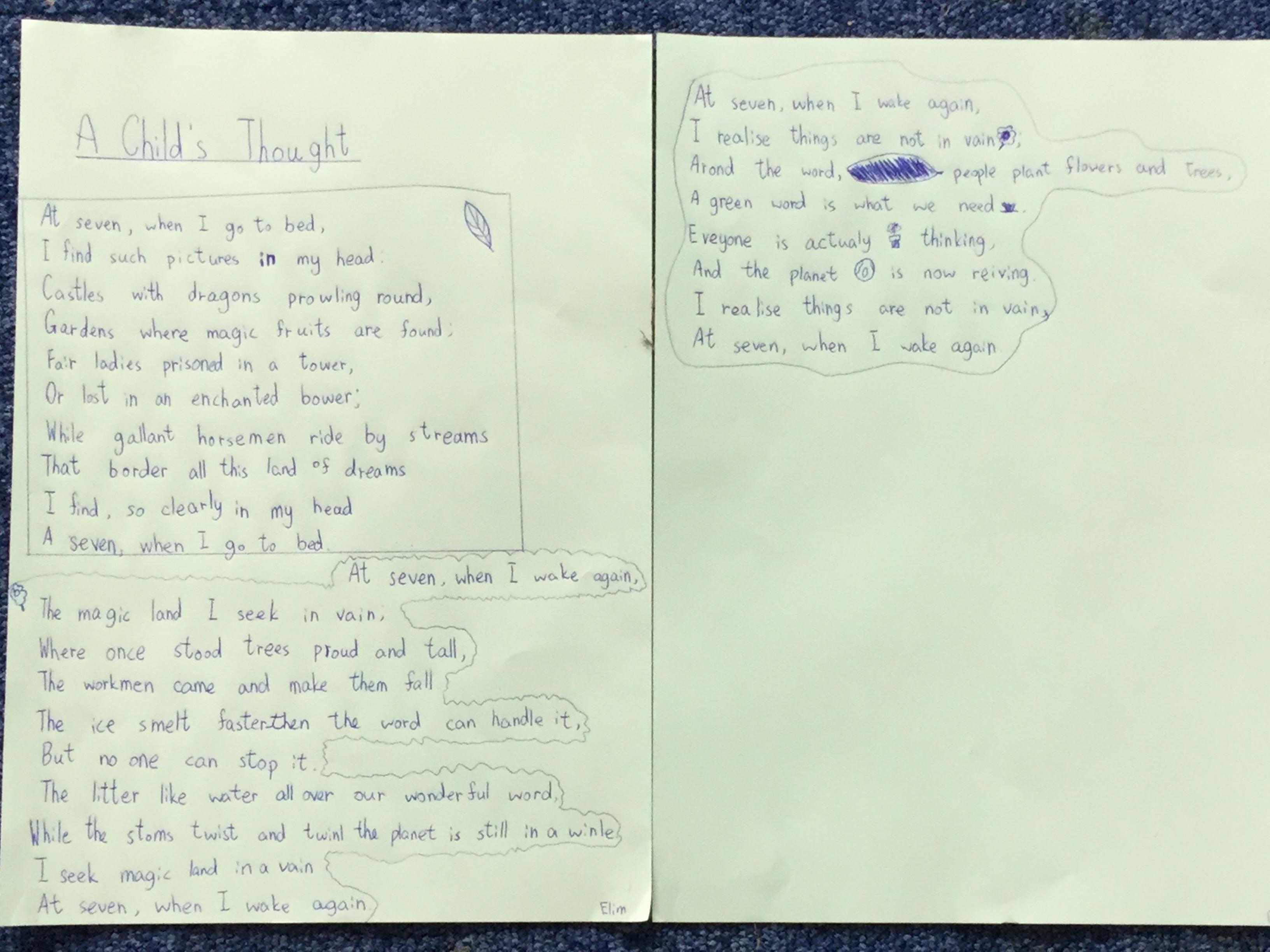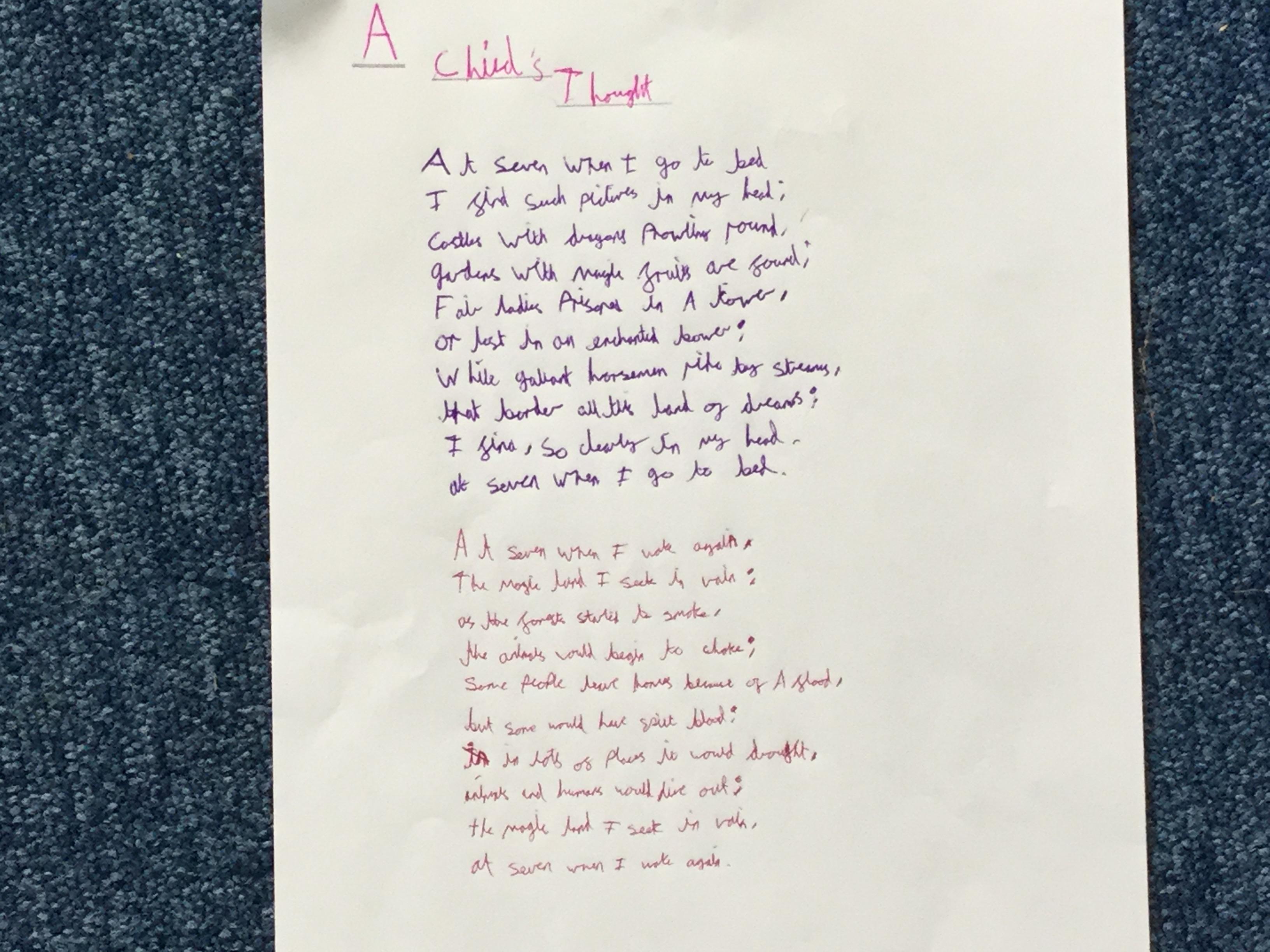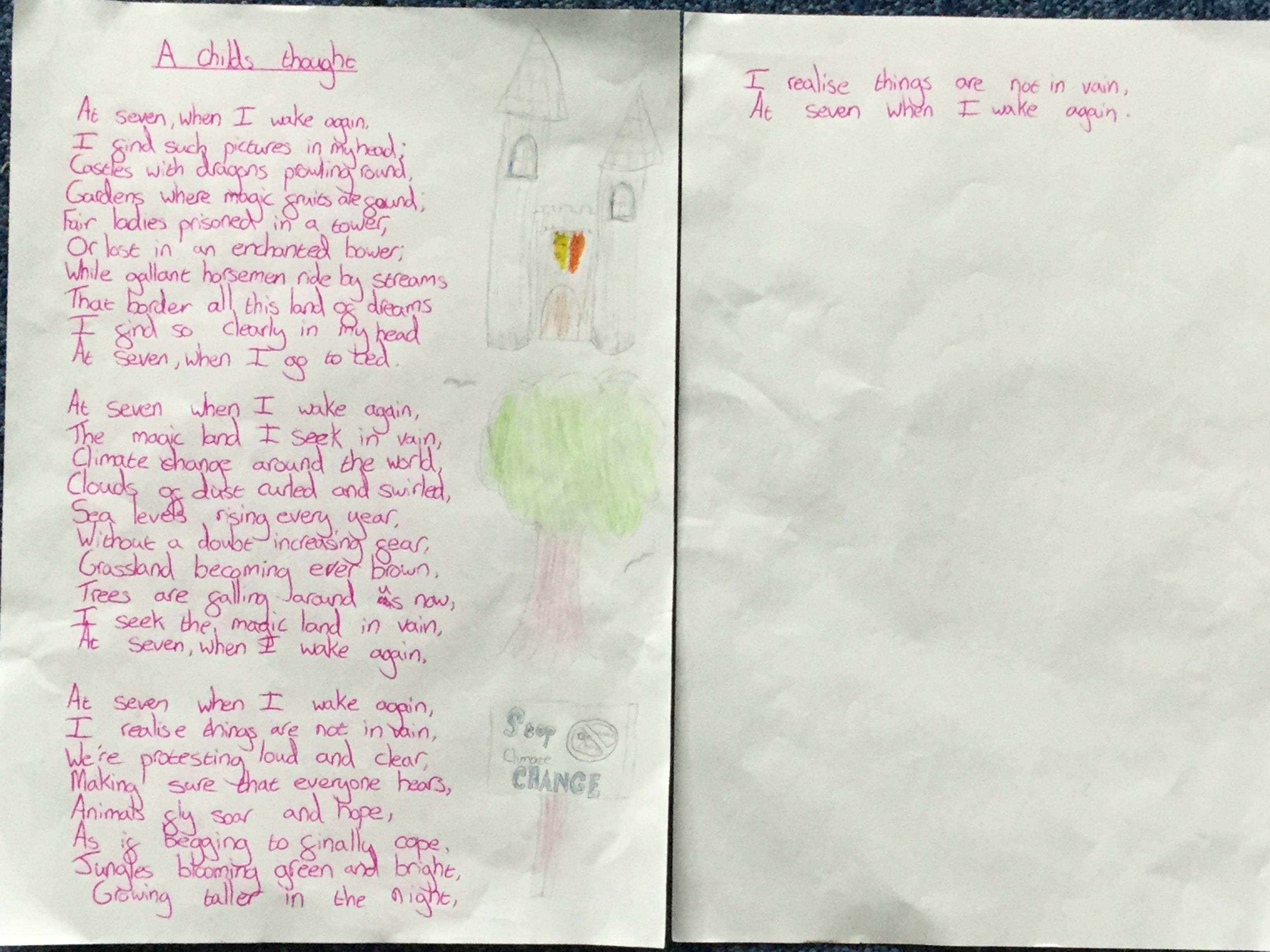 Using the first verse of An Child’s Thought’ by Robert Lewis Stevenson as inspiration, the children wrote a second verse about the impact of climate change on our planet. They then composed a third verse focused on how we can make a difference!