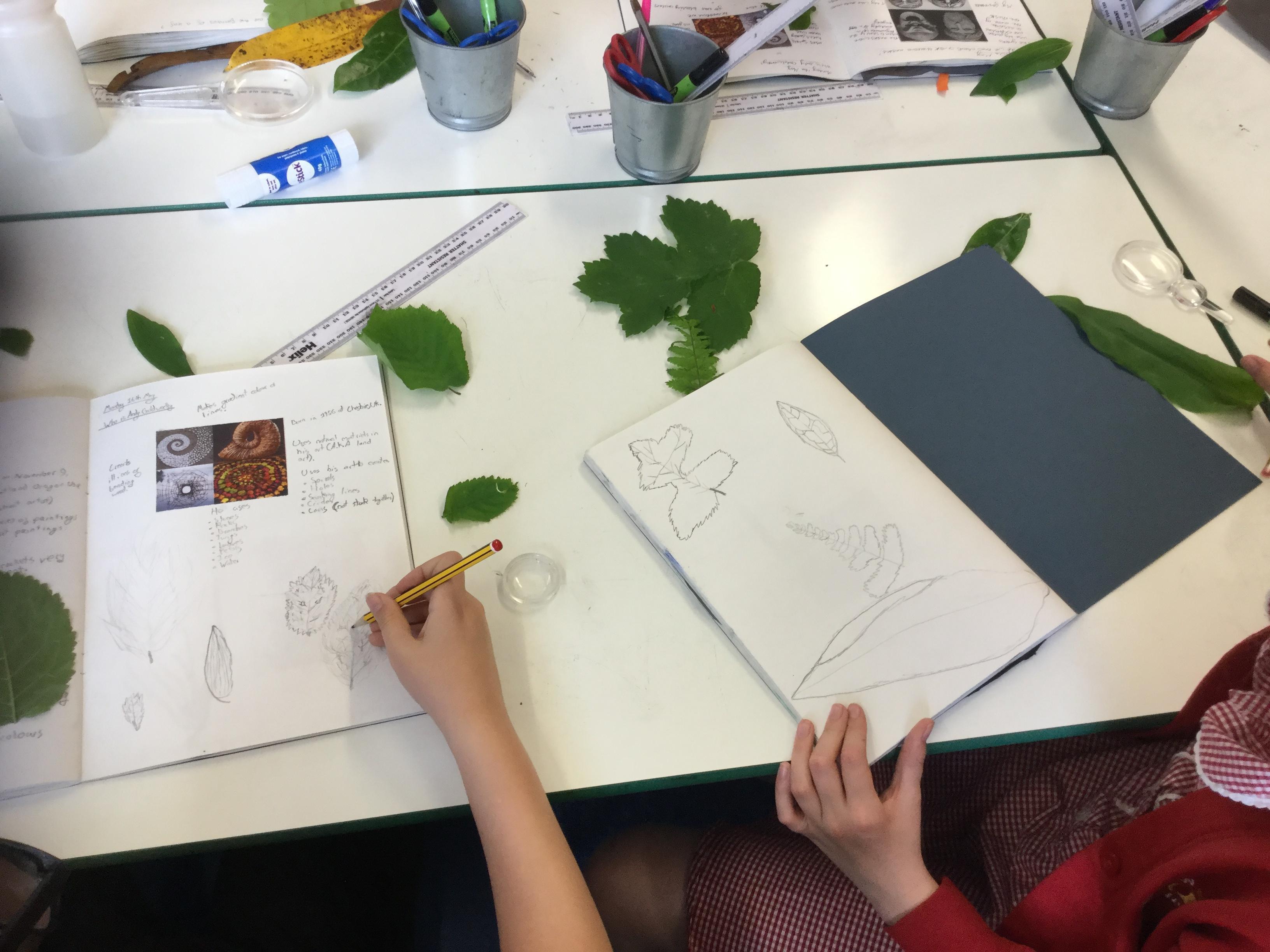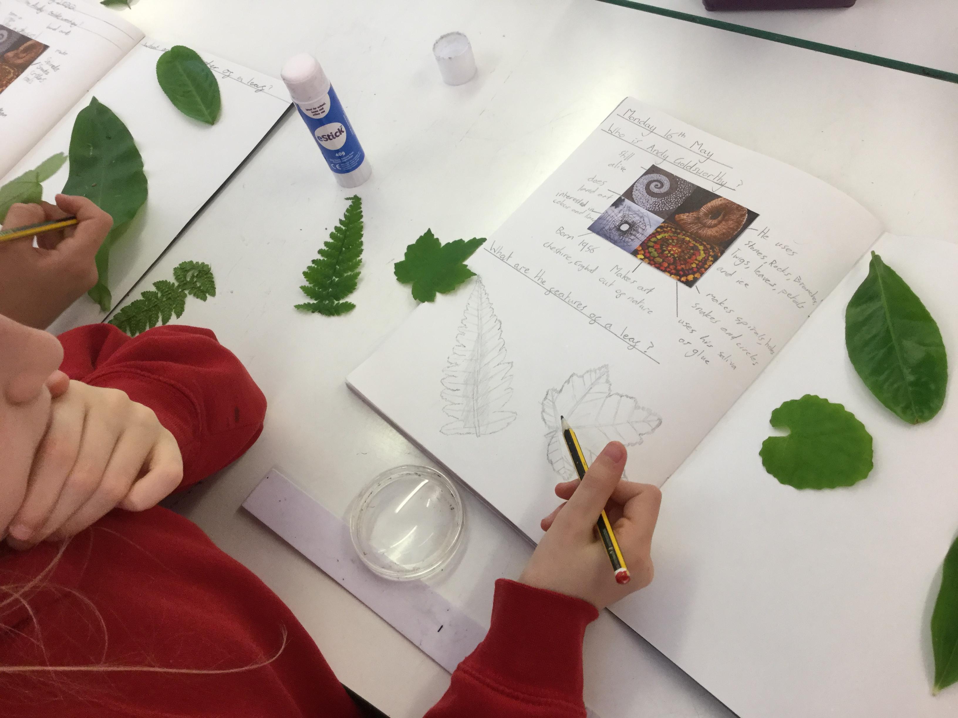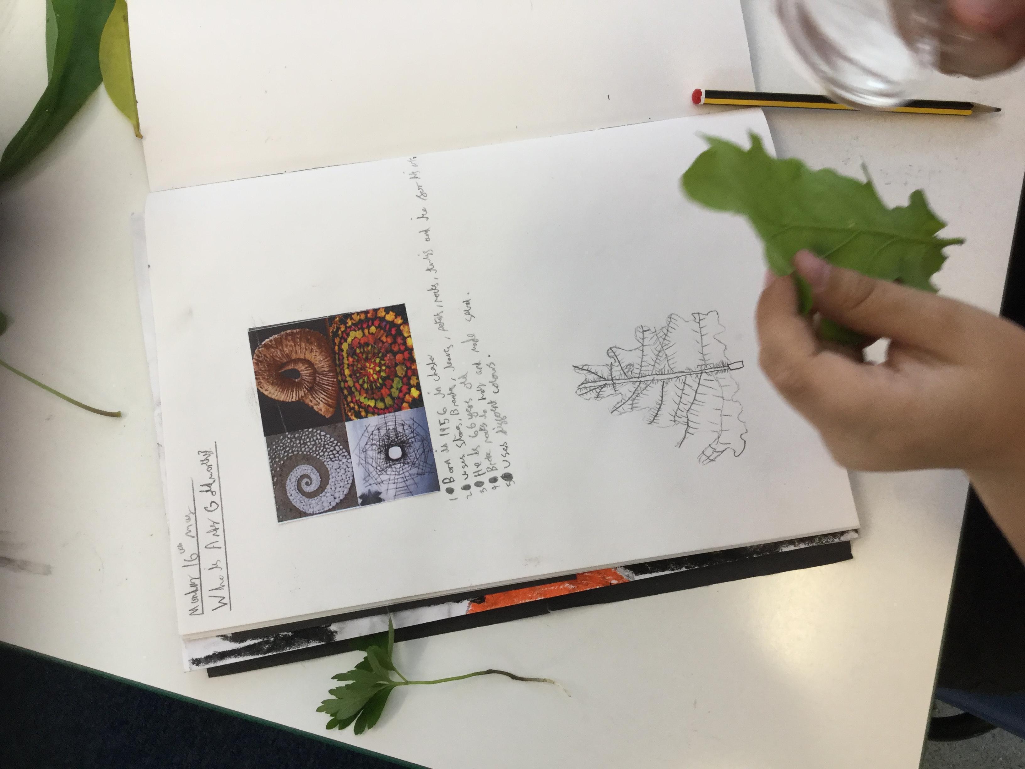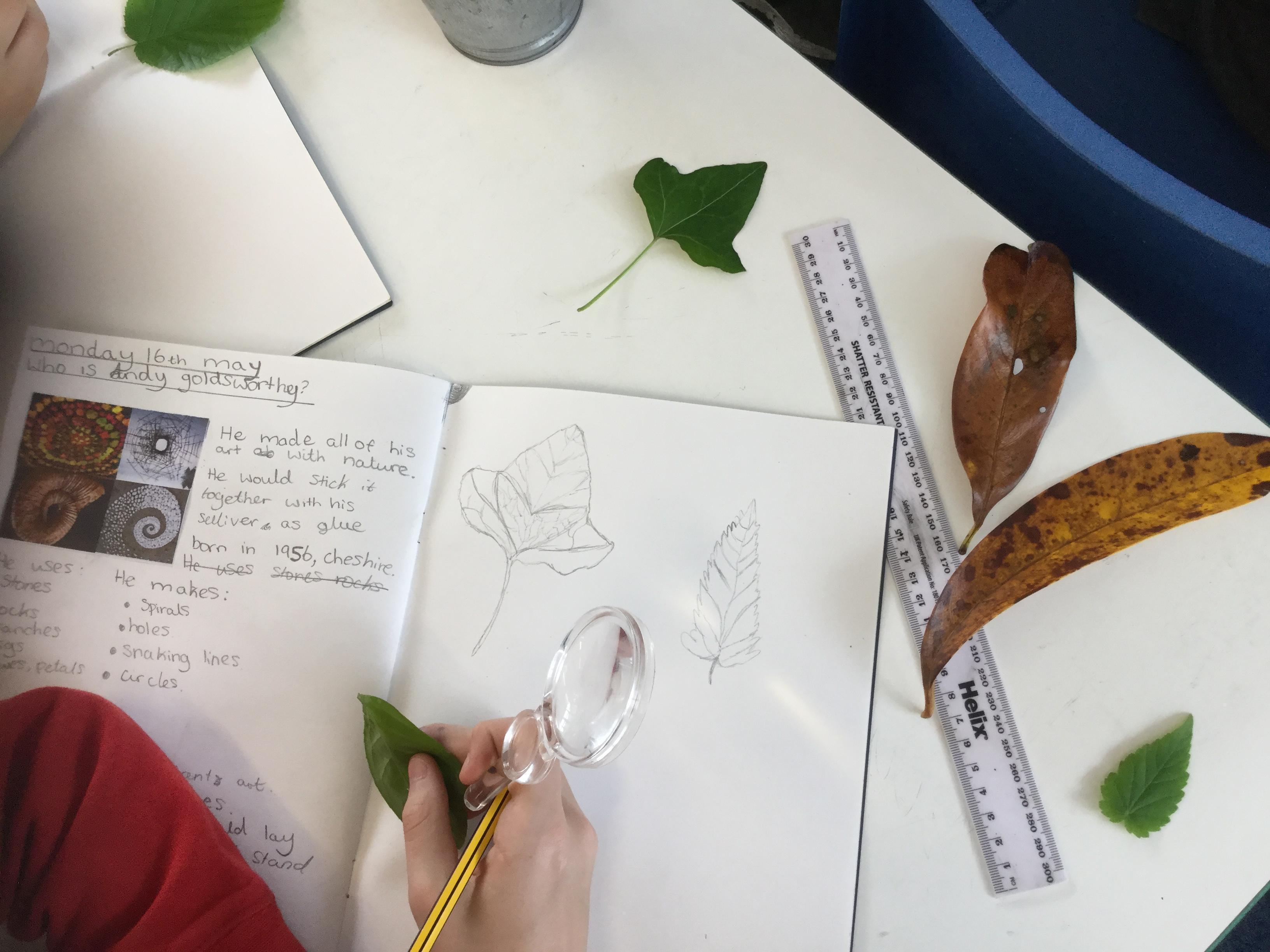 Our collage is going to be made up of leaves, just like the one we saw in the museum by Goldsworthy. In order to make our collage, we need to look very closely at the shapes, colours, lines and tones of a leaf so we picked some and returned to class to sketch them.