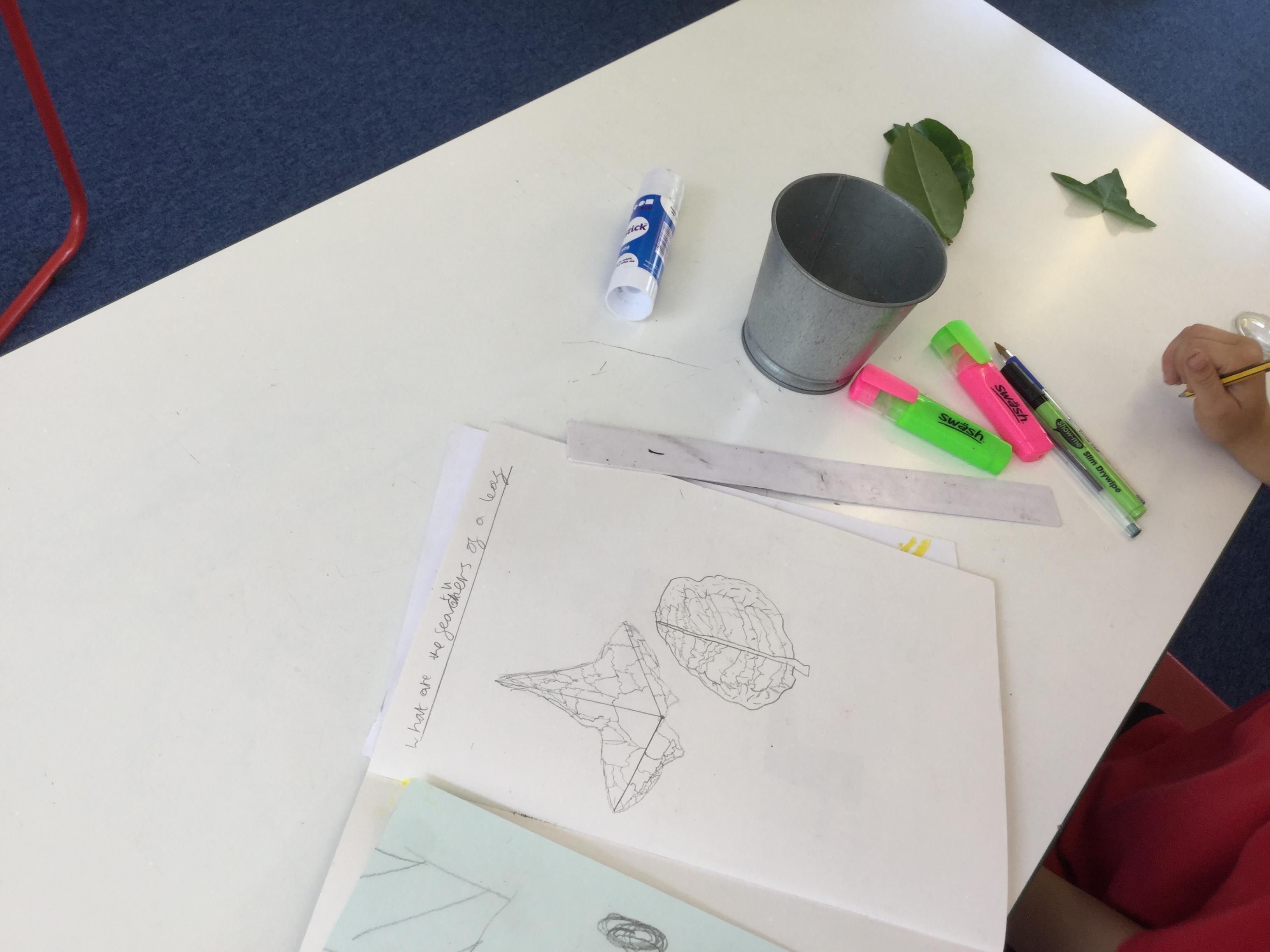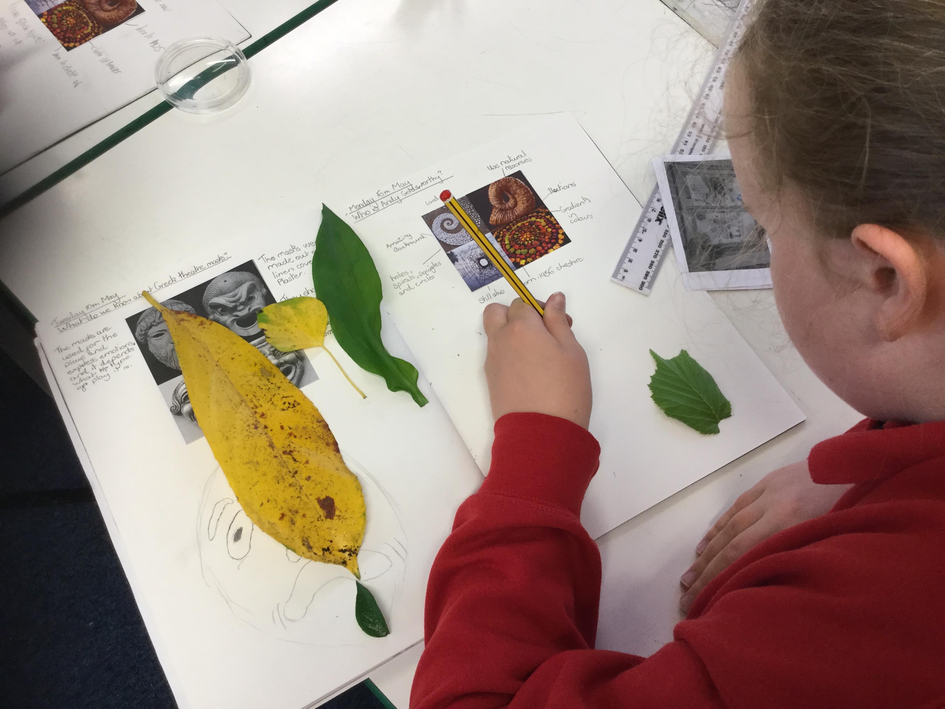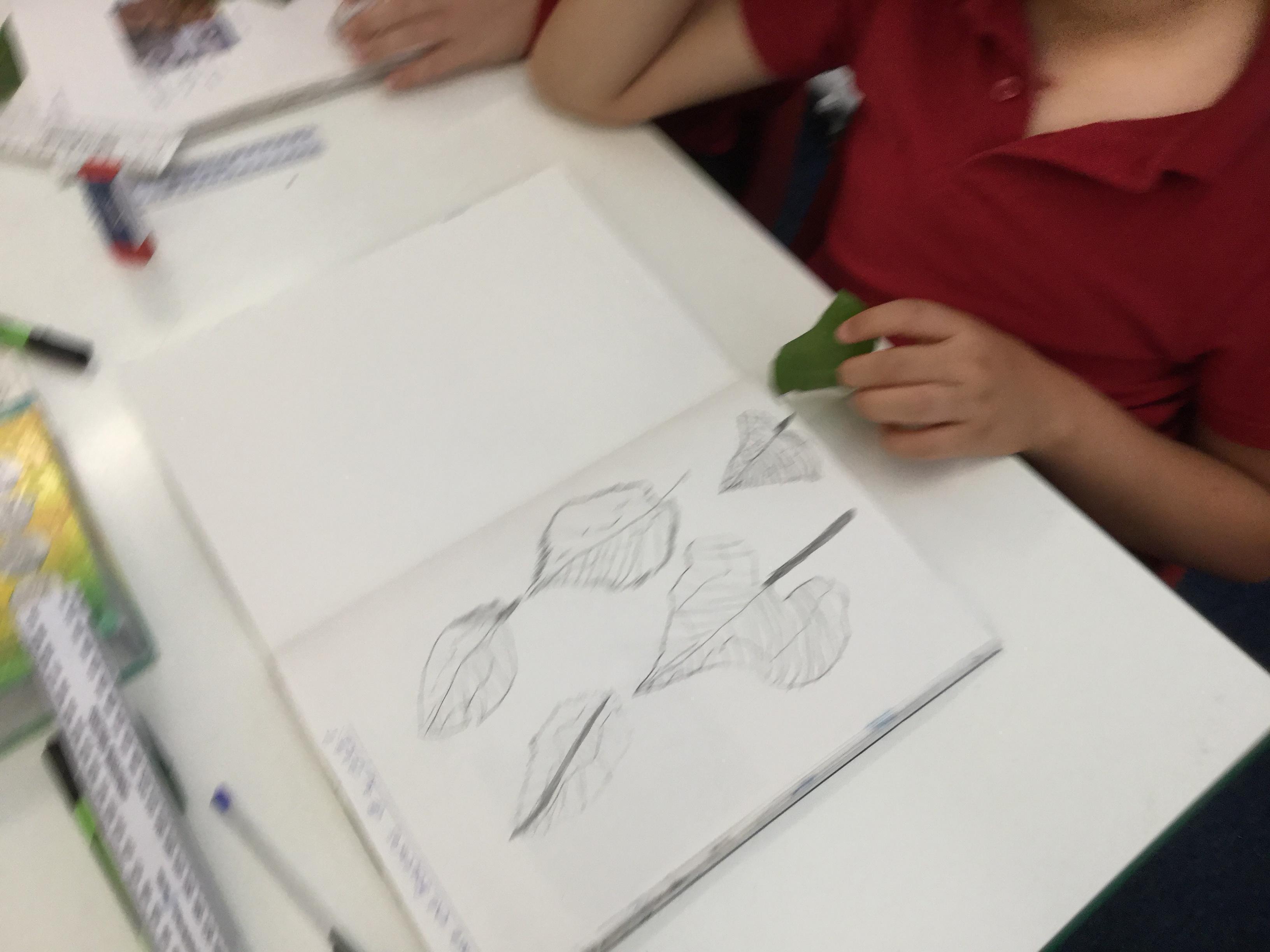 Our collage is going to be made up of leaves, just like the one we saw in the museum by Goldsworthy. In order to make our collage, we need to look very closely at the shapes, colours, lines and tones of a leaf so we picked some and returned to class to sketch them.