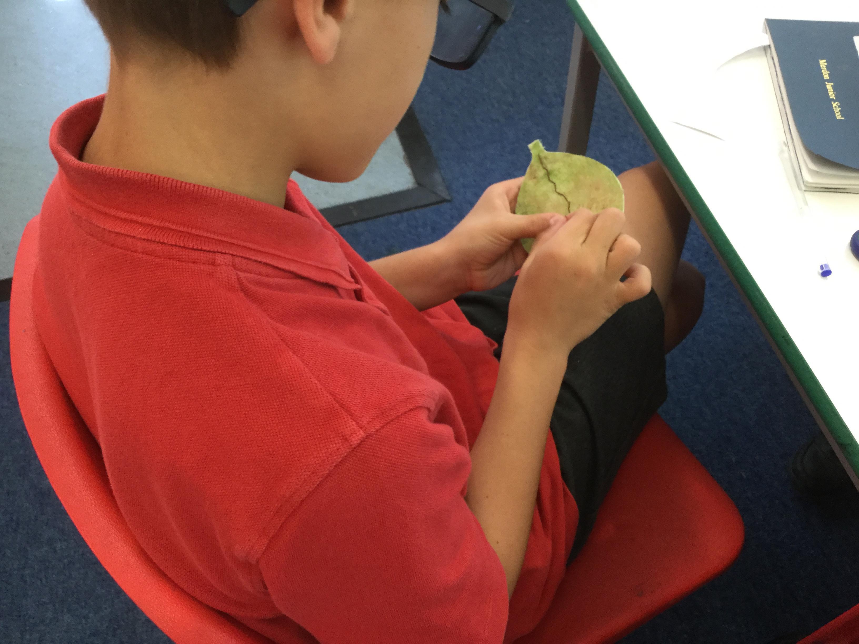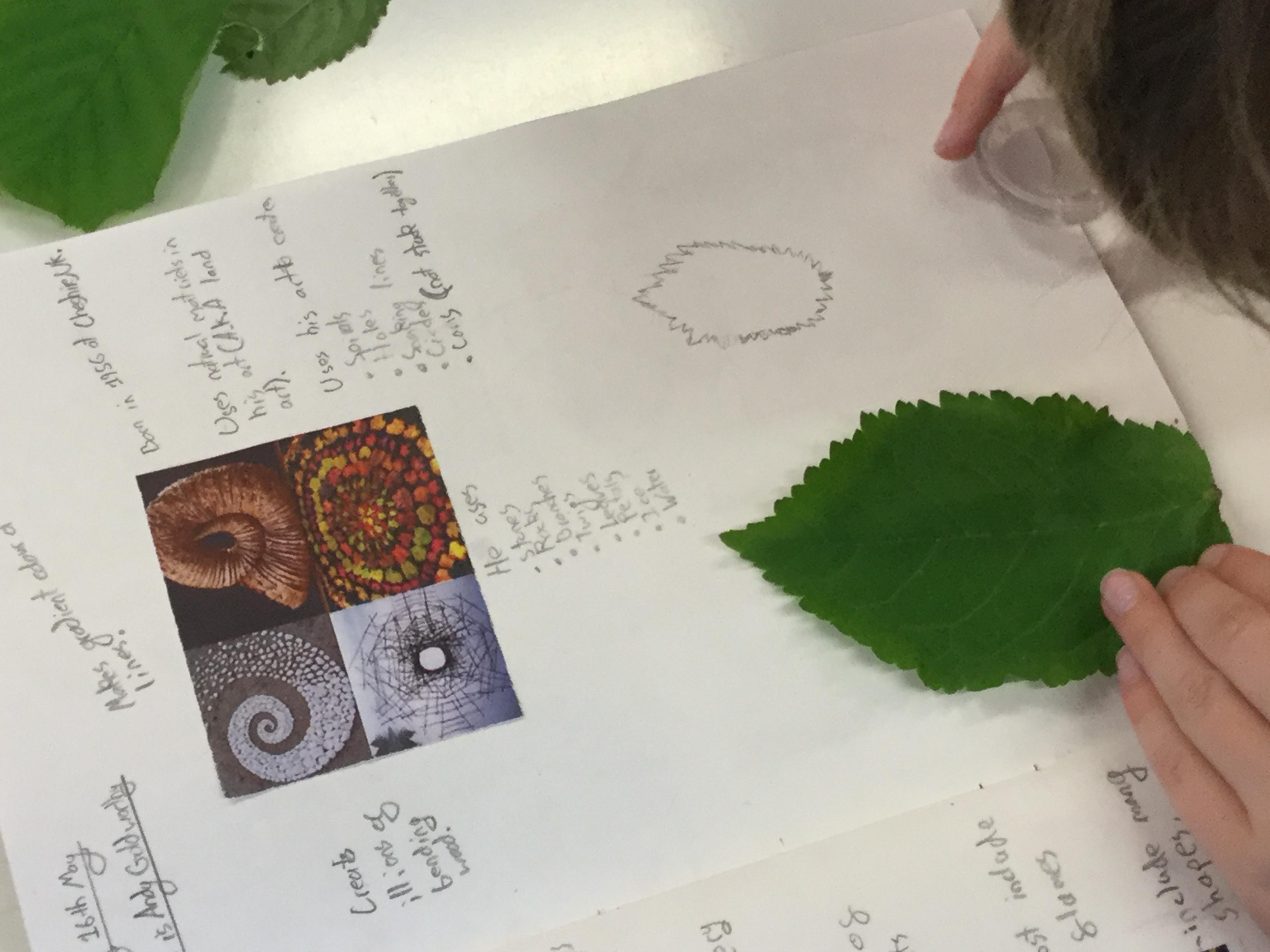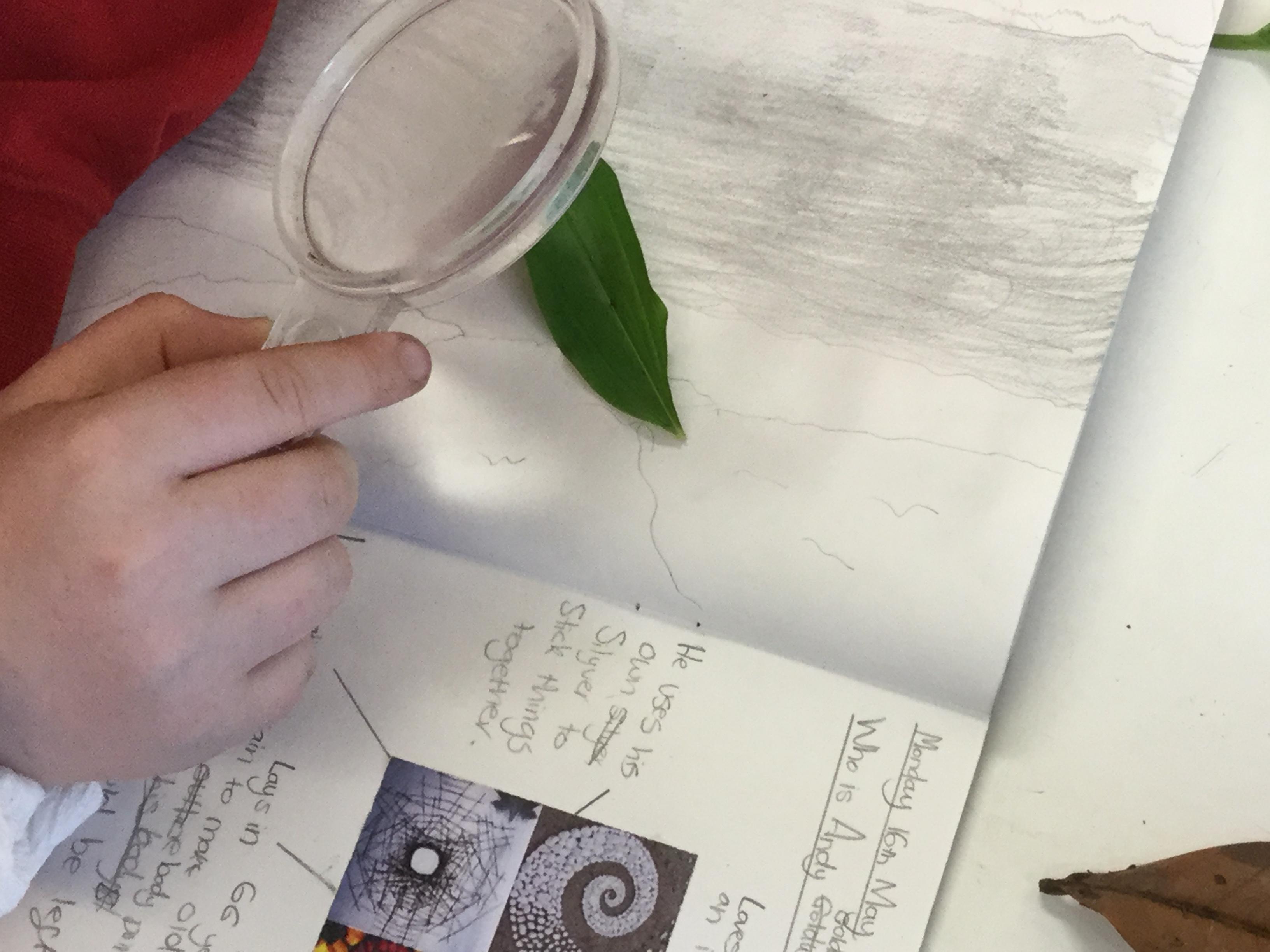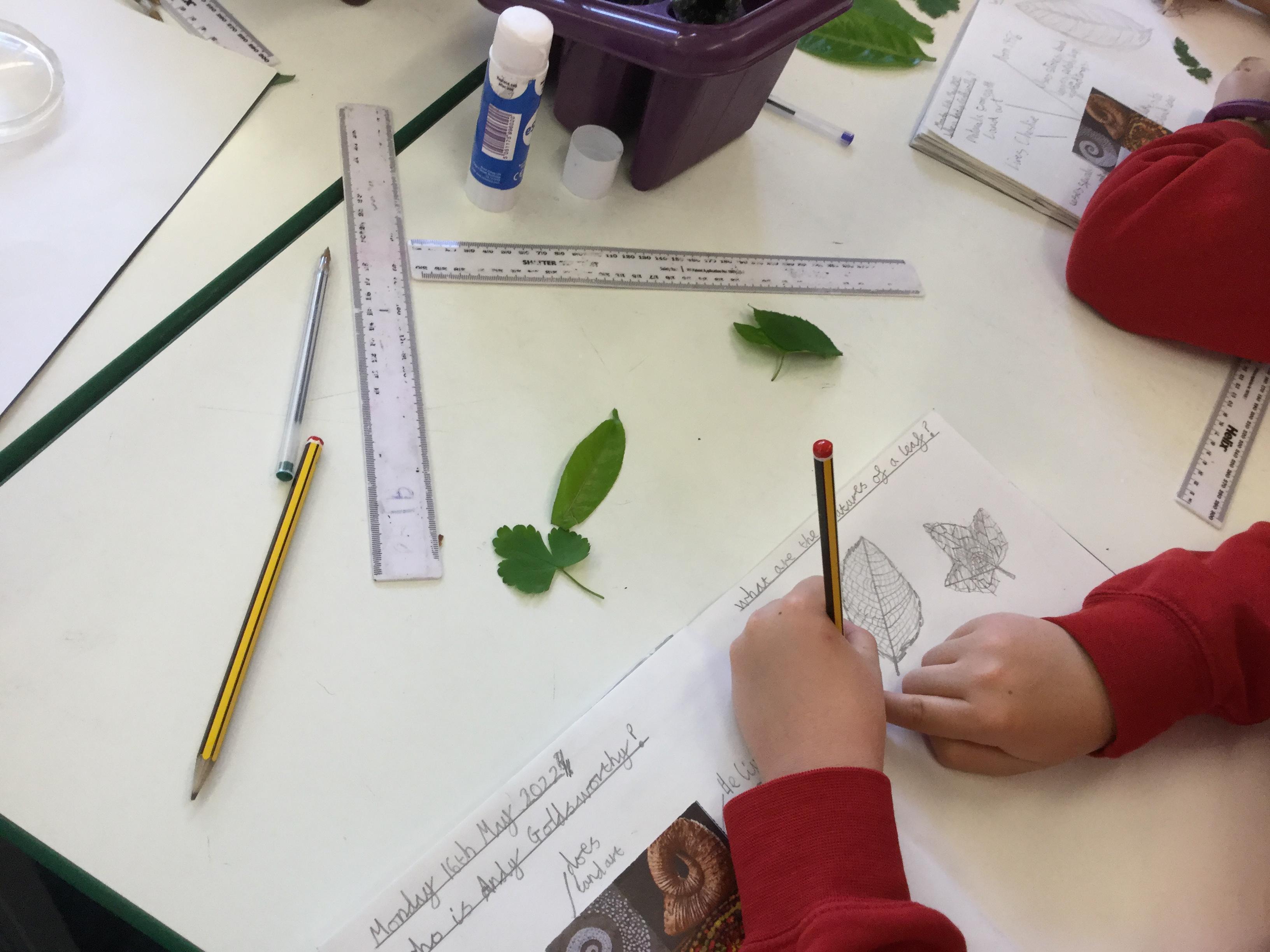 Our collage is going to be made up of leaves, just like the one we saw in the museum by Goldsworthy. In order to make our collage, we need to look very closely at the shapes, colours, lines and tones of a leaf so we picked some and returned to class to sketch them.