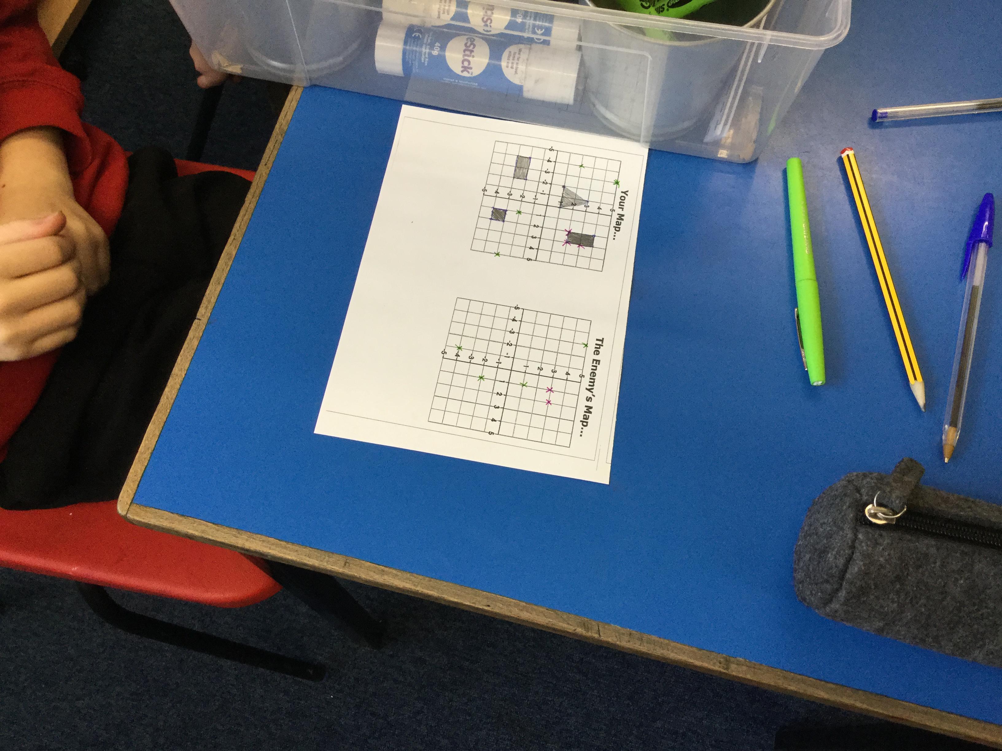 After a busy morning of writing, we played a game of battleships to check our understanding of co-ordinates in all four quadrants!  Instead of ships we had to use 2D shapes.