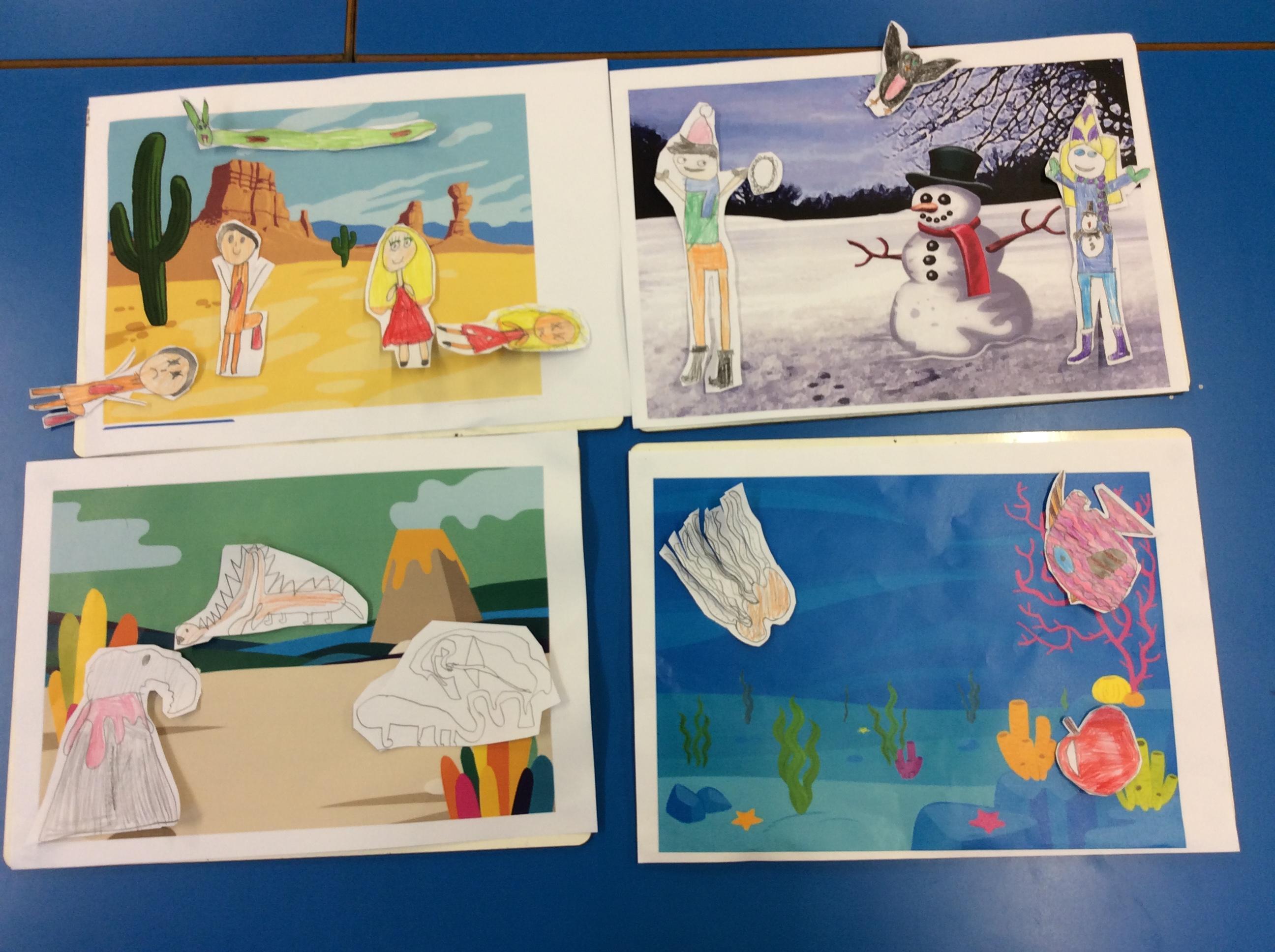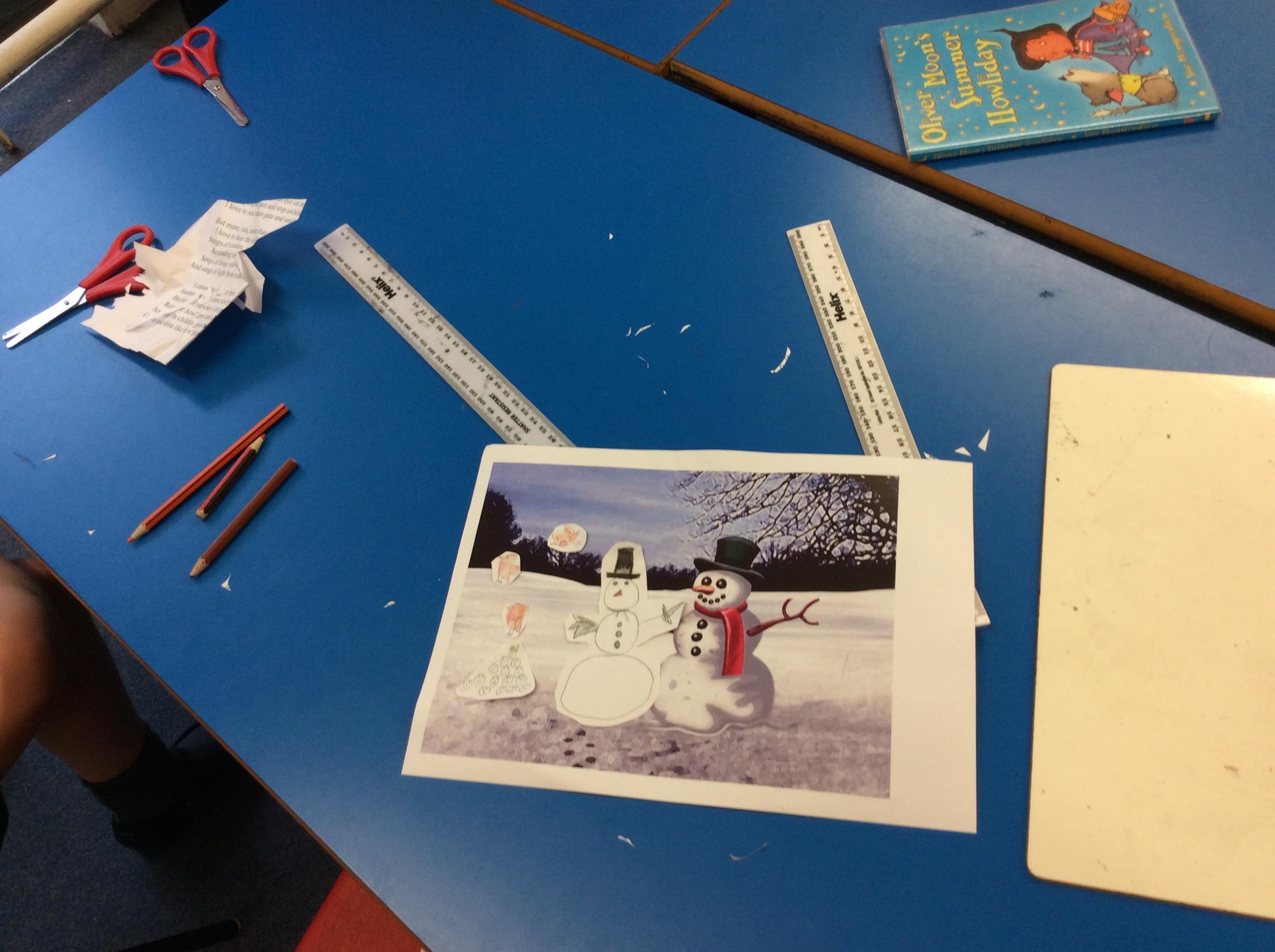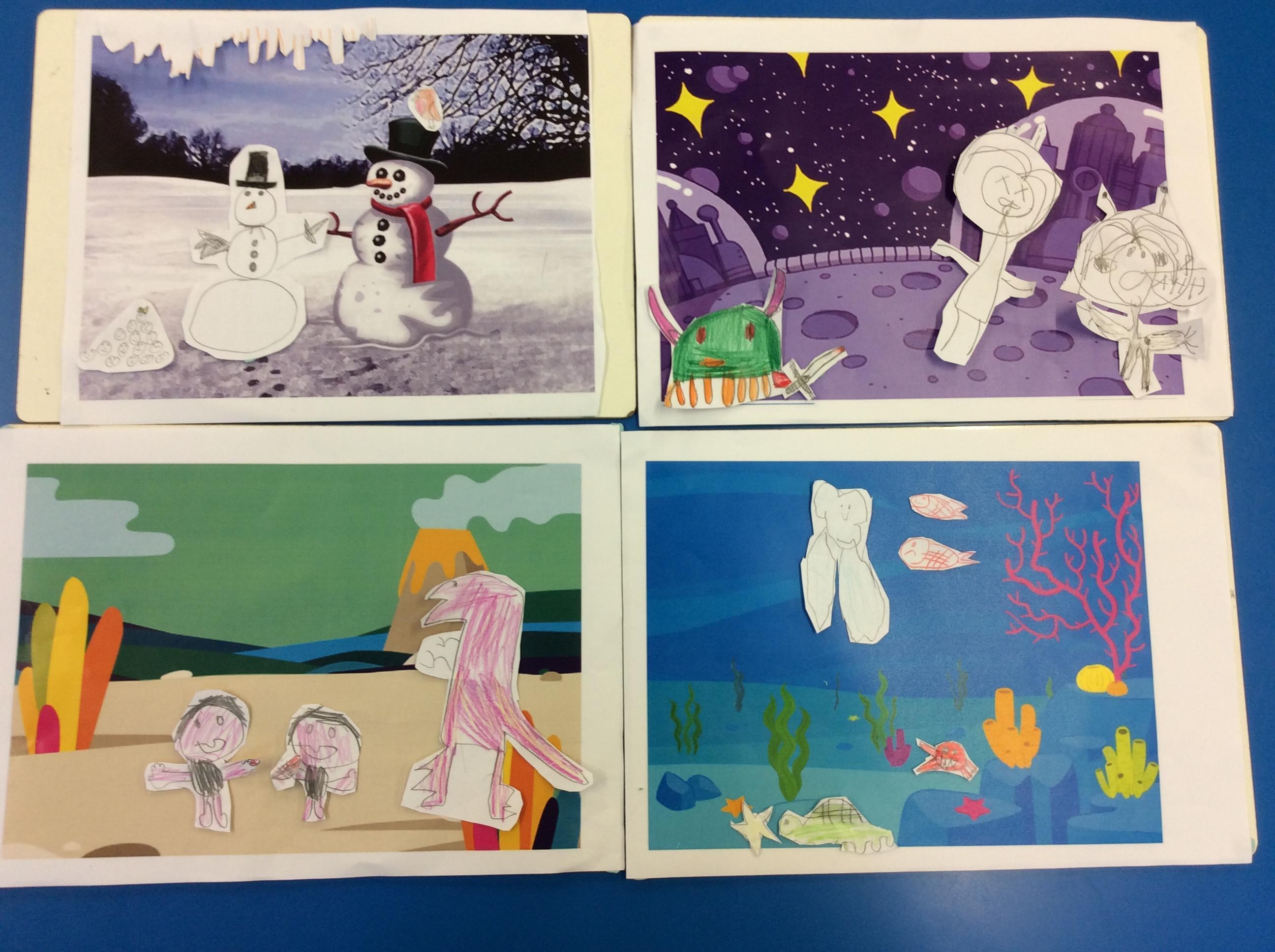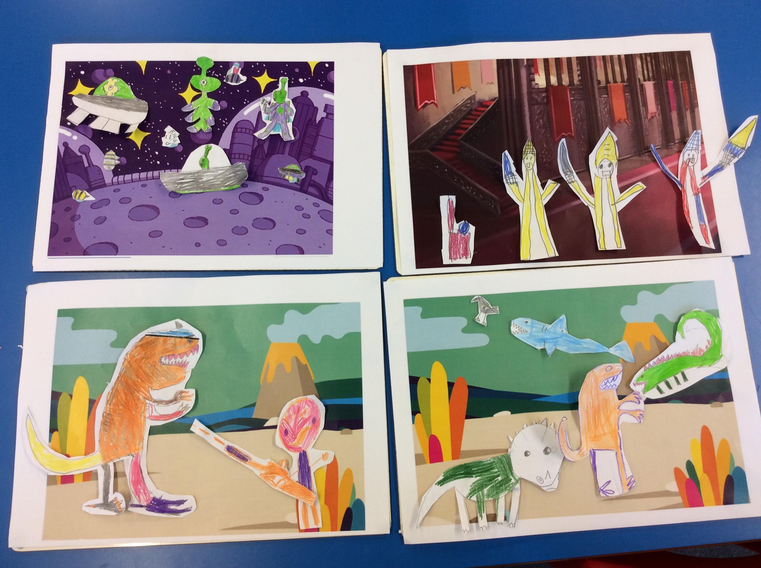 Next, we chose our backgrounds and printed them before carefully drawing, colouring and cutting out our characters.