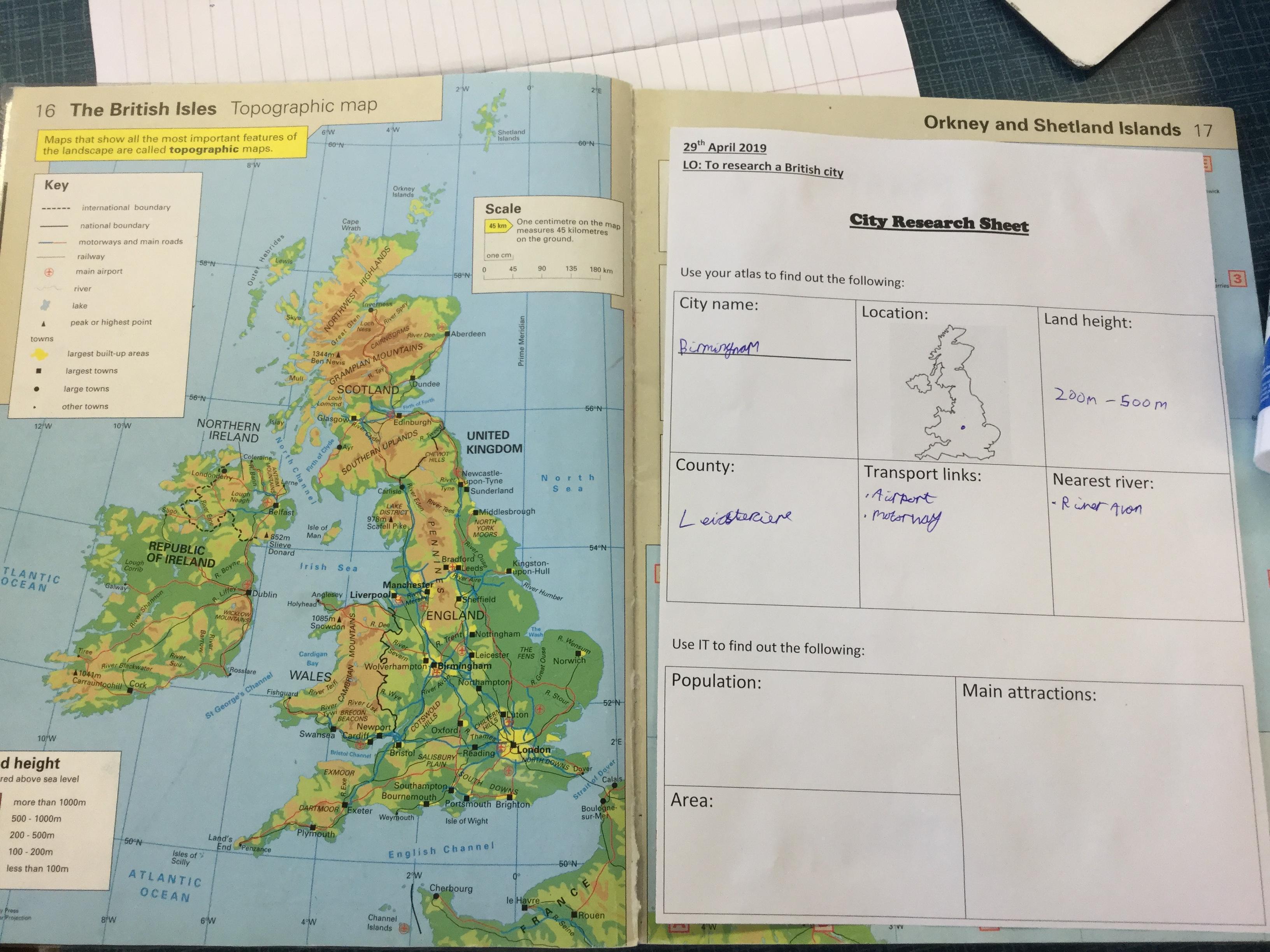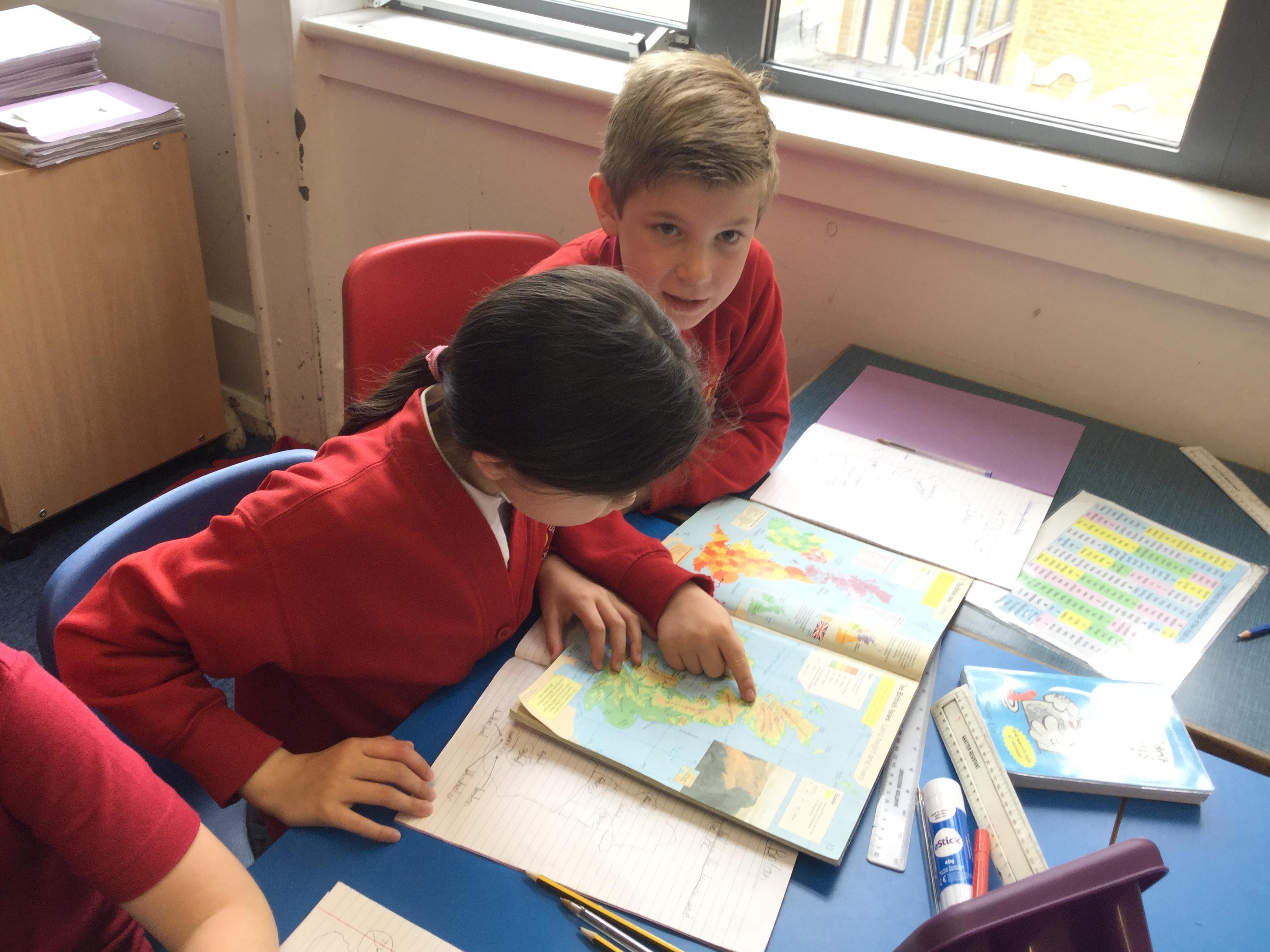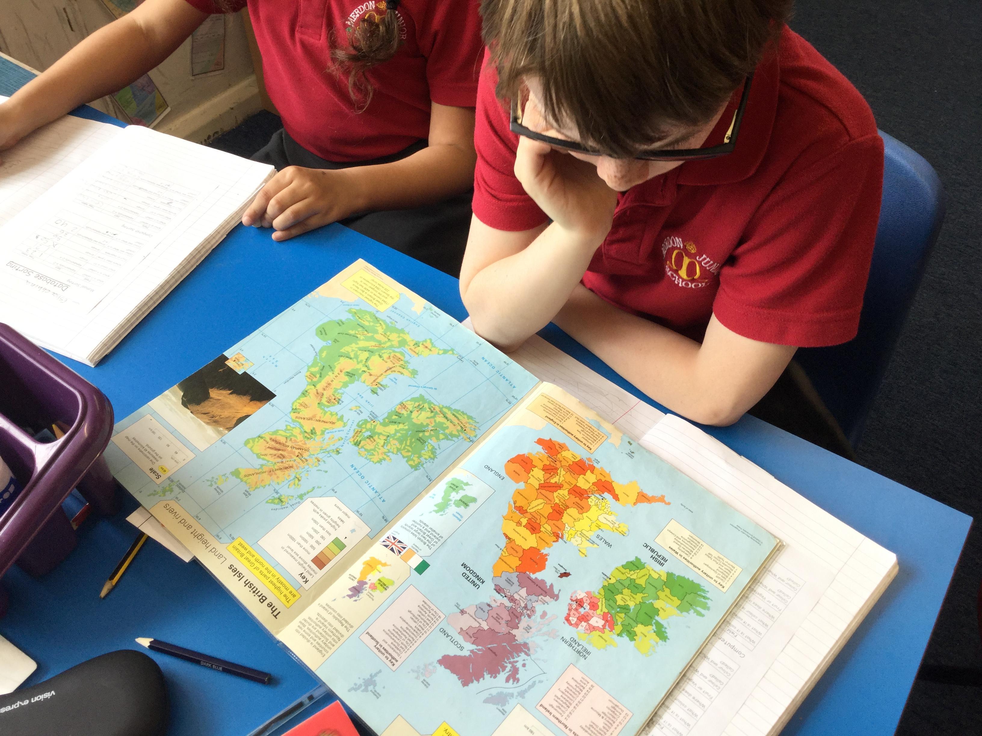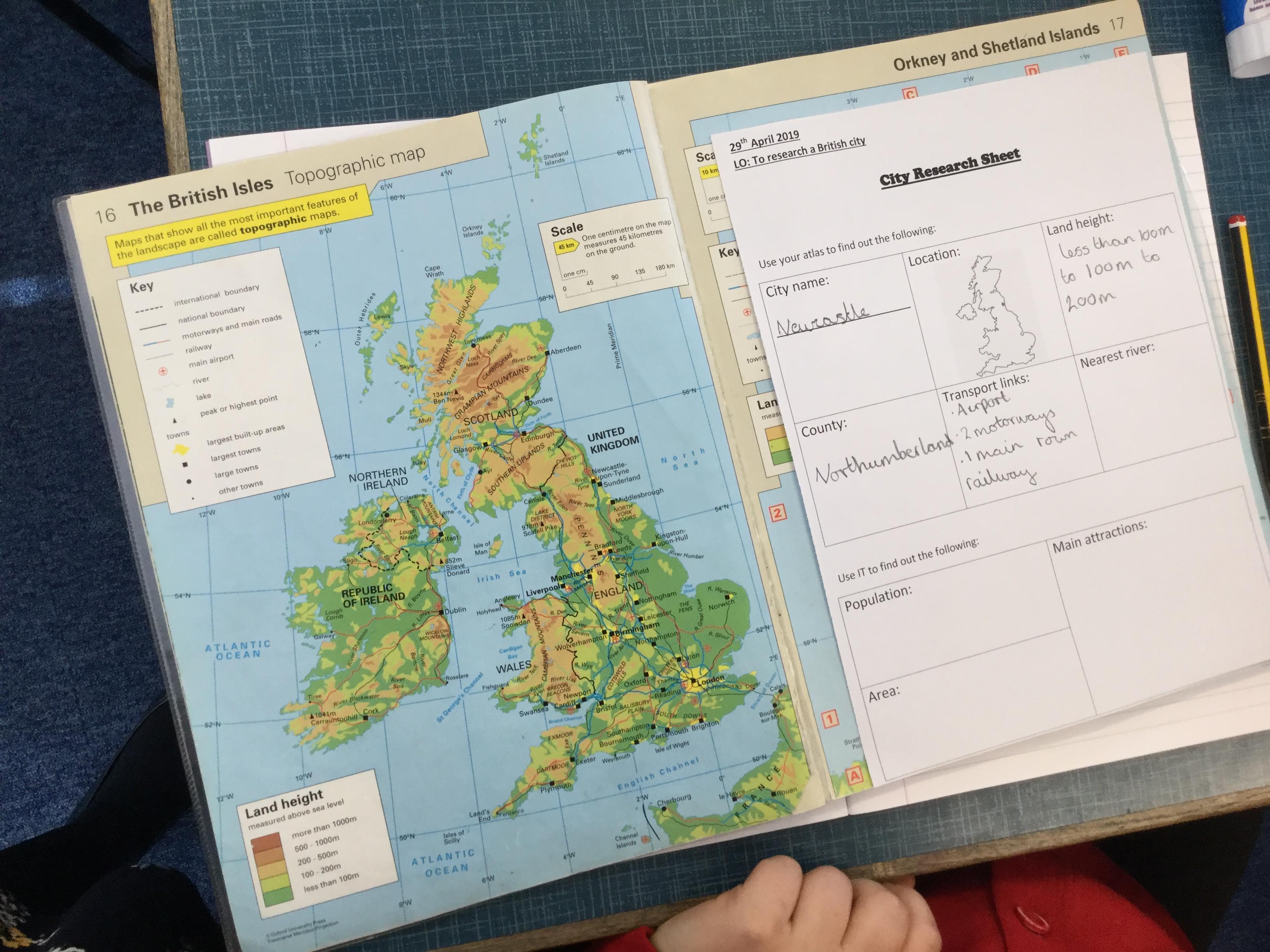 Today, we started our Tour of Britain topic by looking at various maps. We discussed what a map is used for and what information a map can give us. We then used maps of the United Kingdom to start learning about the countries that make up the kingdom. We found out their capital cities and looked at geographical features such as land height and roads and airports.