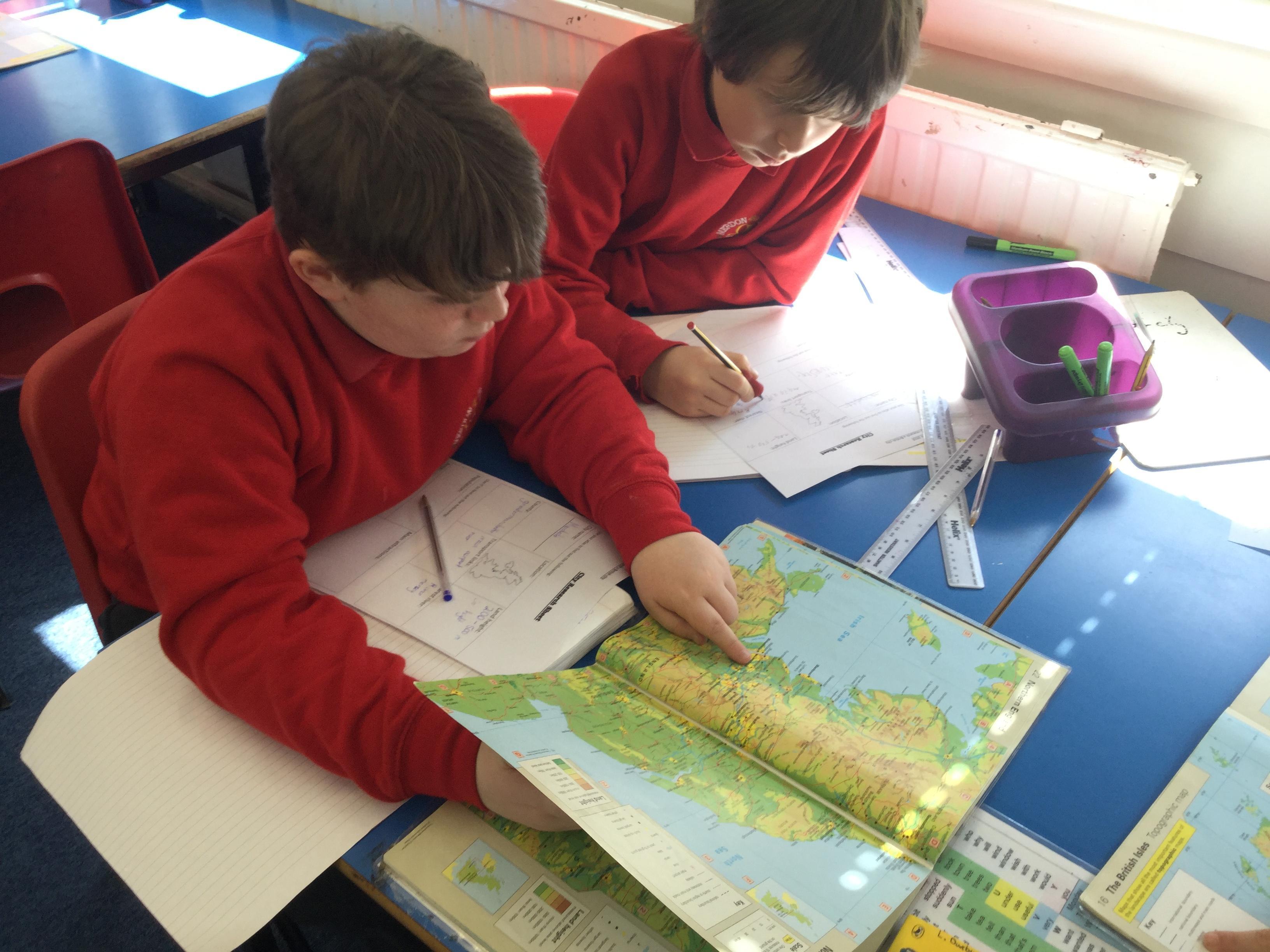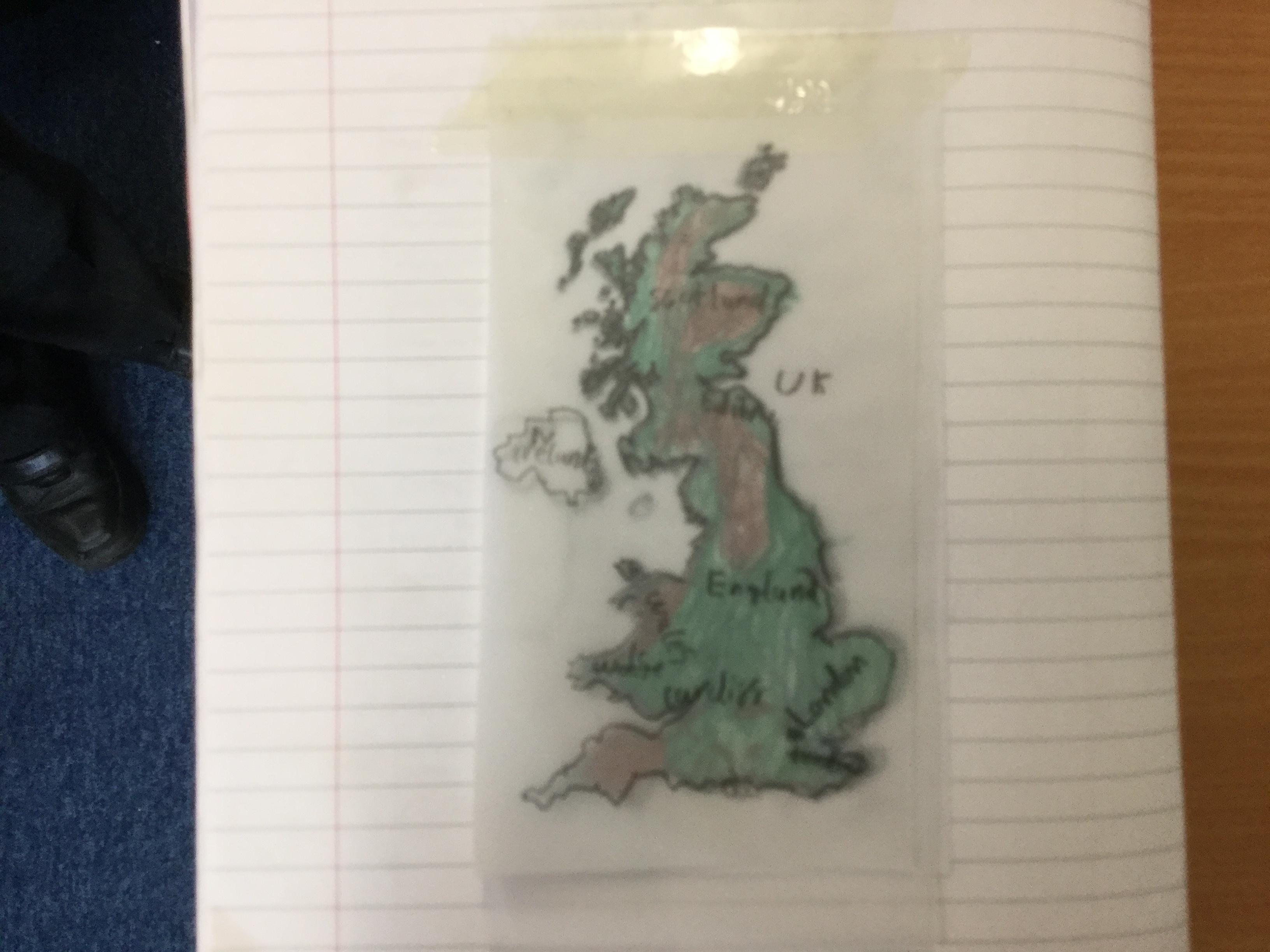 Today, we used atlases to find out the different geographical features of the UK. We found out about land height, rivers, cities and road systems. We chose two features to compare by making a “layered map”. This was very tricky and we had to concentrate! We traced the outline of the UK onto two sheets of tracing paper and chose a feature to represent on each. We used the atlas and key to make the map on the tracing paper. We then put it together and looked for patterns.